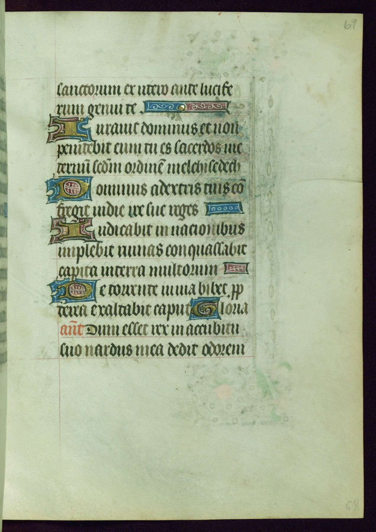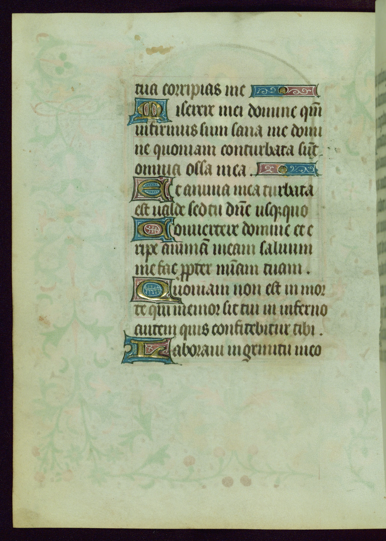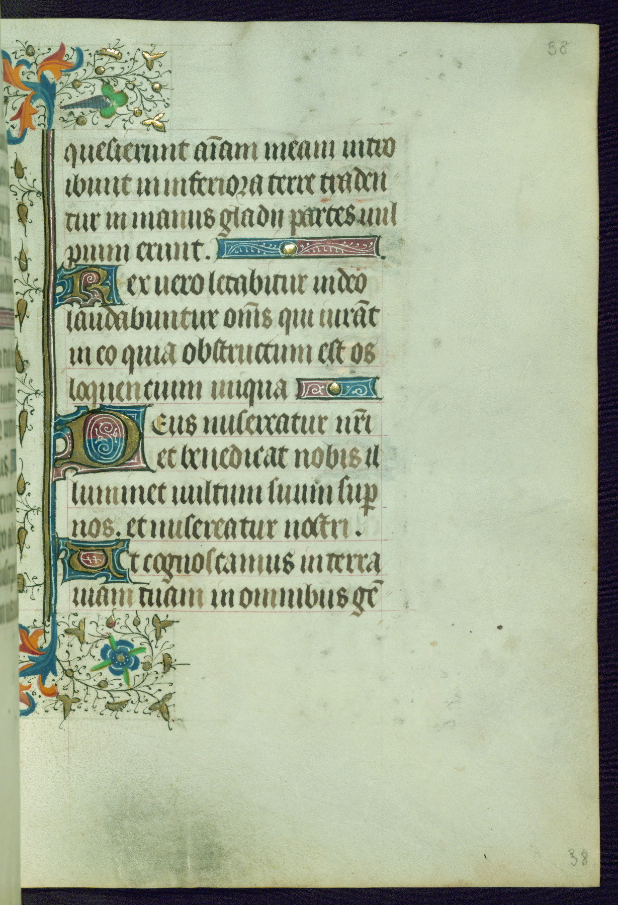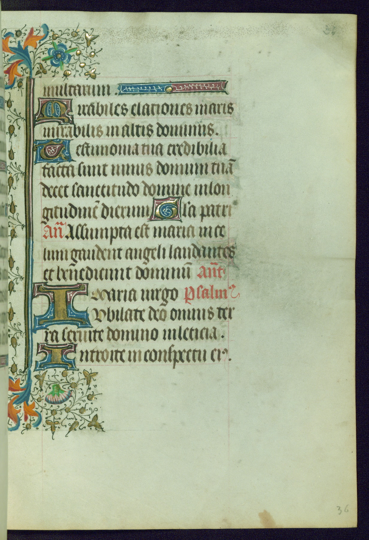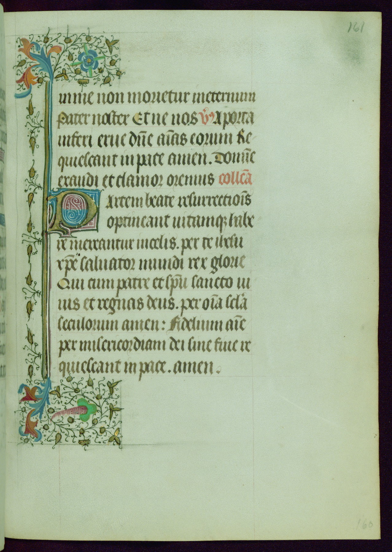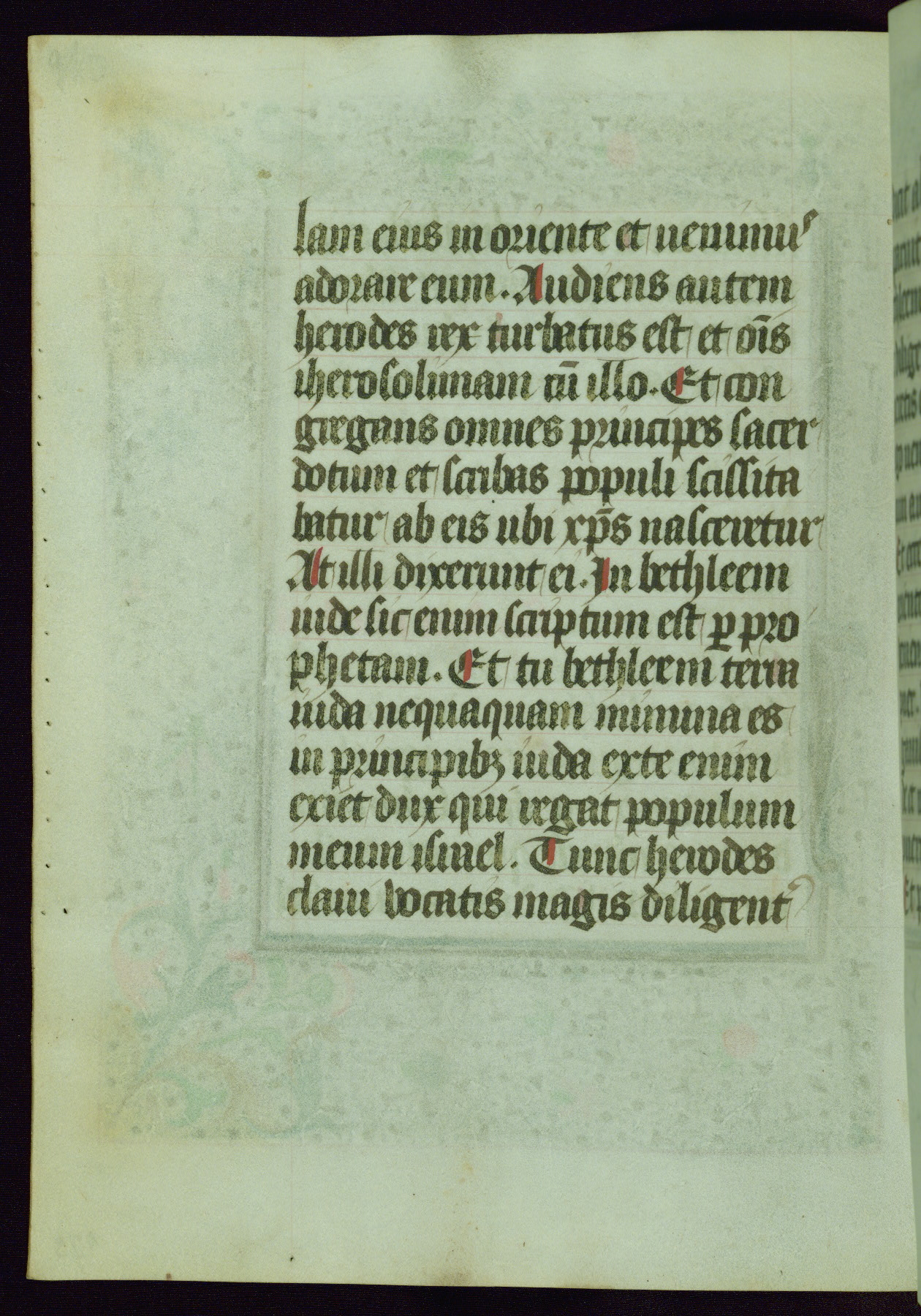 This Book of Hours was completed ca. 1440-50, and likely destined for Tournai. The decoration of this manuscript includes two full-page miniatures, eleven extant smaller miniatures, one historiated initial, and one drollery. The illumination is in the style of the Master of Guillebert de Mets, although the work would have been completed during the closing stage of Mets' career. The Master of Guillebert de Mets' principal disciple was the Master of the Ghent Privileges, with whom he may have been in collaboration, as indicated by numerous comparisons (see Dogaer 1987, 33-37). This book begins with a full-page miniature depicting the Mass of St. Gregory, a folio that appears to have been relocated from its original placement just before fol. 180 to its current location as fol. 2. It should be noted that fol. 2 has experienced extensive paint loss and has since been retouched, although it is unknown by whom or at what time. The unpretentious illumination program could have been the reason for this switch, perhaps to make the manuscript more appealing for a potential buyer.