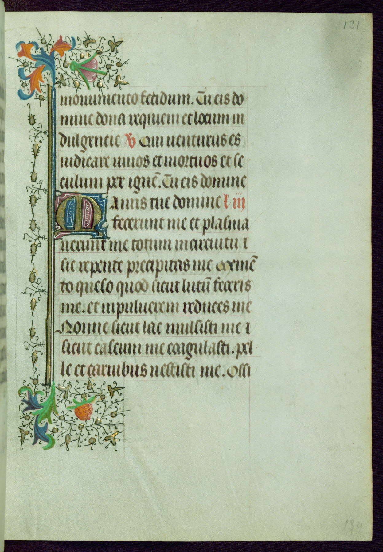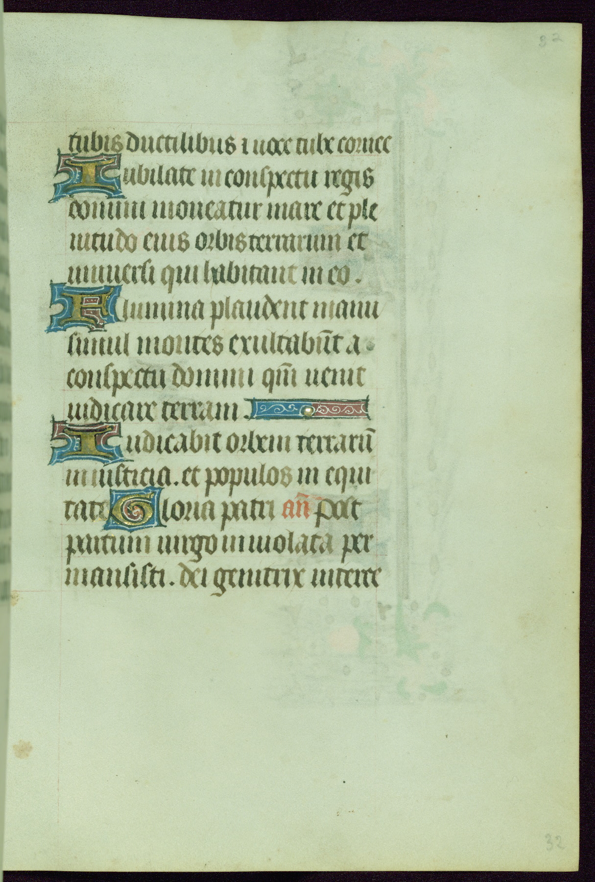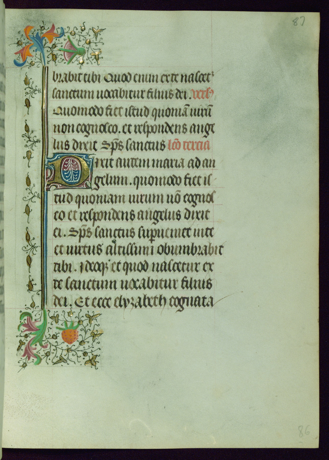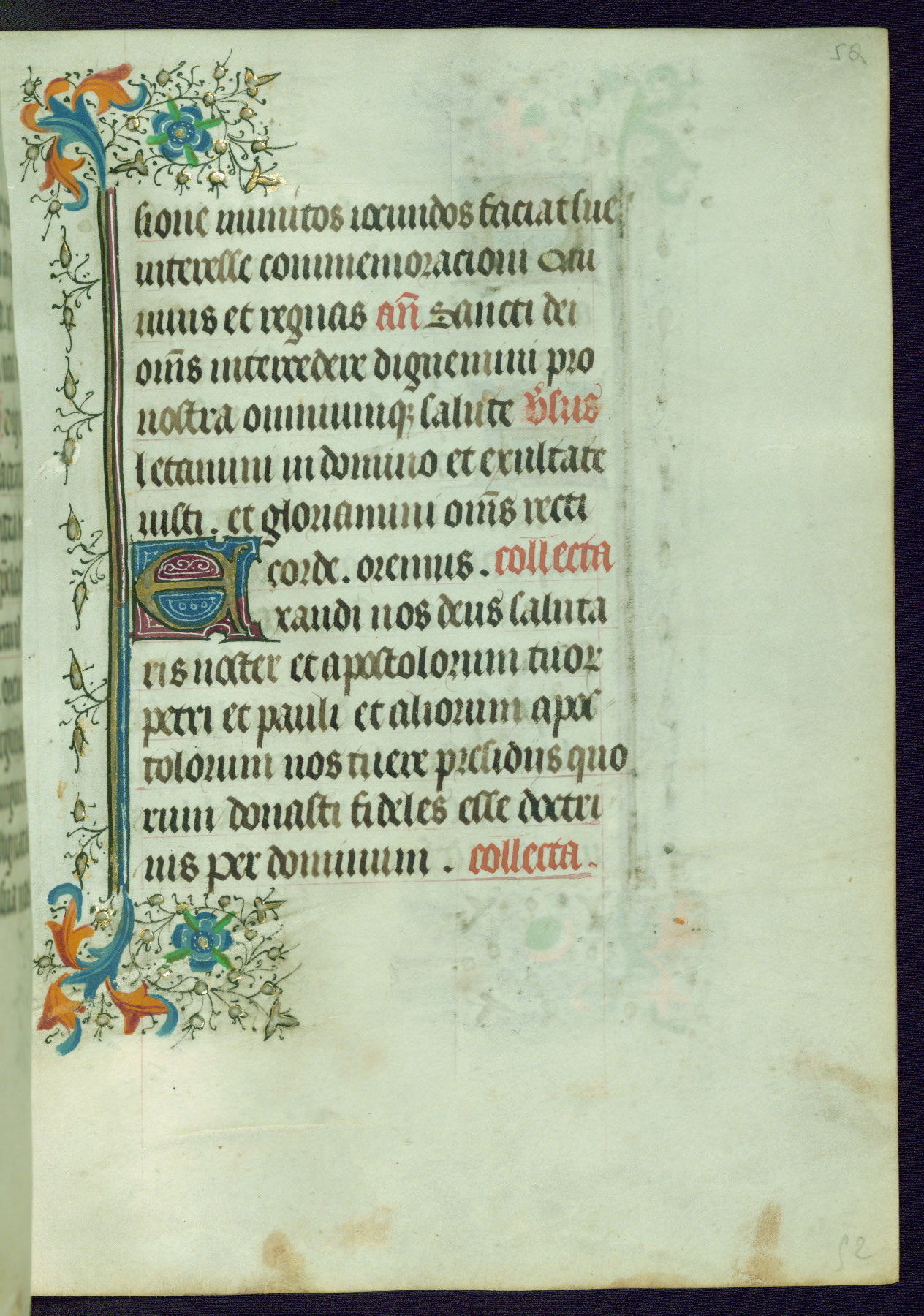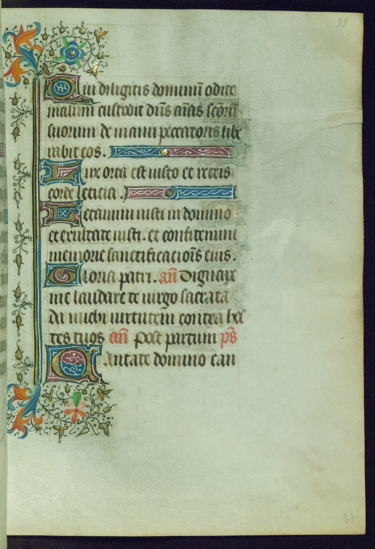 This Book of Hours was completed ca. 1440-50, and likely destined for Tournai. The decoration of this manuscript includes two full-page miniatures, eleven extant smaller miniatures, one historiated initial, and one drollery. The illumination is in the style of the Master of Guillebert de Mets, although the work would have been completed during the closing stage of Mets' career. The Master of Guillebert de Mets' principal disciple was the Master of the Ghent Privileges, with whom he may have been in collaboration, as indicated by numerous comparisons (see Dogaer 1987, 33-37). This book begins with a full-page miniature depicting the Mass of St. Gregory, a folio that appears to have been relocated from its original placement just before fol. 180 to its current location as fol. 2. It should be noted that fol. 2 has experienced extensive paint loss and has since been retouched, although it is unknown by whom or at what time. The unpretentious illumination program could have been the reason for this switch, perhaps to make the manuscript more appealing for a potential buyer.