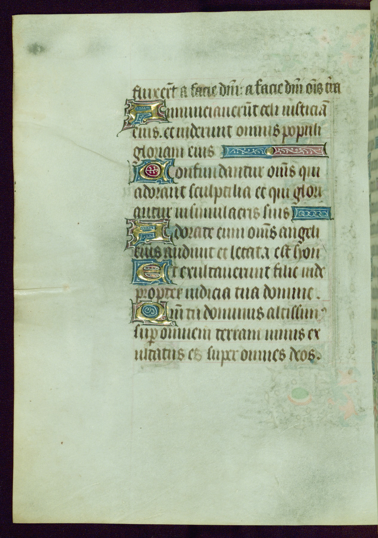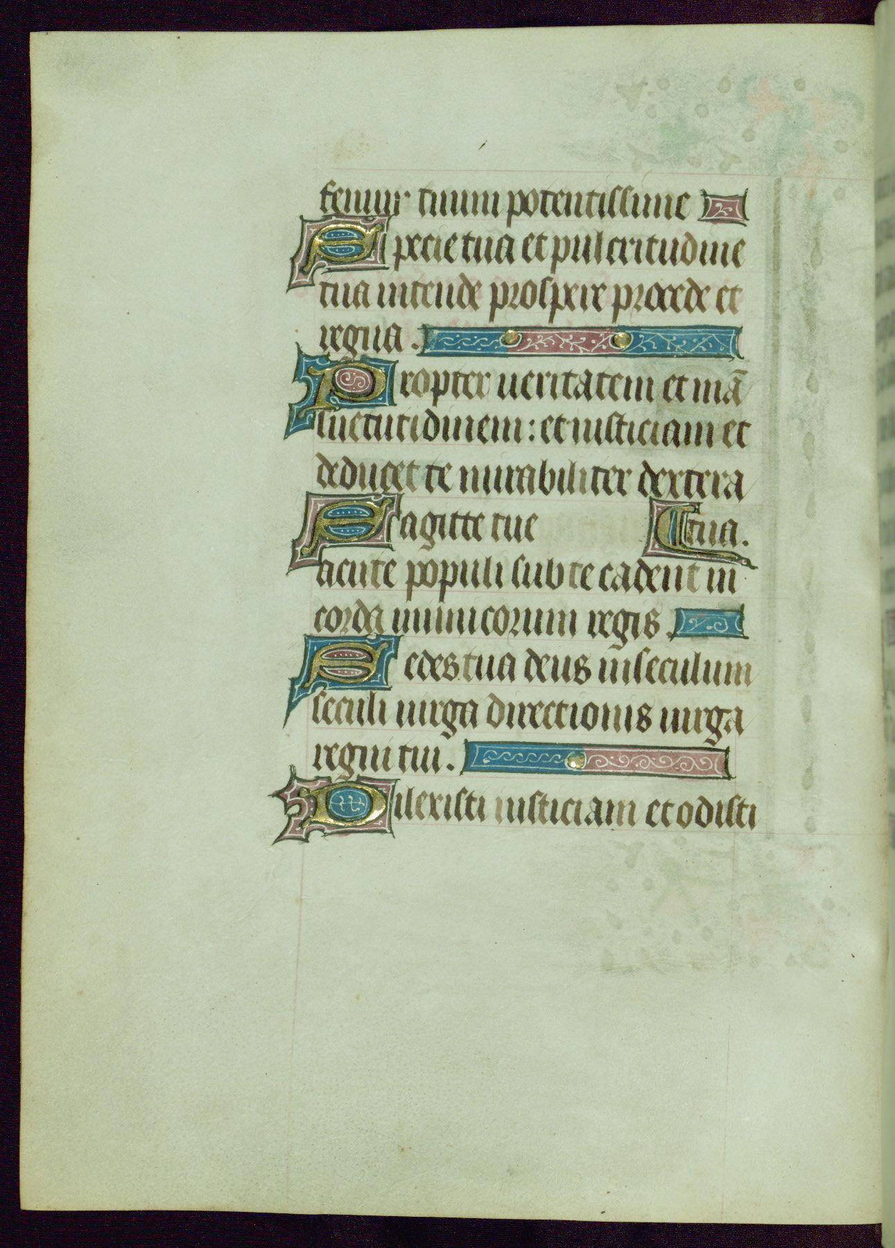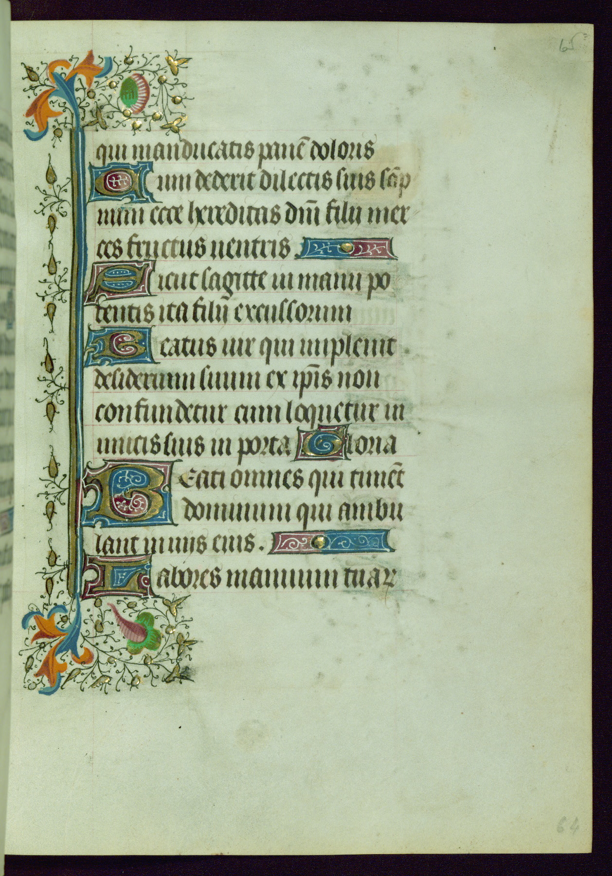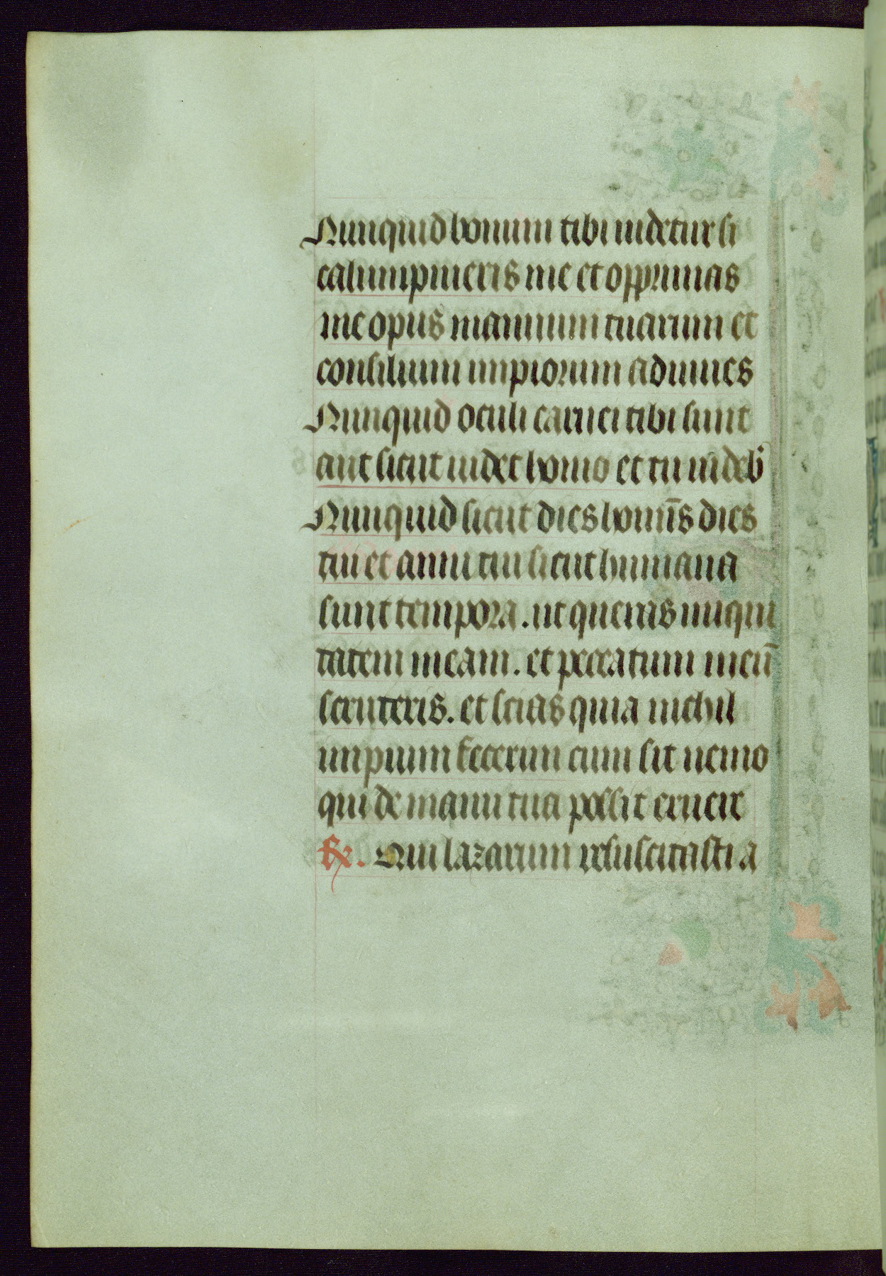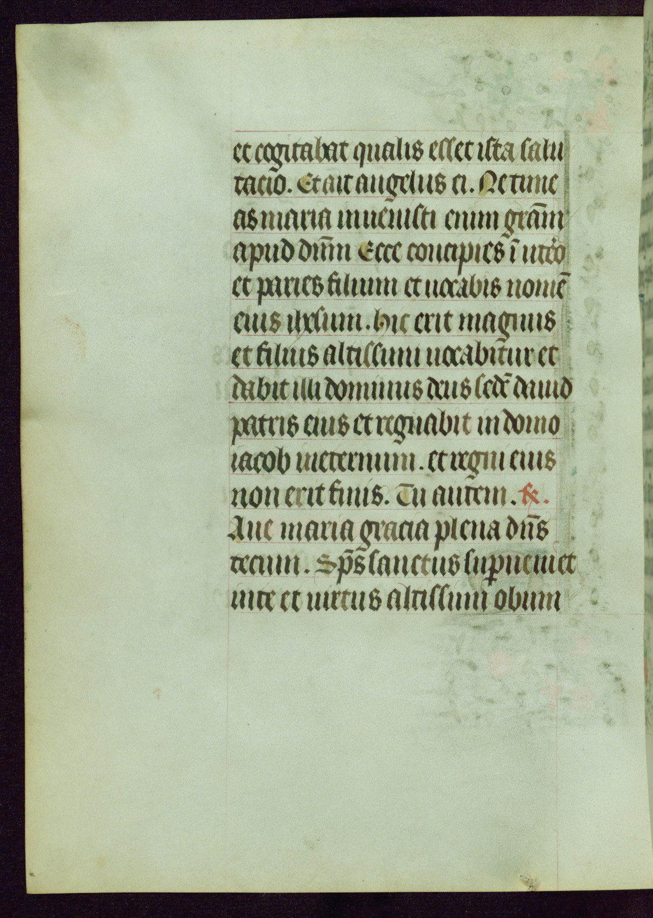 This Book of Hours was completed ca. 1440-50, and likely destined for Tournai. The decoration of this manuscript includes two full-page miniatures, eleven extant smaller miniatures, one historiated initial, and one drollery. The illumination is in the style of the Master of Guillebert de Mets, although the work would have been completed during the closing stage of Mets' career. The Master of Guillebert de Mets' principal disciple was the Master of the Ghent Privileges, with whom he may have been in collaboration, as indicated by numerous comparisons (see Dogaer 1987, 33-37). This book begins with a full-page miniature depicting the Mass of St. Gregory, a folio that appears to have been relocated from its original placement just before fol. 180 to its current location as fol. 2. It should be noted that fol. 2 has experienced extensive paint loss and has since been retouched, although it is unknown by whom or at what time. The unpretentious illumination program could have been the reason for this switch, perhaps to make the manuscript more appealing for a potential buyer.