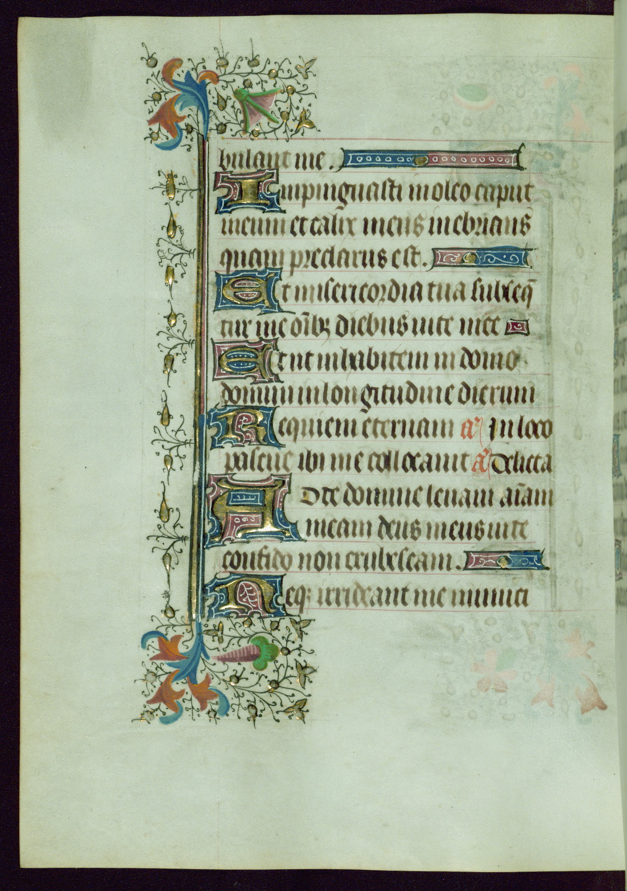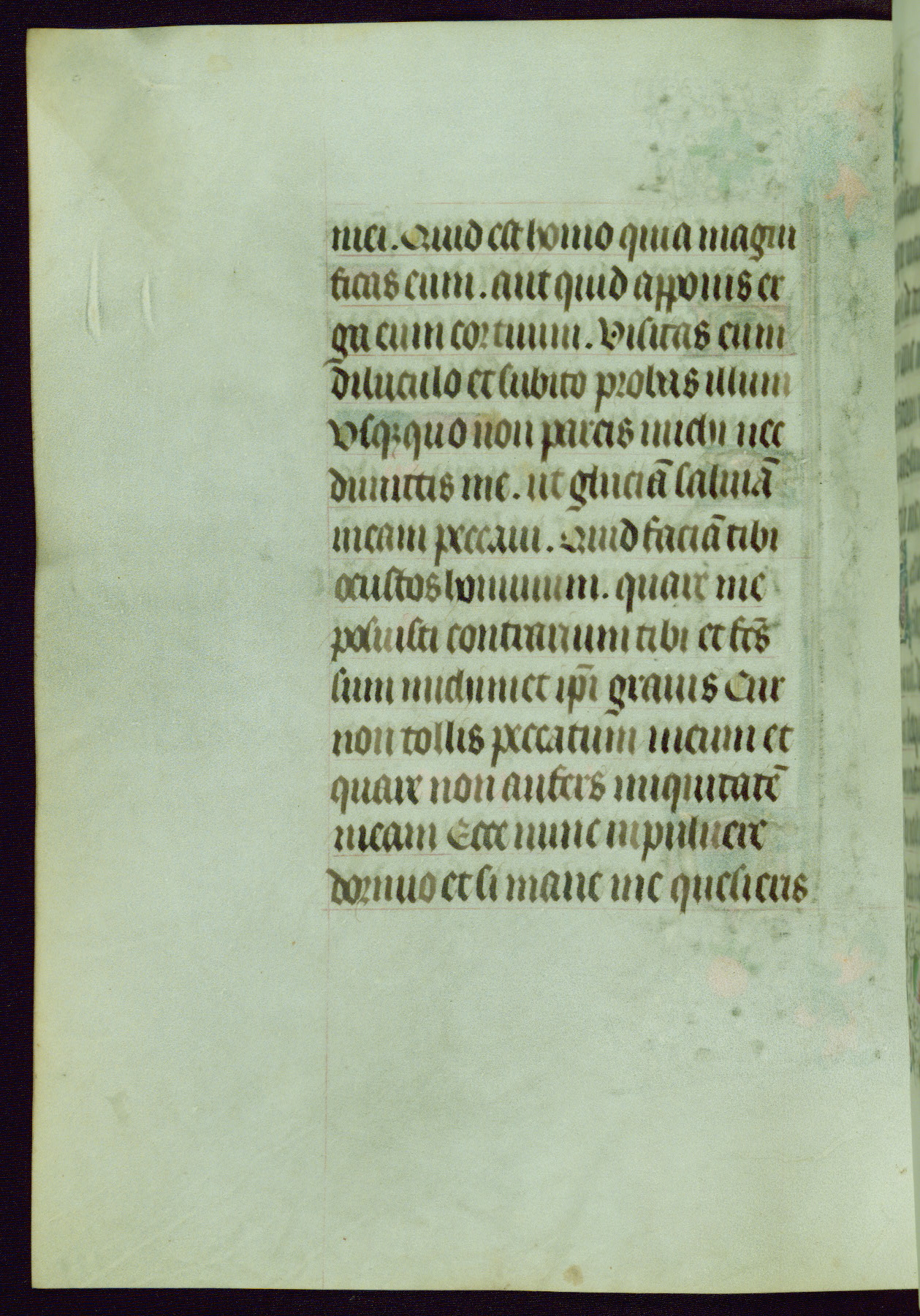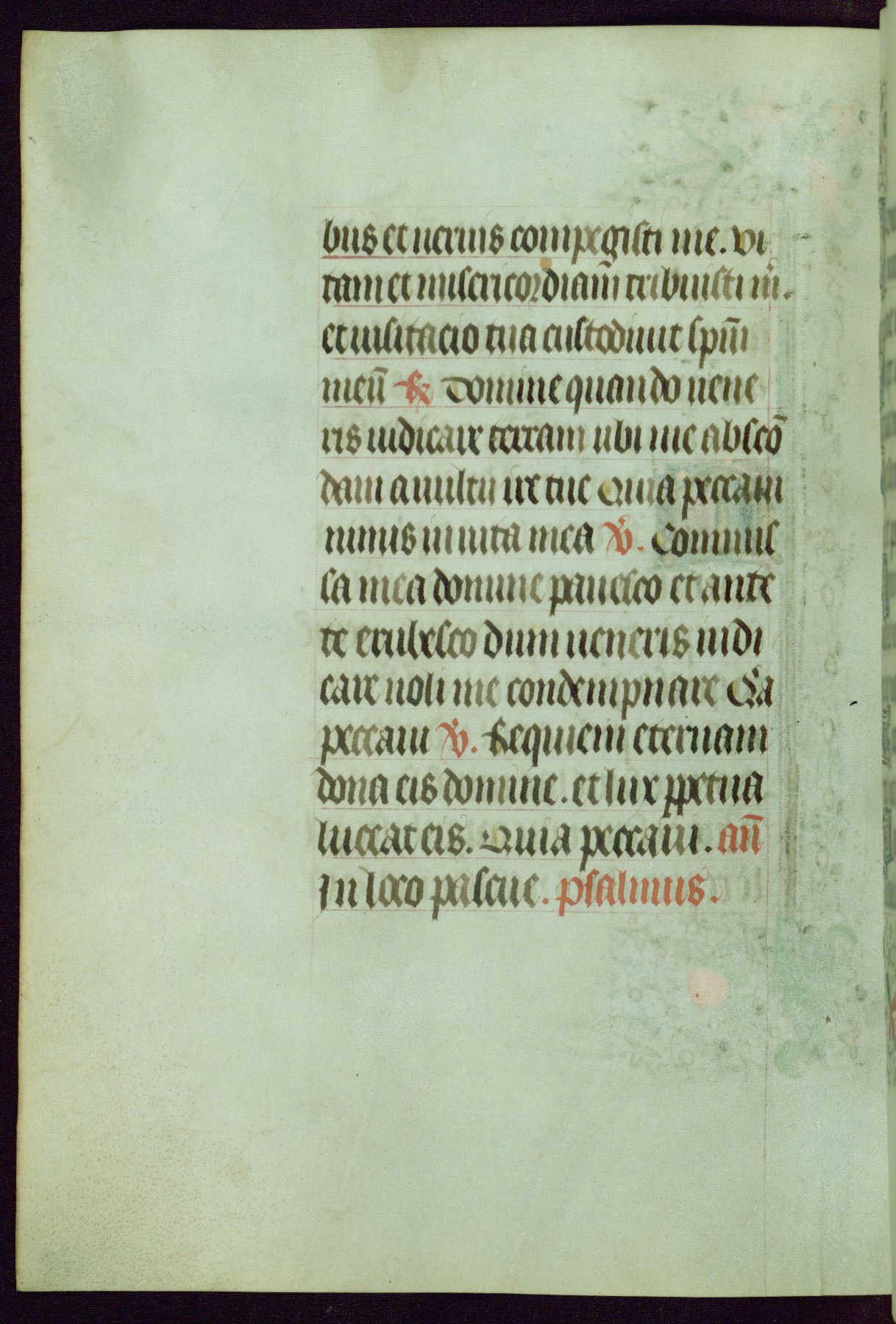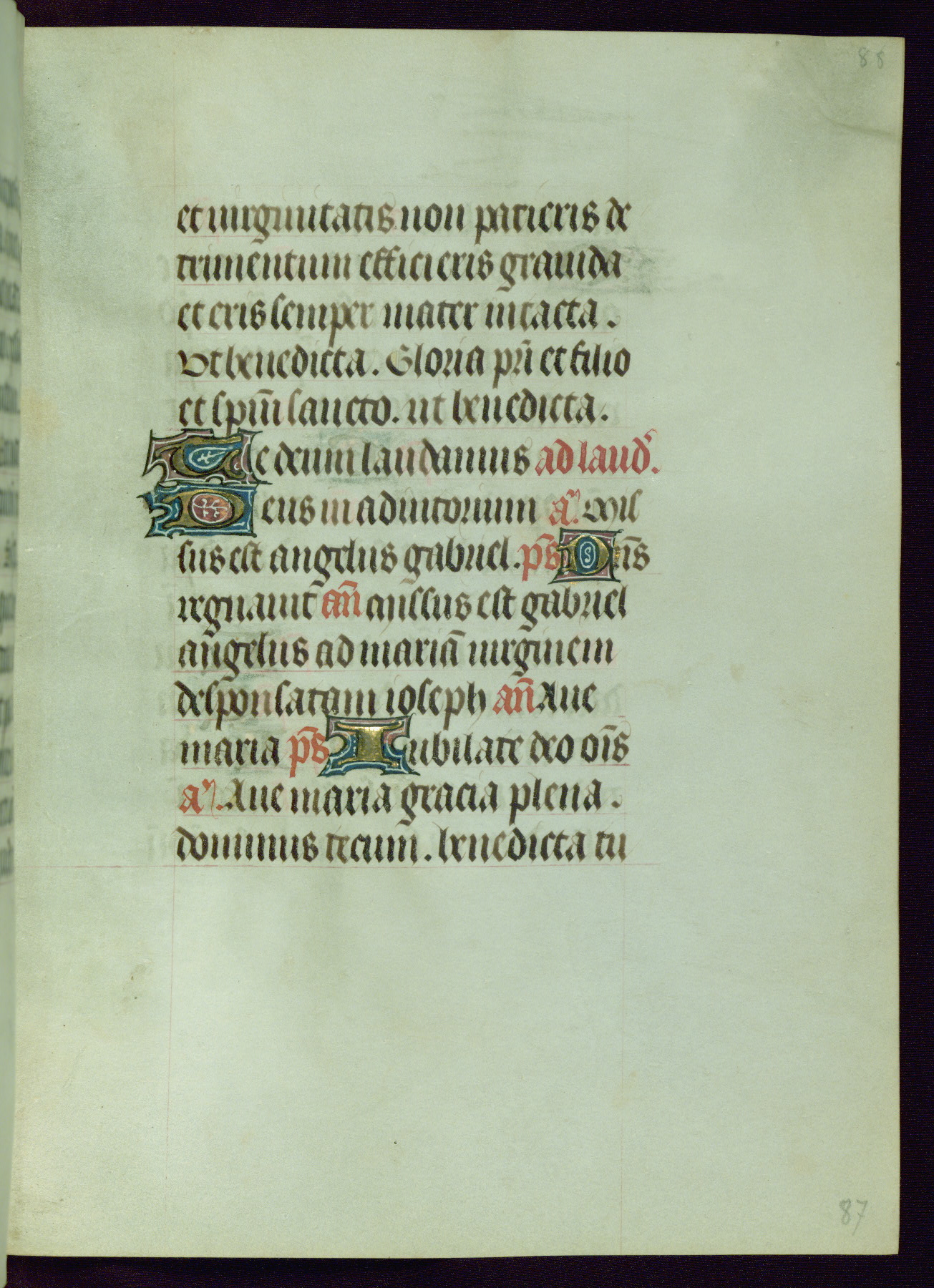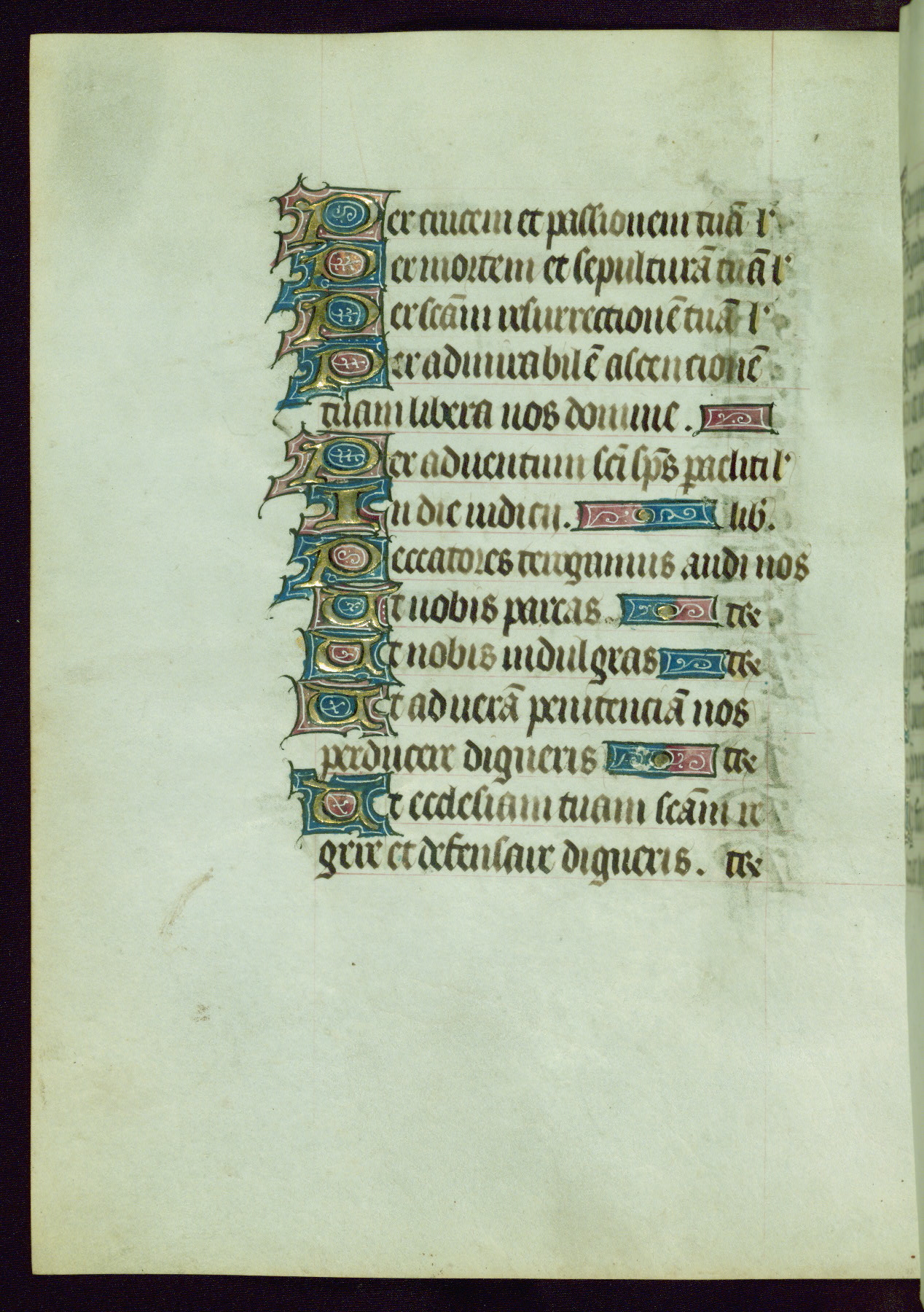 This Book of Hours was completed ca. 1440-50, and likely destined for Tournai. The decoration of this manuscript includes two full-page miniatures, eleven extant smaller miniatures, one historiated initial, and one drollery. The illumination is in the style of the Master of Guillebert de Mets, although the work would have been completed during the closing stage of Mets' career. The Master of Guillebert de Mets' principal disciple was the Master of the Ghent Privileges, with whom he may have been in collaboration, as indicated by numerous comparisons (see Dogaer 1987, 33-37). This book begins with a full-page miniature depicting the Mass of St. Gregory, a folio that appears to have been relocated from its original placement just before fol. 180 to its current location as fol. 2. It should be noted that fol. 2 has experienced extensive paint loss and has since been retouched, although it is unknown by whom or at what time. The unpretentious illumination program could have been the reason for this switch, perhaps to make the manuscript more appealing for a potential buyer.