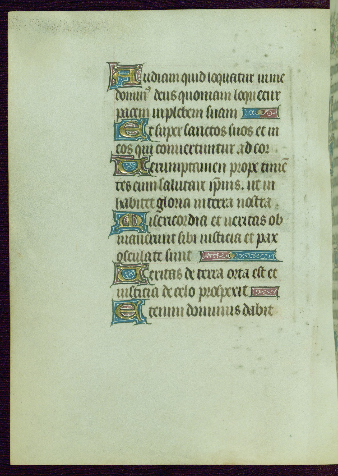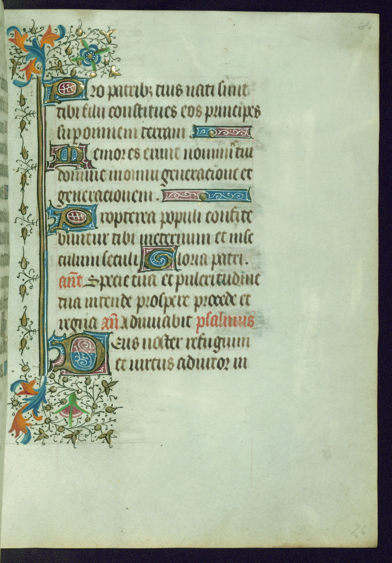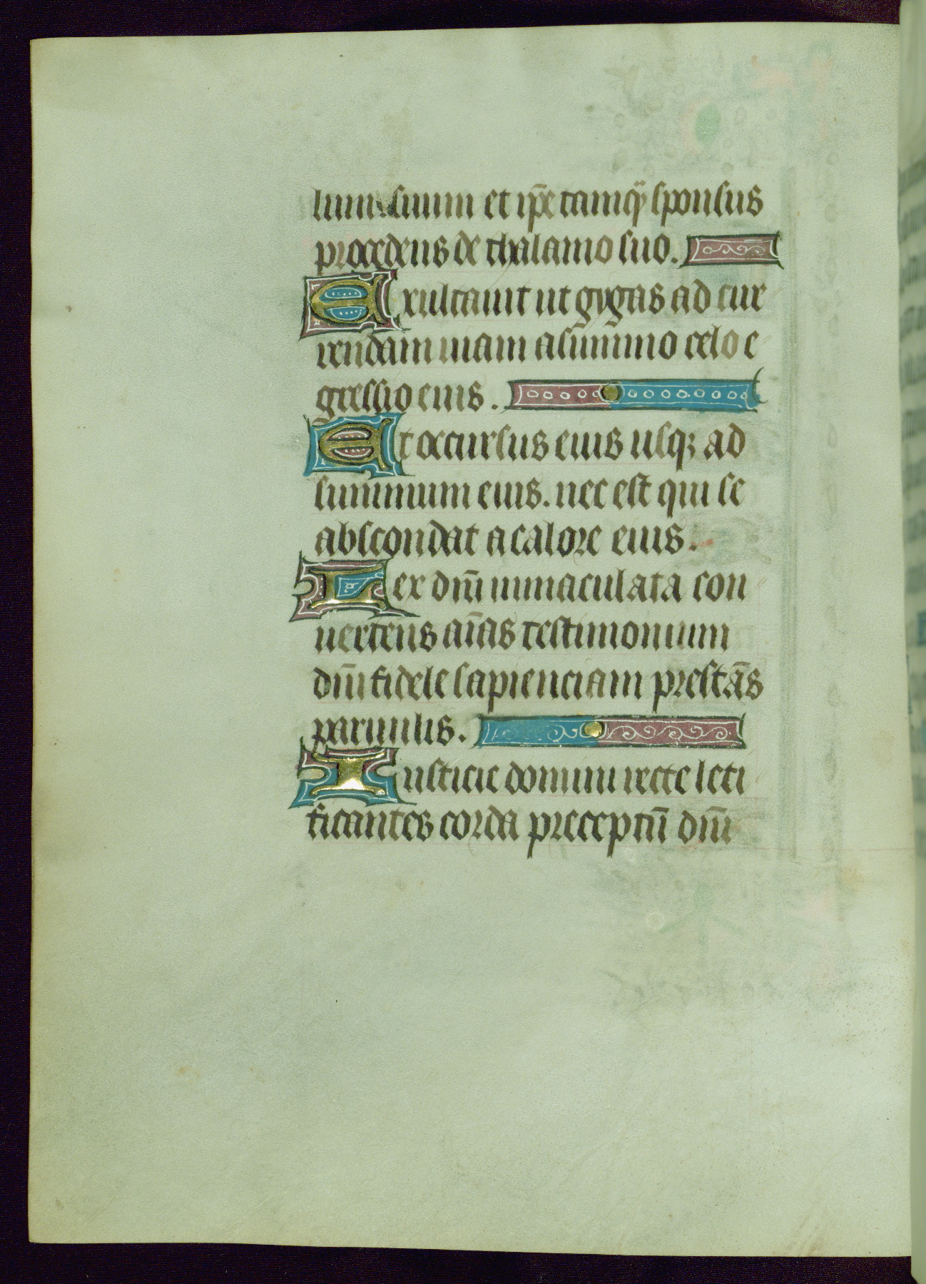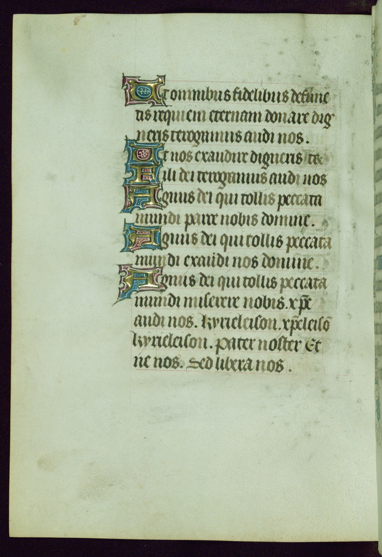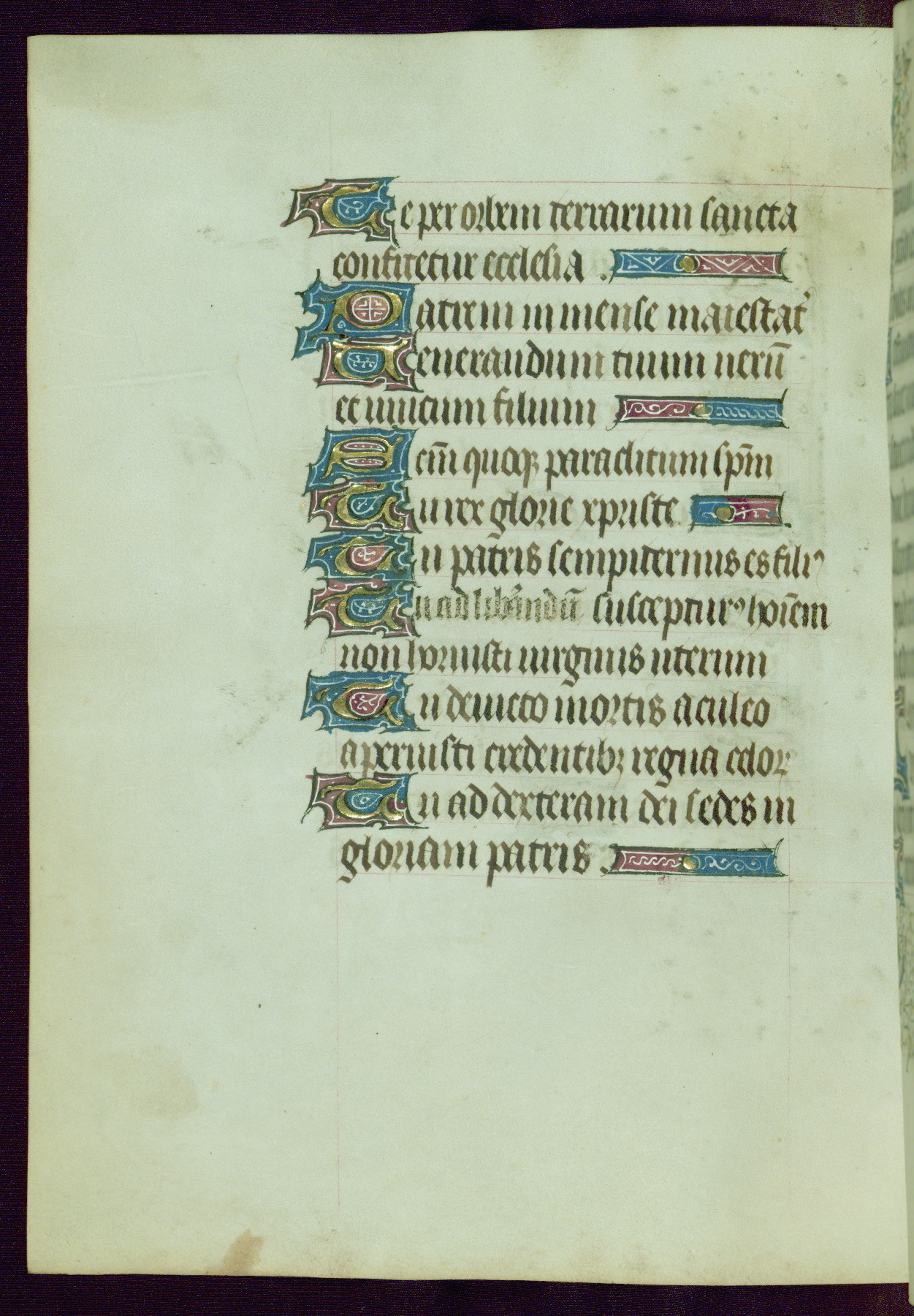 This Book of Hours was completed ca. 1440-50, and likely destined for Tournai. The decoration of this manuscript includes two full-page miniatures, eleven extant smaller miniatures, one historiated initial, and one drollery. The illumination is in the style of the Master of Guillebert de Mets, although the work would have been completed during the closing stage of Mets' career. The Master of Guillebert de Mets' principal disciple was the Master of the Ghent Privileges, with whom he may have been in collaboration, as indicated by numerous comparisons (see Dogaer 1987, 33-37). This book begins with a full-page miniature depicting the Mass of St. Gregory, a folio that appears to have been relocated from its original placement just before fol. 180 to its current location as fol. 2. It should be noted that fol. 2 has experienced extensive paint loss and has since been retouched, although it is unknown by whom or at what time. The unpretentious illumination program could have been the reason for this switch, perhaps to make the manuscript more appealing for a potential buyer.