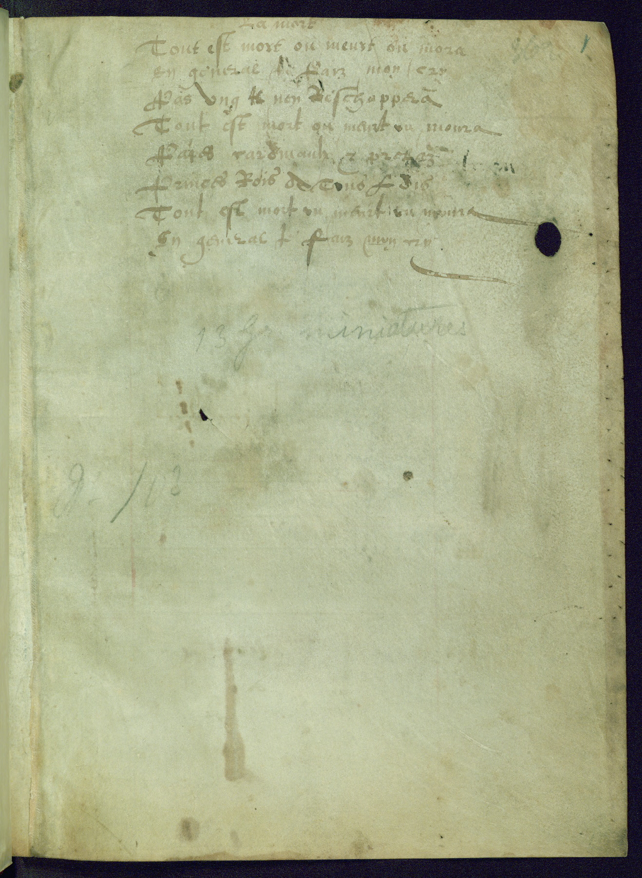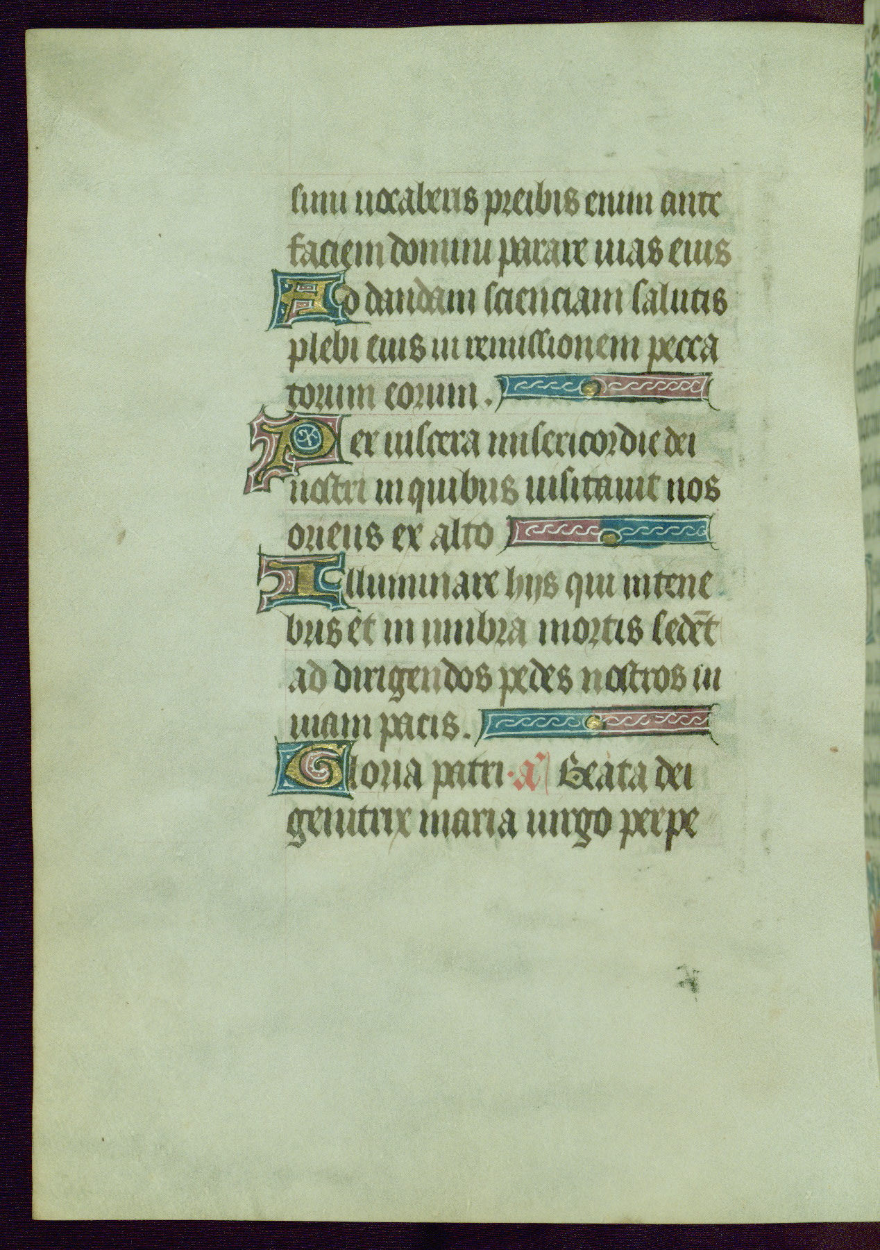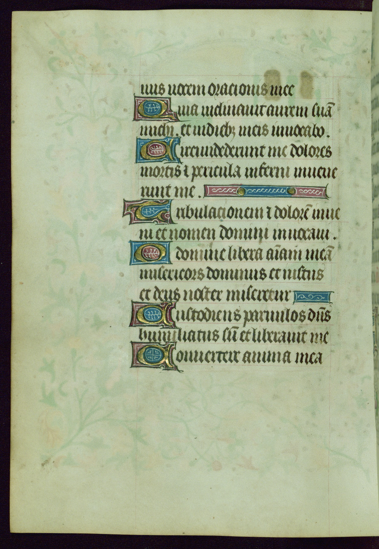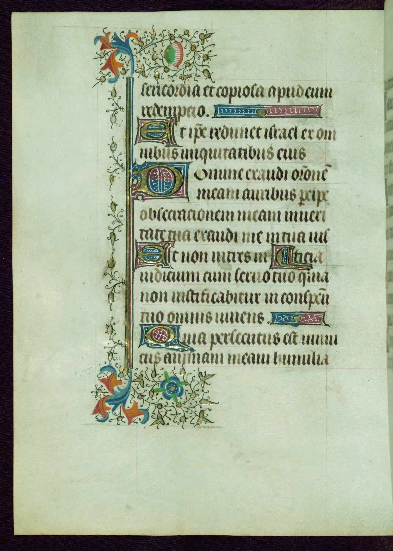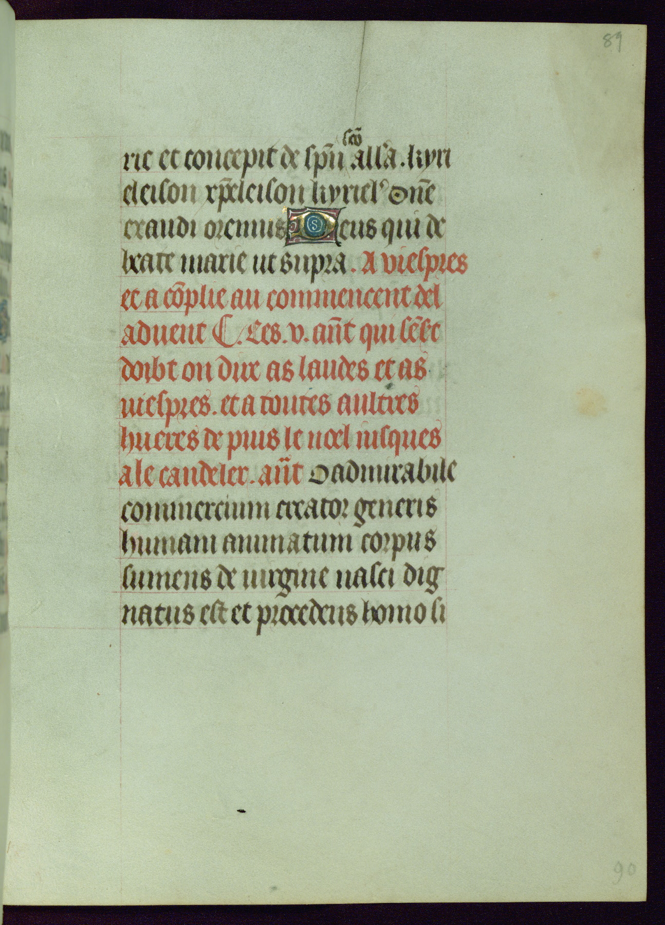 This Book of Hours was completed ca. 1440-50, and likely destined for Tournai. The decoration of this manuscript includes two full-page miniatures, eleven extant smaller miniatures, one historiated initial, and one drollery. The illumination is in the style of the Master of Guillebert de Mets, although the work would have been completed during the closing stage of Mets' career. The Master of Guillebert de Mets' principal disciple was the Master of the Ghent Privileges, with whom he may have been in collaboration, as indicated by numerous comparisons (see Dogaer 1987, 33-37). This book begins with a full-page miniature depicting the Mass of St. Gregory, a folio that appears to have been relocated from its original placement just before fol. 180 to its current location as fol. 2. It should be noted that fol. 2 has experienced extensive paint loss and has since been retouched, although it is unknown by whom or at what time. The unpretentious illumination program could have been the reason for this switch, perhaps to make the manuscript more appealing for a potential buyer.