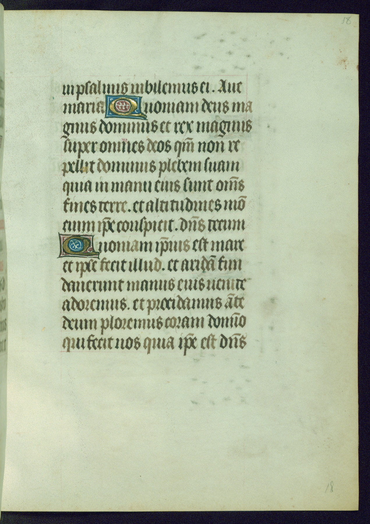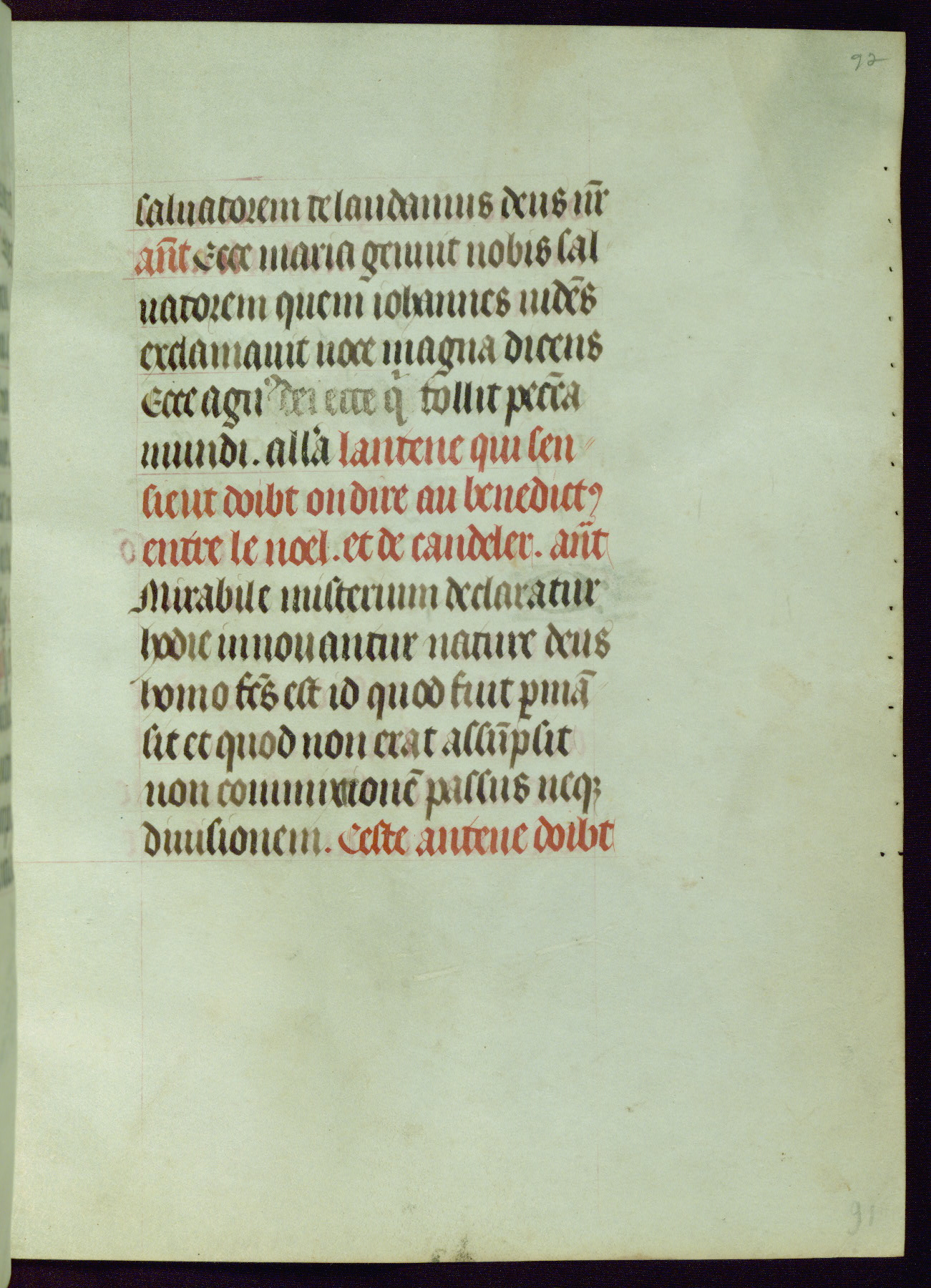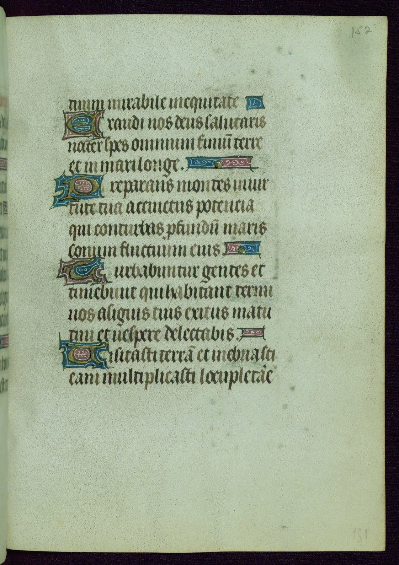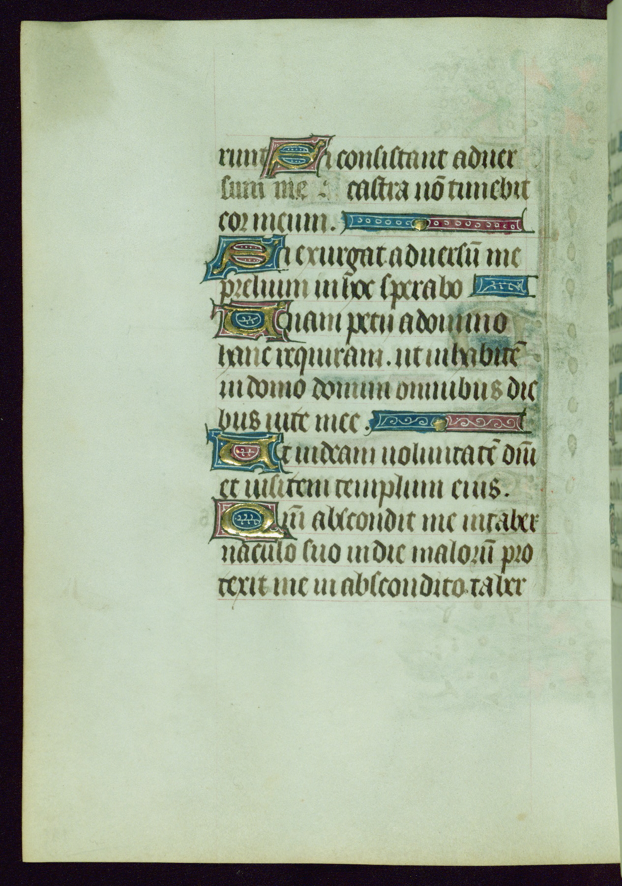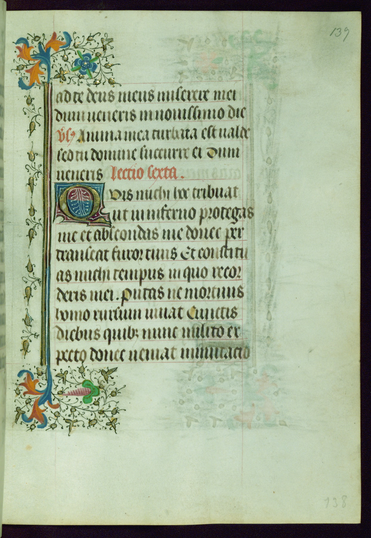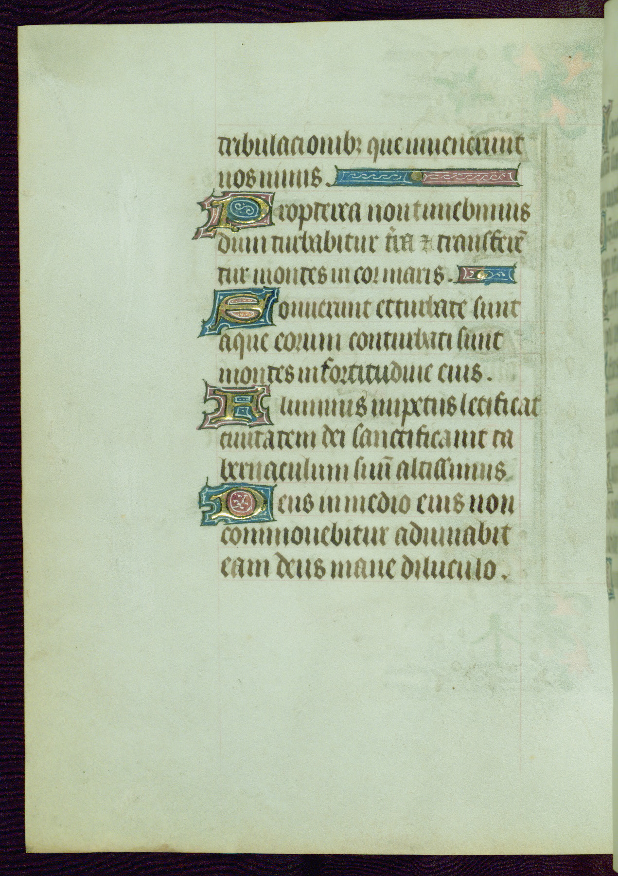 This Book of Hours was completed ca. 1440-50, and likely destined for Tournai. The decoration of this manuscript includes two full-page miniatures, eleven extant smaller miniatures, one historiated initial, and one drollery. The illumination is in the style of the Master of Guillebert de Mets, although the work would have been completed during the closing stage of Mets' career. The Master of Guillebert de Mets' principal disciple was the Master of the Ghent Privileges, with whom he may have been in collaboration, as indicated by numerous comparisons (see Dogaer 1987, 33-37). This book begins with a full-page miniature depicting the Mass of St. Gregory, a folio that appears to have been relocated from its original placement just before fol. 180 to its current location as fol. 2. It should be noted that fol. 2 has experienced extensive paint loss and has since been retouched, although it is unknown by whom or at what time. The unpretentious illumination program could have been the reason for this switch, perhaps to make the manuscript more appealing for a potential buyer.