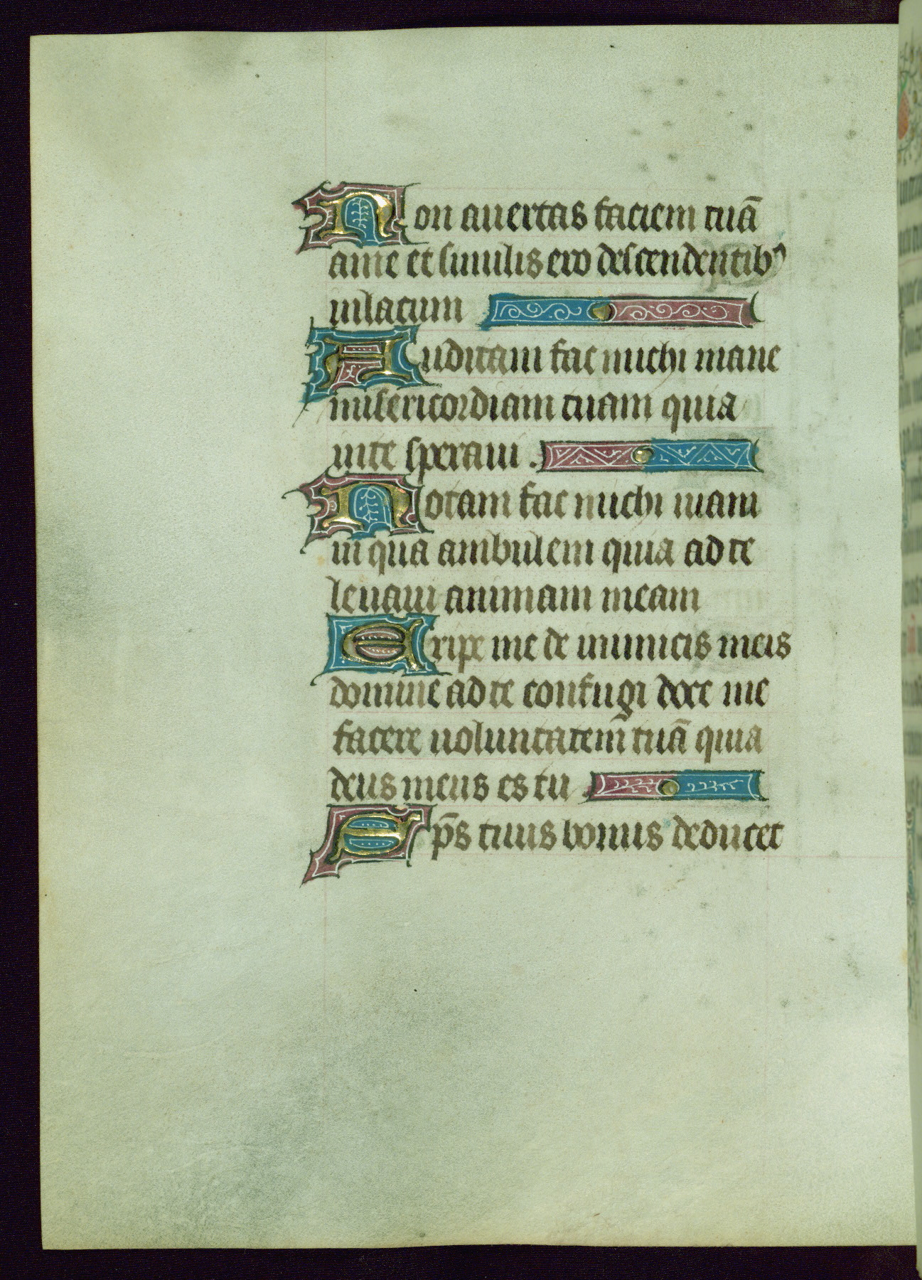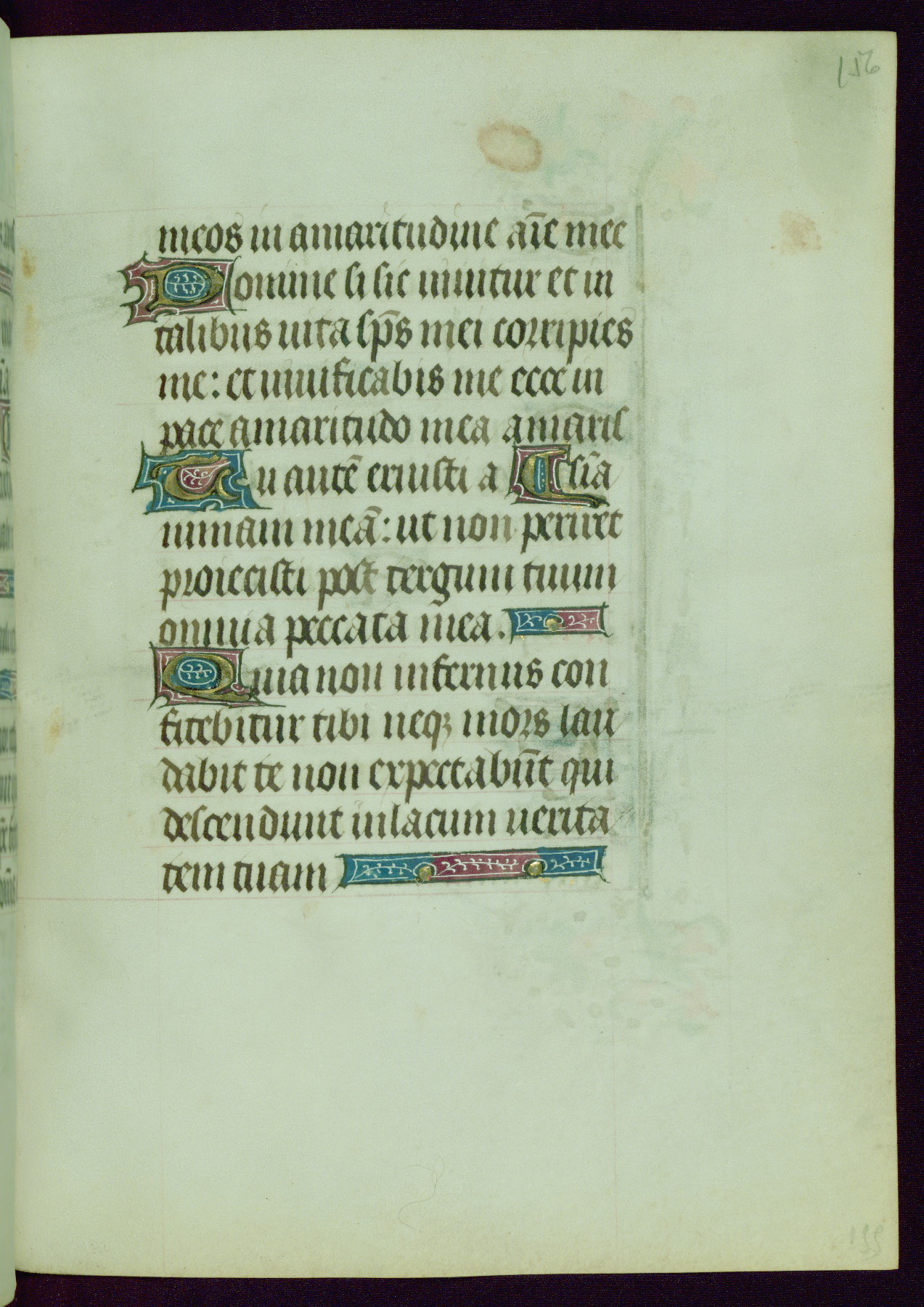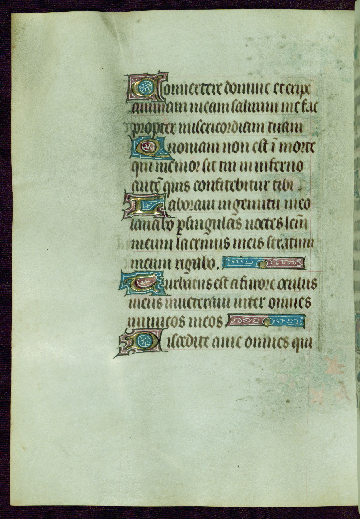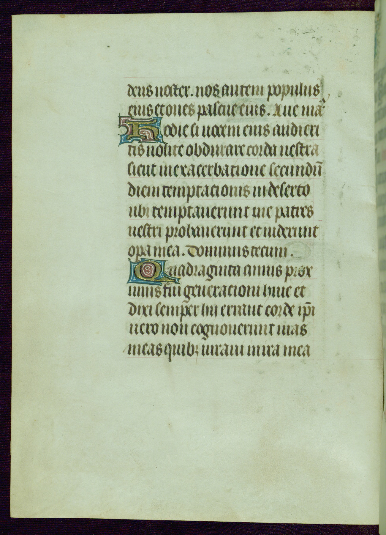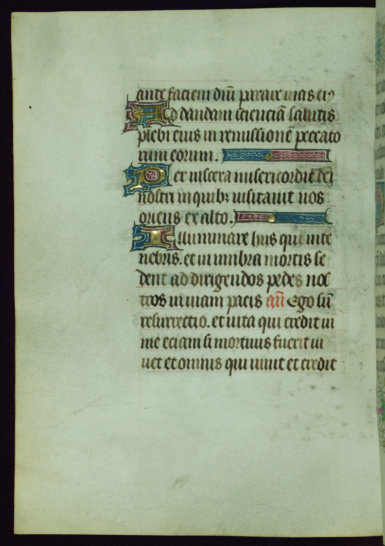 This Book of Hours was completed ca. 1440-50, and likely destined for Tournai. The decoration of this manuscript includes two full-page miniatures, eleven extant smaller miniatures, one historiated initial, and one drollery. The illumination is in the style of the Master of Guillebert de Mets, although the work would have been completed during the closing stage of Mets' career. The Master of Guillebert de Mets' principal disciple was the Master of the Ghent Privileges, with whom he may have been in collaboration, as indicated by numerous comparisons (see Dogaer 1987, 33-37). This book begins with a full-page miniature depicting the Mass of St. Gregory, a folio that appears to have been relocated from its original placement just before fol. 180 to its current location as fol. 2. It should be noted that fol. 2 has experienced extensive paint loss and has since been retouched, although it is unknown by whom or at what time. The unpretentious illumination program could have been the reason for this switch, perhaps to make the manuscript more appealing for a potential buyer.