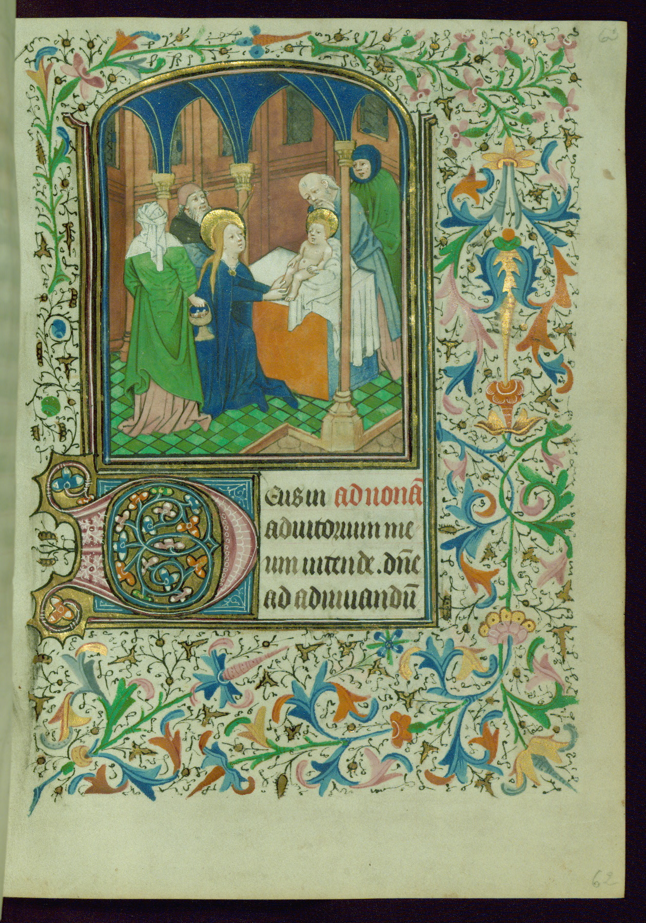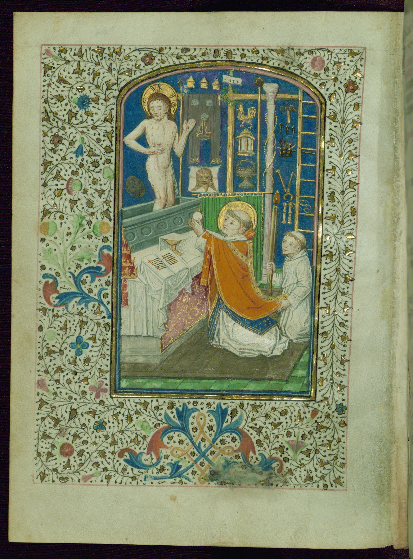 This Book of Hours was completed ca. 1440-50, and likely destined for Tournai. The decoration of this manuscript includes two full-page miniatures, eleven extant smaller miniatures, one historiated initial, and one drollery. The illumination is in the style of the Master of Guillebert de Mets, although the work would have been completed during the closing stage of Mets' career. The Master of Guillebert de Mets' principal disciple was the Master of the Ghent Privileges, with whom he may have been in collaboration, as indicated by numerous comparisons (see Dogaer 1987, 33-37). This book begins with a full-page miniature depicting the Mass of St. Gregory, a folio that appears to have been relocated from its original placement just before fol. 180 to its current location as fol. 2. It should be noted that fol. 2 has experienced extensive paint loss and has since been retouched, although it is unknown by whom or at what time. The unpretentious illumination program could have been the reason for this switch, perhaps to make the manuscript more appealing for a potential buyer.
