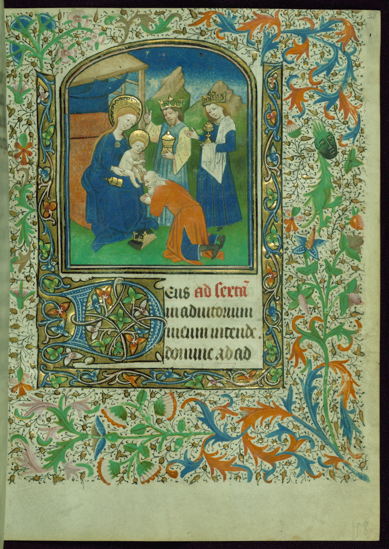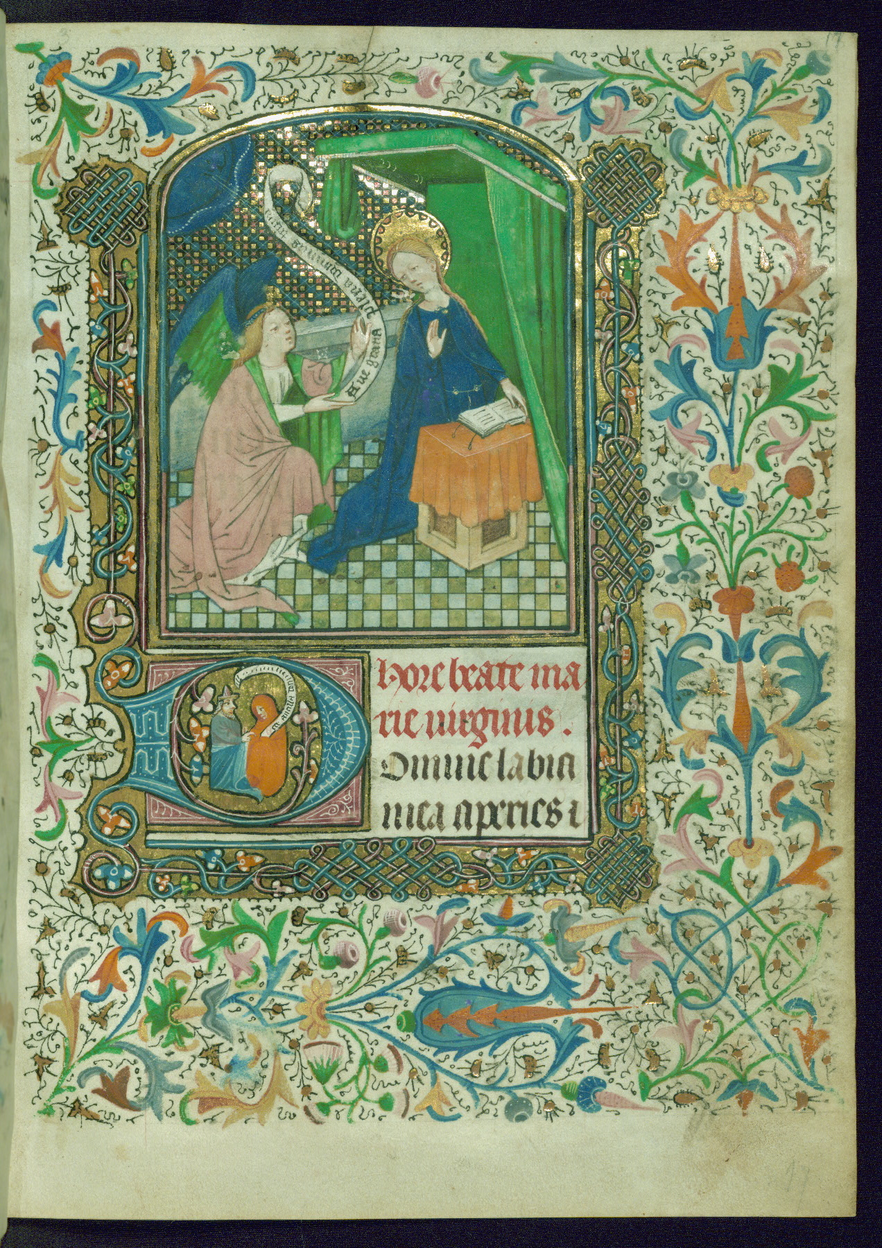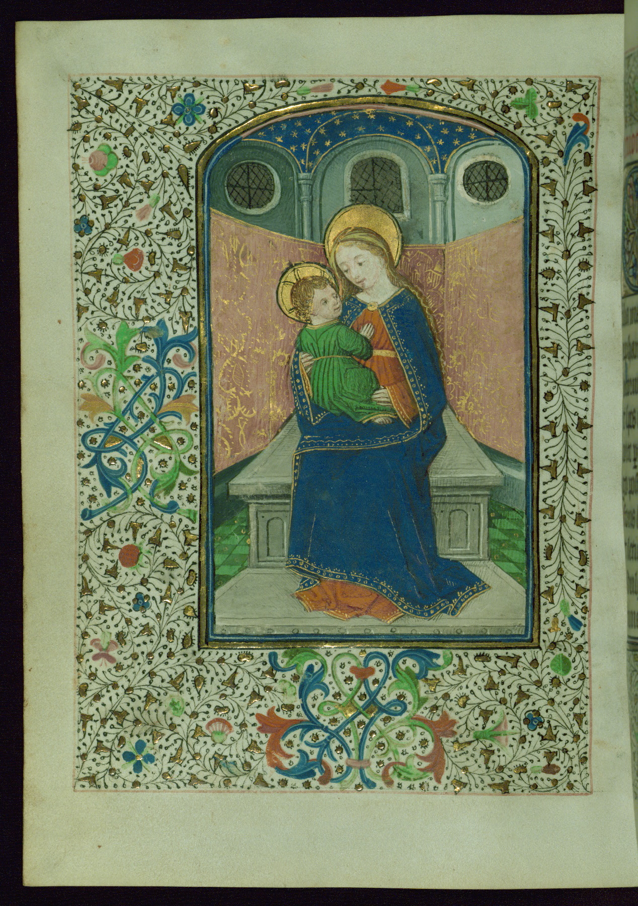 - Decoration note: Illumination in the style of the Master of Guillebert de Mets, ca. 1440-50; two full-page miniatures (inserted); eleven extant smaller miniatures (one inserted); one historiated initial; one drollery; decorated illuminated initials of burnished gold, on gray bole through fol. 161, on dark brown bole in additions: found at text openings below miniatures, at opening of Advent Office of the Virgin, at secondary text divisions; versals; "K L" in calendar; at prayer openings of texts additions; borders, gold burnished on tan bole (with some exceptions): at three openings marked by miniatures (fols. 9r, 17r, 58r), eight openings marked by miniatures (fols. 13r, 48r, 53r, 63r, 68r, 74r, 94r, 117r), around full-page miniatures of added texts, as well as around text opposite of full-page miniatures of added texts; line fillers of panel type in blue and/or mauve, crudely patterned in white, regular color division marked by gold disk at center; rubrics in red; text in dark brown ink