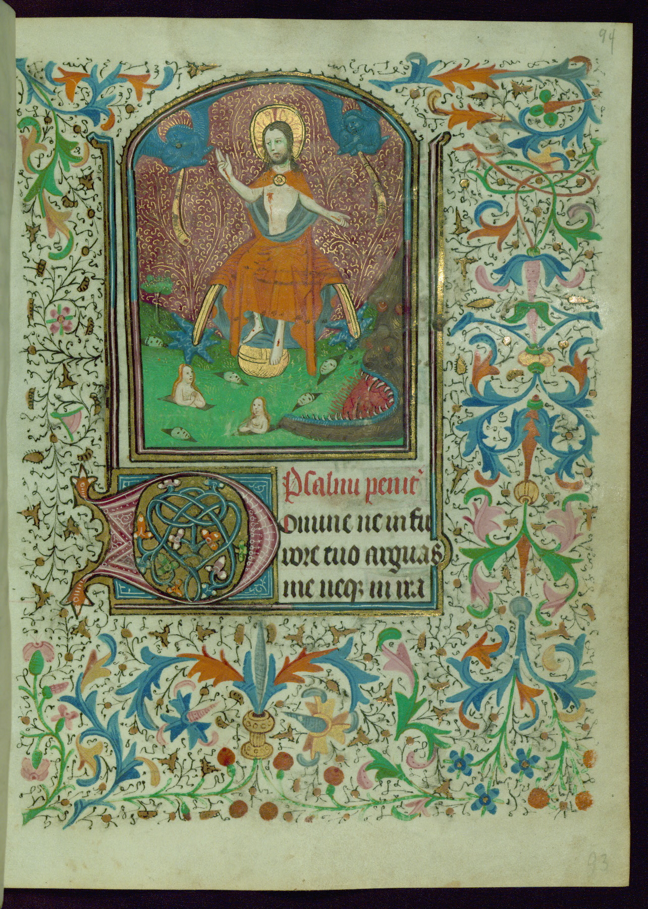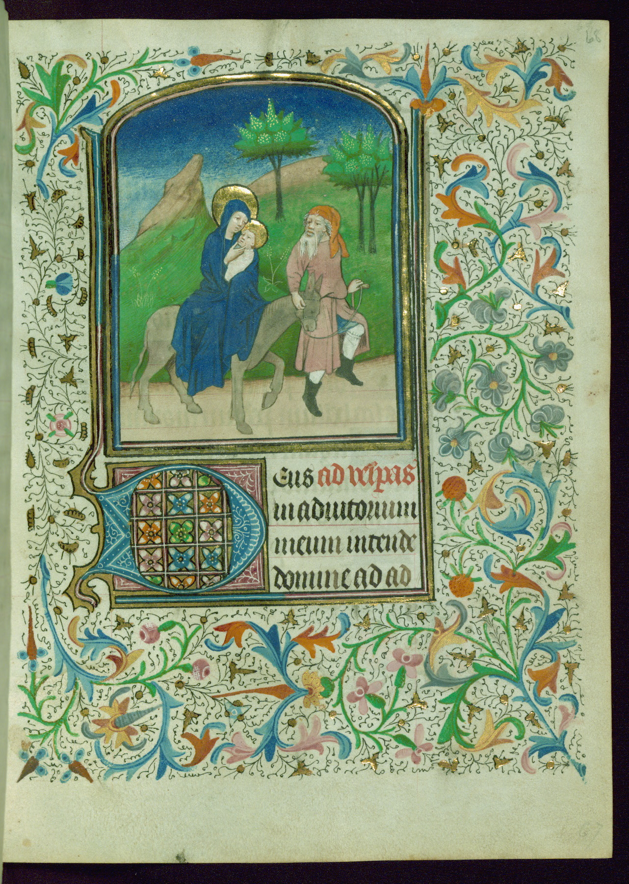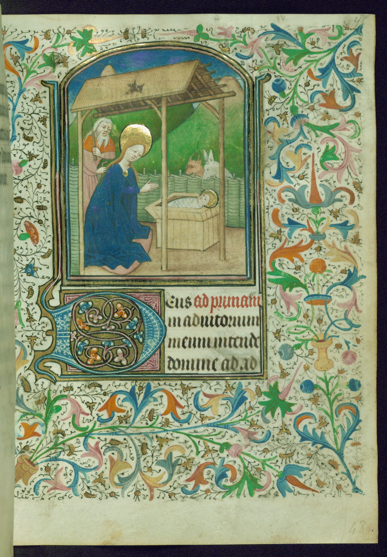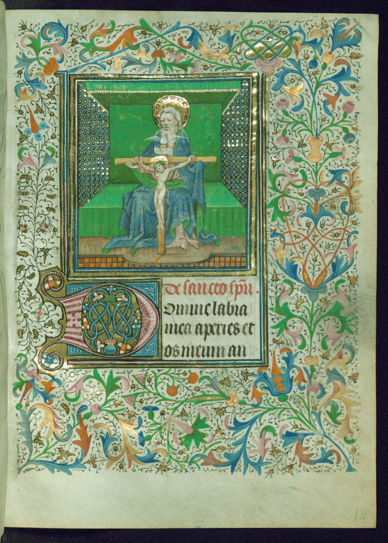- Decoration note: Illumination in the style of the Master of Guillebert de Mets, ca. 1440-50; two full-page miniatures (inserted); eleven extant smaller miniatures (one inserted); one historiated initial; one drollery; decorated illuminated initials of burnished gold, on gray bole through fol. 161, on dark brown bole in additions: found at text openings below miniatures, at opening of Advent Office of the Virgin, at secondary text divisions; versals; "K L" in calendar; at prayer openings of texts additions; borders, gold burnished on tan bole (with some exceptions): at three openings marked by miniatures (fols. 9r, 17r, 58r), eight openings marked by miniatures (fols. 13r, 48r, 53r, 63r, 68r, 74r, 94r, 117r), around full-page miniatures of added texts, as well as around text opposite of full-page miniatures of added texts; line fillers of panel type in blue and/or mauve, crudely patterned in white, regular color division marked by gold disk at center; rubrics in red; text in dark brown ink