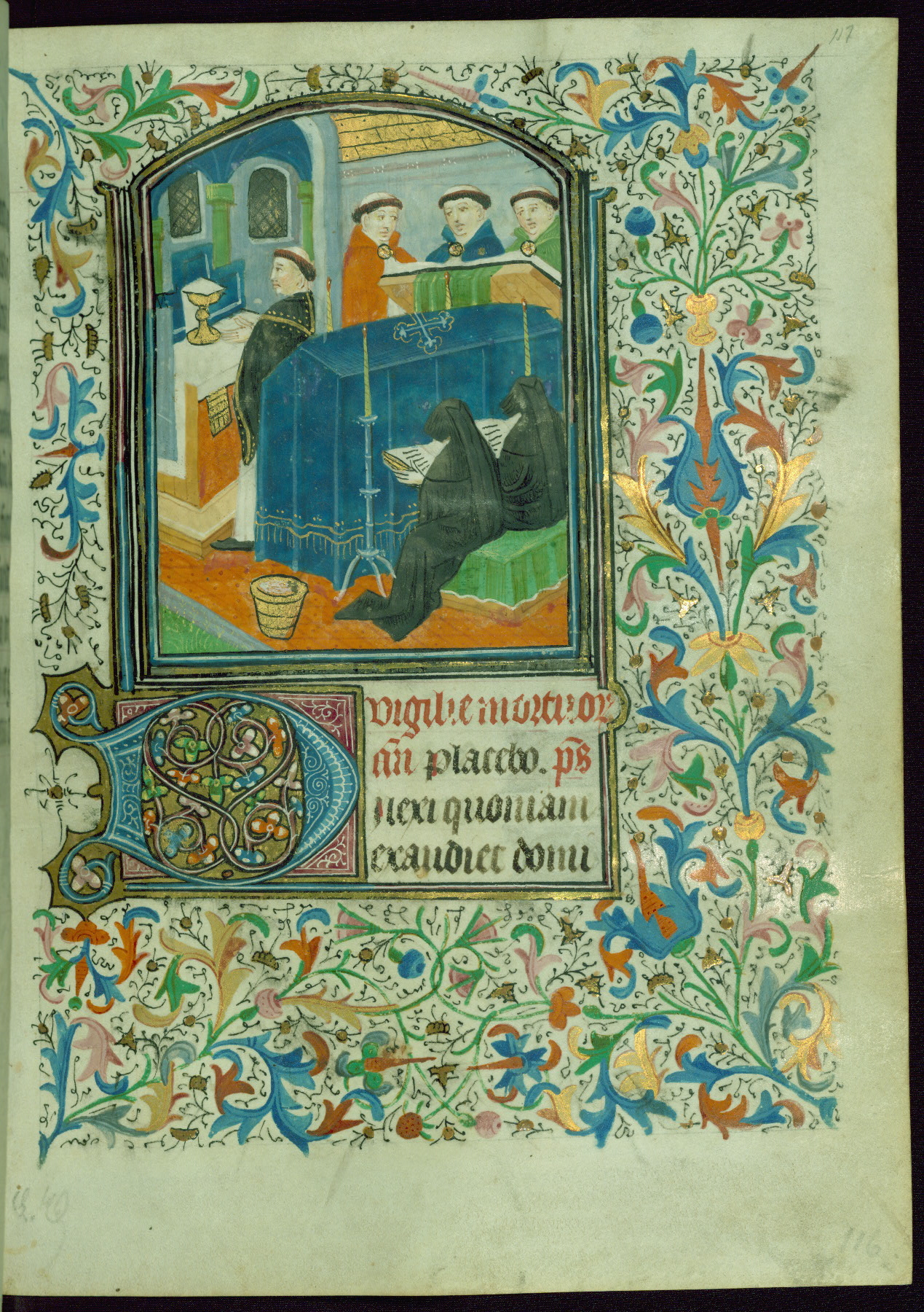 - Contents: Fols. 107r-116v: Litany, format as for Use of Rome, with a few regional saints; sixteen apostles and disciples, from Peter to Mark, Matthew listed twice; sixteen martyrs, including Nicasius "cum s. tuis," Gereon "c. s. tuis"; seven popes and confessors, including Louis; seven confessors/monks/hermits/priests/levites, including Leonard; sixteen female saints (notable quantity), including Mary Magdalene, Mary Egyptian, Clare, Martha, Anne, Ursula; fols. 110v-112v: petitions, invocations; fols. 113r-v: Psalm 69 in full, ending "Gloria Patri"; fols. 113v-116v: sequence of invocations; nine collects