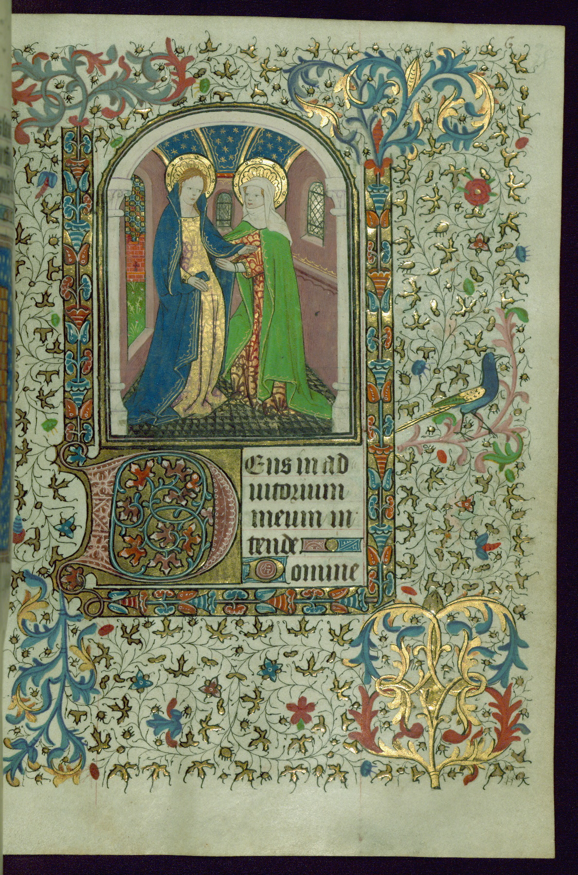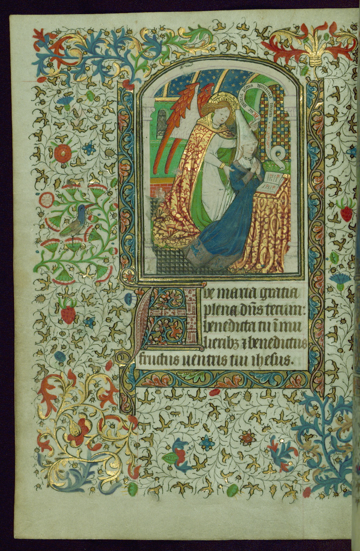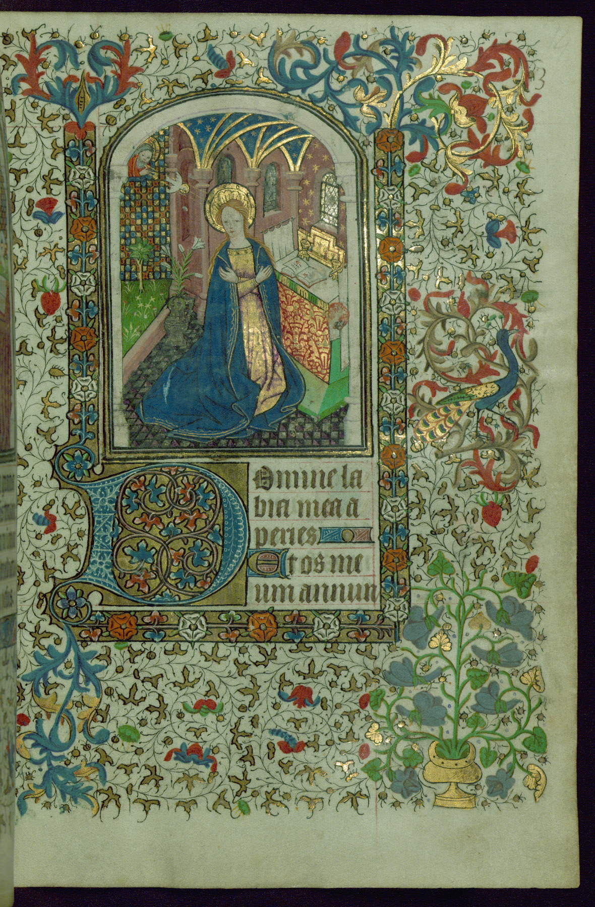 - Contents: Gabriel's salutation to the Virgin Mary on fol. 13v; Hours of the Virgin begins on fol. 14r; common features were noted by John Plummer in a Psalter-Hours for a nunnery, perhaps St. Leonard de Guines, diocese of Thérouanne (BN lat. 1073a); intermittent invocations for female gender, some for the use of Rome