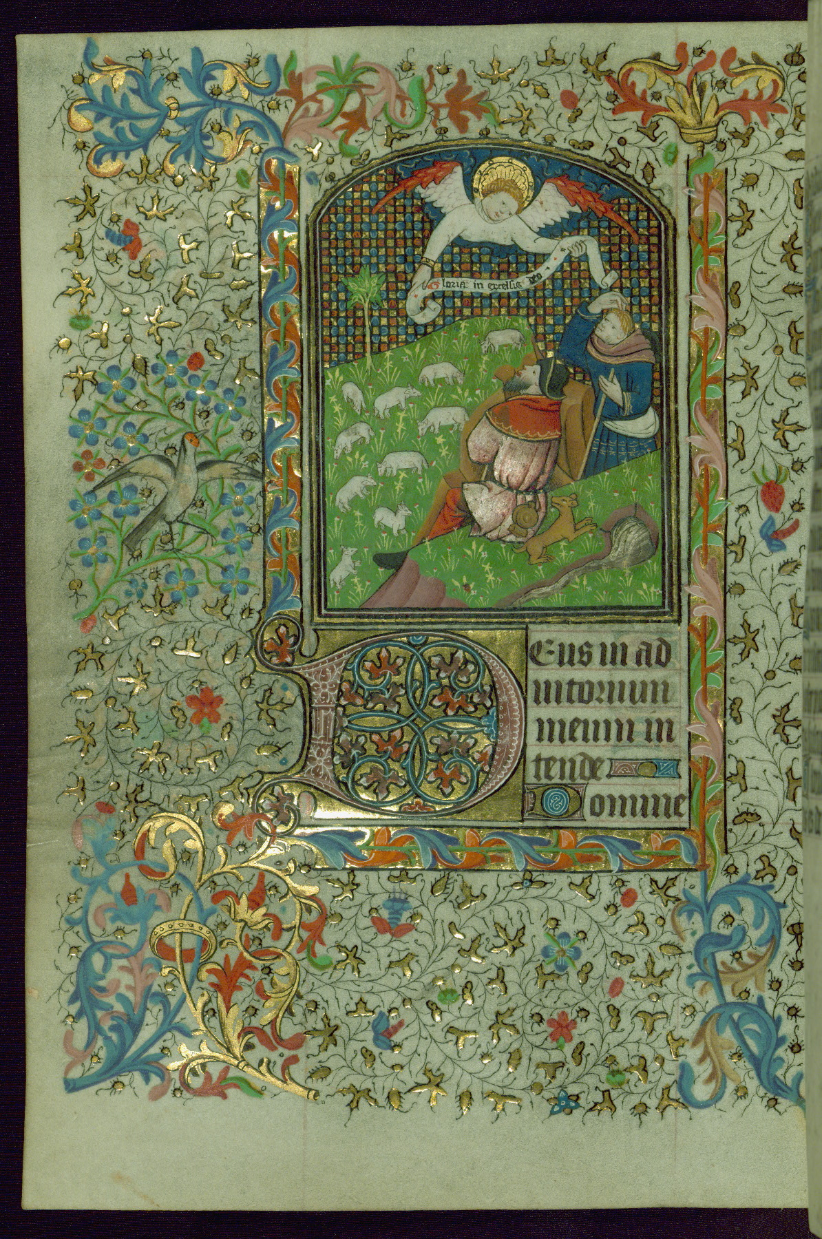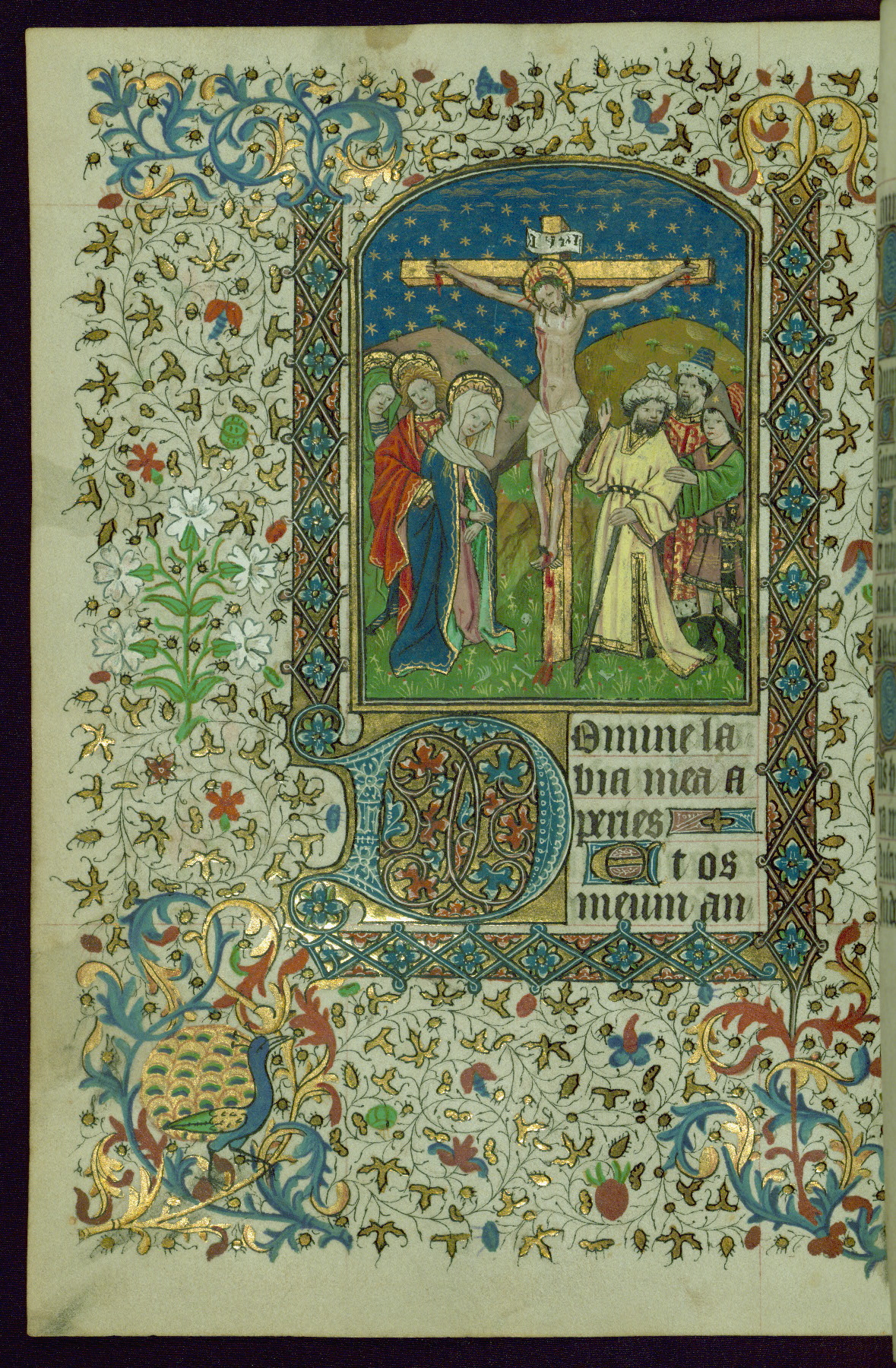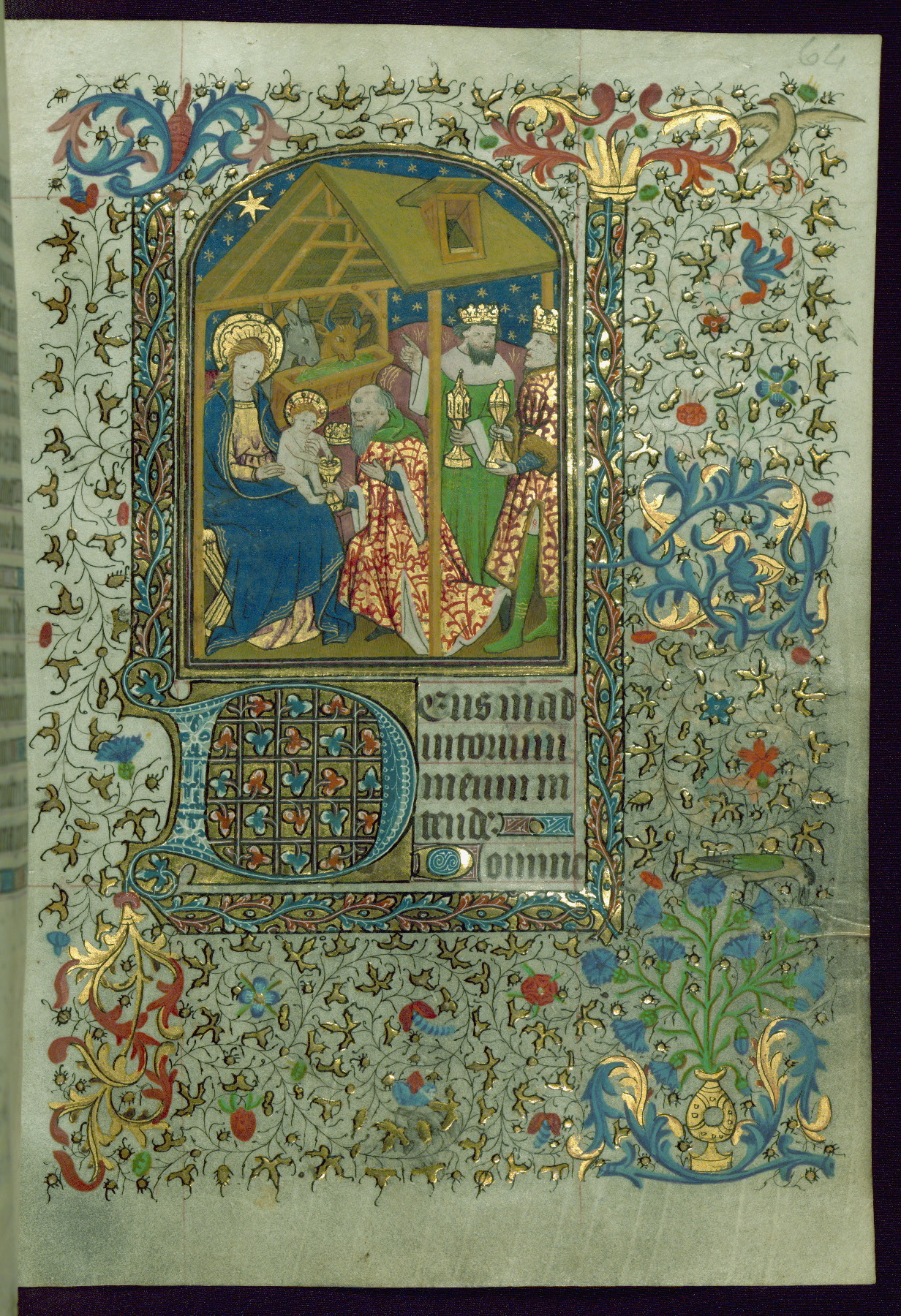 - Contents: Gabriel's salutation to the Virgin Mary on fol. 13v; Hours of the Virgin begins on fol. 14r; common features were noted by John Plummer in a Psalter-Hours for a nunnery, perhaps St. Leonard de Guines, diocese of Thérouanne (BN lat. 1073a); intermittent invocations for female gender, some for the use of Rome