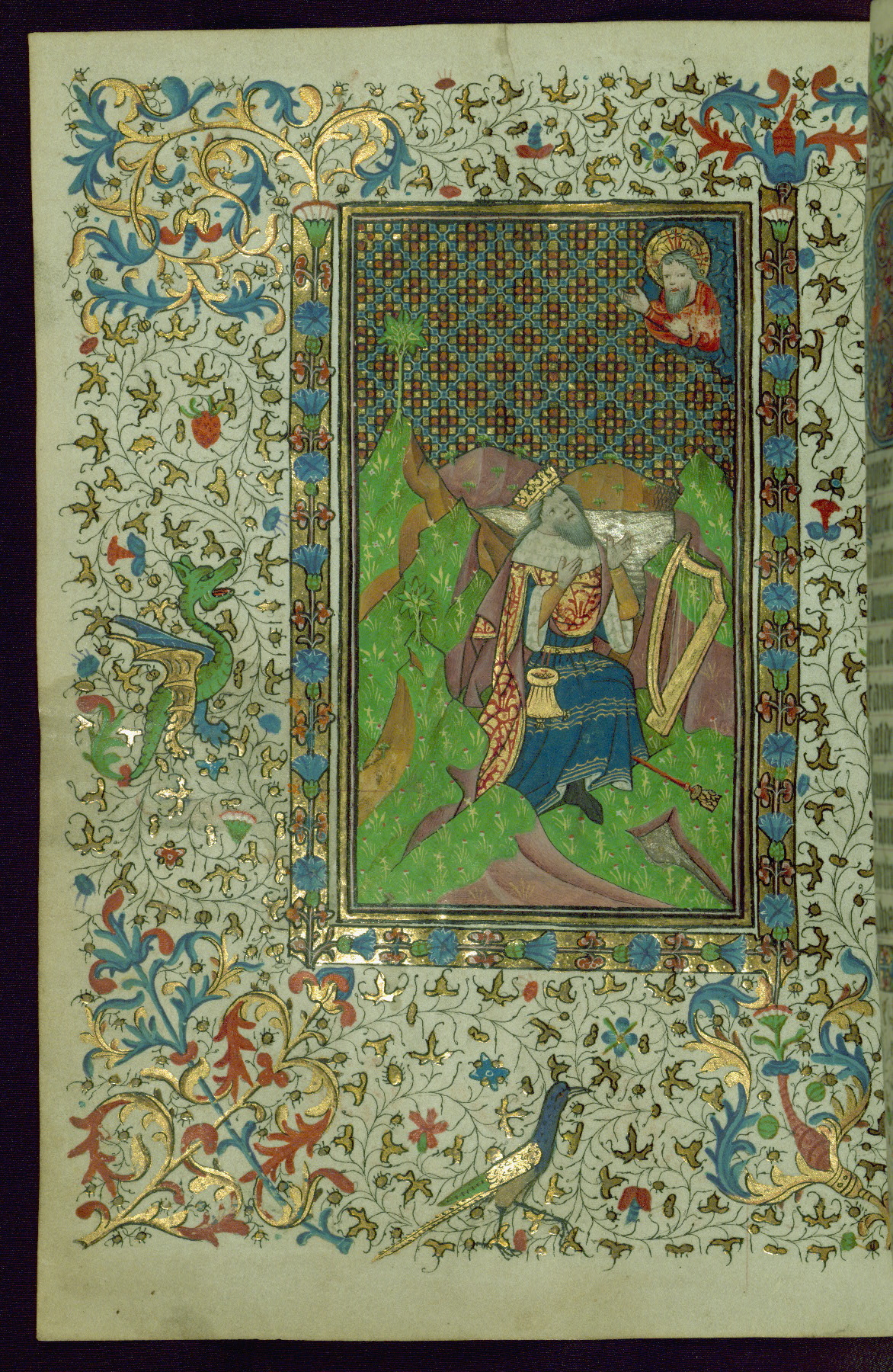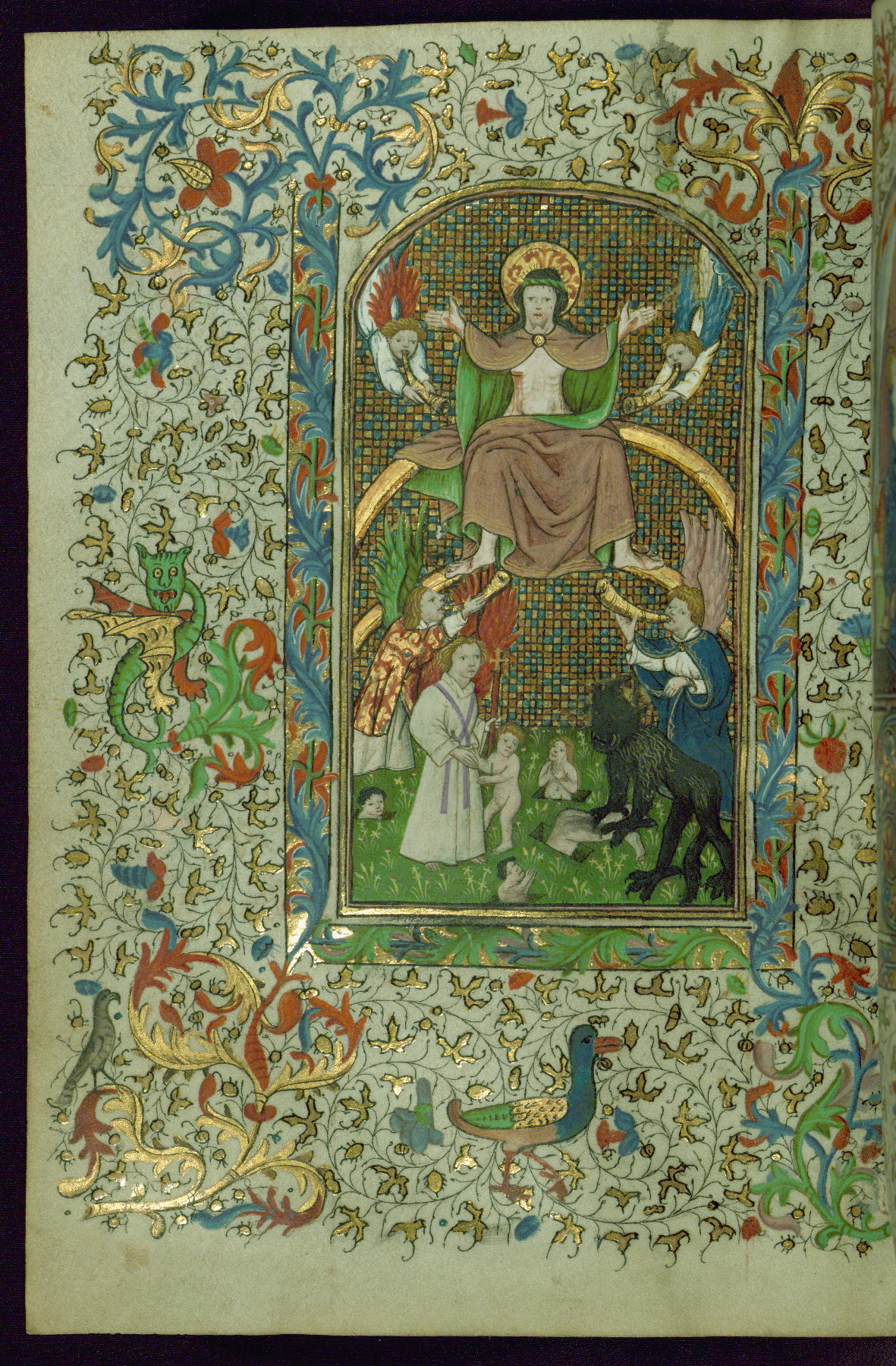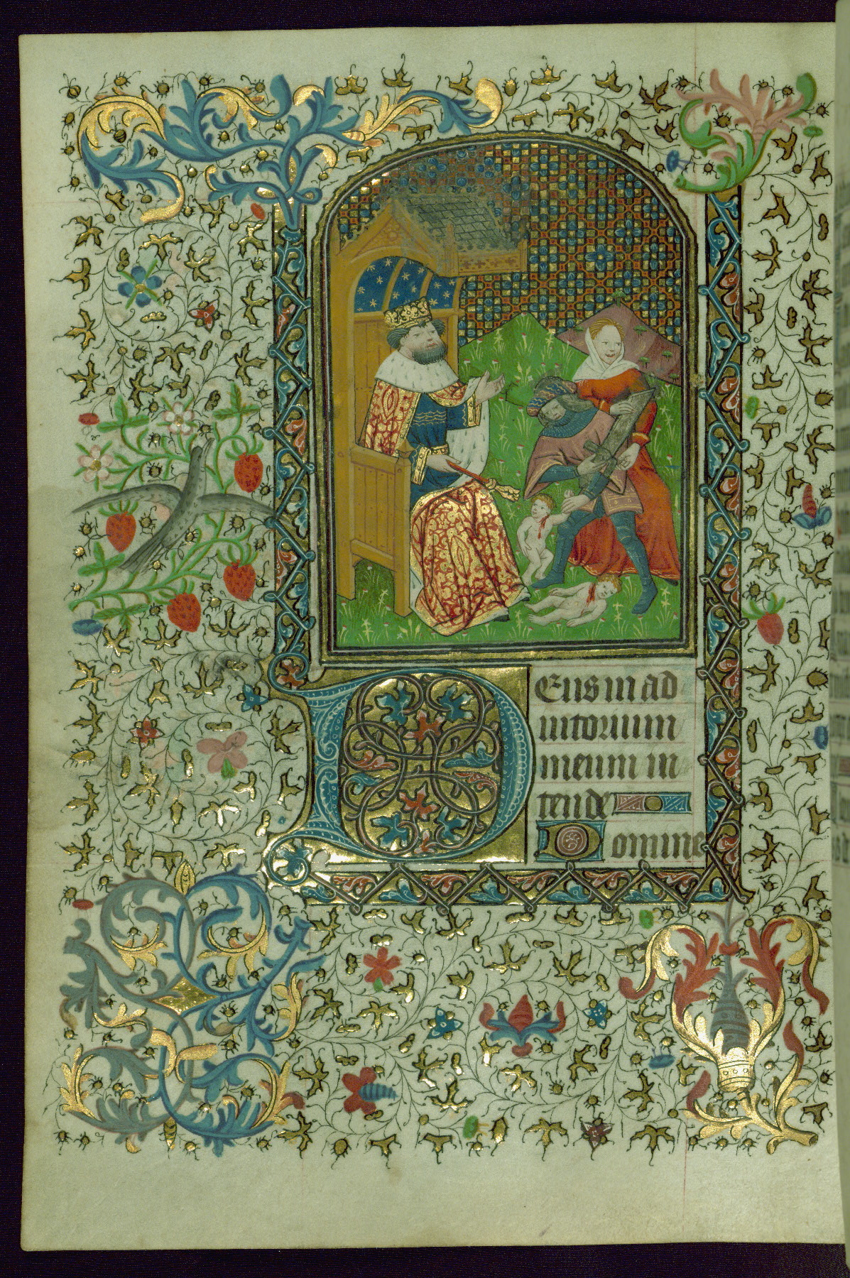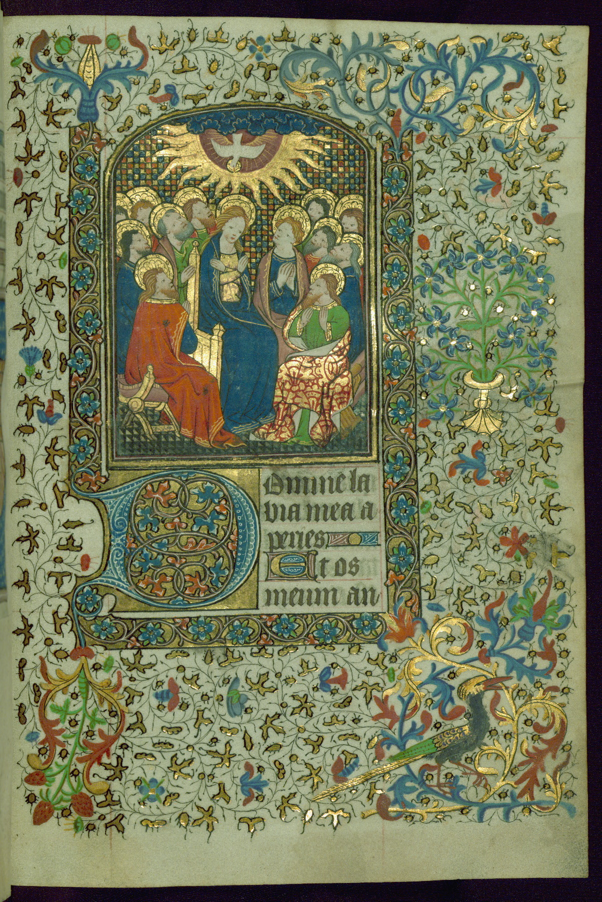 - Decoration note: Twenty-one miniatures: two full-page miniatures, inserted, and nineteen small miniatures; illuminated borders present around full-page miniatures on pages facing full-page miniatures, at two openings with smallest historiated initials (fols. 37v, 208r), and on pages with initials of 2 lines; planned with abundant use of purple for flowers, berries, and acanthus; a general plan of thin-stemmed acanthus, floral or berry spray at base and fore-edge; borders inhabited periodically by animate motifs, mostly songbirds or peacocks; decorated illuminated initials in rose-mauve or blue on gold ground at text divisions marked by small miniatures; extenders end in flowers or leaves; secondary text divisions marked by small decorated gold initials (2 lines) and smaller initials (1 line) for versals; rubrics in red ink; text in dark brown ink