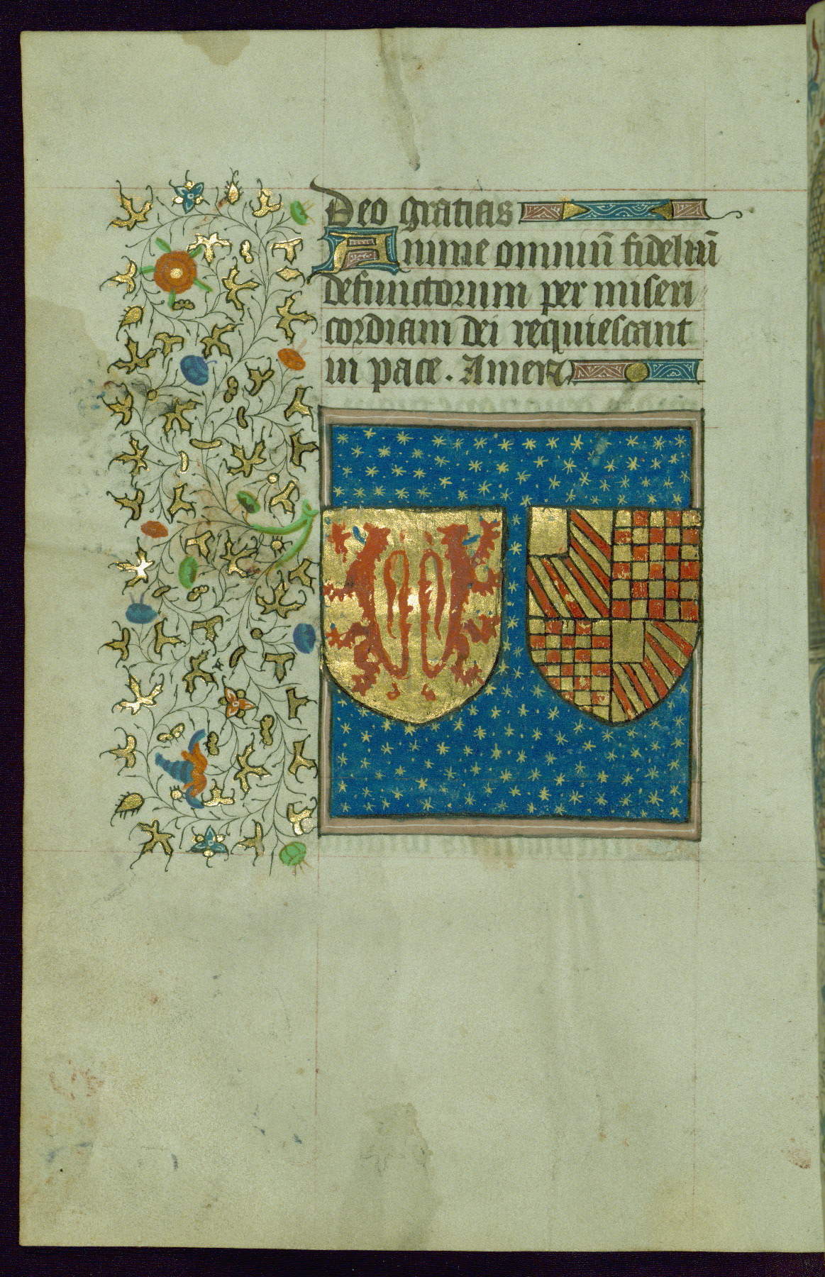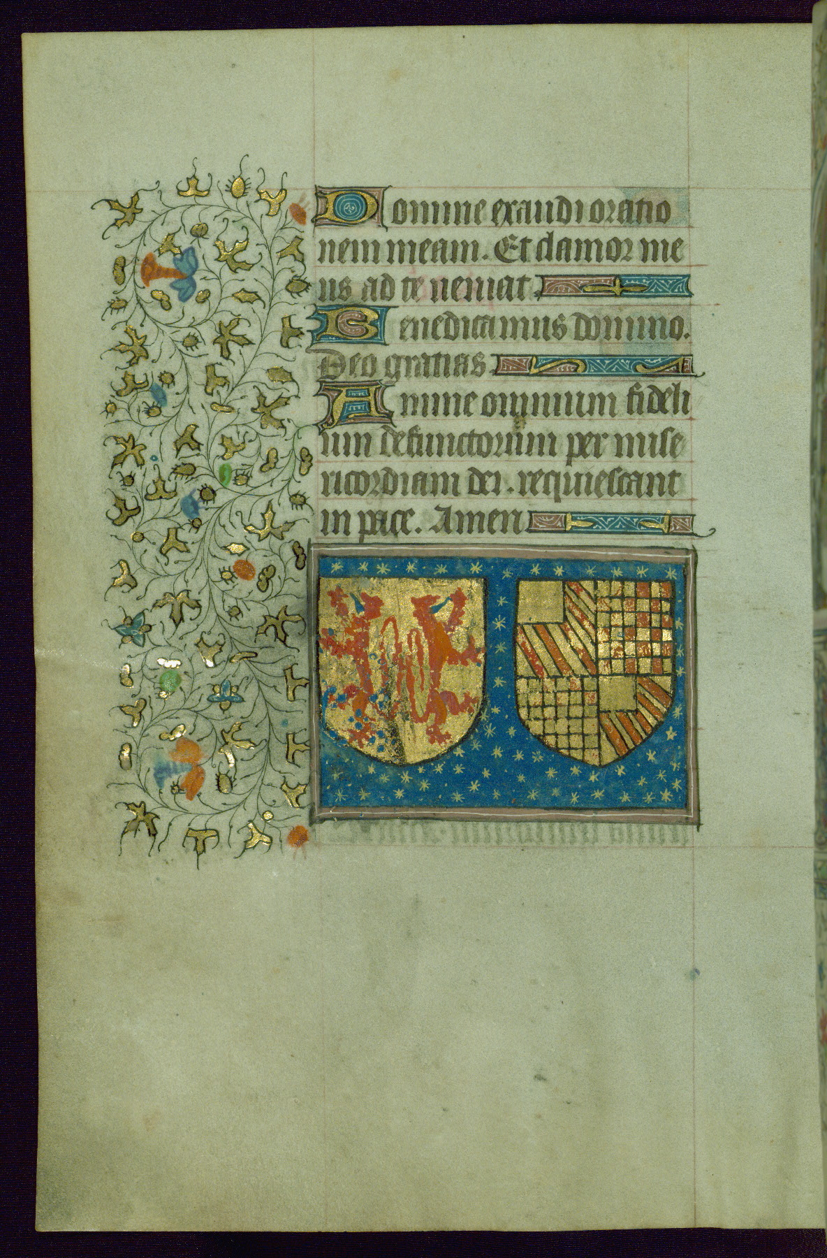 This Book of Hours was created in Hainaut, France, ca. 1450-60. The first owner was likely female, as a female donor is depicted on fol. 13v. Perhaps among the most noteworthy components of the book is the heraldry present throughout. Armorial shields were added early and identified by Michel Pastoureau as arms of a member of the Buves family of Picardy. There are two heraldic coats of arms: the first is of two gold lions, the second remains unidentified. While the armorial shields are sometimes present as stand-alone images, the two are often juxtaposed below prayers, such as Matins in the Hours of the Virgin, Compline in the Hours of the Virgin, and the Office of the Dead.
