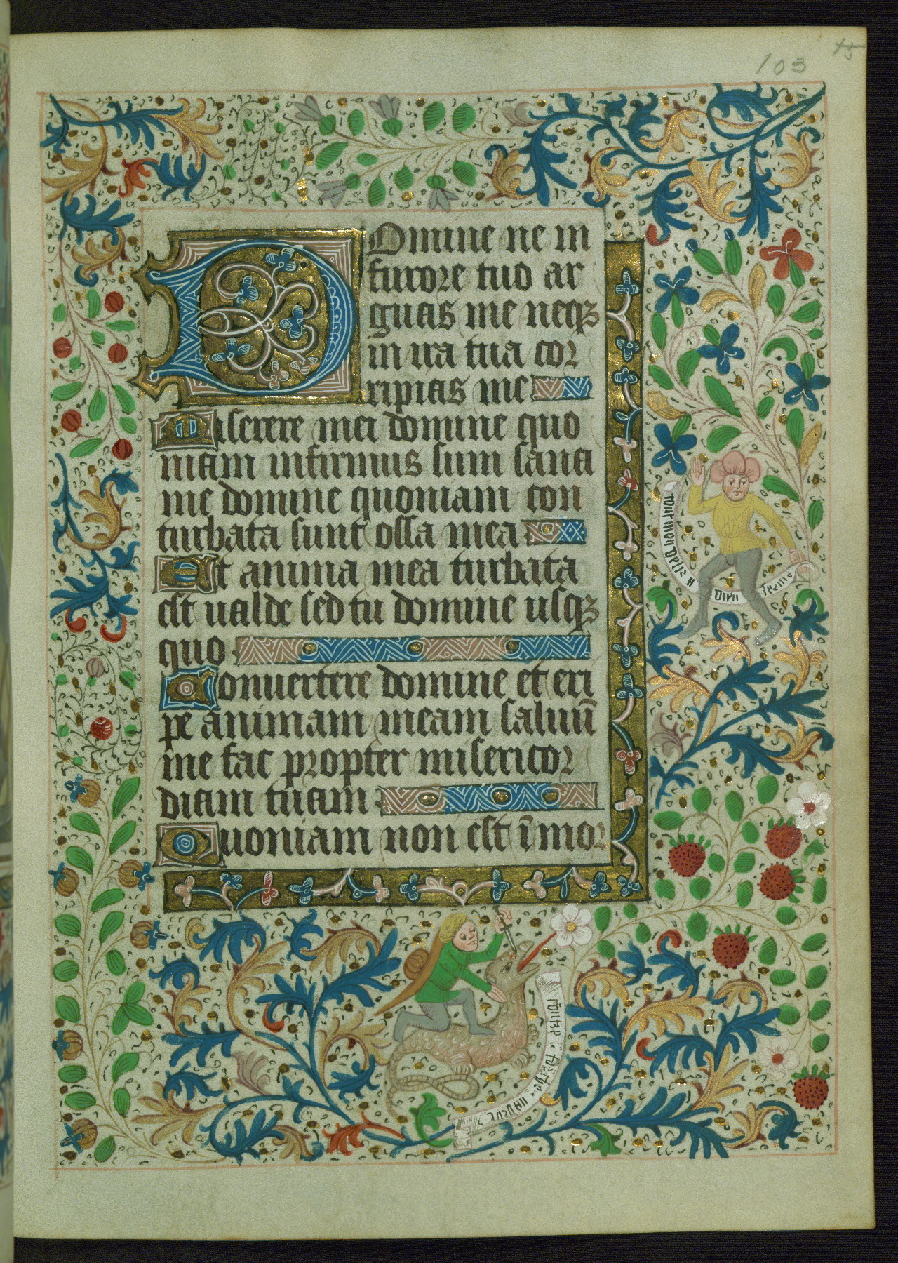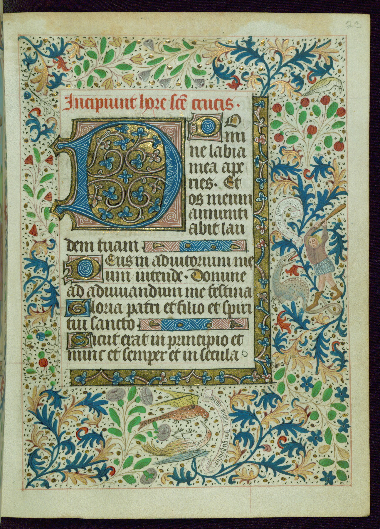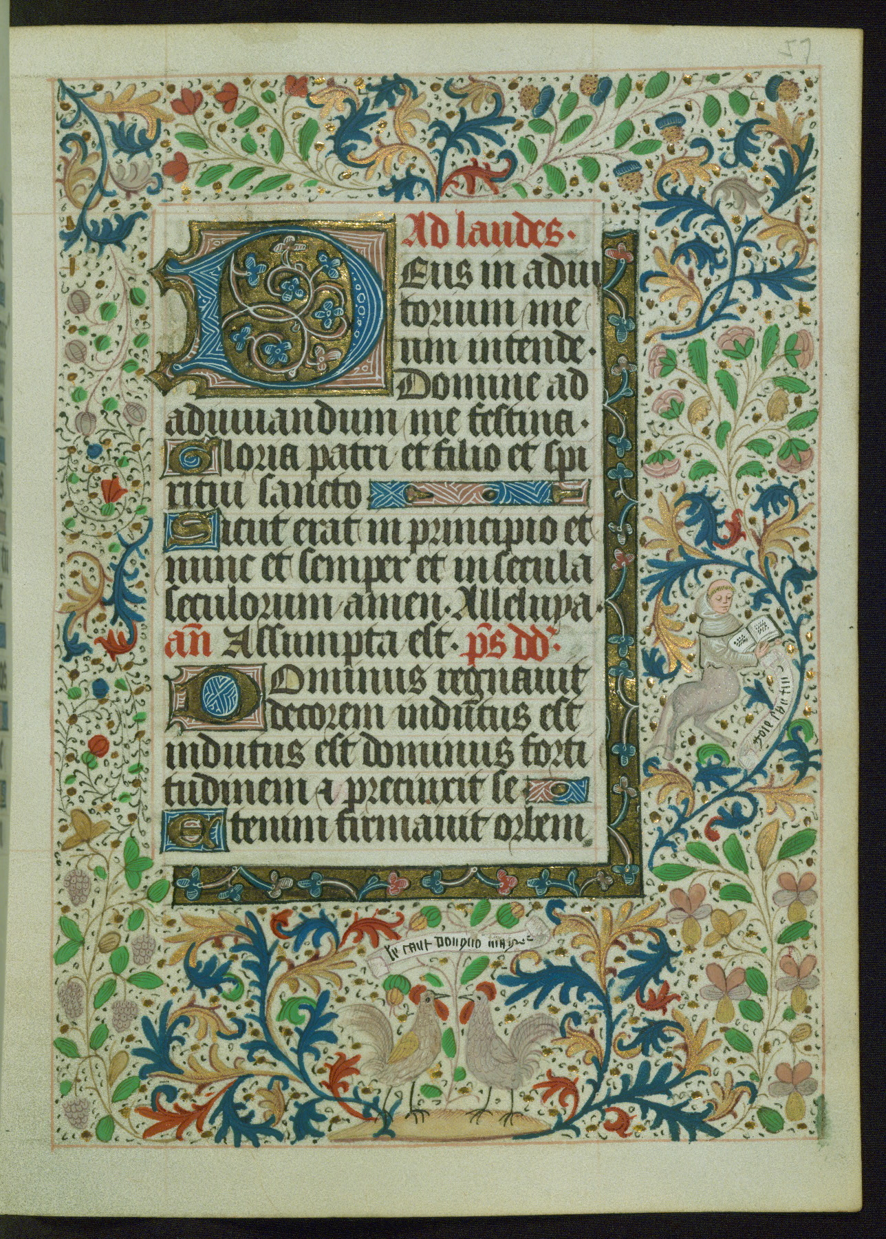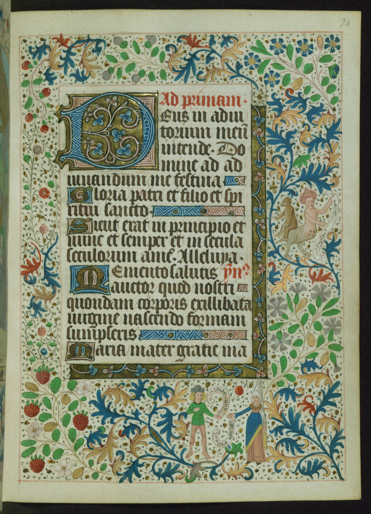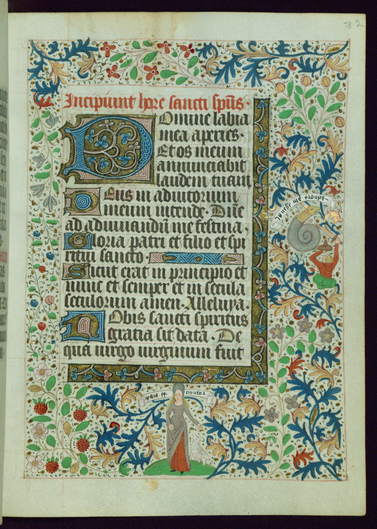This Book of Hours from ca. 1480 was possibly made in Tournai. The manuscript passed through the hands of several women, and while the first owner was anonymous, the text and imagery reveals she had Franciscan sympathies. An eighteenth-century inscription at the front of the manuscript suggests it was presented to Philippa of Guelders (ca. 1480-1562) by Pope Leo X upon her ordination at the Franciscan convent of Sainte-Clare in Pont-a-Mousson in 1520. The quality of the miniatures suggests that the artist was a novice, yet his expressive individual style and unusual marginalia, in which figures and animals hold scrolls inscribed with French phrases, provide the manuscript with considerable charm.