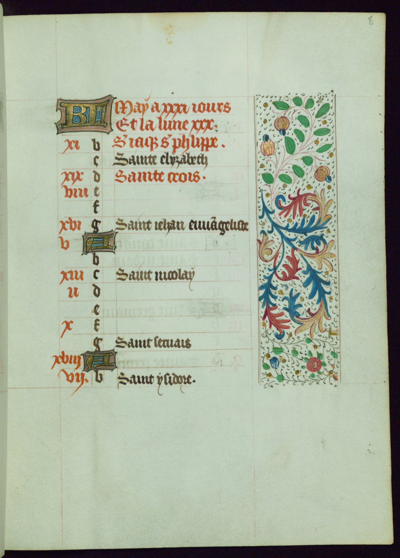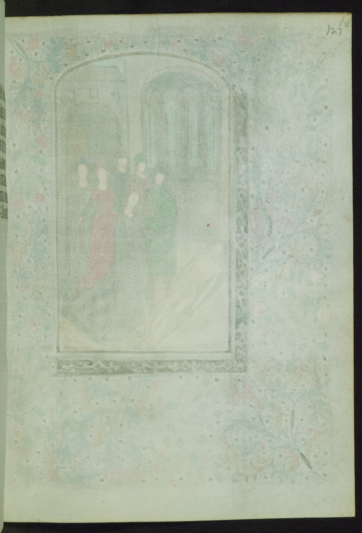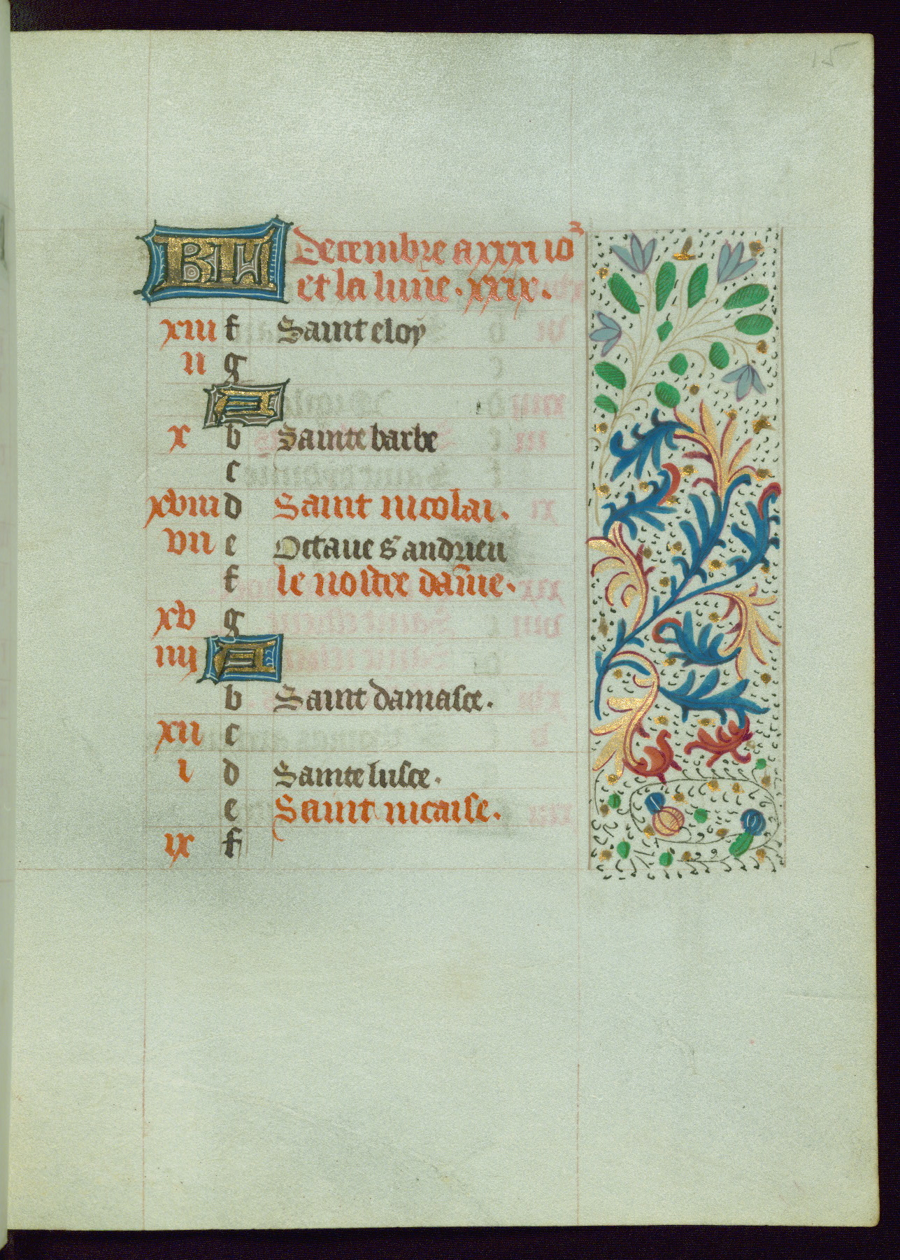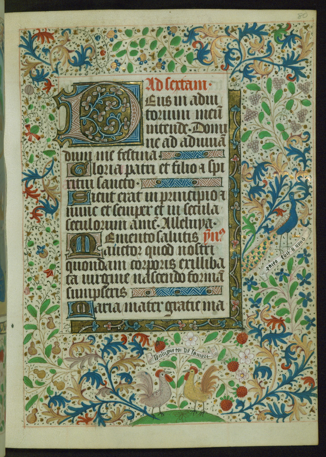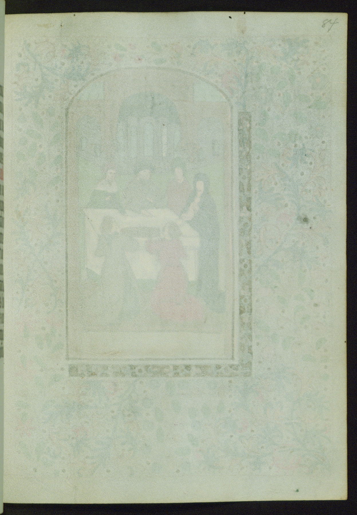 This Book of Hours from ca. 1480 was possibly made in Tournai. The manuscript passed through the hands of several women, and while the first owner was anonymous, the text and imagery reveals she had Franciscan sympathies. An eighteenth-century inscription at the front of the manuscript suggests it was presented to Philippa of Guelders (ca. 1480-1562) by Pope Leo X upon her ordination at the Franciscan convent of Sainte-Clare in Pont-a-Mousson in 1520. The quality of the miniatures suggests that the artist was a novice, yet his expressive individual style and unusual marginalia, in which figures and animals hold scrolls inscribed with French phrases, provide the manuscript with considerable charm.