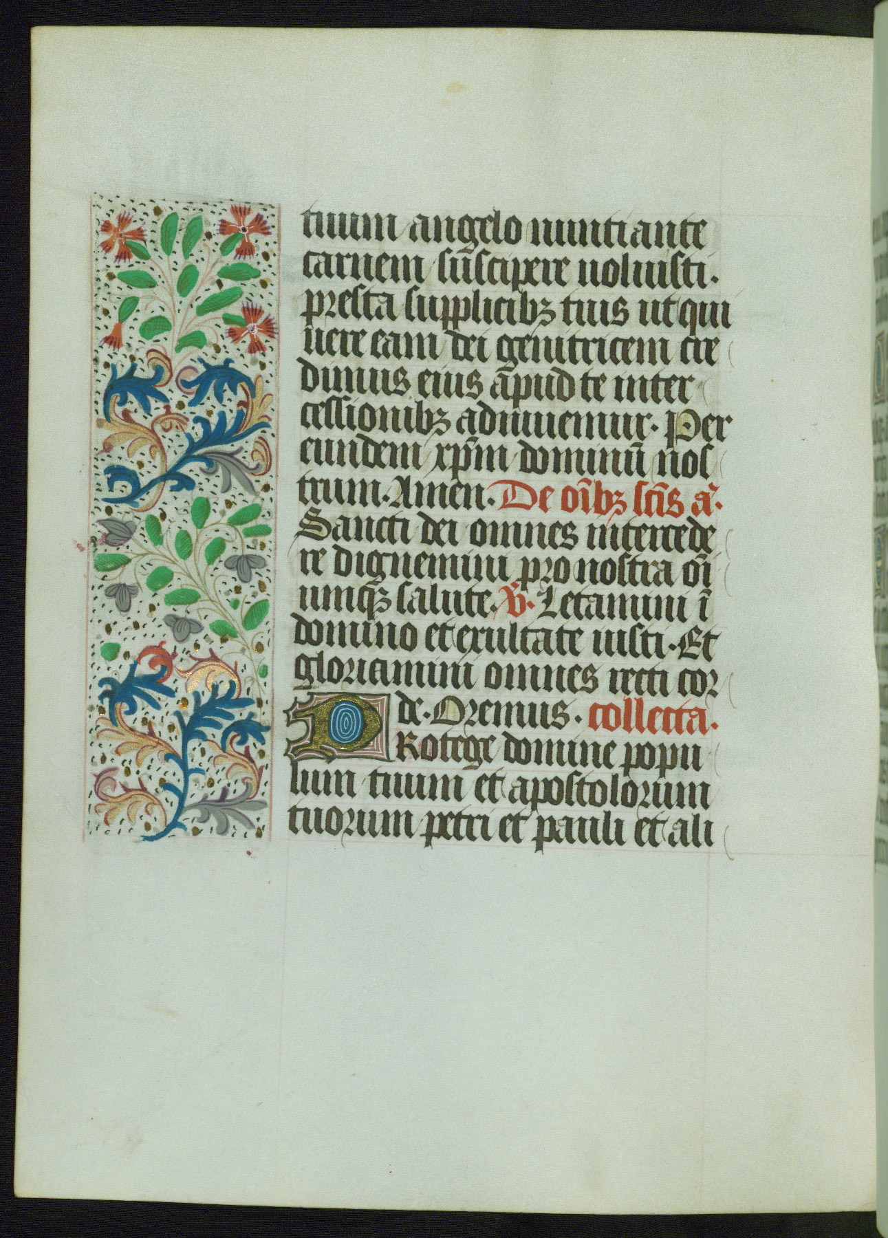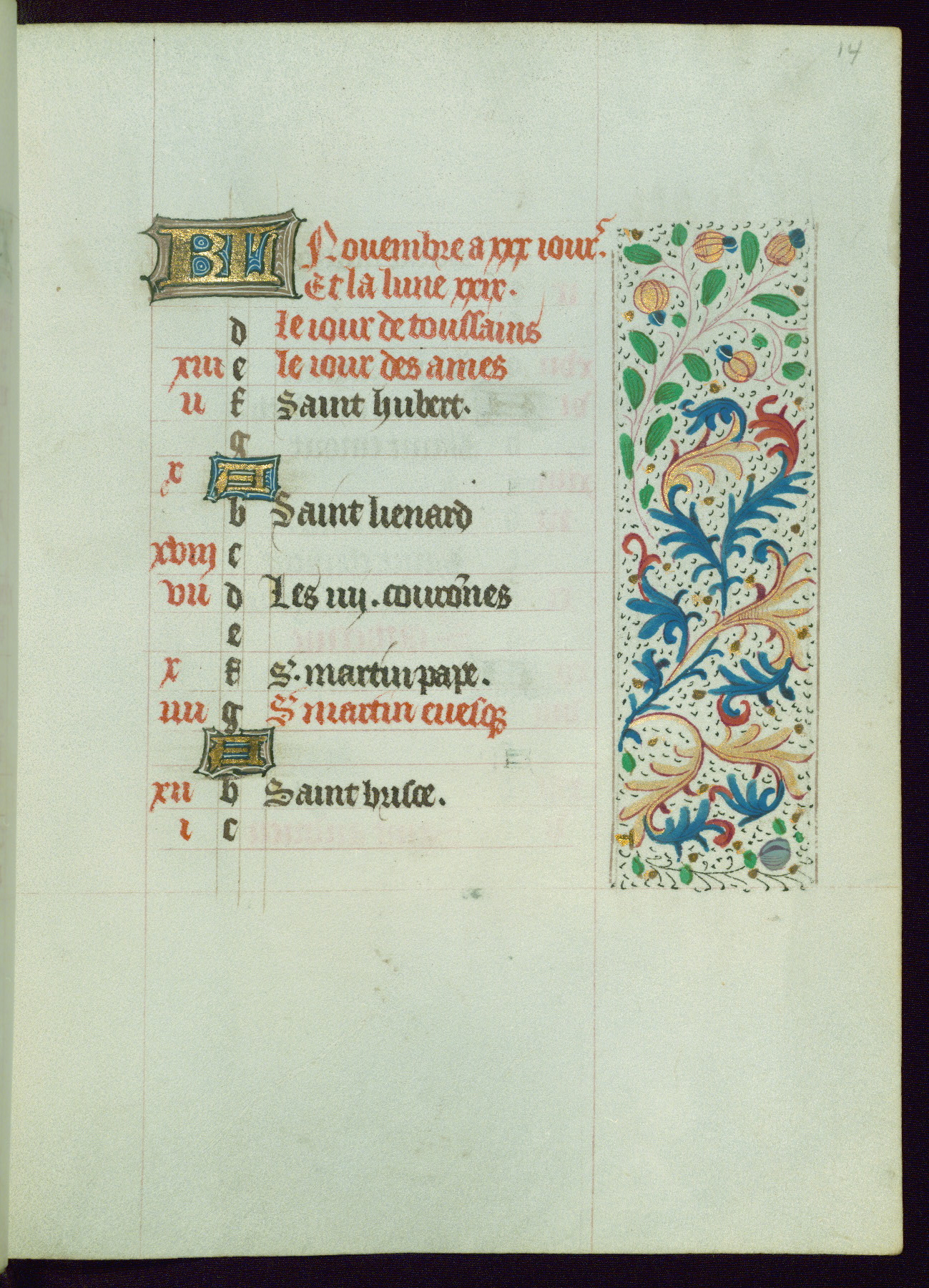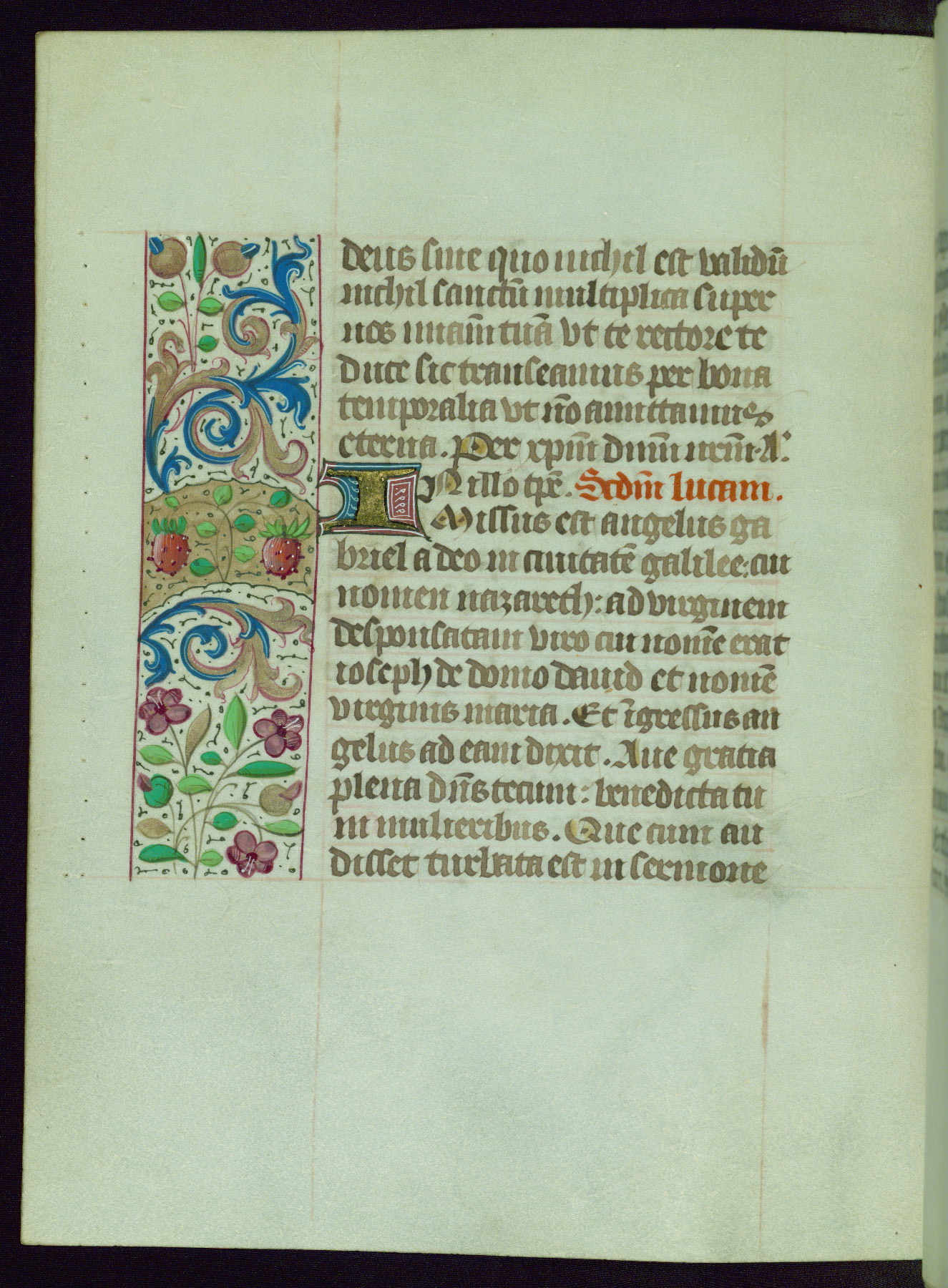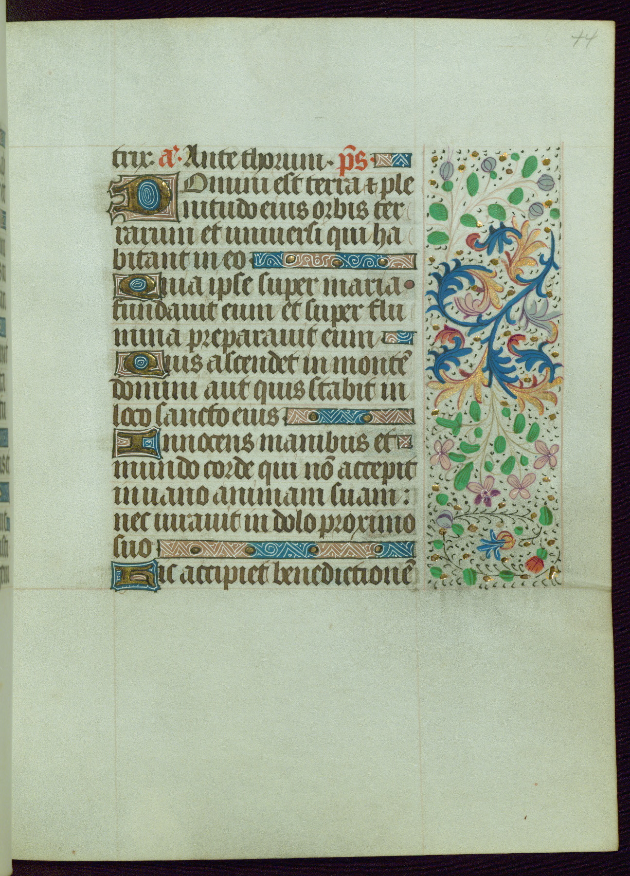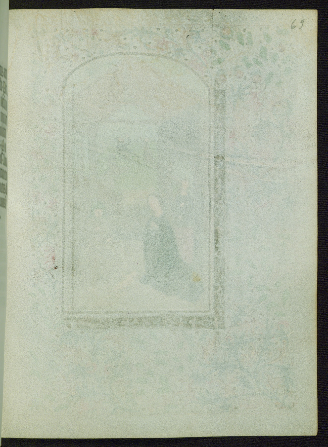 This Book of Hours from ca. 1480 was possibly made in Tournai. The manuscript passed through the hands of several women, and while the first owner was anonymous, the text and imagery reveals she had Franciscan sympathies. An eighteenth-century inscription at the front of the manuscript suggests it was presented to Philippa of Guelders (ca. 1480-1562) by Pope Leo X upon her ordination at the Franciscan convent of Sainte-Clare in Pont-a-Mousson in 1520. The quality of the miniatures suggests that the artist was a novice, yet his expressive individual style and unusual marginalia, in which figures and animals hold scrolls inscribed with French phrases, provide the manuscript with considerable charm.