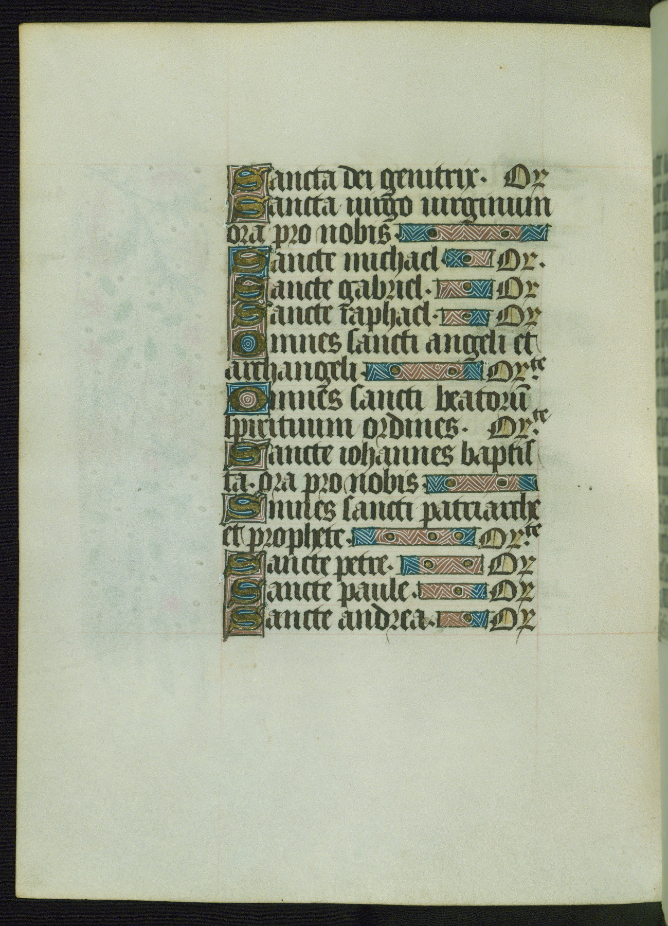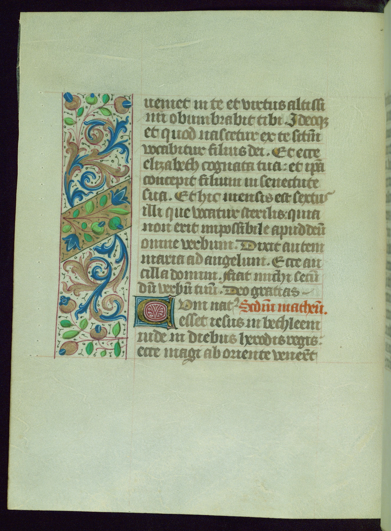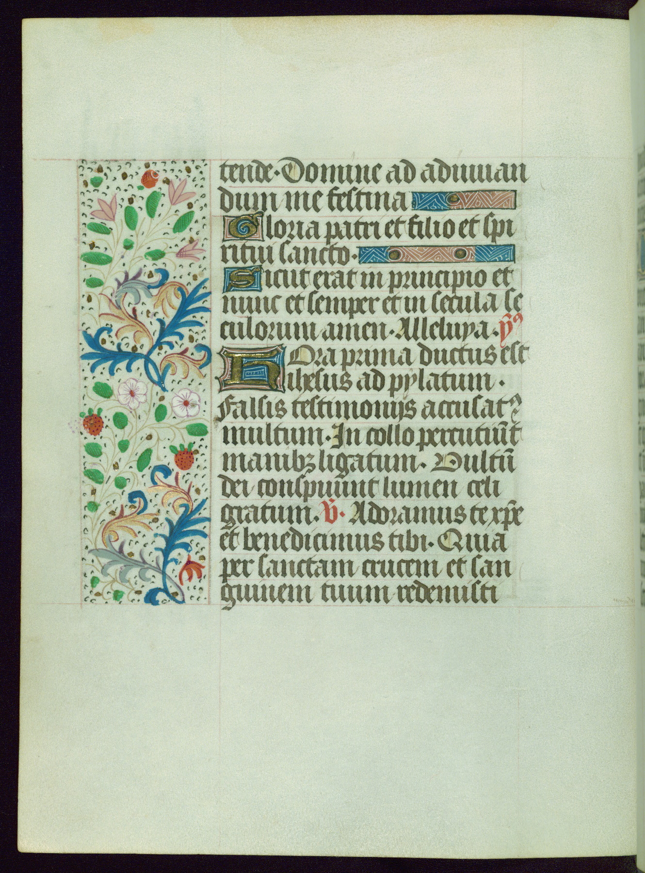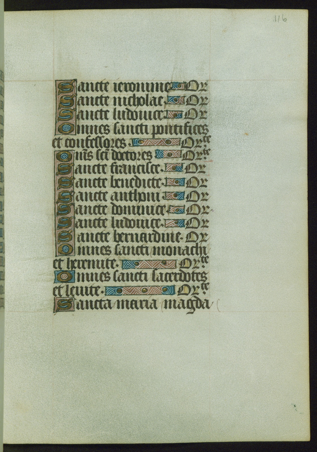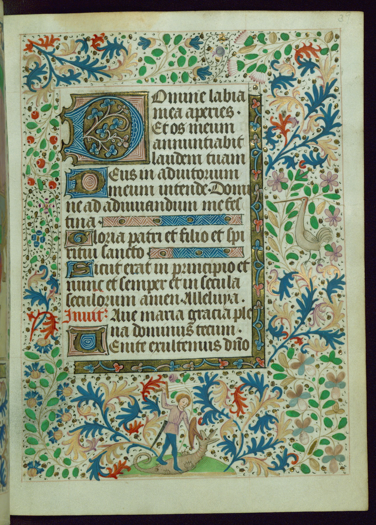 This Book of Hours from ca. 1480 was possibly made in Tournai. The manuscript passed through the hands of several women, and while the first owner was anonymous, the text and imagery reveals she had Franciscan sympathies. An eighteenth-century inscription at the front of the manuscript suggests it was presented to Philippa of Guelders (ca. 1480-1562) by Pope Leo X upon her ordination at the Franciscan convent of Sainte-Clare in Pont-a-Mousson in 1520. The quality of the miniatures suggests that the artist was a novice, yet his expressive individual style and unusual marginalia, in which figures and animals hold scrolls inscribed with French phrases, provide the manuscript with considerable charm.