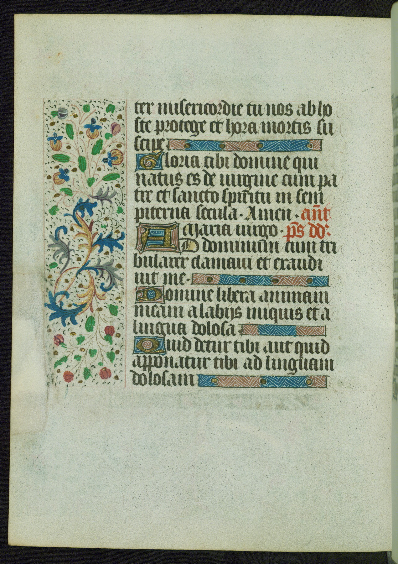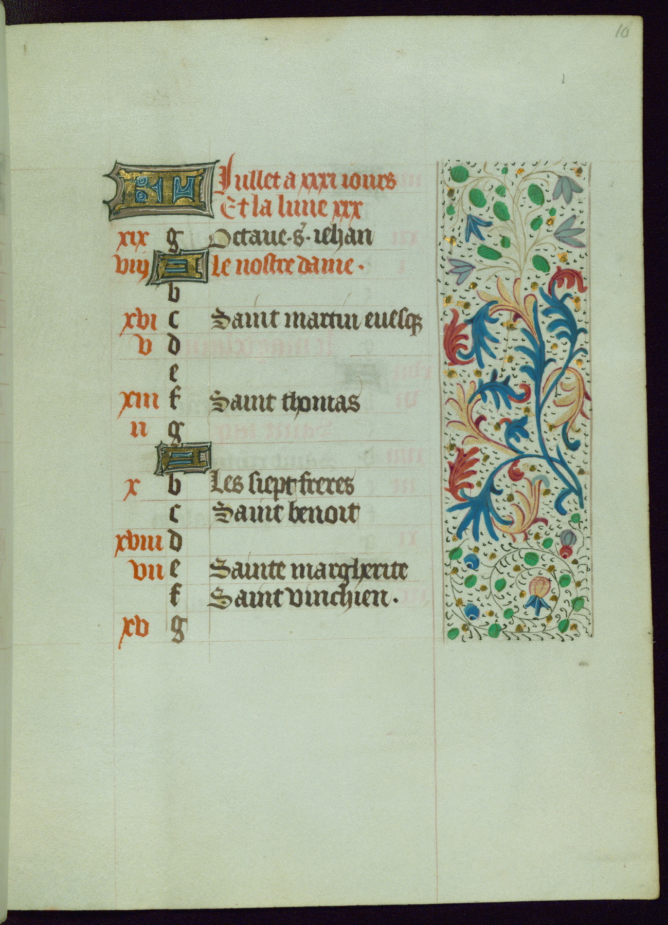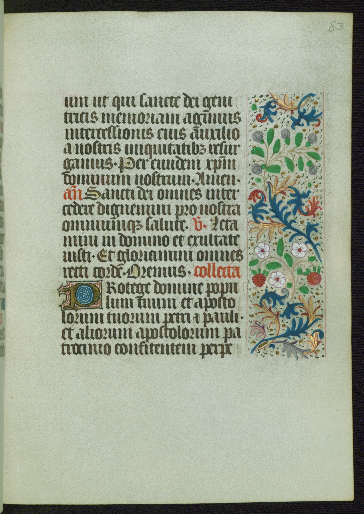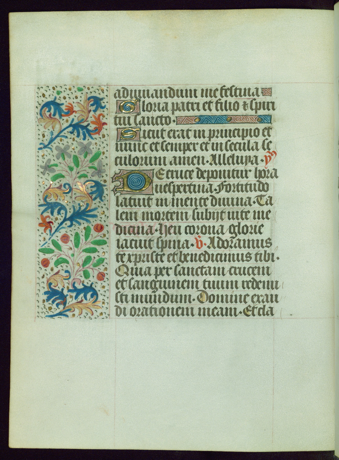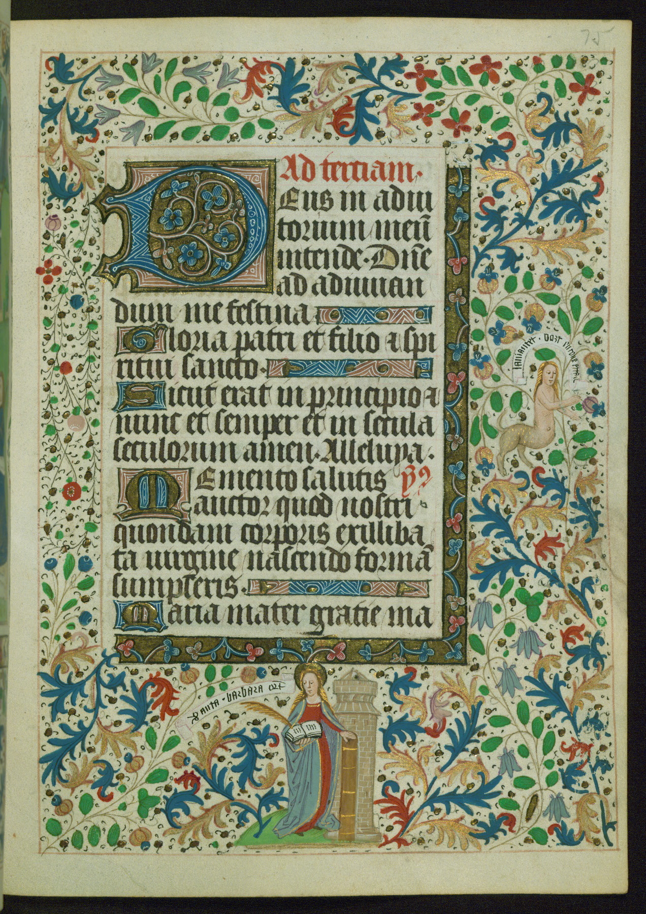 This Book of Hours from ca. 1480 was possibly made in Tournai. The manuscript passed through the hands of several women, and while the first owner was anonymous, the text and imagery reveals she had Franciscan sympathies. An eighteenth-century inscription at the front of the manuscript suggests it was presented to Philippa of Guelders (ca. 1480-1562) by Pope Leo X upon her ordination at the Franciscan convent of Sainte-Clare in Pont-a-Mousson in 1520. The quality of the miniatures suggests that the artist was a novice, yet his expressive individual style and unusual marginalia, in which figures and animals hold scrolls inscribed with French phrases, provide the manuscript with considerable charm.