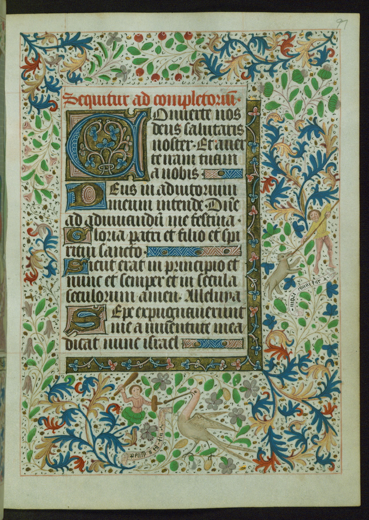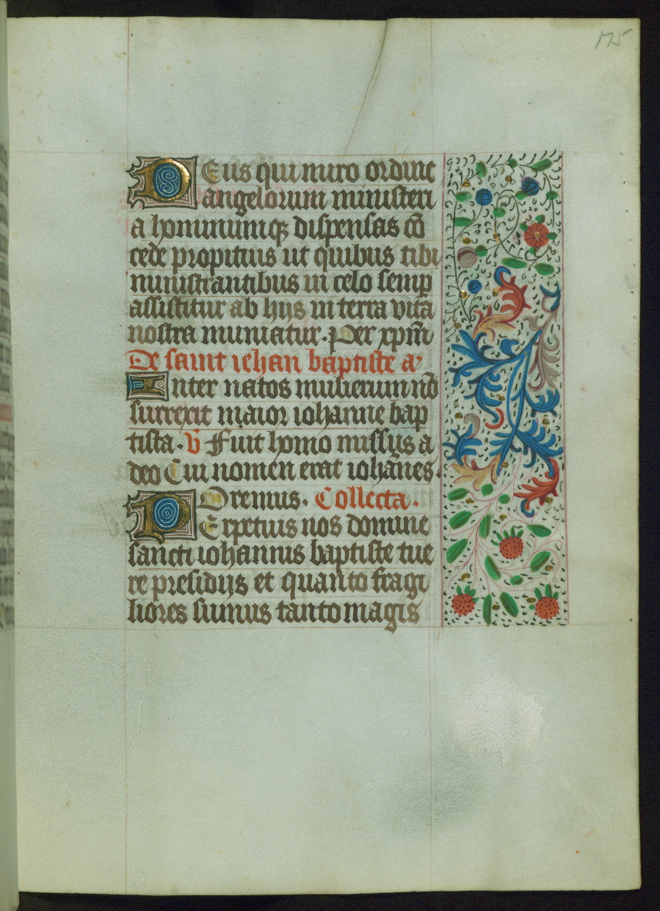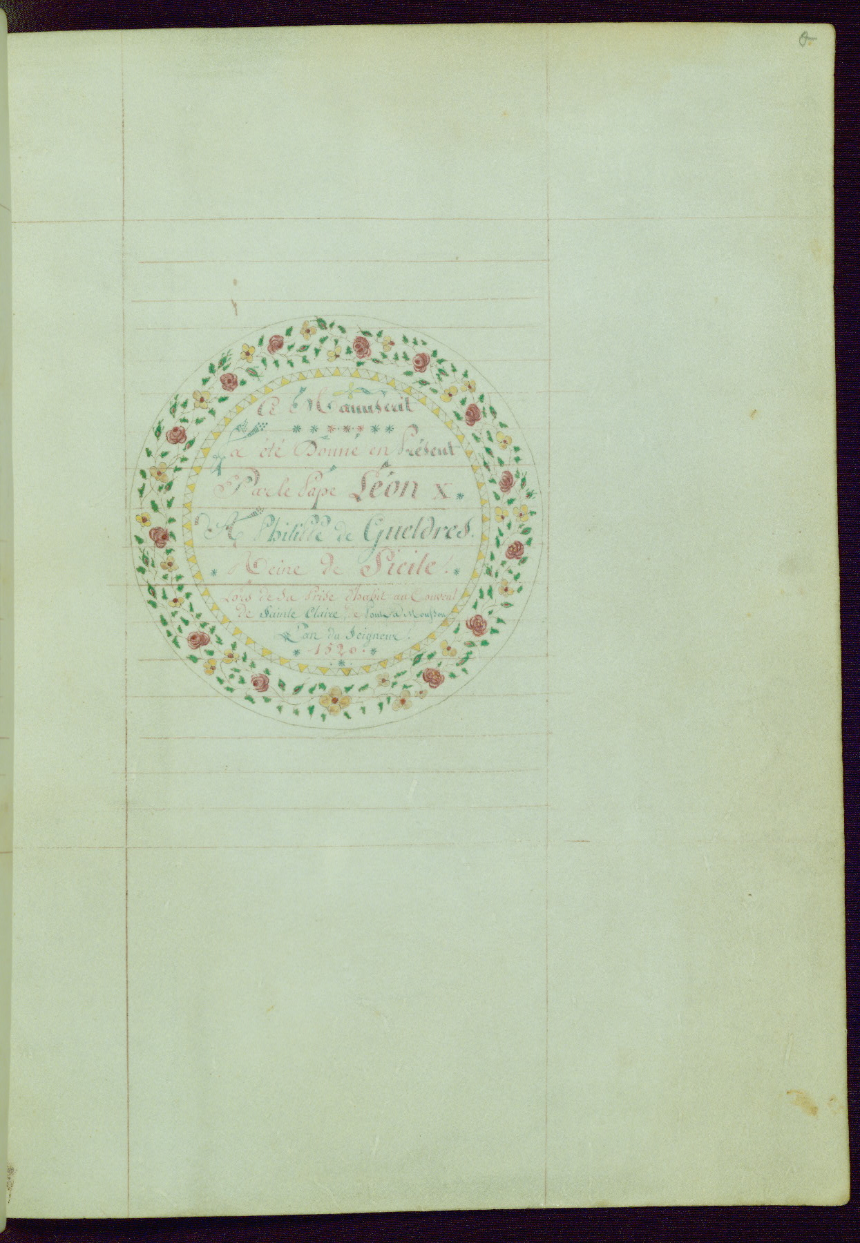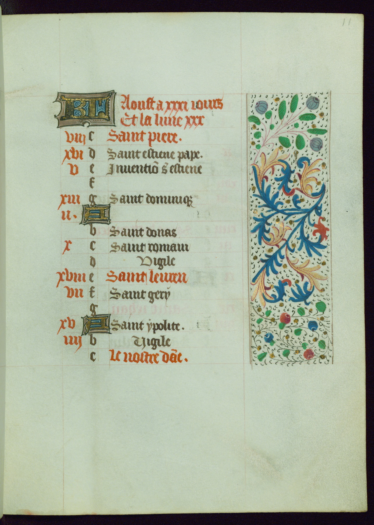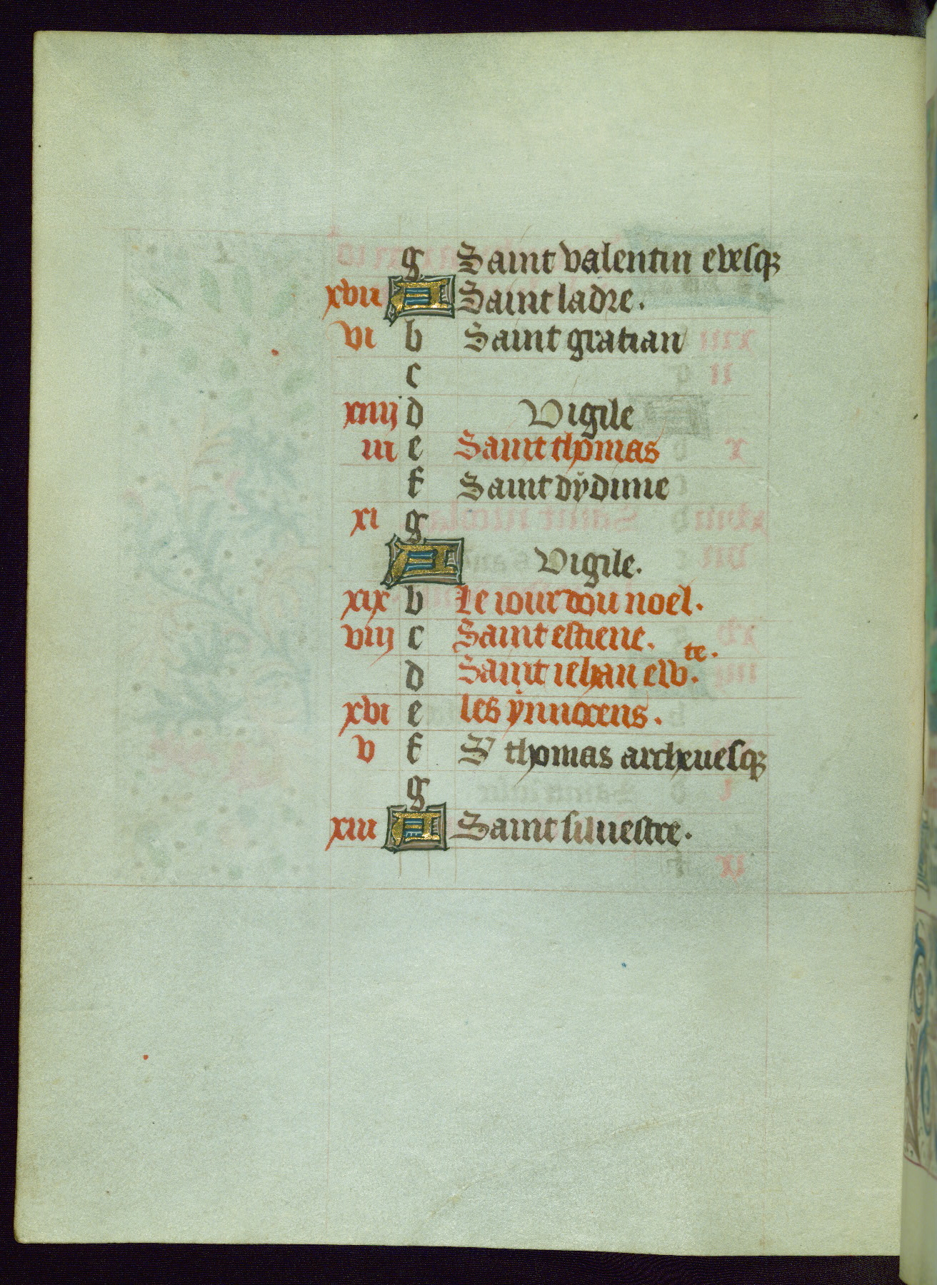 This Book of Hours from ca. 1480 was possibly made in Tournai. The manuscript passed through the hands of several women, and while the first owner was anonymous, the text and imagery reveals she had Franciscan sympathies. An eighteenth-century inscription at the front of the manuscript suggests it was presented to Philippa of Guelders (ca. 1480-1562) by Pope Leo X upon her ordination at the Franciscan convent of Sainte-Clare in Pont-a-Mousson in 1520. The quality of the miniatures suggests that the artist was a novice, yet his expressive individual style and unusual marginalia, in which figures and animals hold scrolls inscribed with French phrases, provide the manuscript with considerable charm.