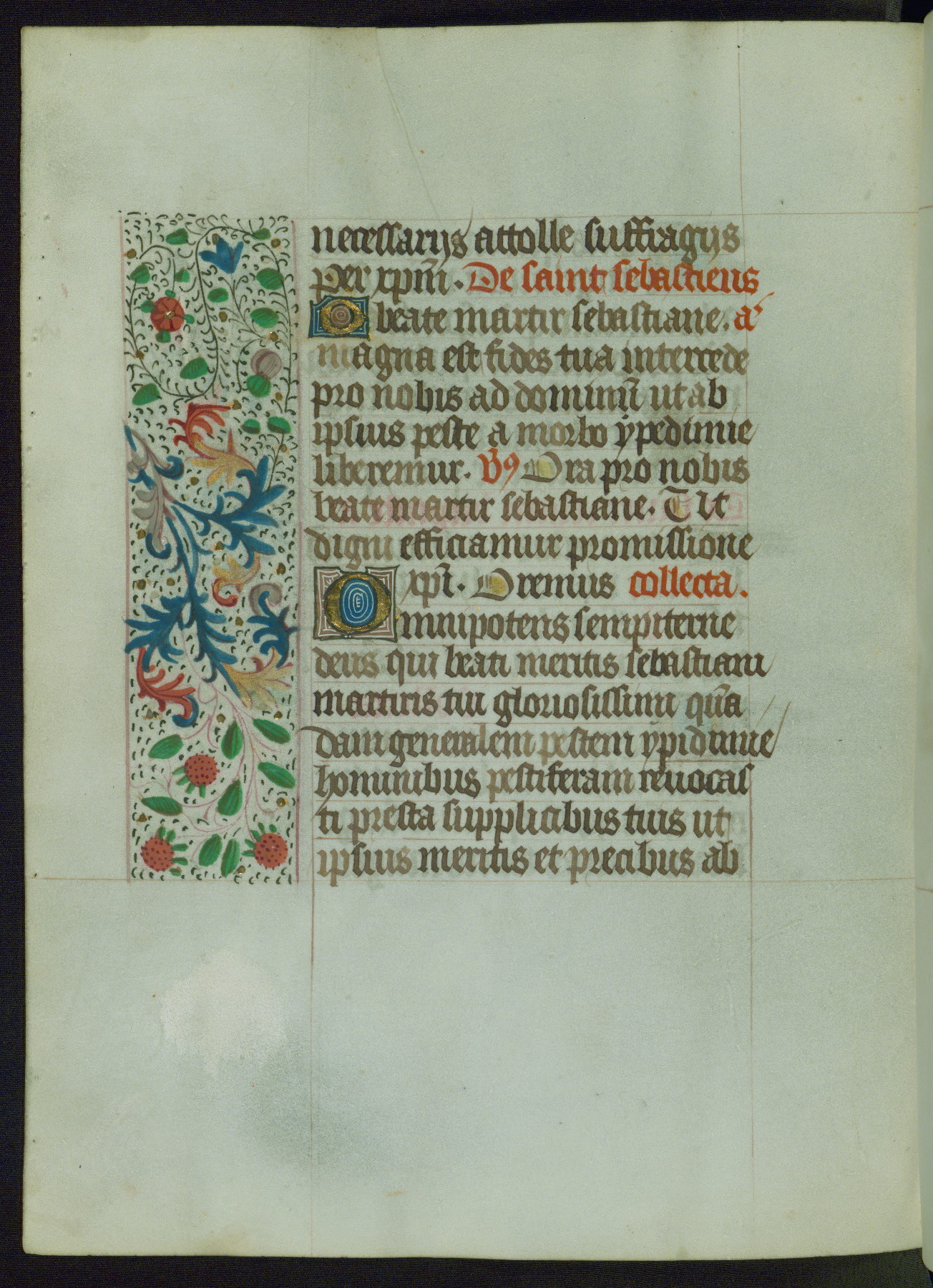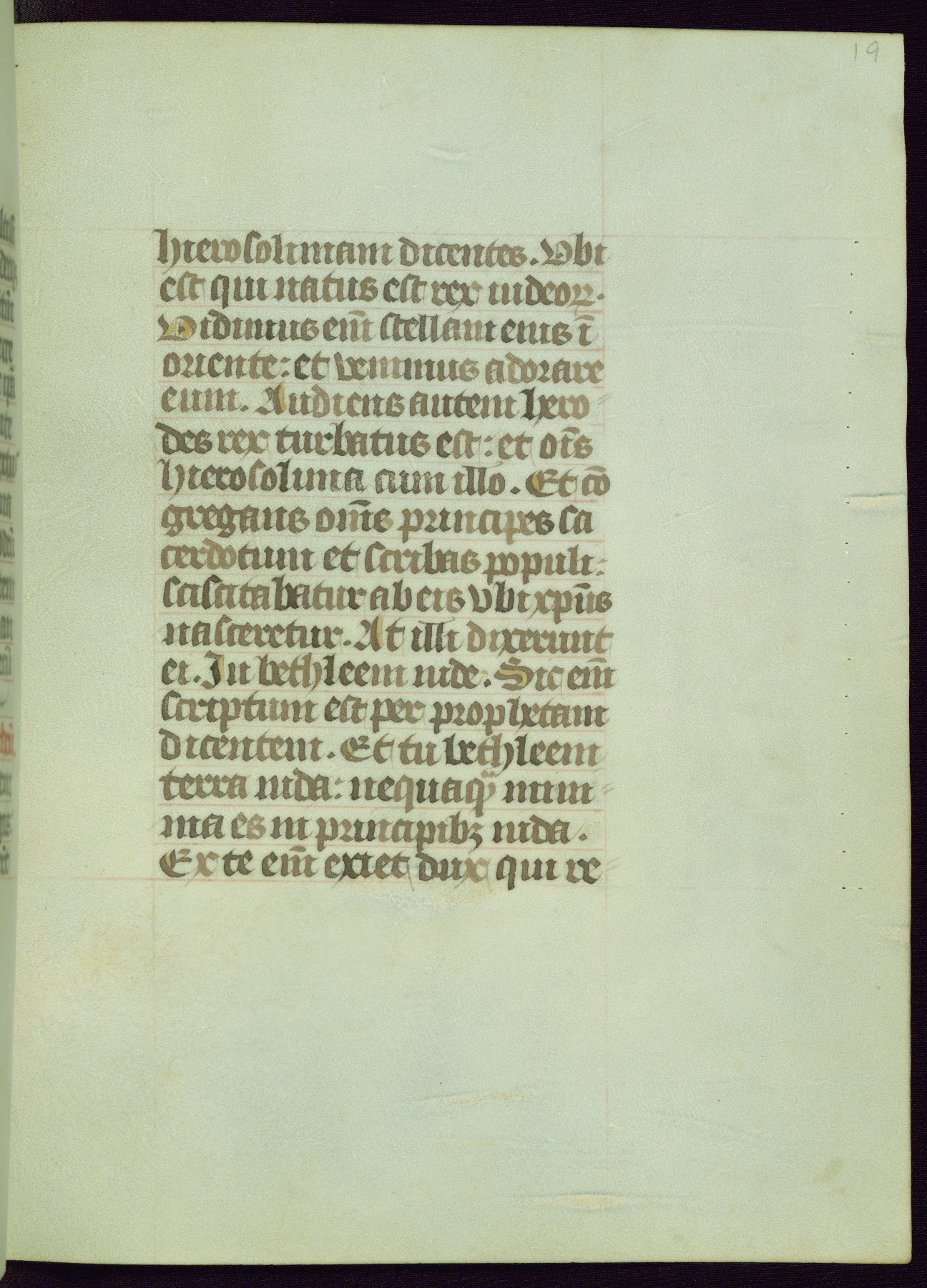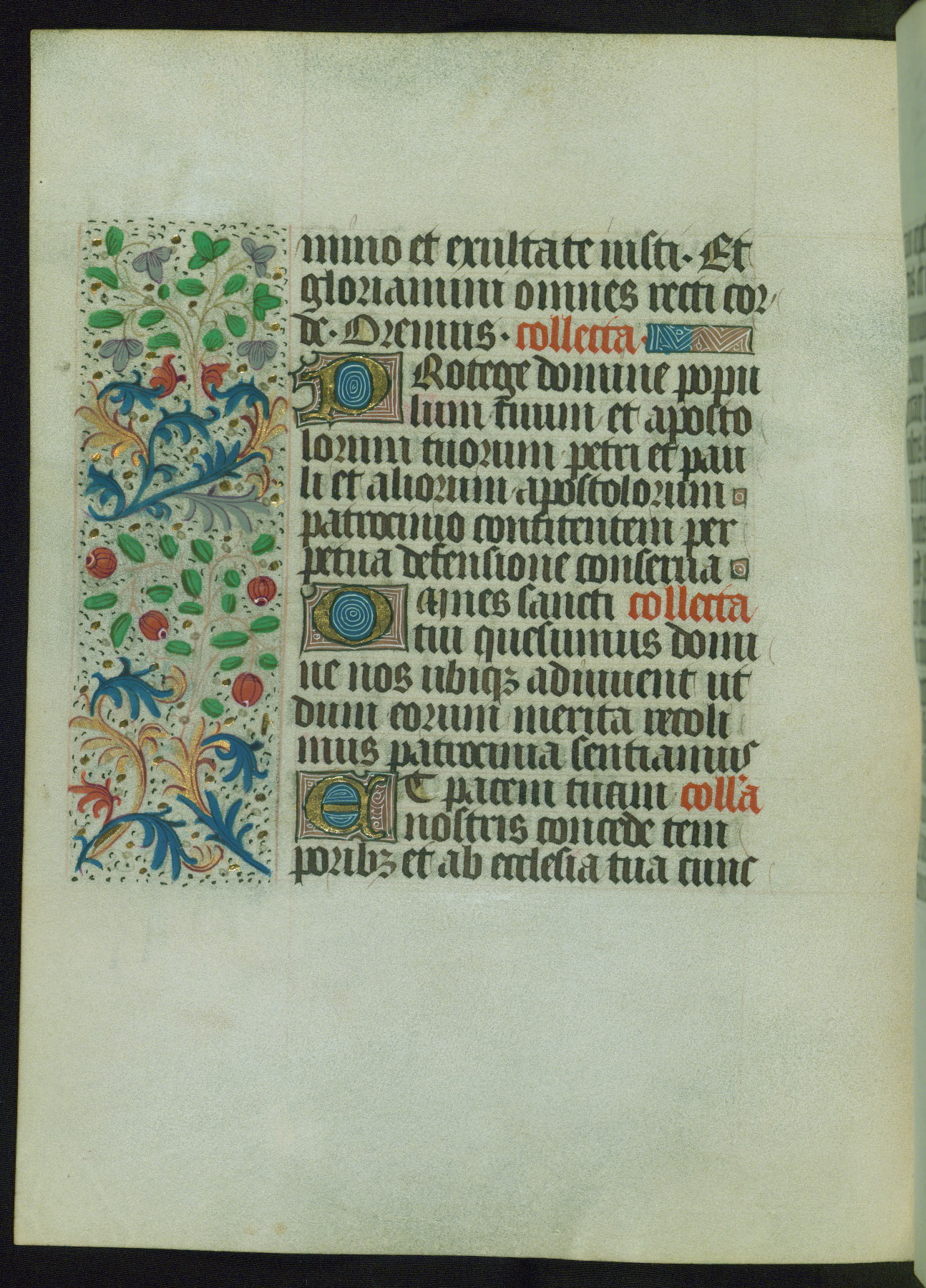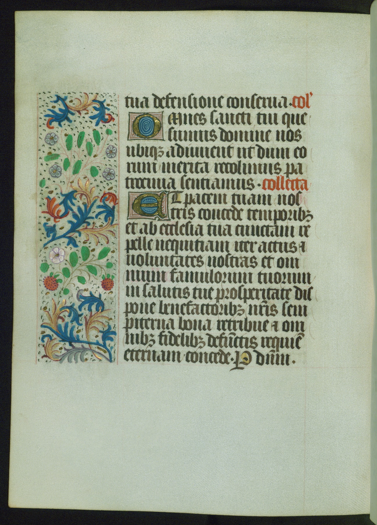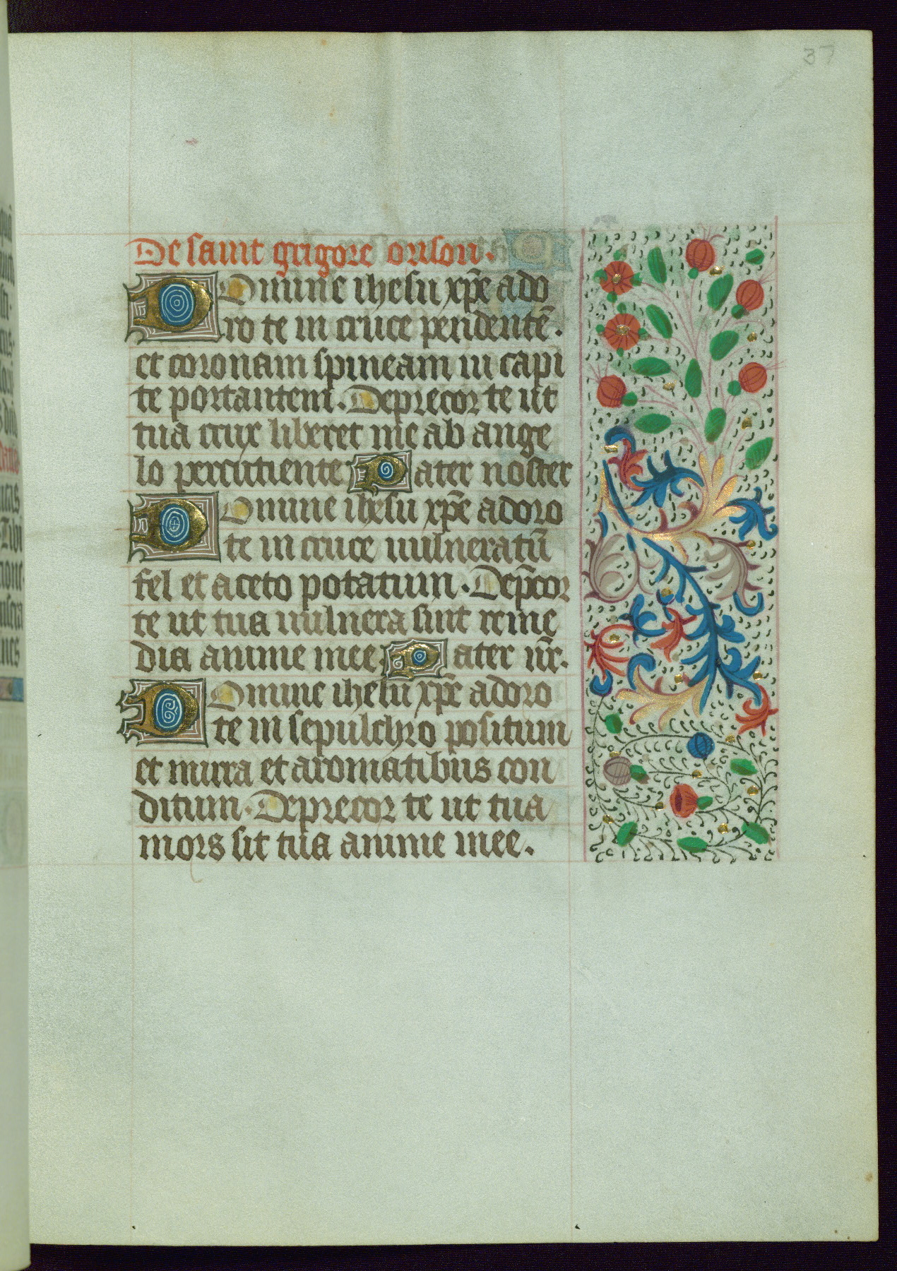 This Book of Hours from ca. 1480 was possibly made in Tournai. The manuscript passed through the hands of several women, and while the first owner was anonymous, the text and imagery reveals she had Franciscan sympathies. An eighteenth-century inscription at the front of the manuscript suggests it was presented to Philippa of Guelders (ca. 1480-1562) by Pope Leo X upon her ordination at the Franciscan convent of Sainte-Clare in Pont-a-Mousson in 1520. The quality of the miniatures suggests that the artist was a novice, yet his expressive individual style and unusual marginalia, in which figures and animals hold scrolls inscribed with French phrases, provide the manuscript with considerable charm.