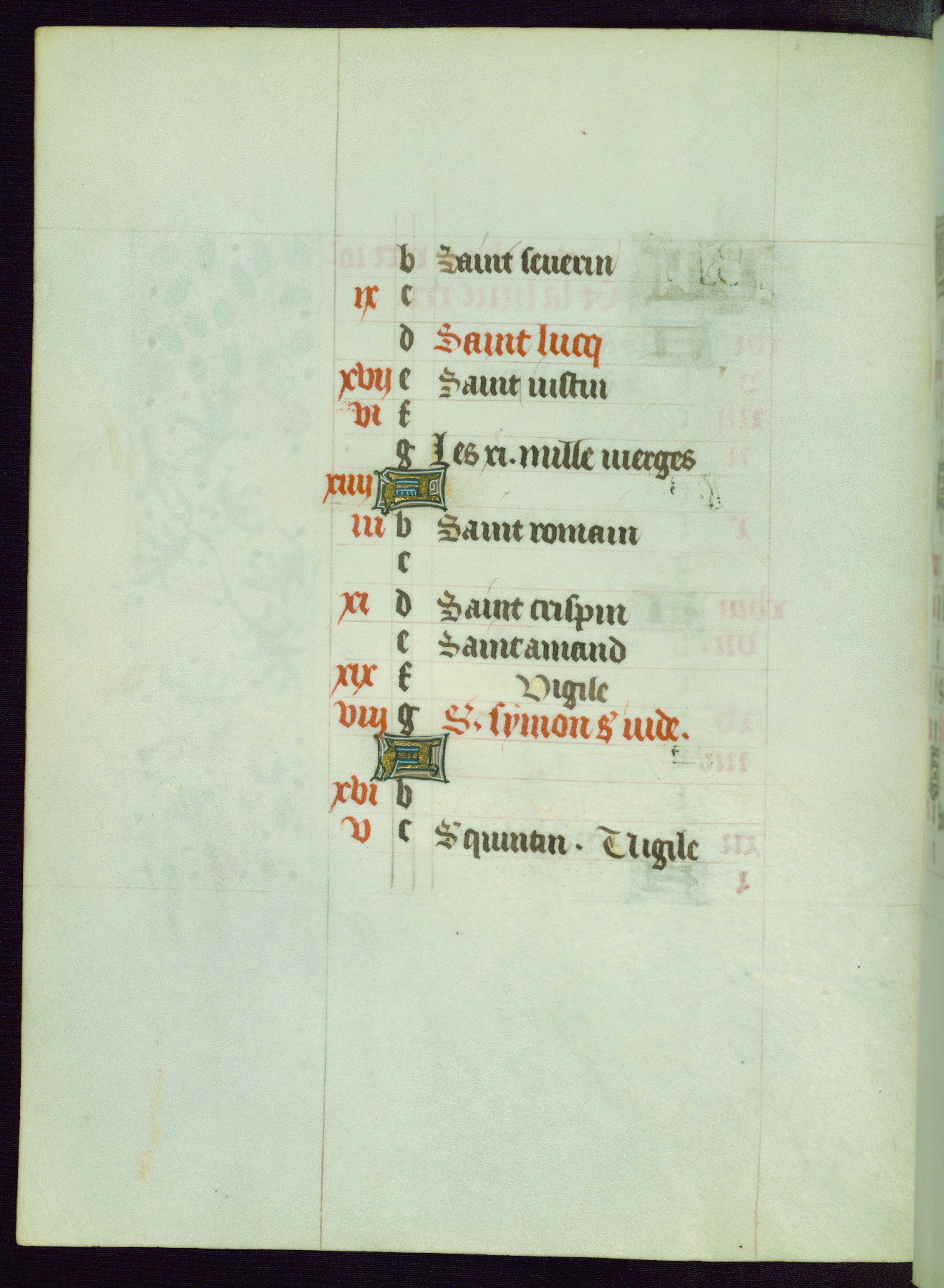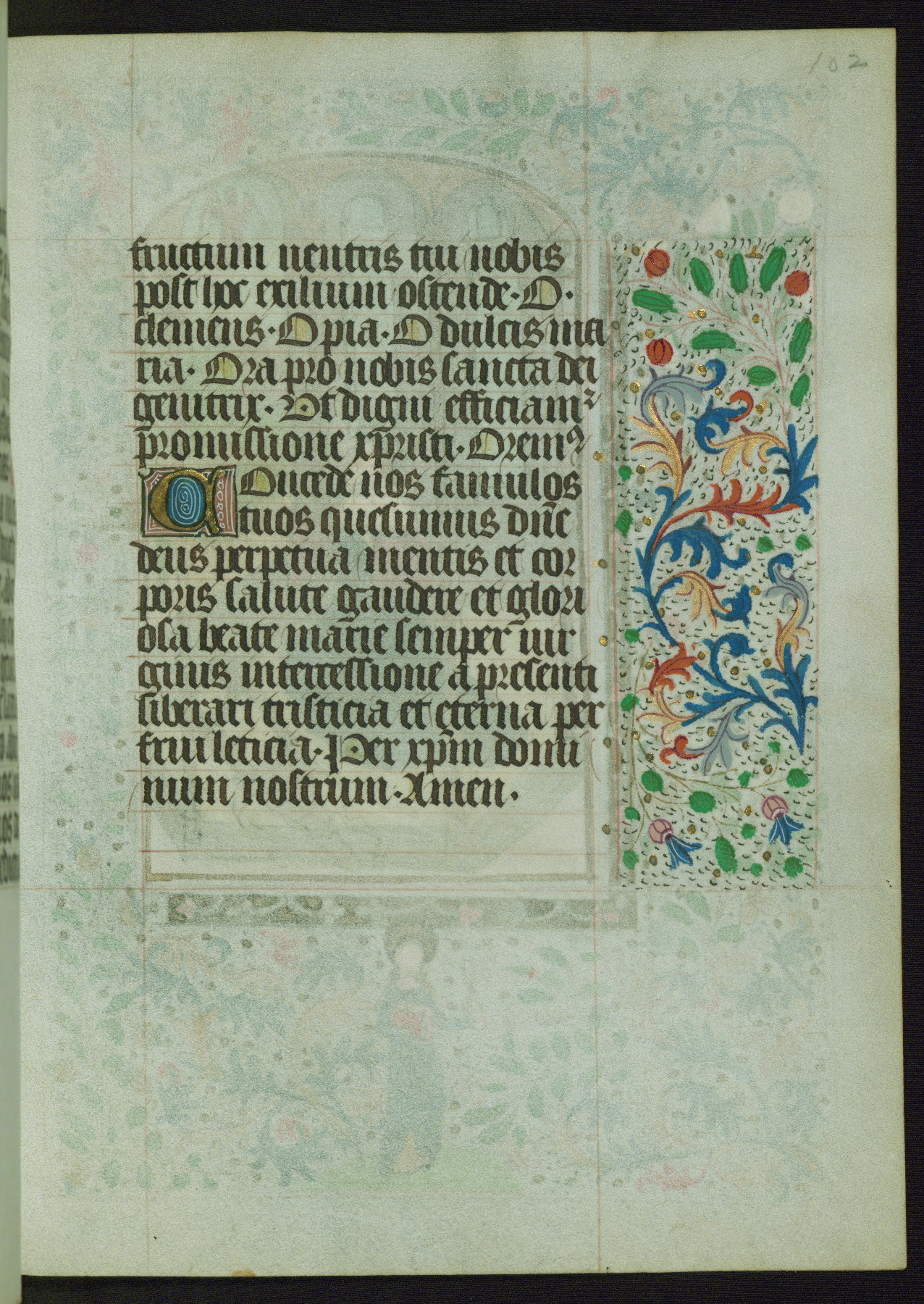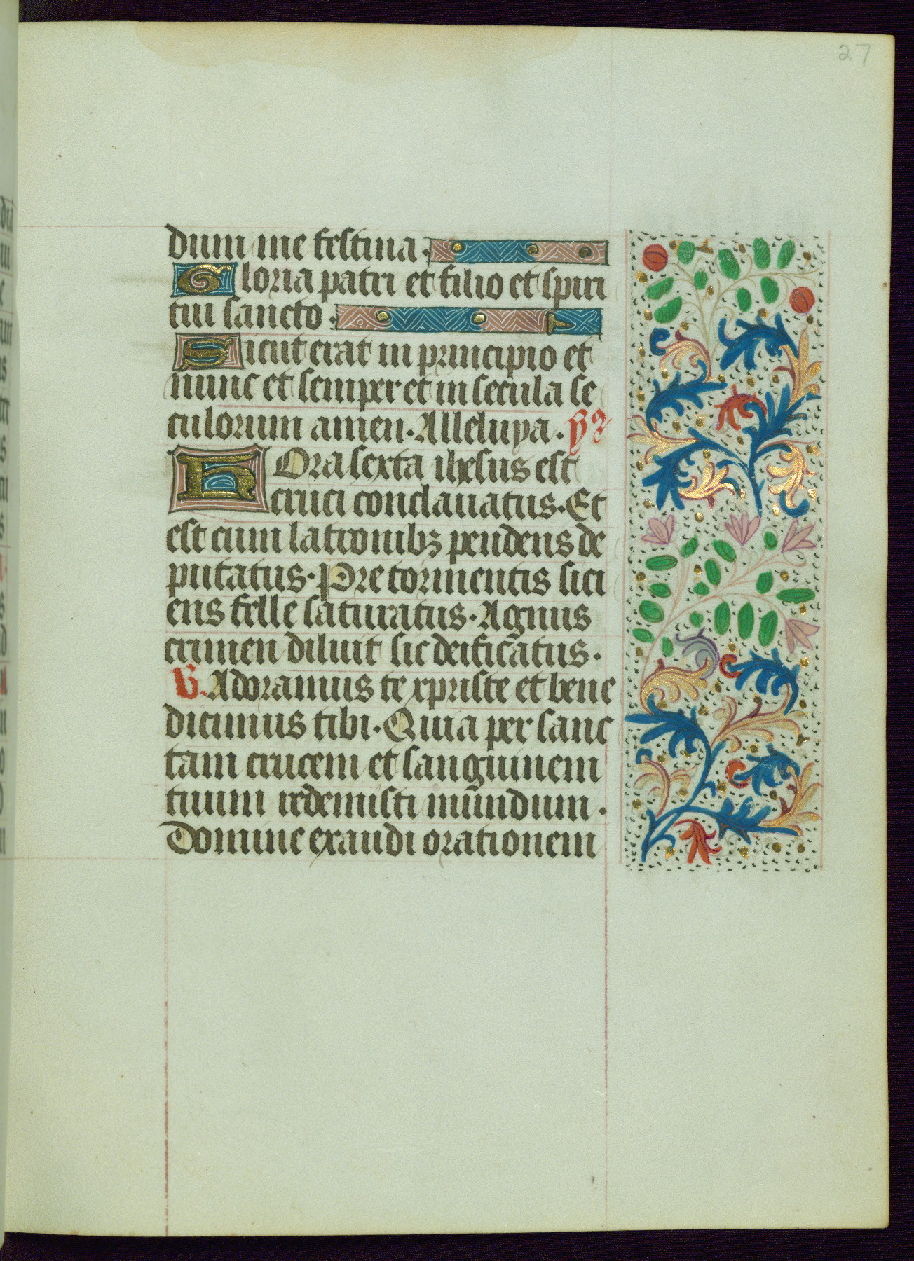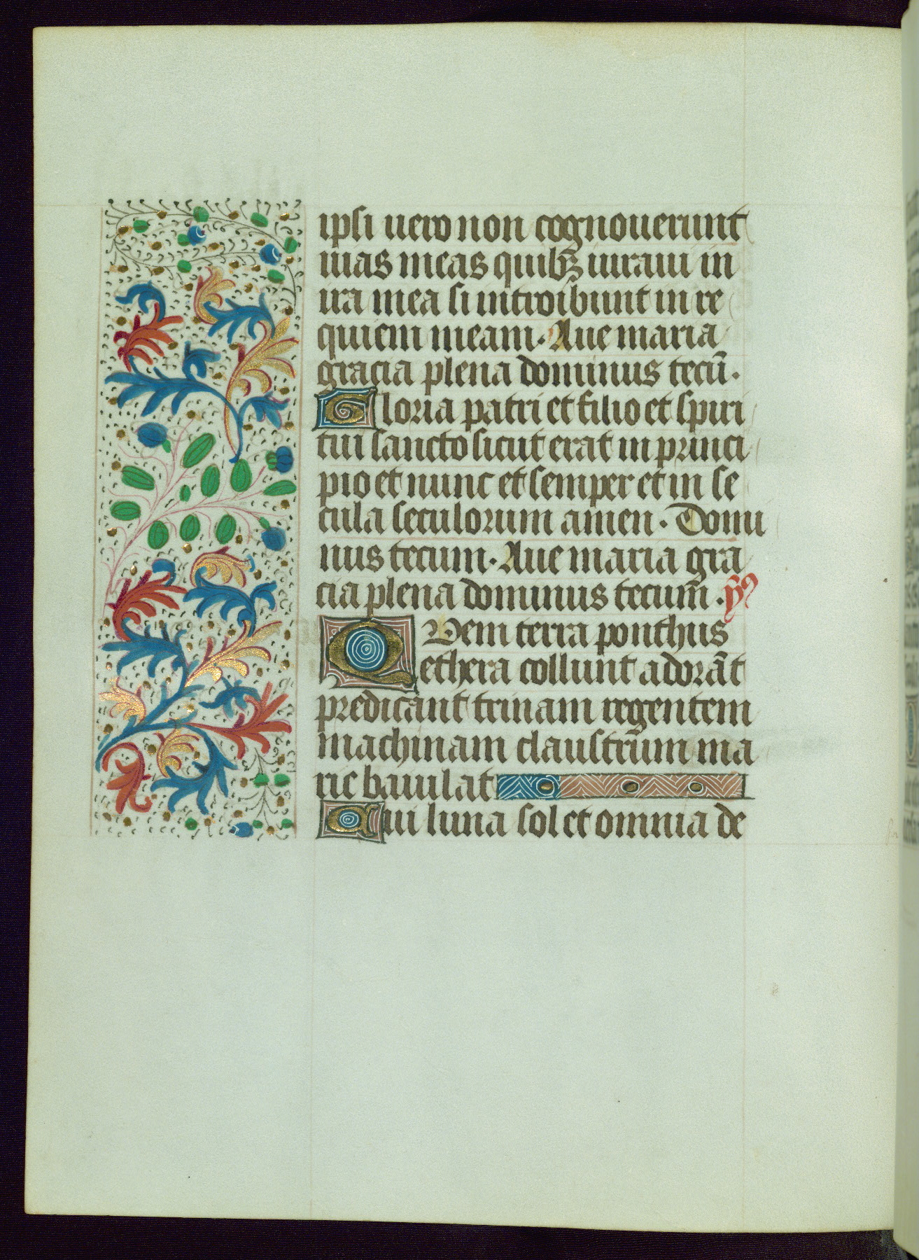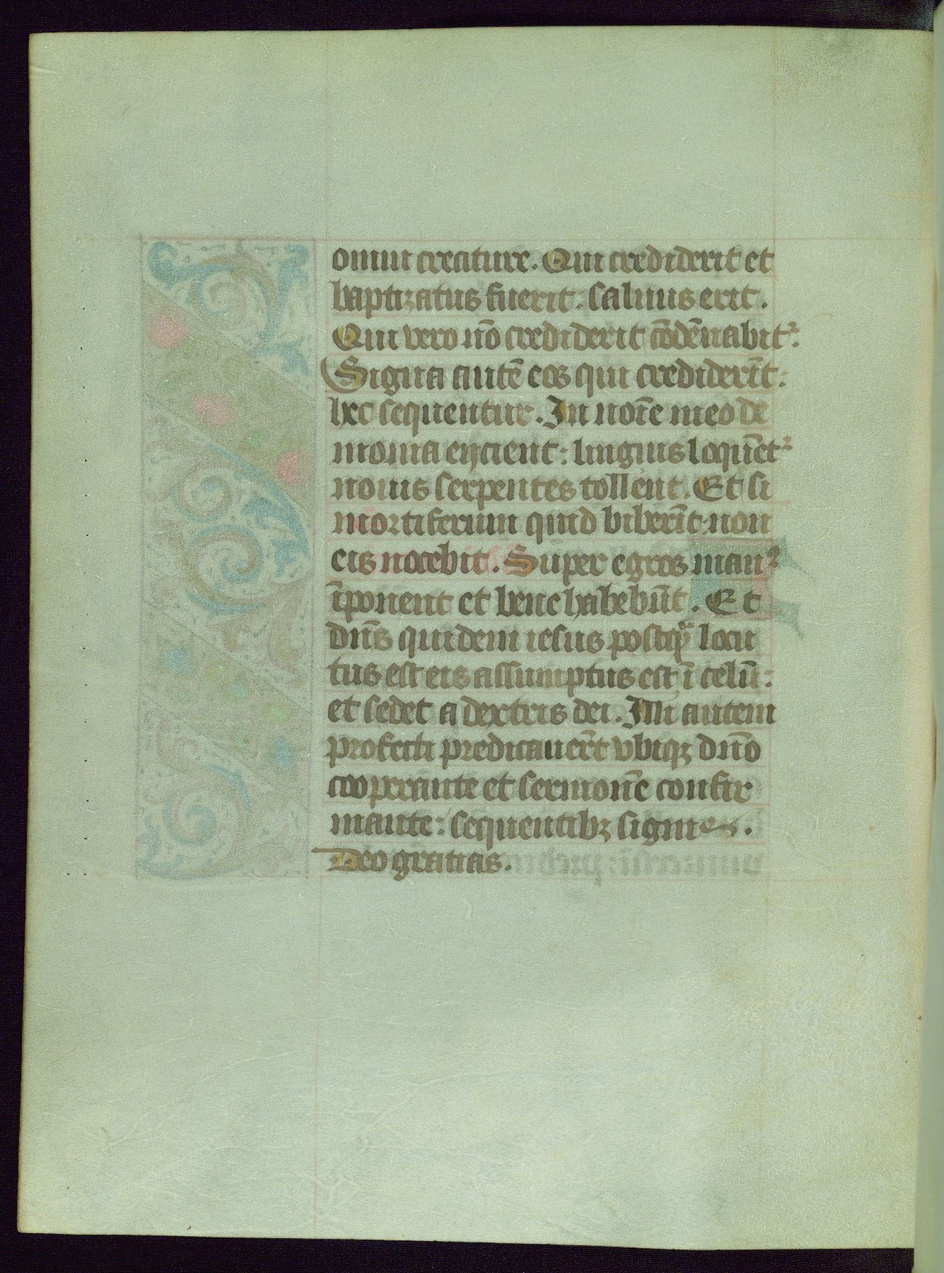 This Book of Hours from ca. 1480 was possibly made in Tournai. The manuscript passed through the hands of several women, and while the first owner was anonymous, the text and imagery reveals she had Franciscan sympathies. An eighteenth-century inscription at the front of the manuscript suggests it was presented to Philippa of Guelders (ca. 1480-1562) by Pope Leo X upon her ordination at the Franciscan convent of Sainte-Clare in Pont-a-Mousson in 1520. The quality of the miniatures suggests that the artist was a novice, yet his expressive individual style and unusual marginalia, in which figures and animals hold scrolls inscribed with French phrases, provide the manuscript with considerable charm.