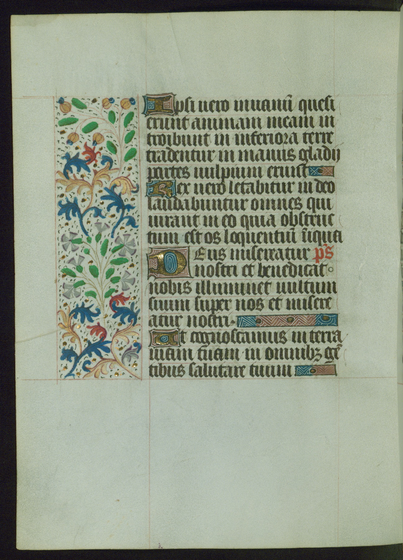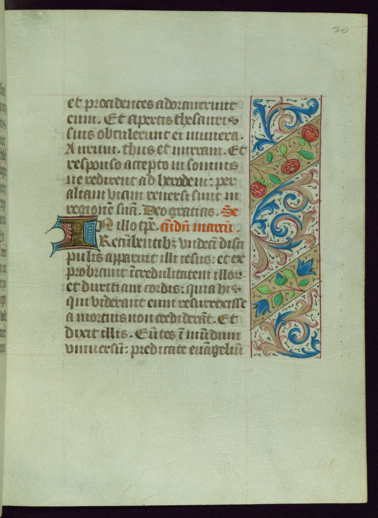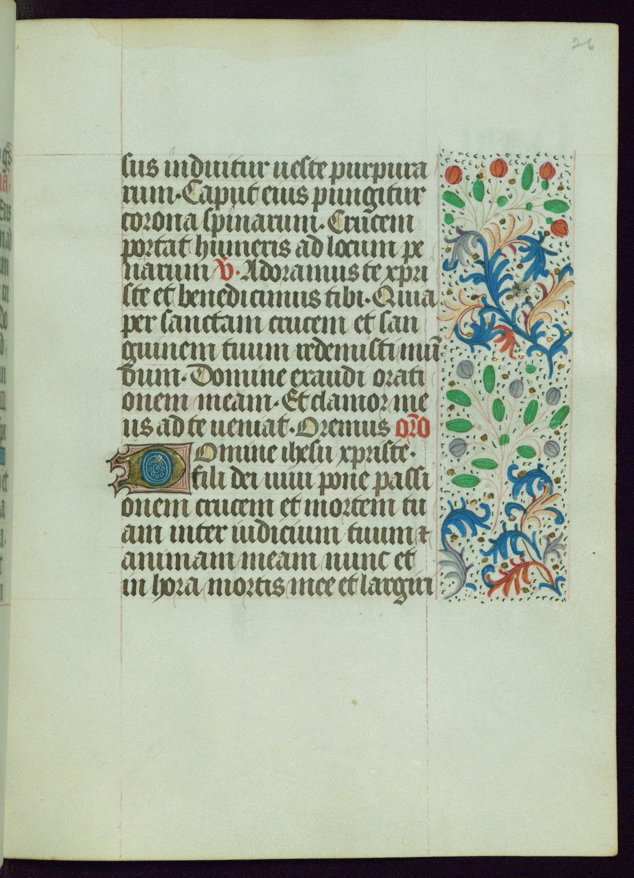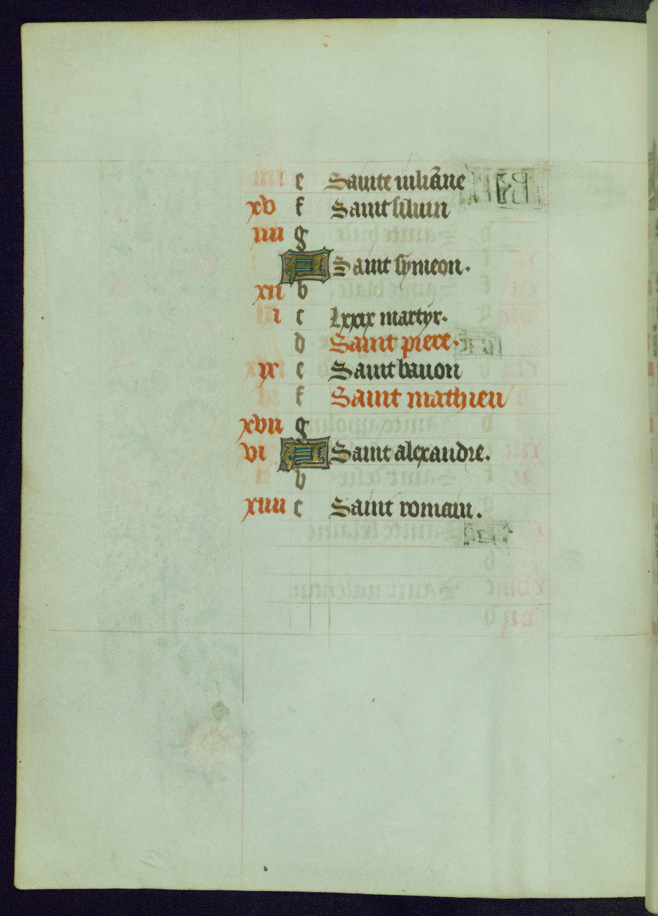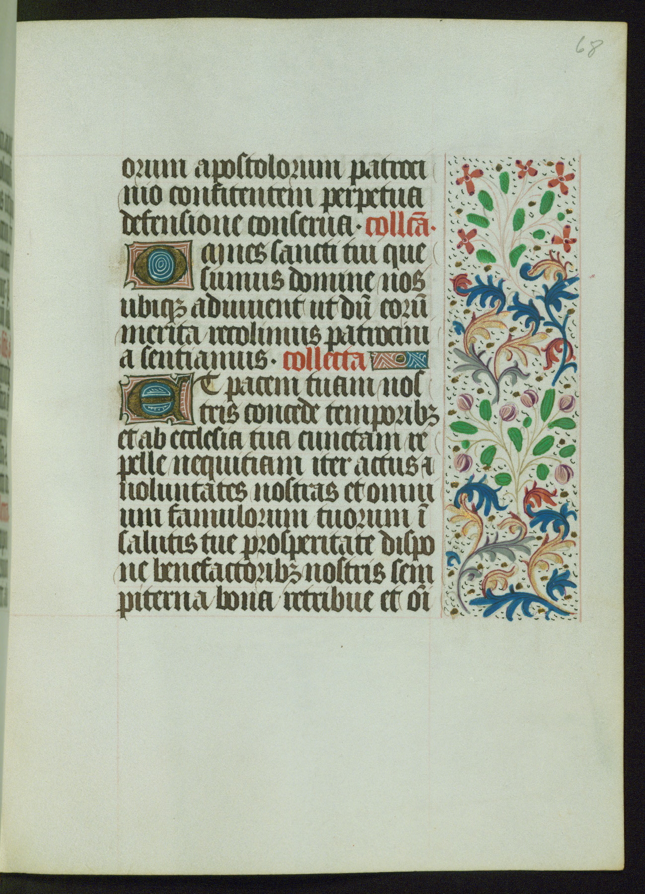 This Book of Hours from ca. 1480 was possibly made in Tournai. The manuscript passed through the hands of several women, and while the first owner was anonymous, the text and imagery reveals she had Franciscan sympathies. An eighteenth-century inscription at the front of the manuscript suggests it was presented to Philippa of Guelders (ca. 1480-1562) by Pope Leo X upon her ordination at the Franciscan convent of Sainte-Clare in Pont-a-Mousson in 1520. The quality of the miniatures suggests that the artist was a novice, yet his expressive individual style and unusual marginalia, in which figures and animals hold scrolls inscribed with French phrases, provide the manuscript with considerable charm.