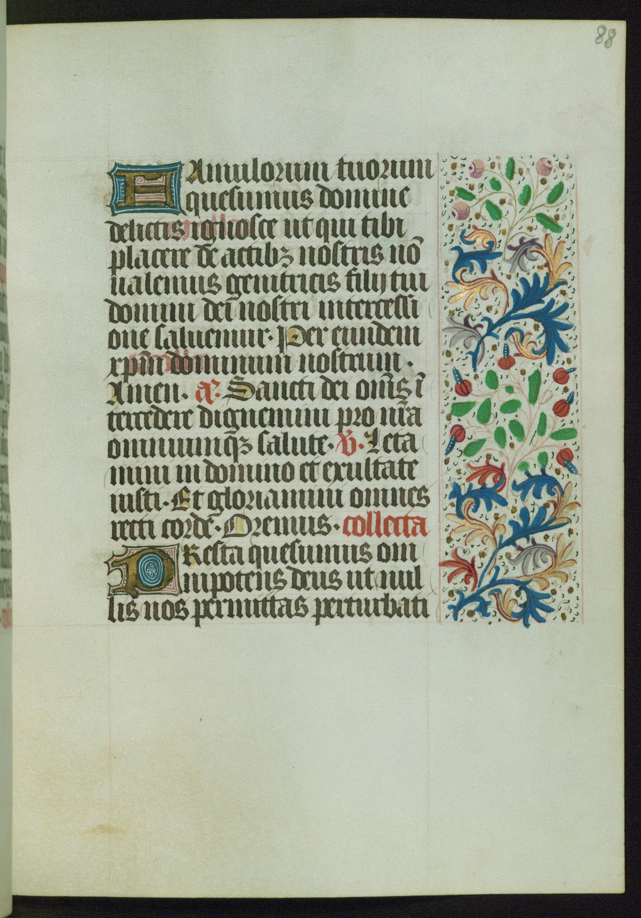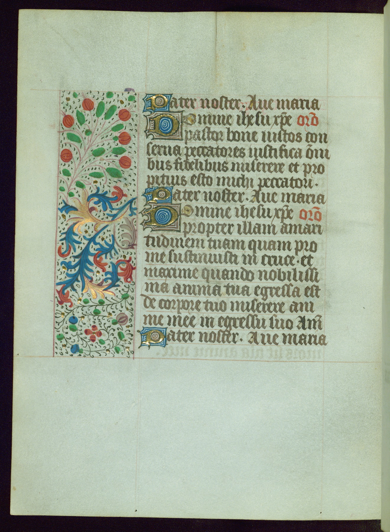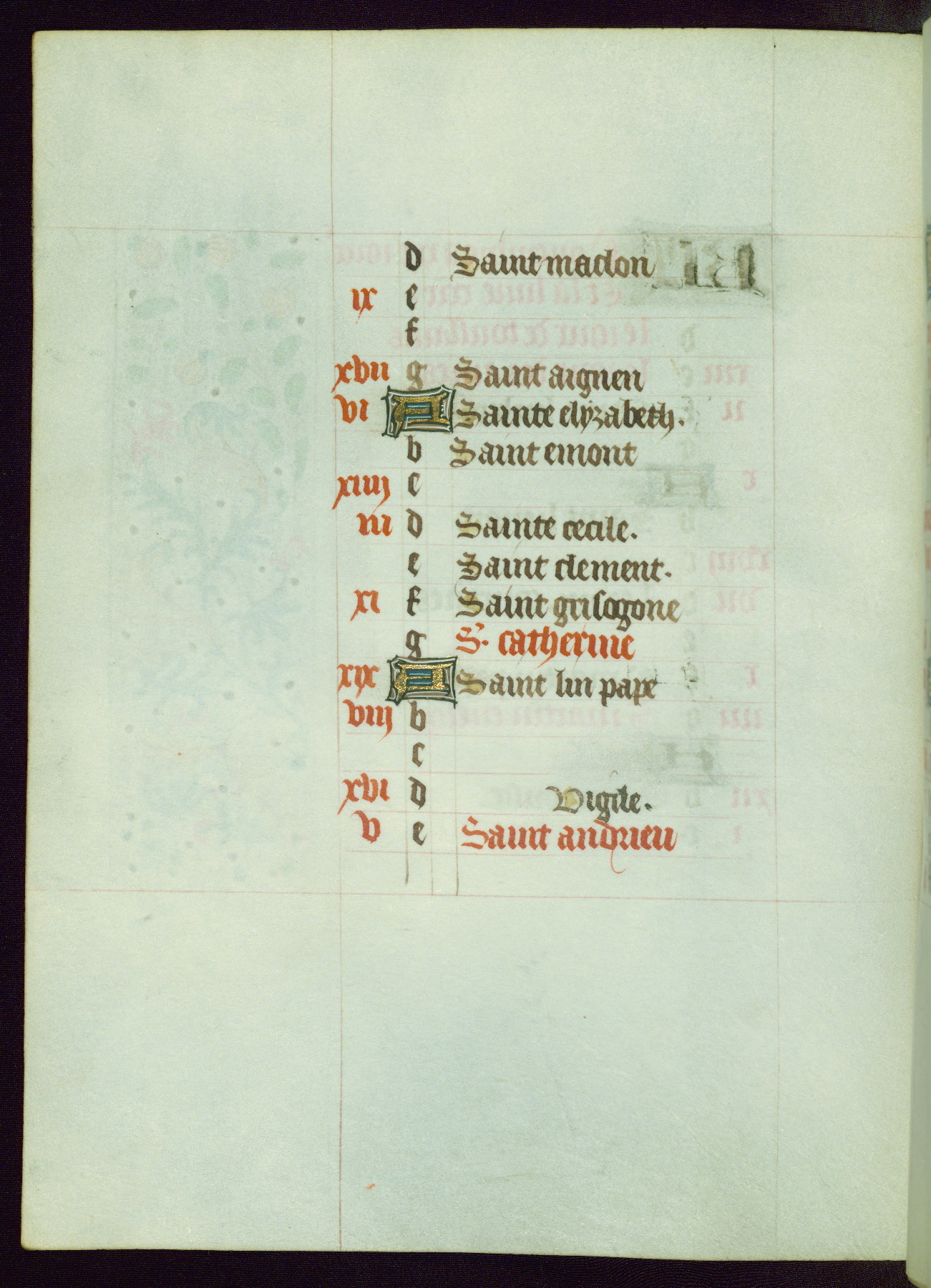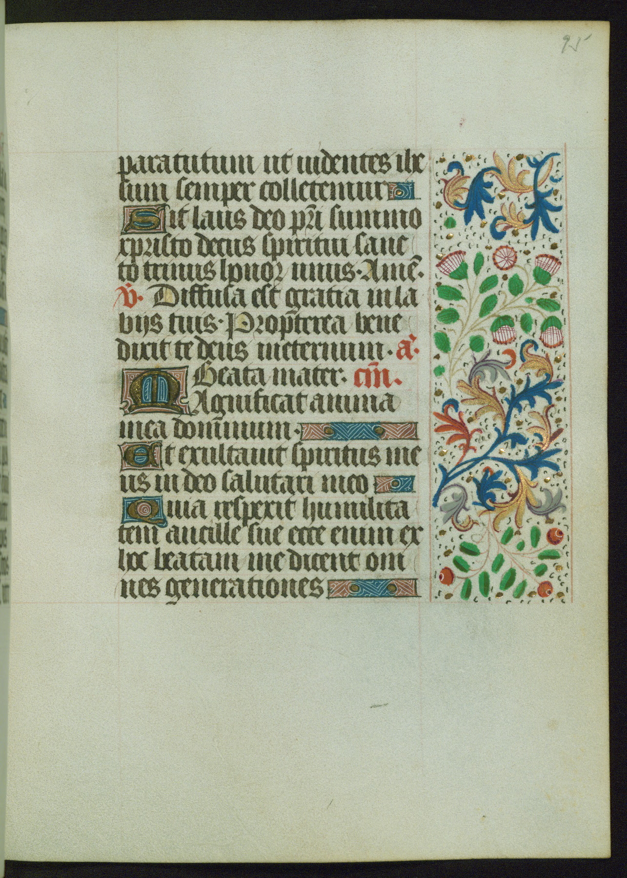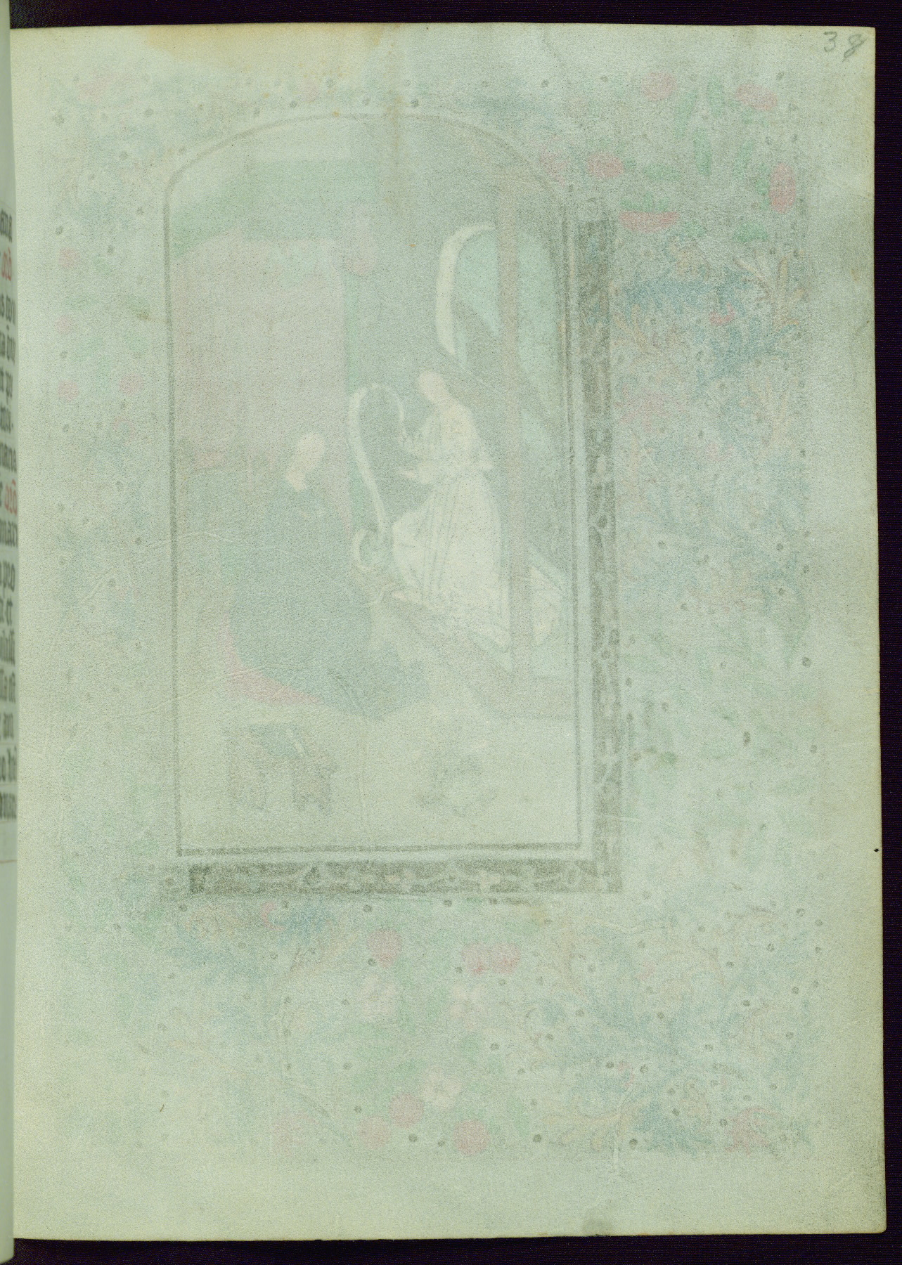 This Book of Hours from ca. 1480 was possibly made in Tournai. The manuscript passed through the hands of several women, and while the first owner was anonymous, the text and imagery reveals she had Franciscan sympathies. An eighteenth-century inscription at the front of the manuscript suggests it was presented to Philippa of Guelders (ca. 1480-1562) by Pope Leo X upon her ordination at the Franciscan convent of Sainte-Clare in Pont-a-Mousson in 1520. The quality of the miniatures suggests that the artist was a novice, yet his expressive individual style and unusual marginalia, in which figures and animals hold scrolls inscribed with French phrases, provide the manuscript with considerable charm.