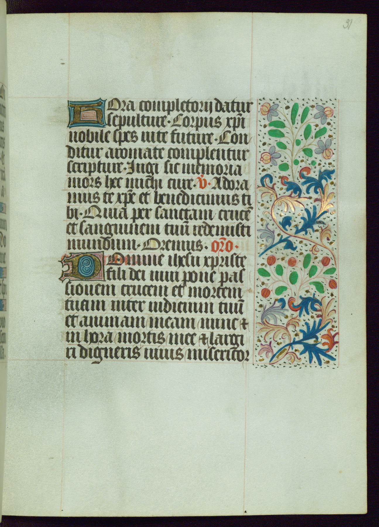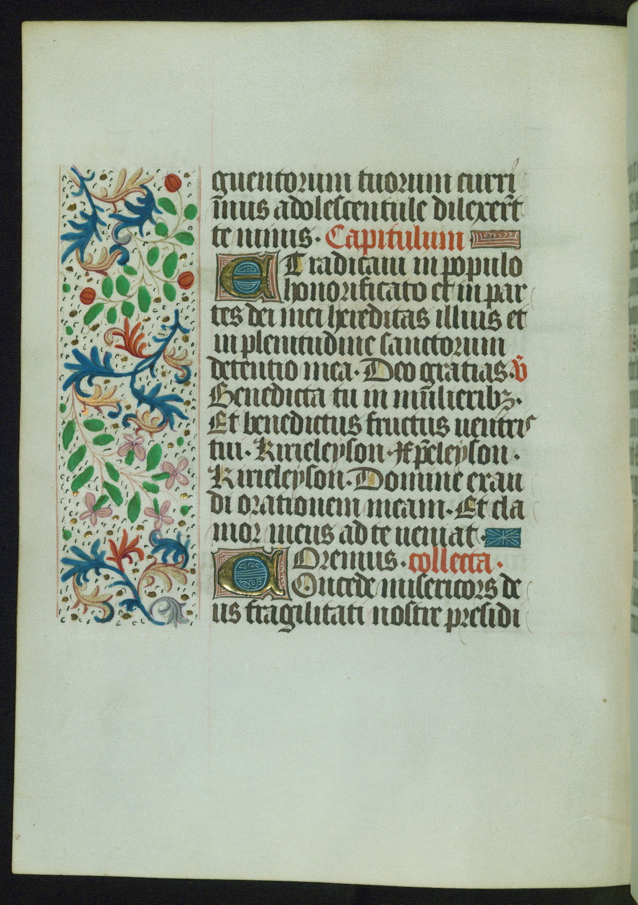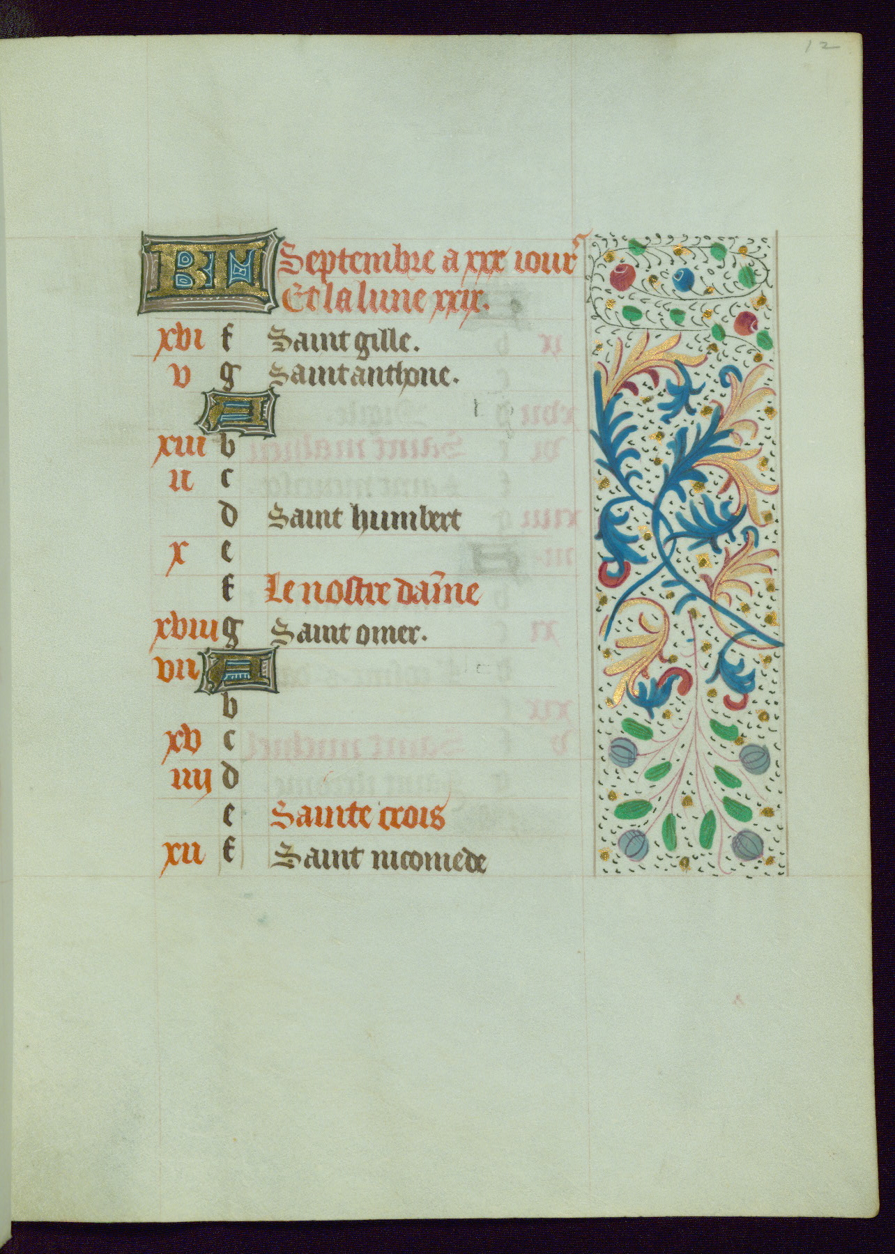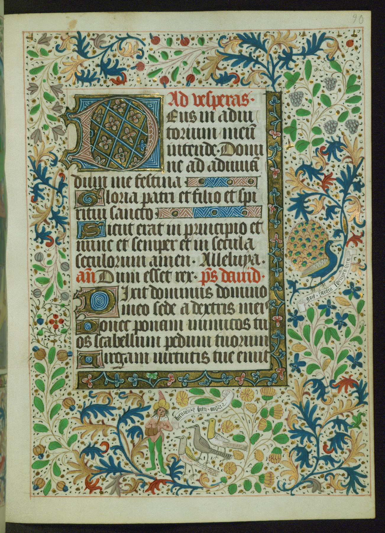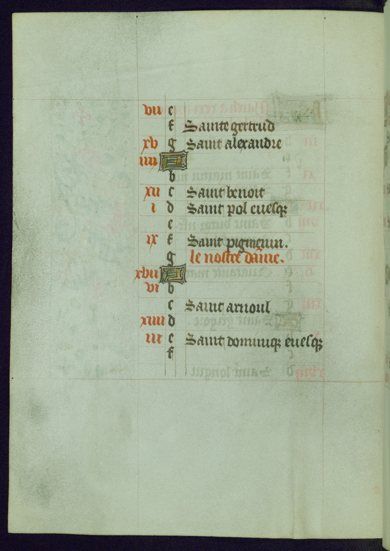 This Book of Hours from ca. 1480 was possibly made in Tournai. The manuscript passed through the hands of several women, and while the first owner was anonymous, the text and imagery reveals she had Franciscan sympathies. An eighteenth-century inscription at the front of the manuscript suggests it was presented to Philippa of Guelders (ca. 1480-1562) by Pope Leo X upon her ordination at the Franciscan convent of Sainte-Clare in Pont-a-Mousson in 1520. The quality of the miniatures suggests that the artist was a novice, yet his expressive individual style and unusual marginalia, in which figures and animals hold scrolls inscribed with French phrases, provide the manuscript with considerable charm.