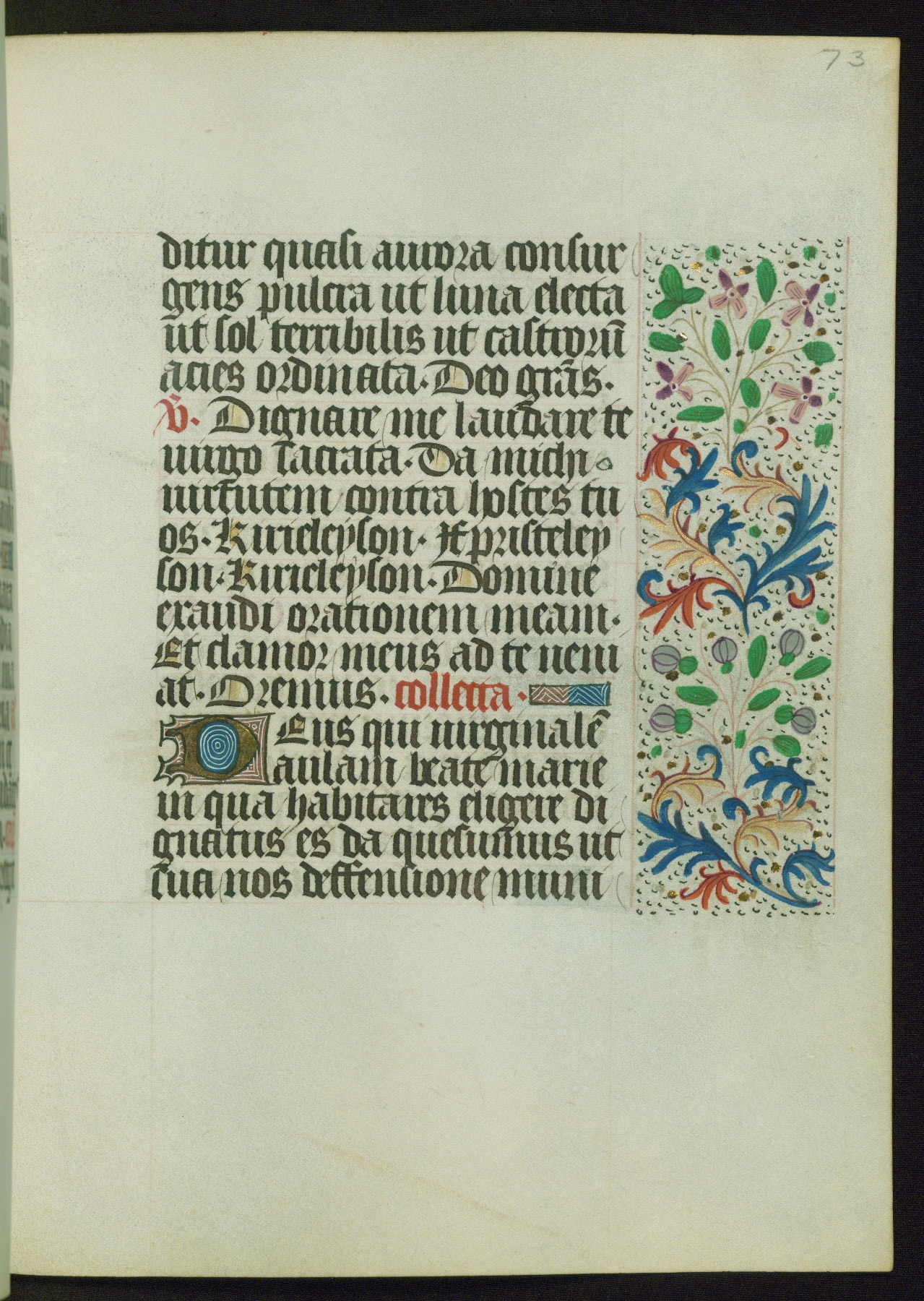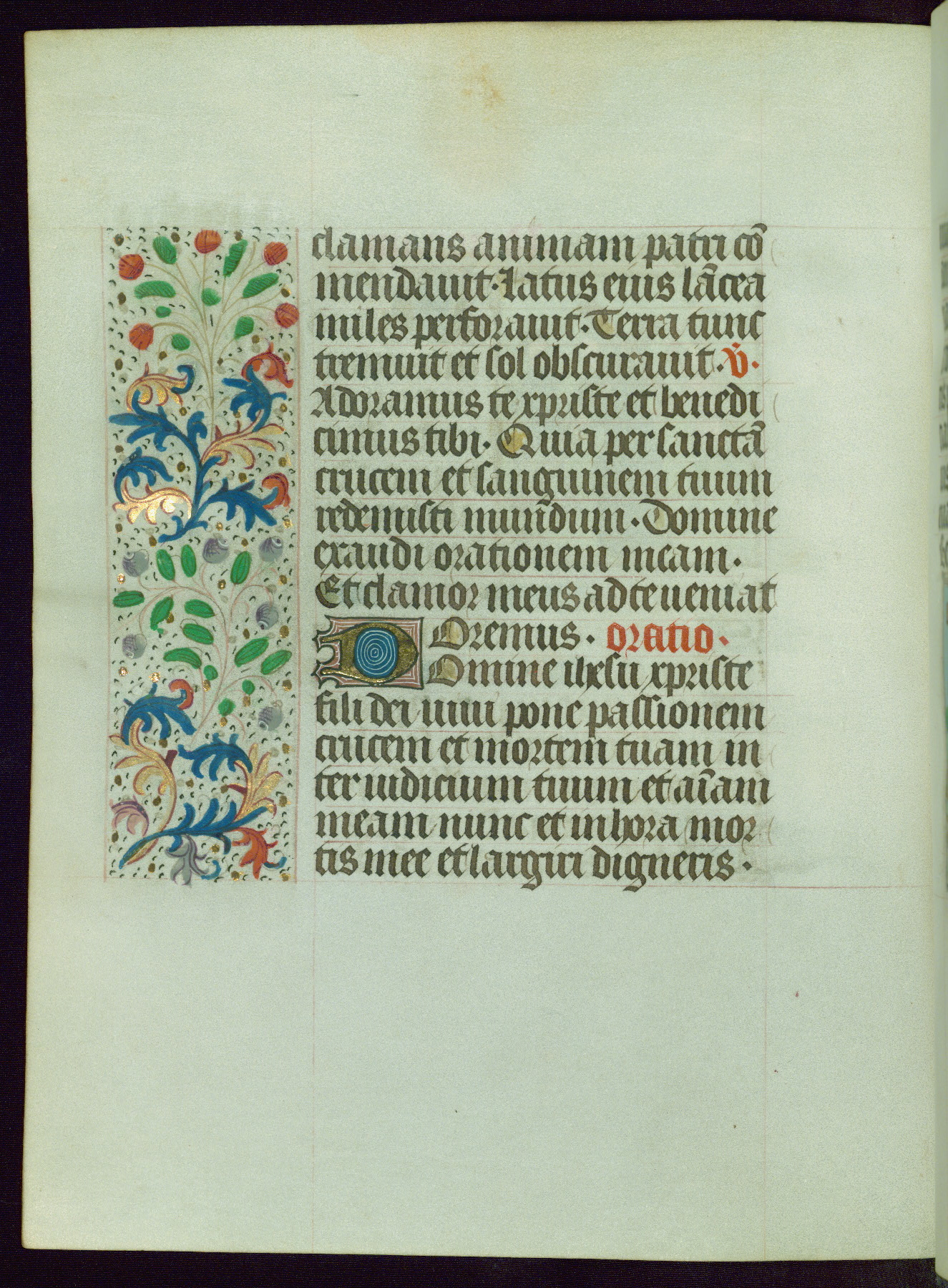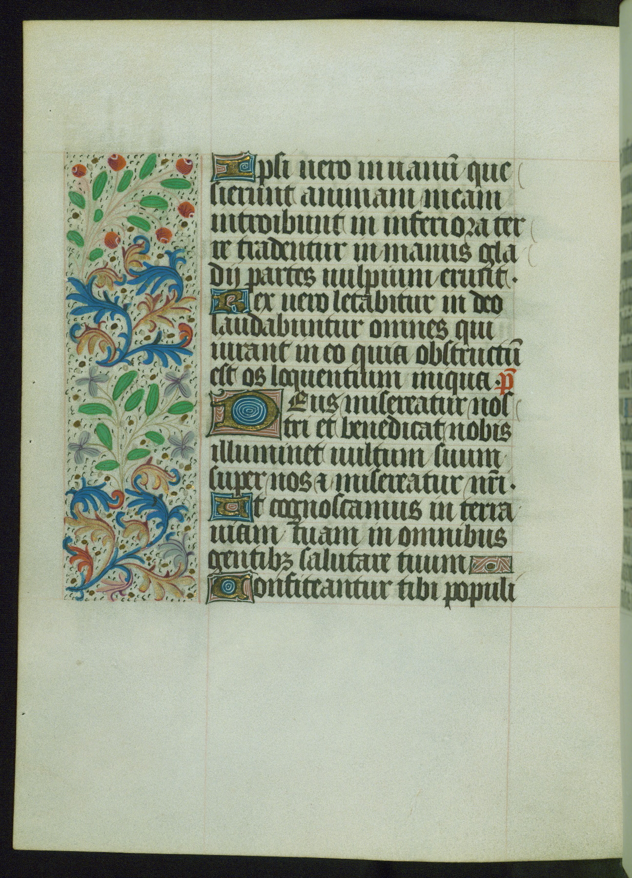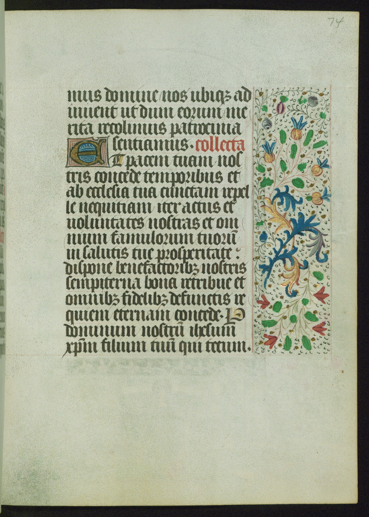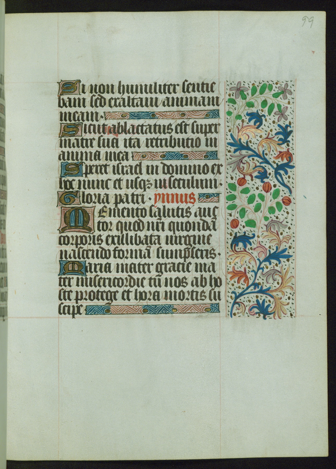 This Book of Hours from ca. 1480 was possibly made in Tournai. The manuscript passed through the hands of several women, and while the first owner was anonymous, the text and imagery reveals she had Franciscan sympathies. An eighteenth-century inscription at the front of the manuscript suggests it was presented to Philippa of Guelders (ca. 1480-1562) by Pope Leo X upon her ordination at the Franciscan convent of Sainte-Clare in Pont-a-Mousson in 1520. The quality of the miniatures suggests that the artist was a novice, yet his expressive individual style and unusual marginalia, in which figures and animals hold scrolls inscribed with French phrases, provide the manuscript with considerable charm.