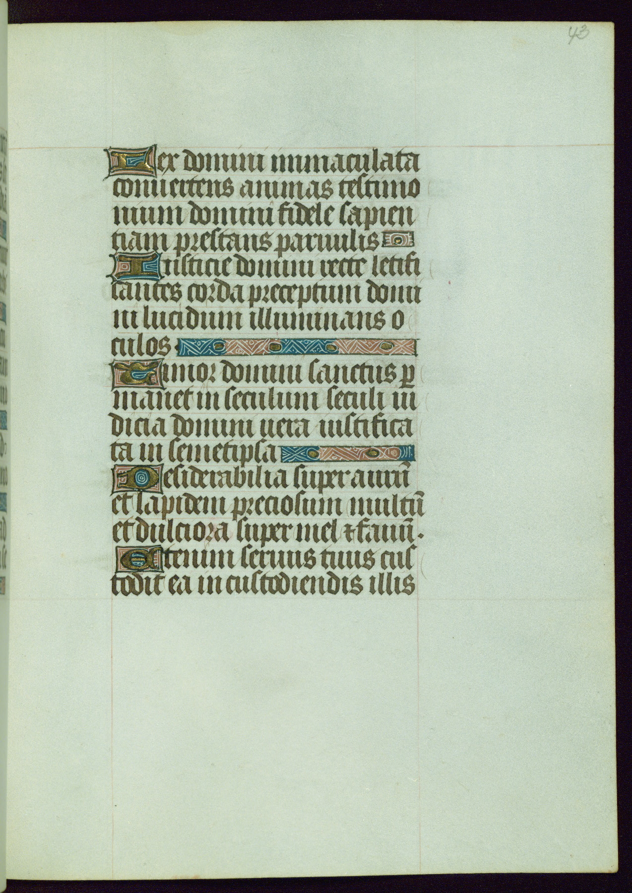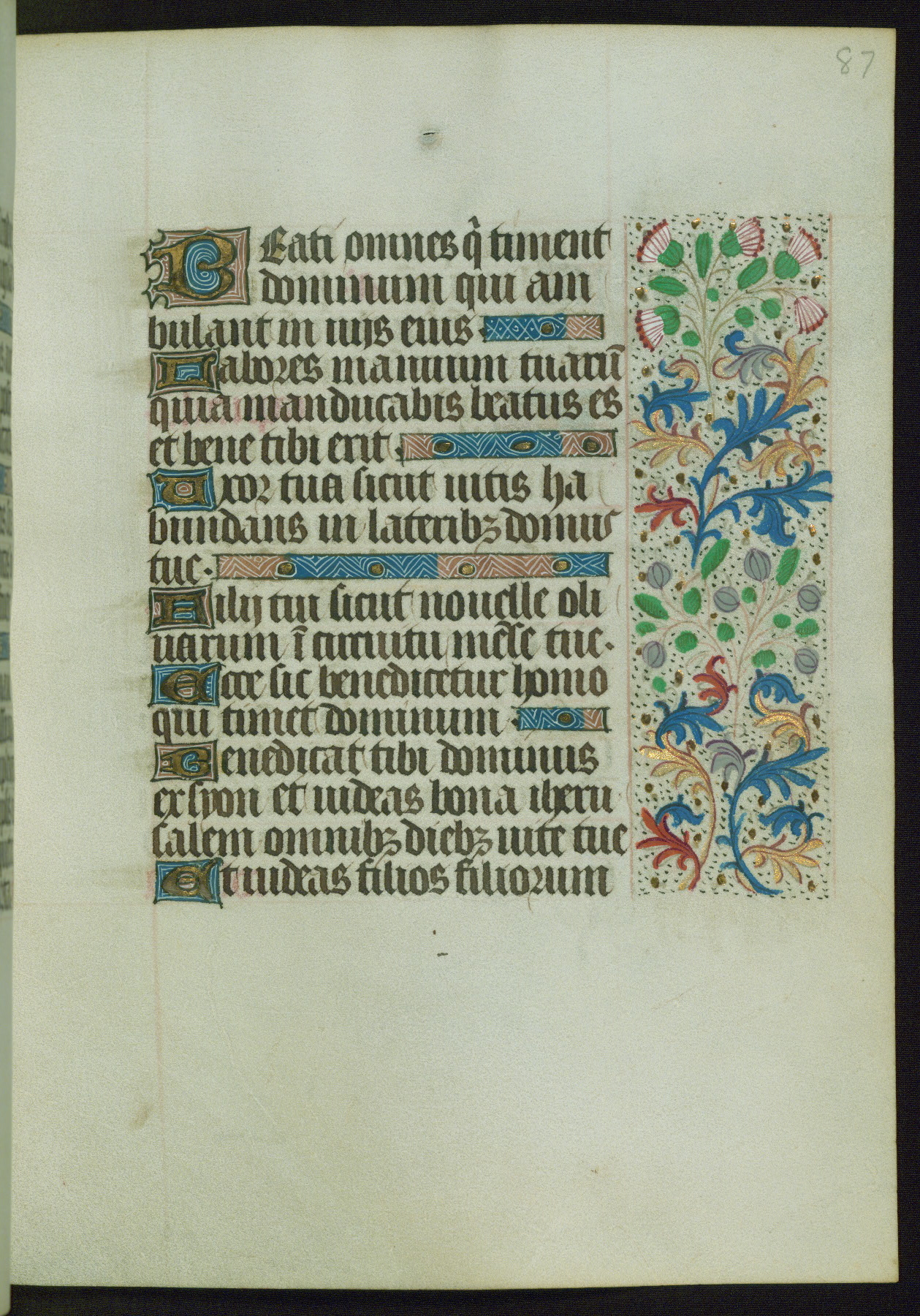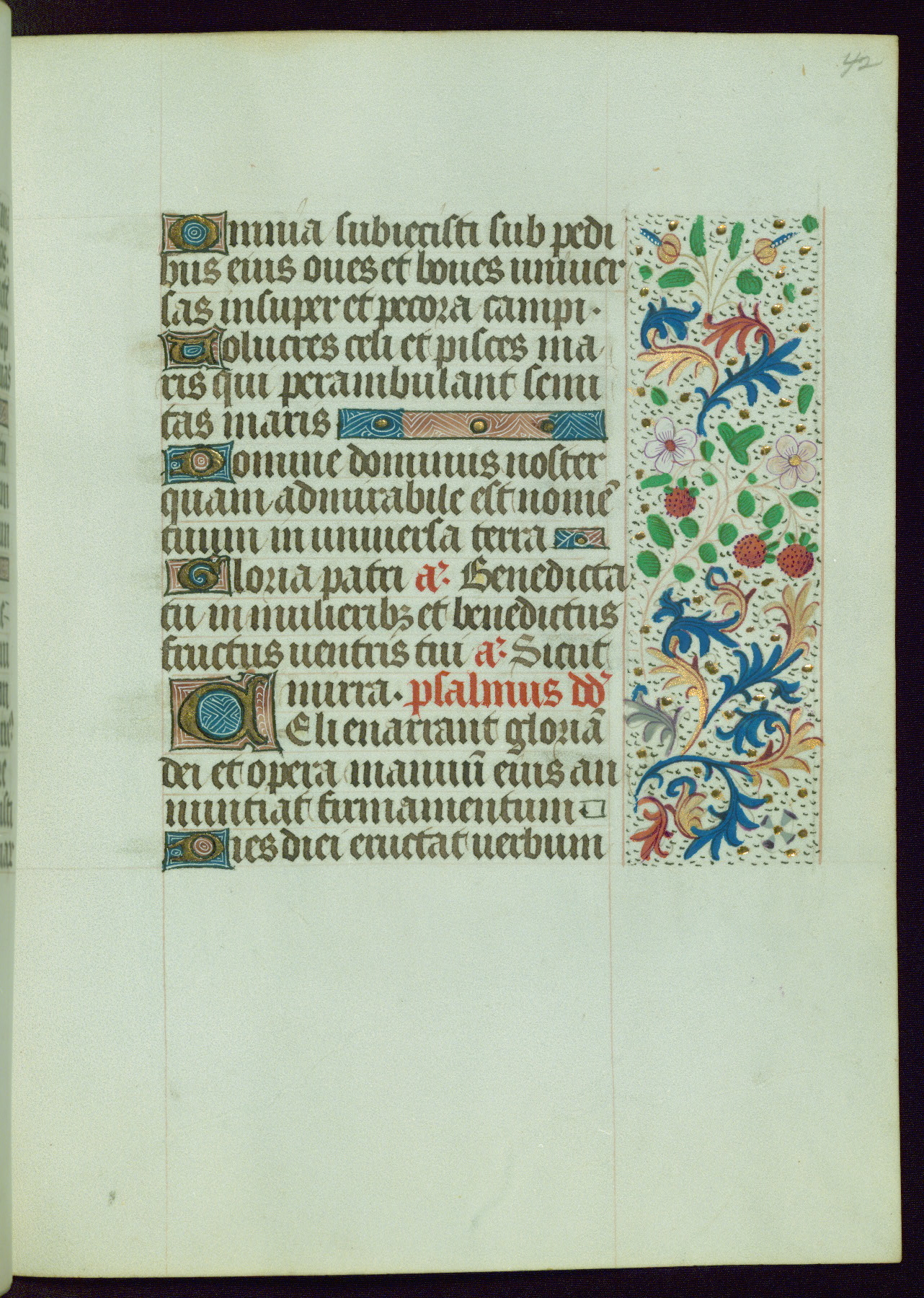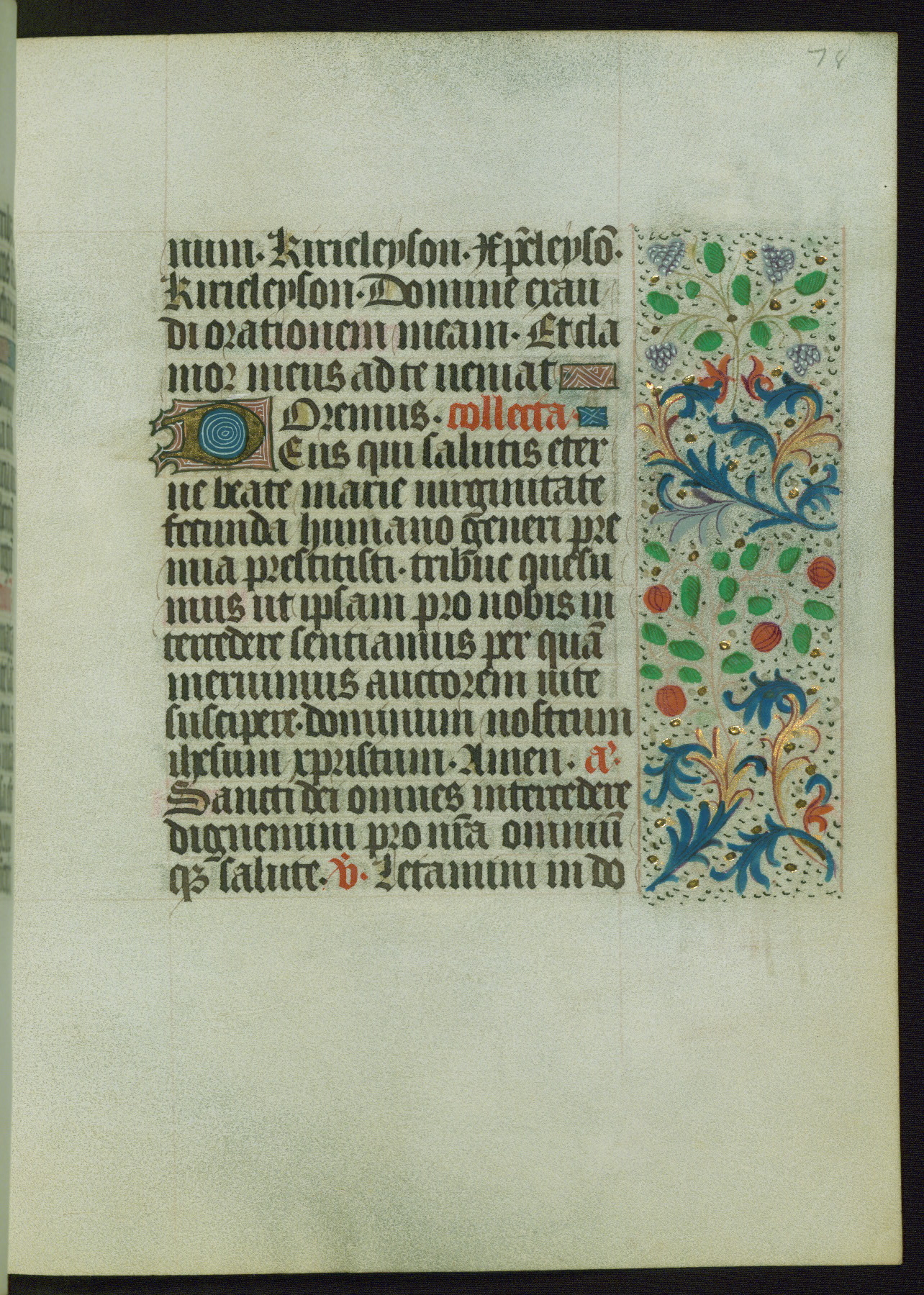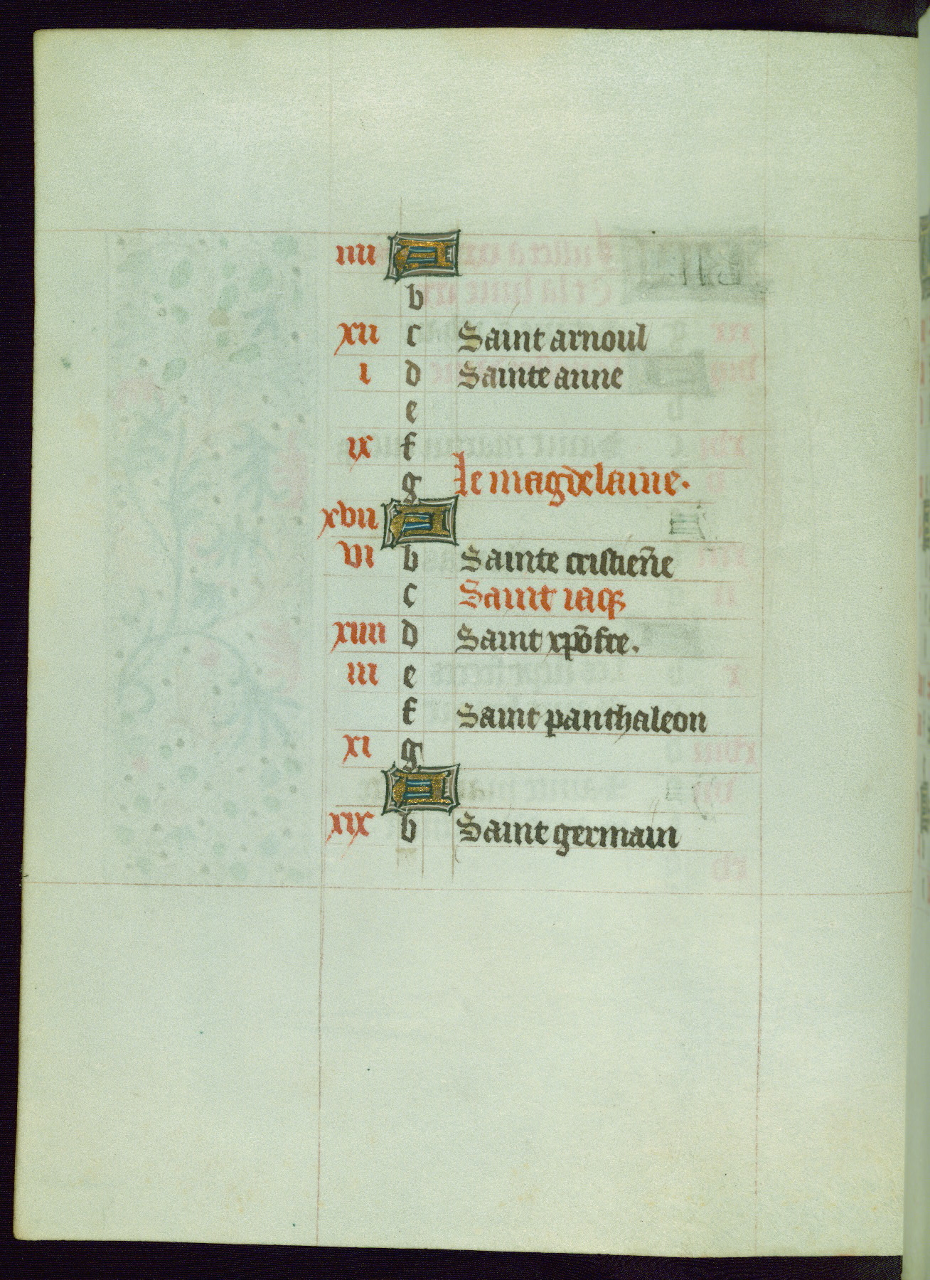 This Book of Hours from ca. 1480 was possibly made in Tournai. The manuscript passed through the hands of several women, and while the first owner was anonymous, the text and imagery reveals she had Franciscan sympathies. An eighteenth-century inscription at the front of the manuscript suggests it was presented to Philippa of Guelders (ca. 1480-1562) by Pope Leo X upon her ordination at the Franciscan convent of Sainte-Clare in Pont-a-Mousson in 1520. The quality of the miniatures suggests that the artist was a novice, yet his expressive individual style and unusual marginalia, in which figures and animals hold scrolls inscribed with French phrases, provide the manuscript with considerable charm.