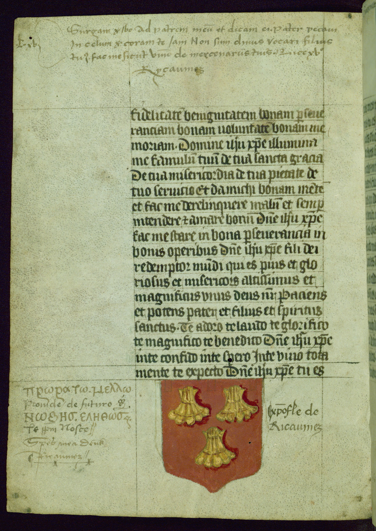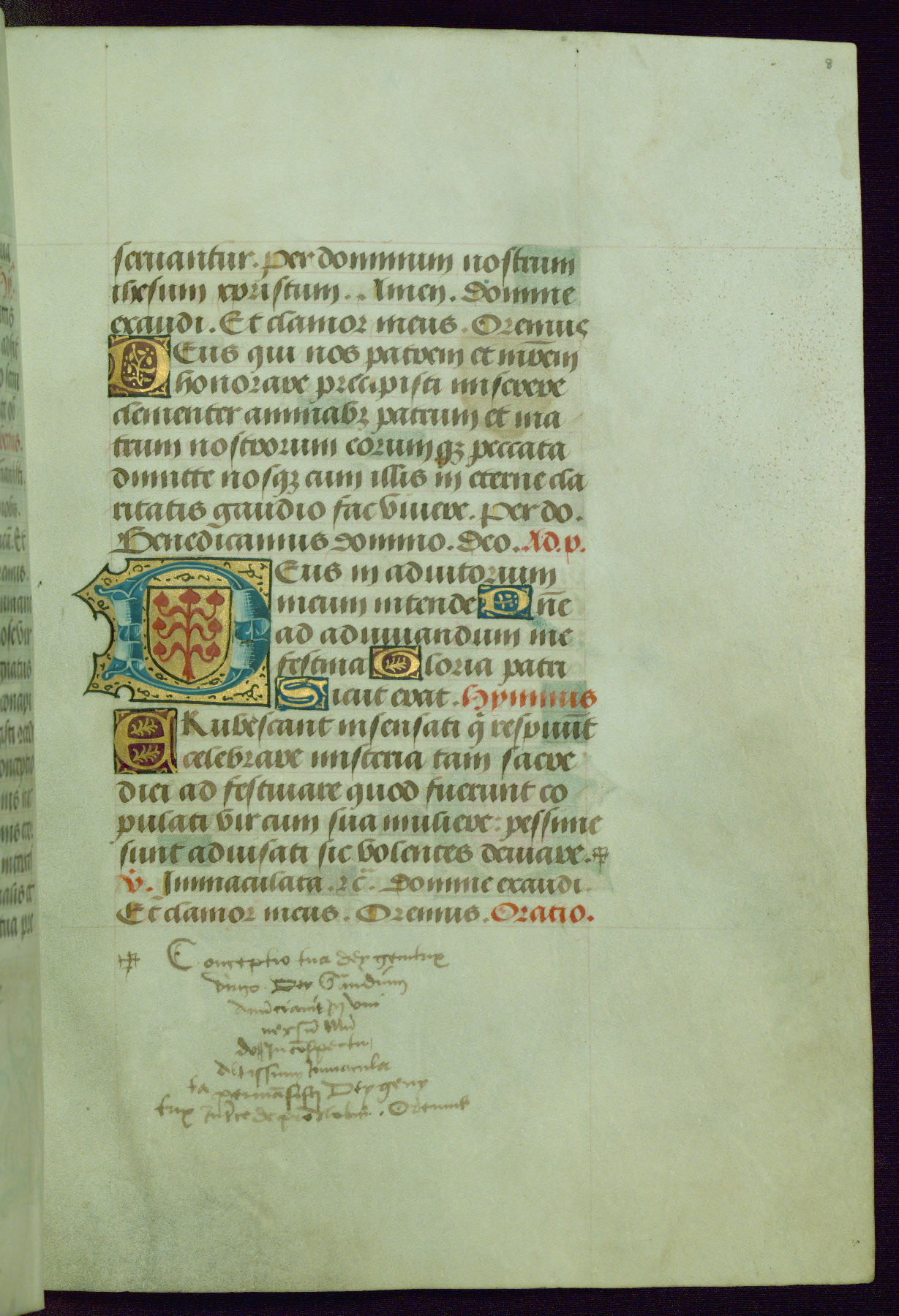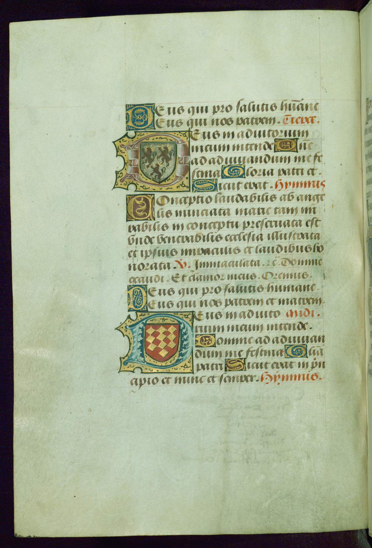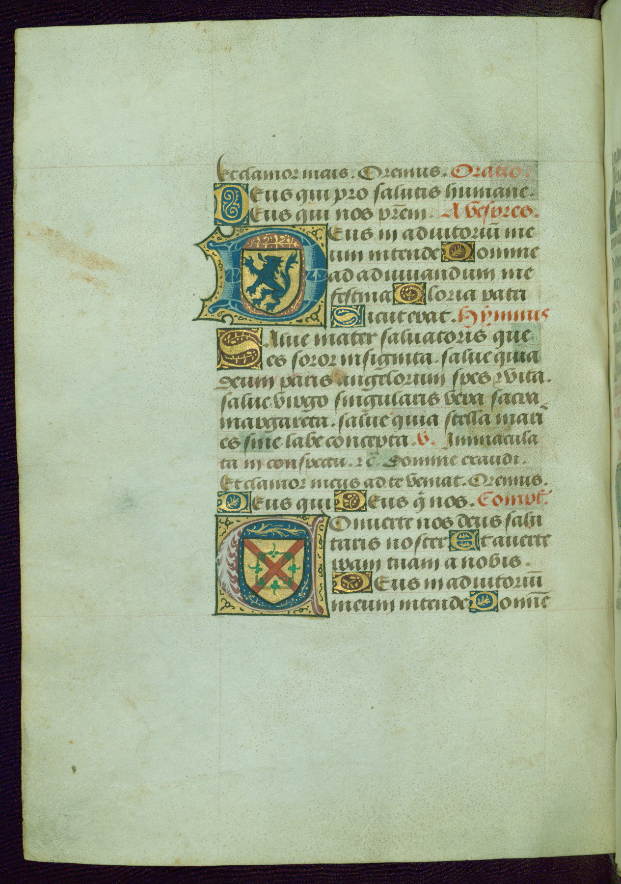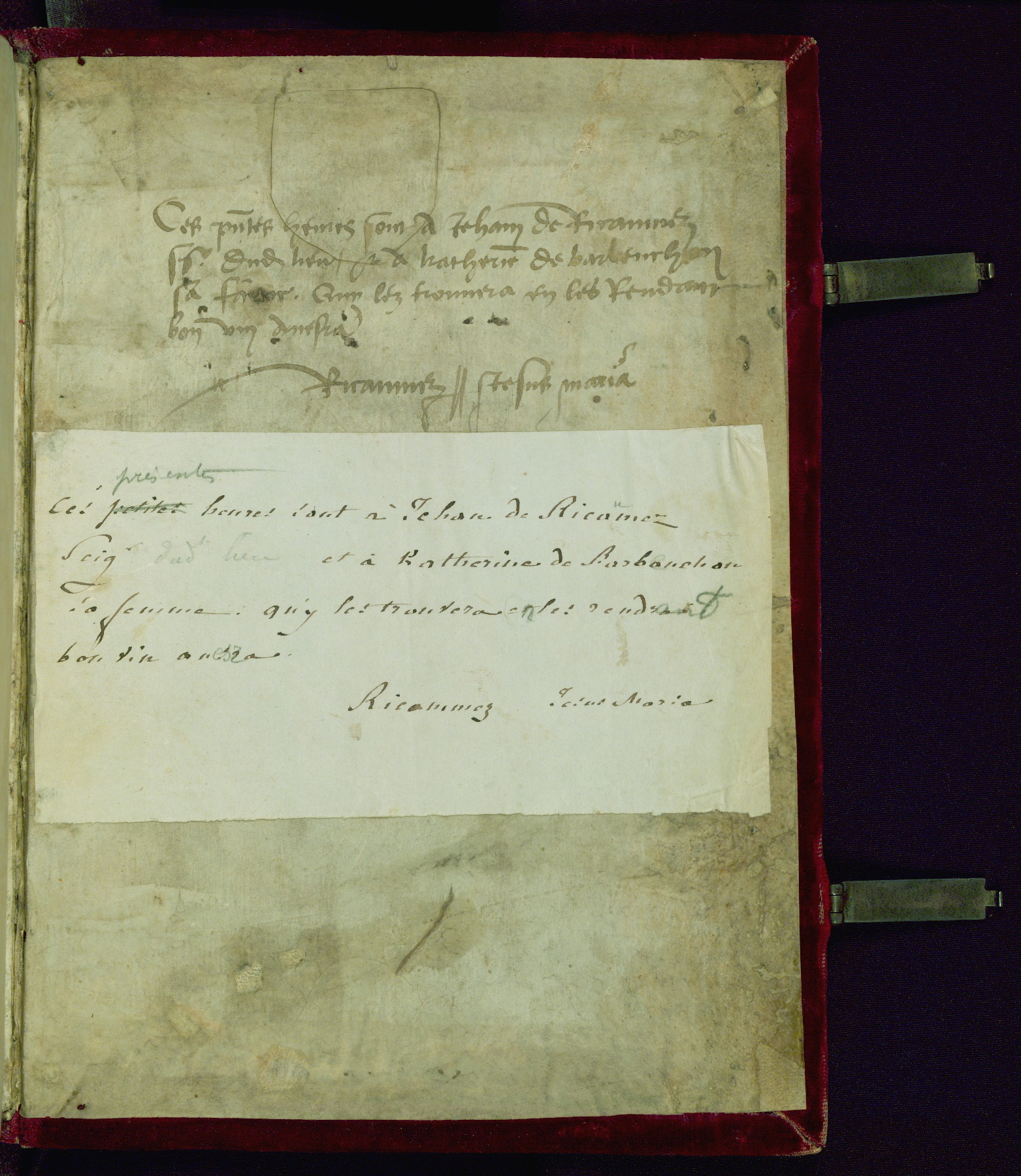 Completed ca. 1440-50 and illuminated in the style of the Masters of the Gold Scrolls, this Book of Hours preserves much information about its provenance. The first owner was possibly Barbe de Feuru, whose signature is found on the front pastedown. The book contains the ex libris of Jean of Ricaumez and his wife, Catherine of Barbenchon; their French inscription on the back pastedown promises good wine to the finder of the book if lost. The book was inherited by their son, Christophe of Ricaumez, who likely added several texts illustrated by an Rouennais artist, ca. 1500. Record of the ownership is not evinced in the book again until 1669 when the ex libris of the Count of Hallennes (Allennes family of Tournai?) was added. Alexandre-Constantin-Joseph of Nassau's (1738-1814) armorial shield appears twice, engraved (front pastedown) and painted (front flyleaf i, v).