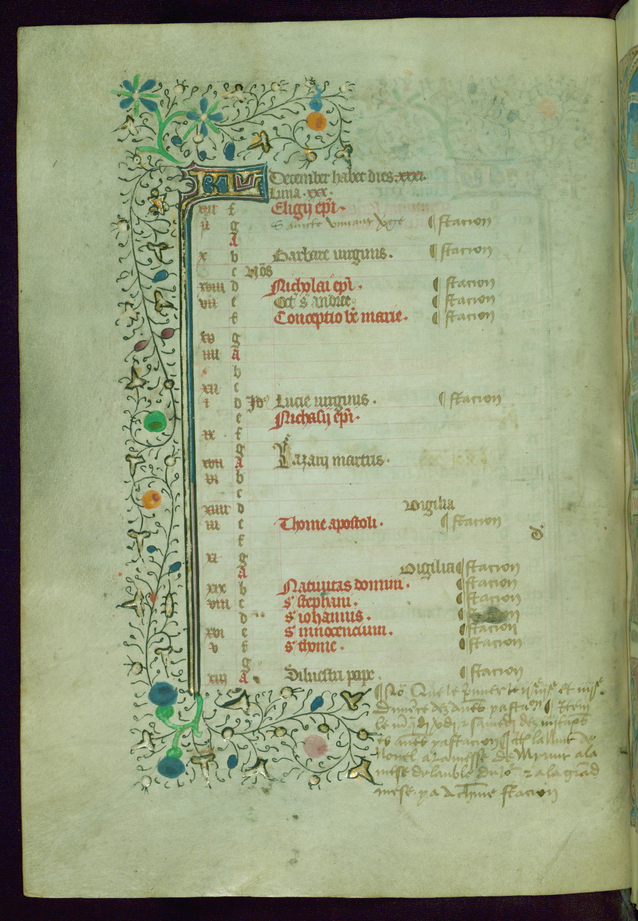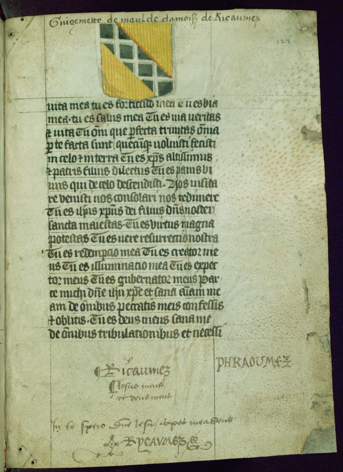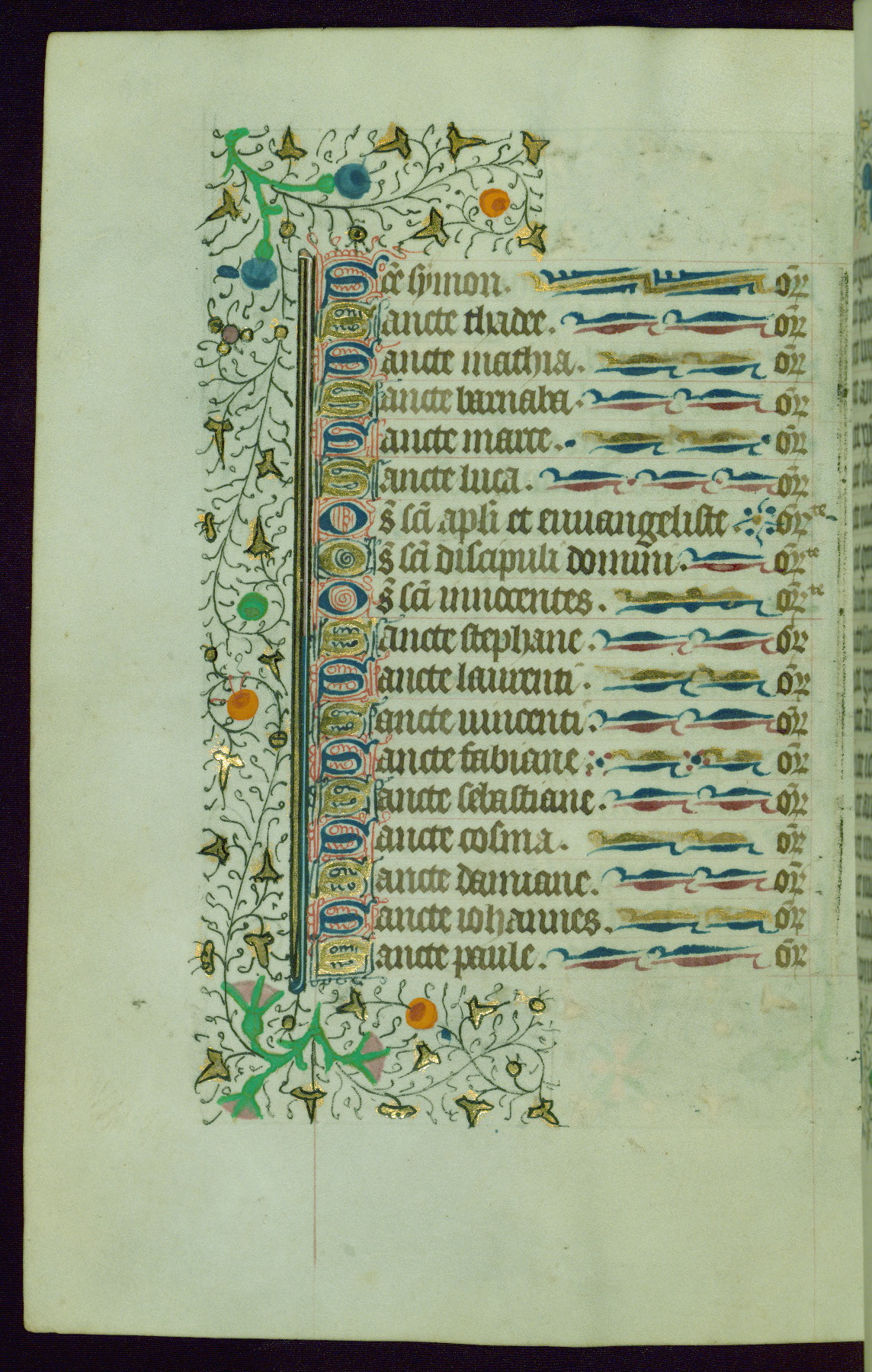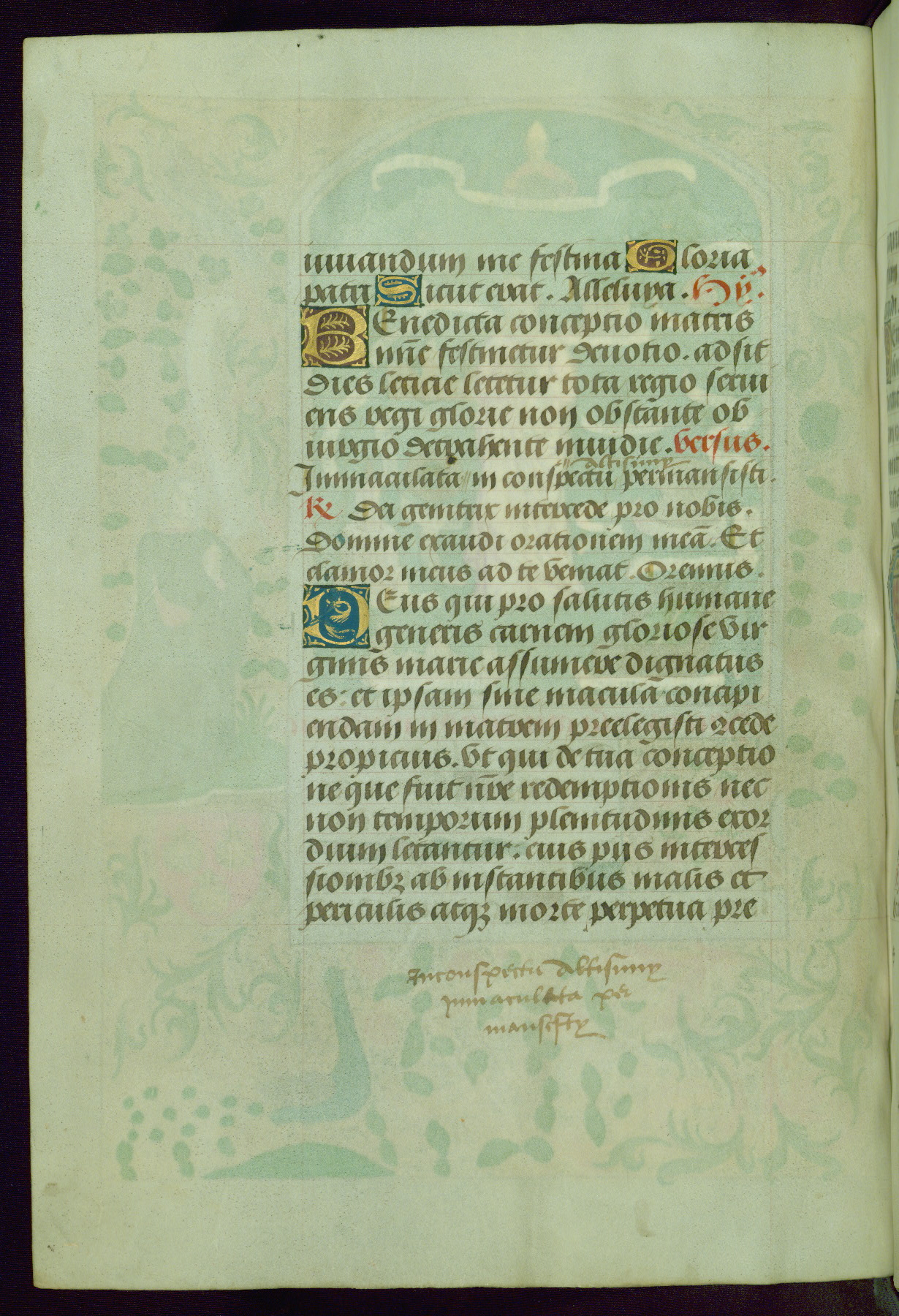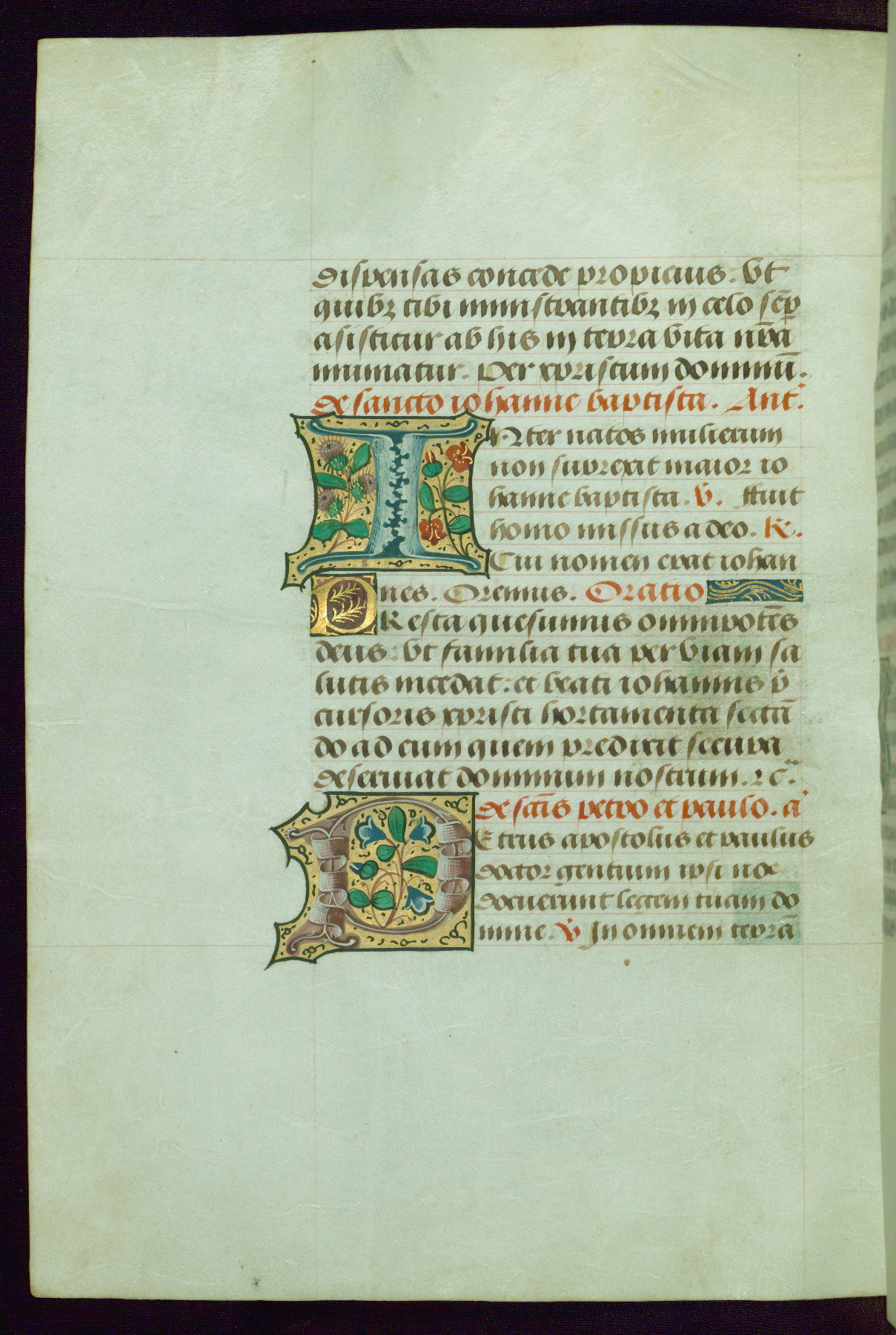 Completed ca. 1440-50 and illuminated in the style of the Masters of the Gold Scrolls, this Book of Hours preserves much information about its provenance. The first owner was possibly Barbe de Feuru, whose signature is found on the front pastedown. The book contains the ex libris of Jean of Ricaumez and his wife, Catherine of Barbenchon; their French inscription on the back pastedown promises good wine to the finder of the book if lost. The book was inherited by their son, Christophe of Ricaumez, who likely added several texts illustrated by an Rouennais artist, ca. 1500. Record of the ownership is not evinced in the book again until 1669 when the ex libris of the Count of Hallennes (Allennes family of Tournai?) was added. Alexandre-Constantin-Joseph of Nassau's (1738-1814) armorial shield appears twice, engraved (front pastedown) and painted (front flyleaf i, v).