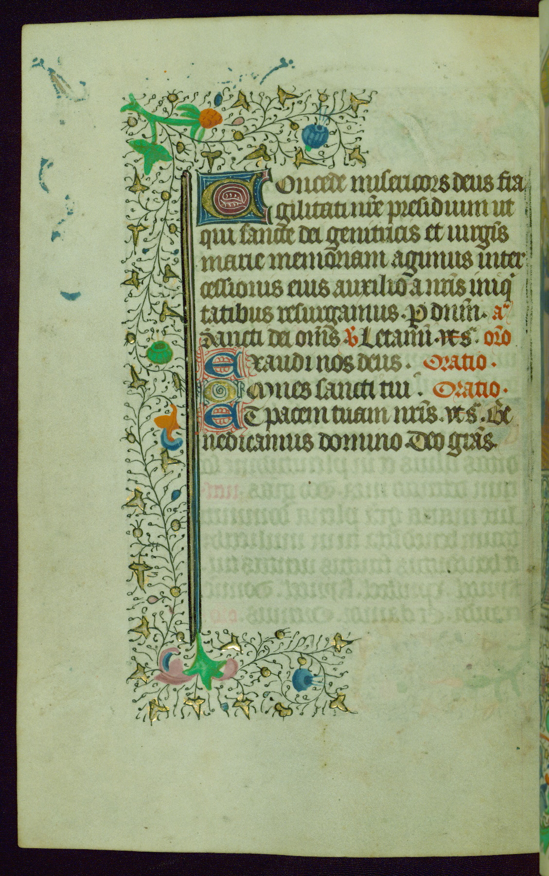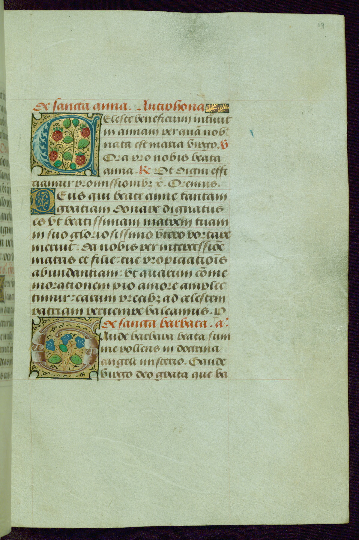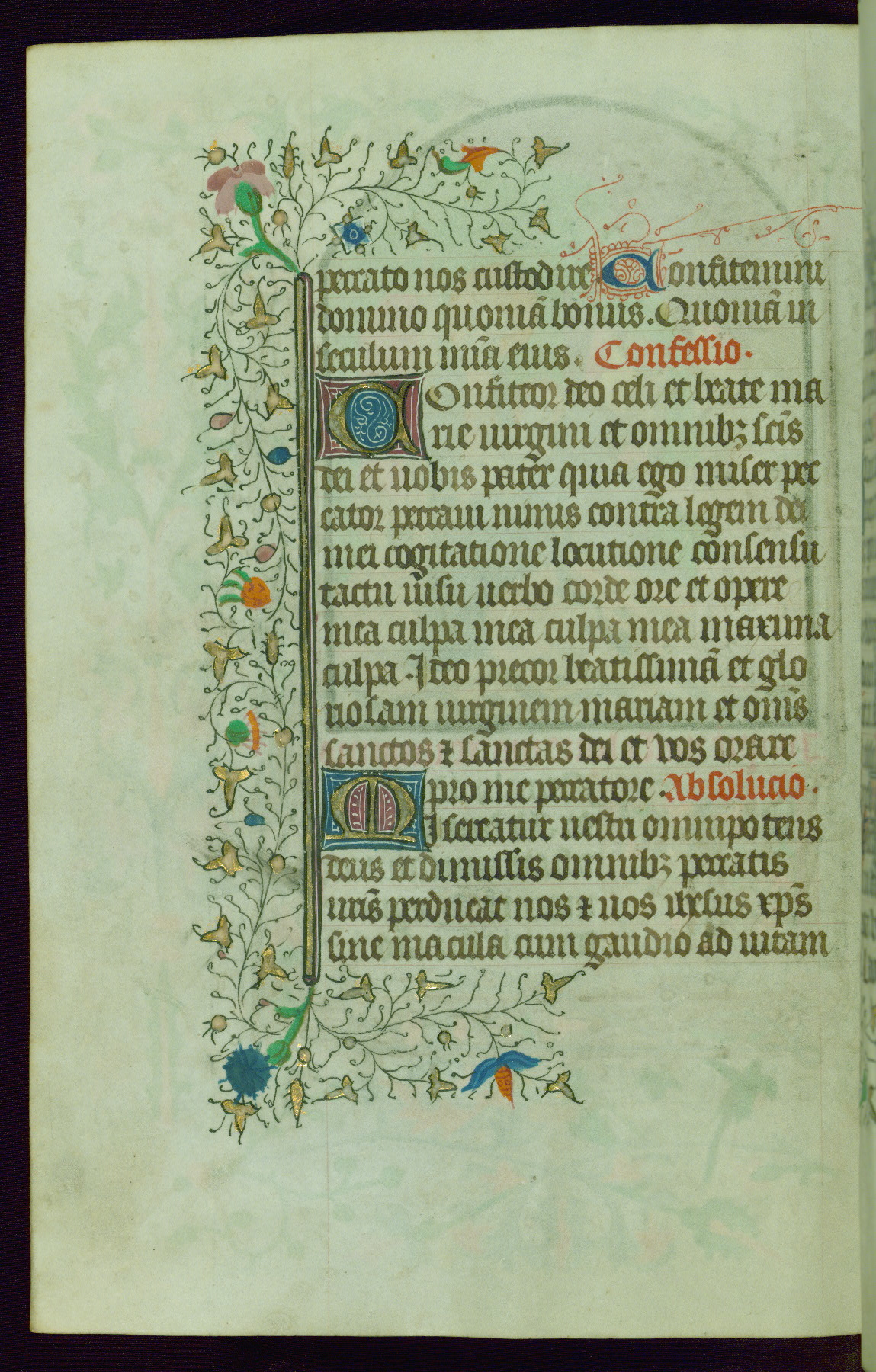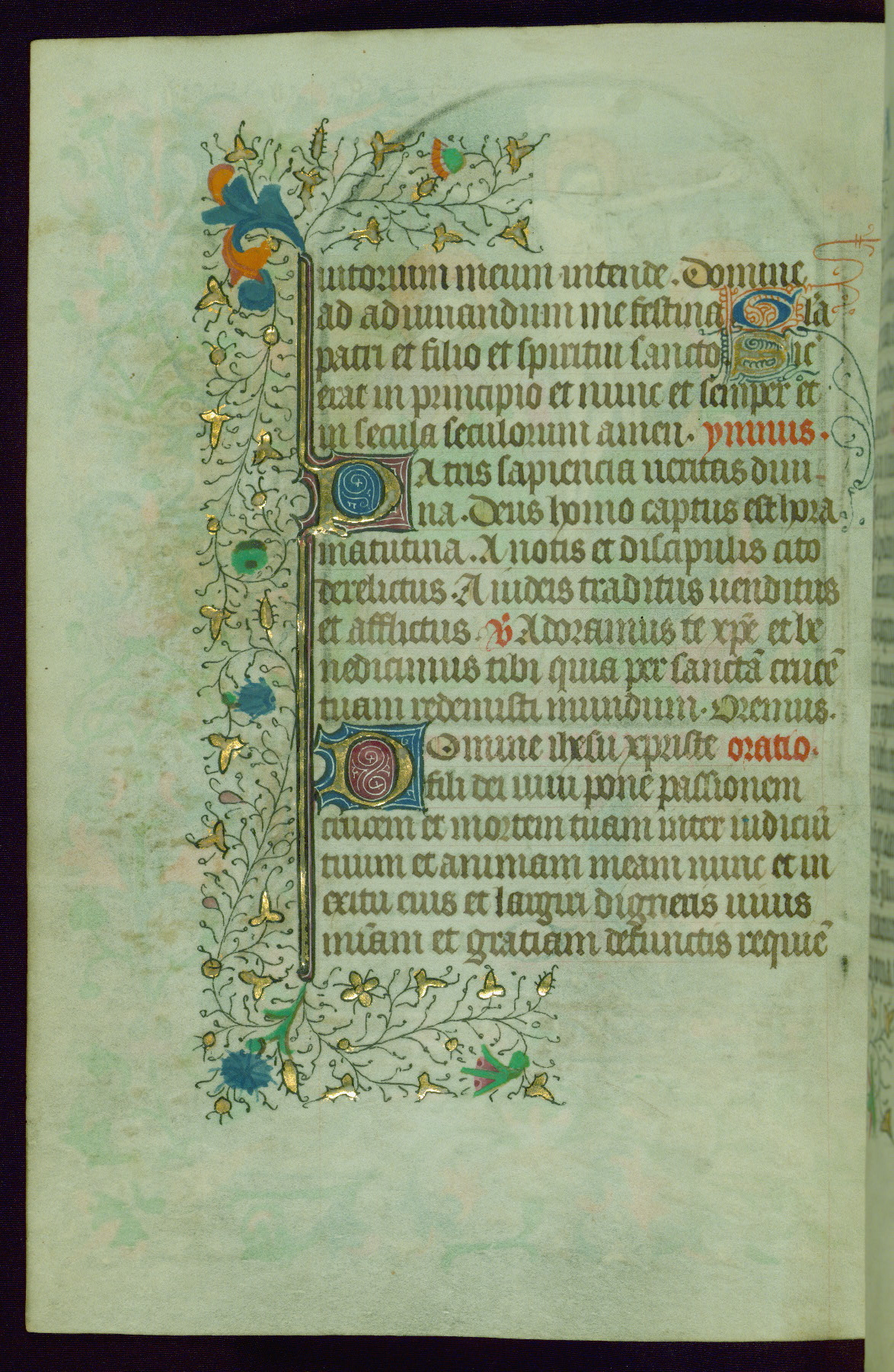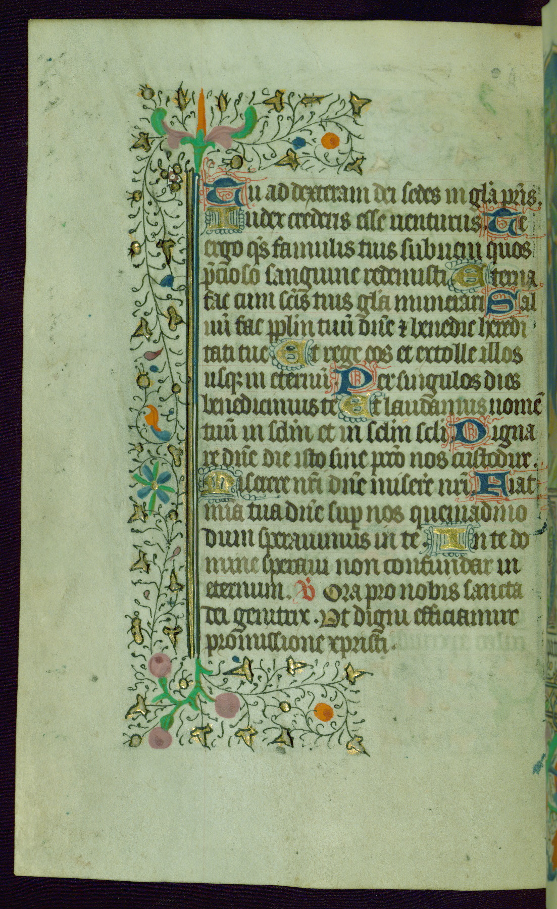 Completed ca. 1440-50 and illuminated in the style of the Masters of the Gold Scrolls, this Book of Hours preserves much information about its provenance. The first owner was possibly Barbe de Feuru, whose signature is found on the front pastedown. The book contains the ex libris of Jean of Ricaumez and his wife, Catherine of Barbenchon; their French inscription on the back pastedown promises good wine to the finder of the book if lost. The book was inherited by their son, Christophe of Ricaumez, who likely added several texts illustrated by an Rouennais artist, ca. 1500. Record of the ownership is not evinced in the book again until 1669 when the ex libris of the Count of Hallennes (Allennes family of Tournai?) was added. Alexandre-Constantin-Joseph of Nassau's (1738-1814) armorial shield appears twice, engraved (front pastedown) and painted (front flyleaf i, v).