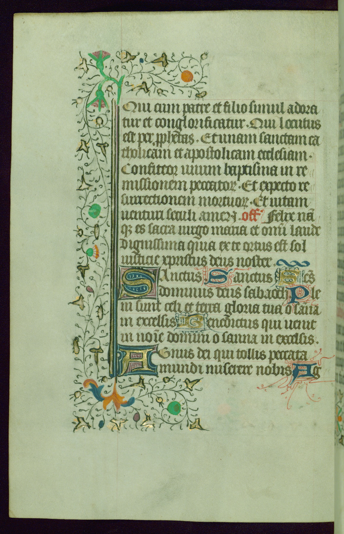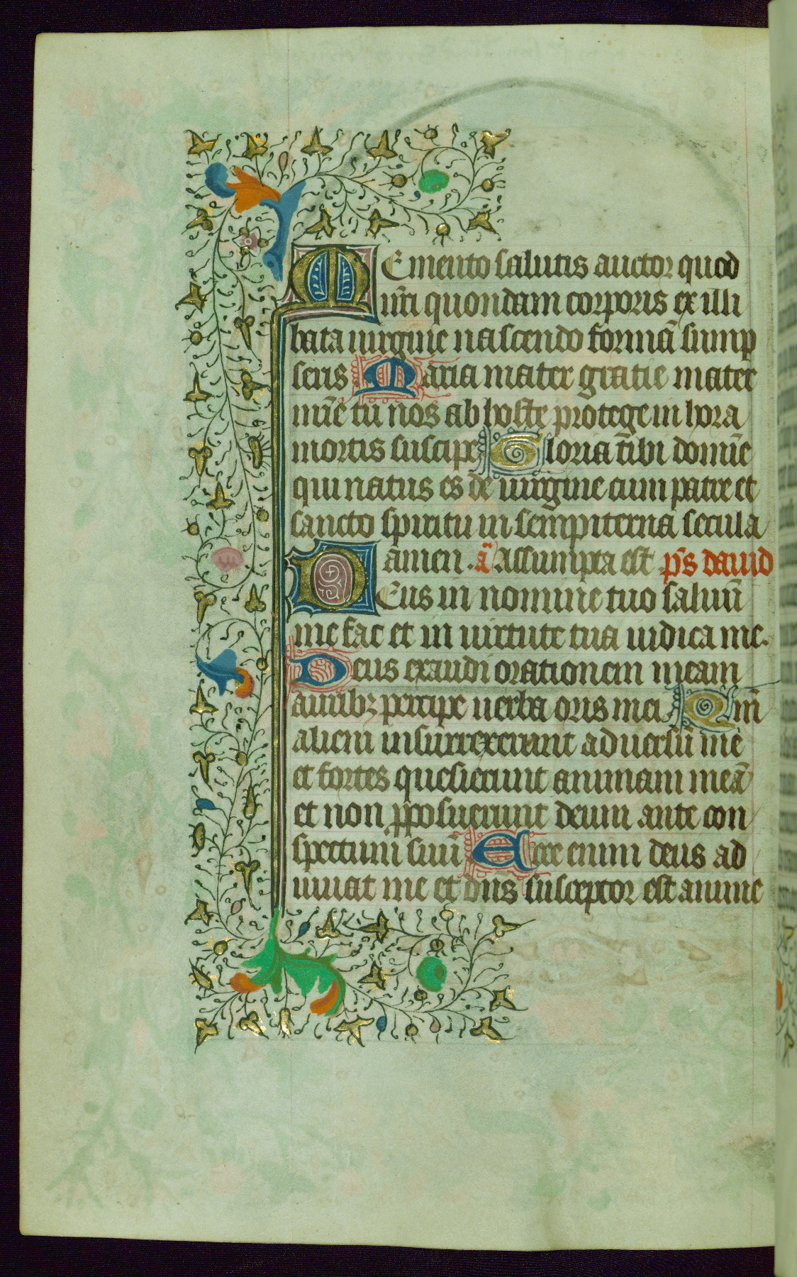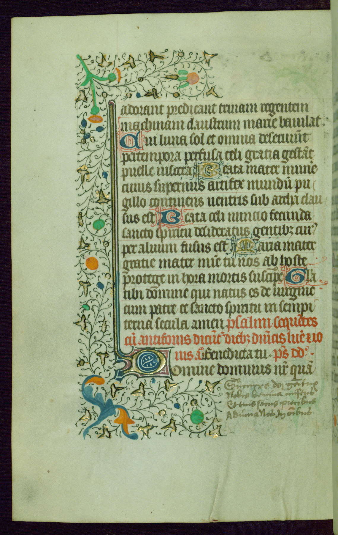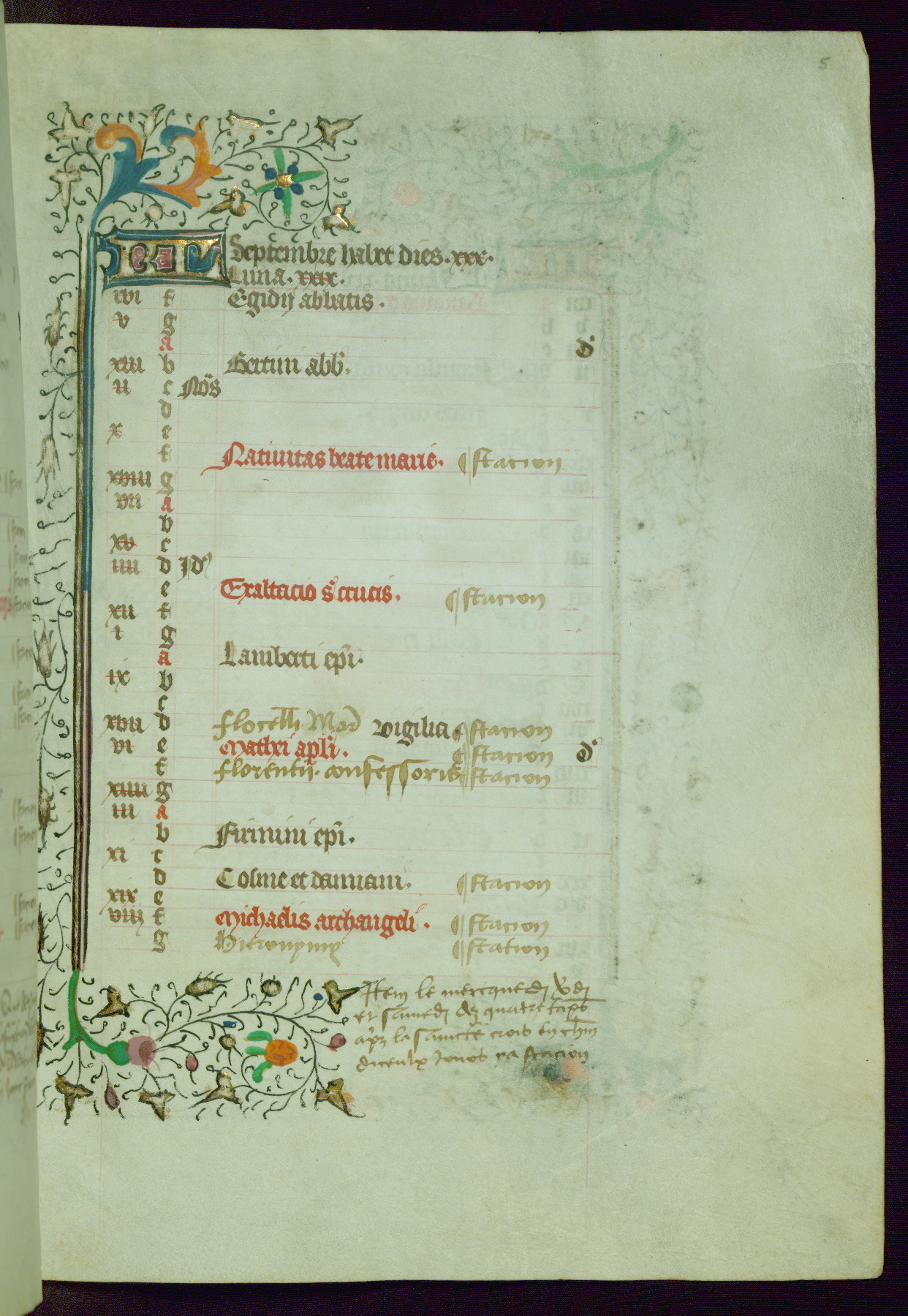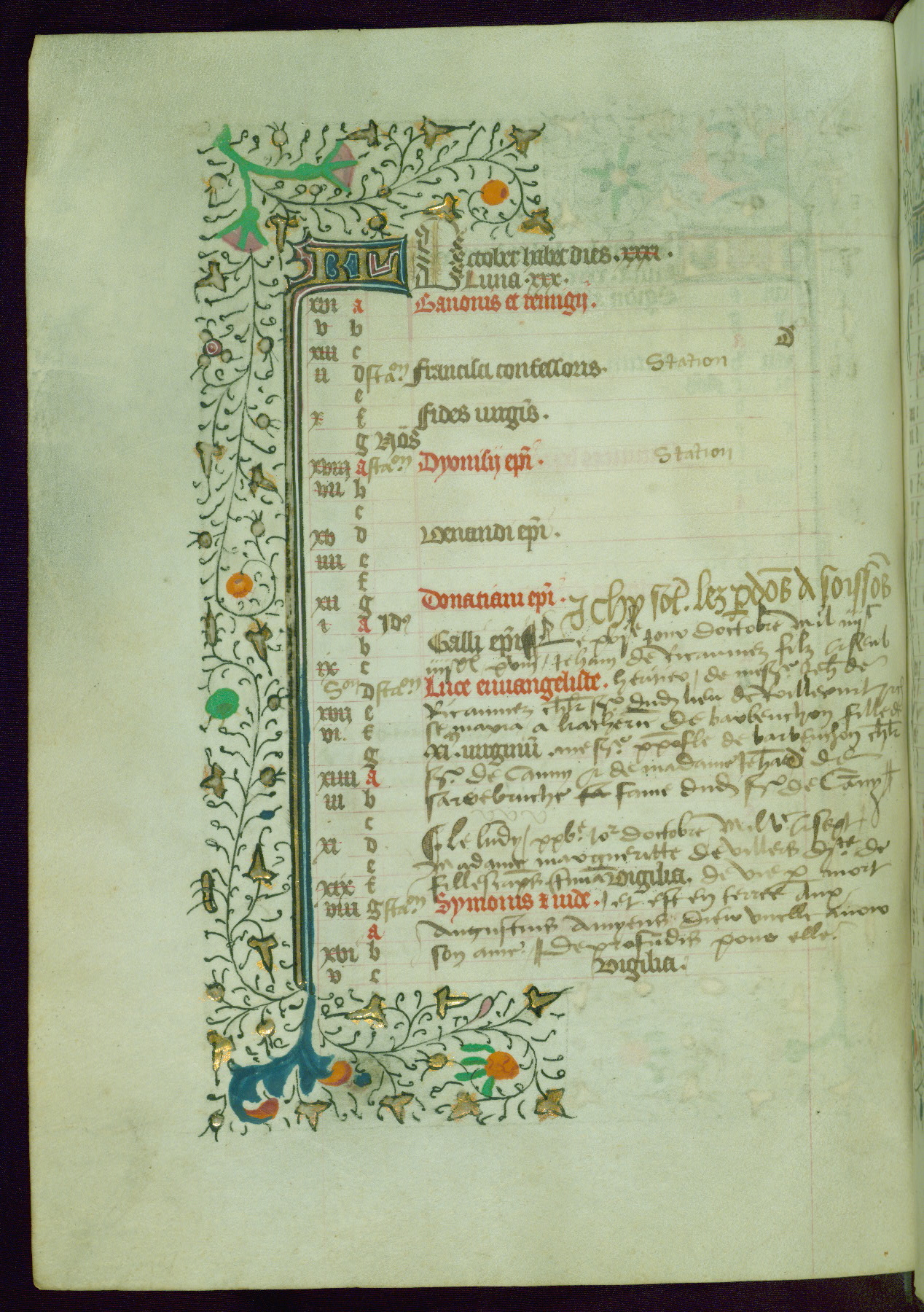Completed ca. 1440-50 and illuminated in the style of the Masters of the Gold Scrolls, this Book of Hours preserves much information about its provenance. The first owner was possibly Barbe de Feuru, whose signature is found on the front pastedown. The book contains the ex libris of Jean of Ricaumez and his wife, Catherine of Barbenchon; their French inscription on the back pastedown promises good wine to the finder of the book if lost. The book was inherited by their son, Christophe of Ricaumez, who likely added several texts illustrated by an Rouennais artist, ca. 1500. Record of the ownership is not evinced in the book again until 1669 when the ex libris of the Count of Hallennes (Allennes family of Tournai?) was added. Alexandre-Constantin-Joseph of Nassau's (1738-1814) armorial shield appears twice, engraved (front pastedown) and painted (front flyleaf i, v).
