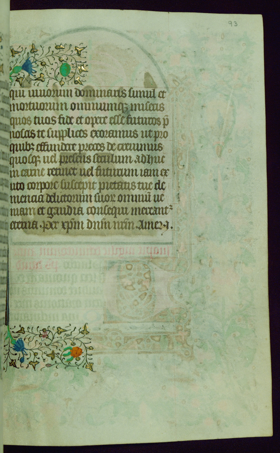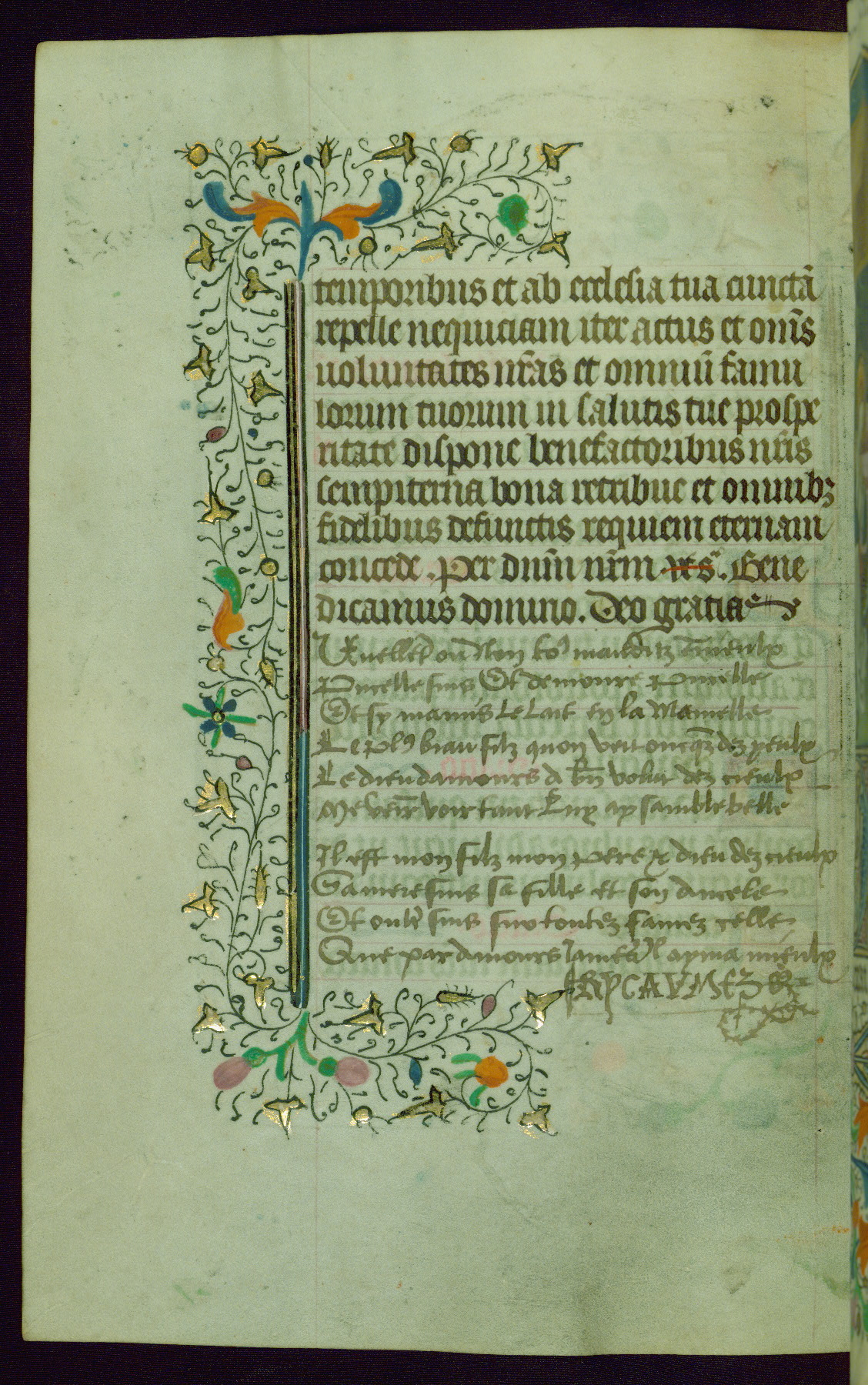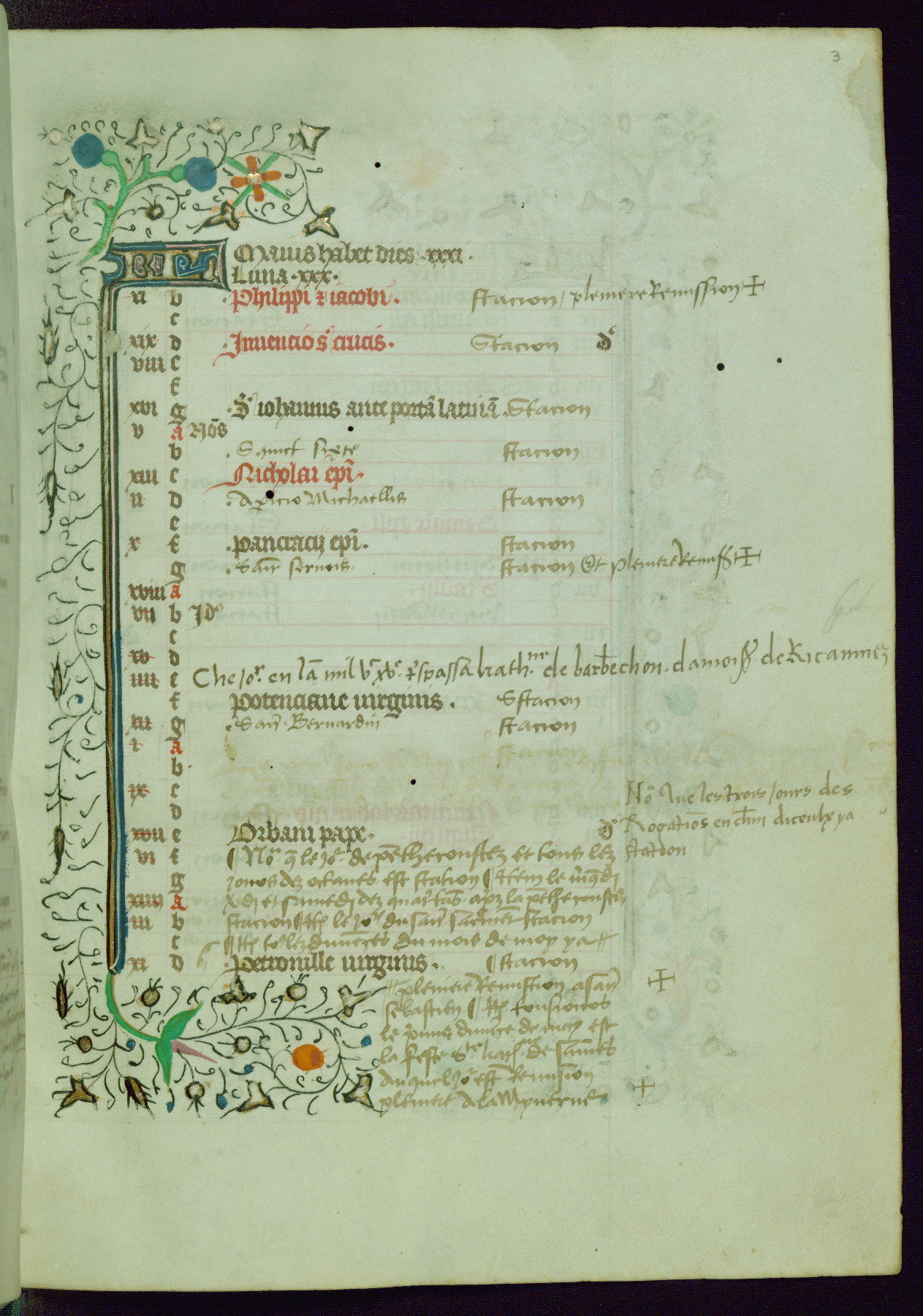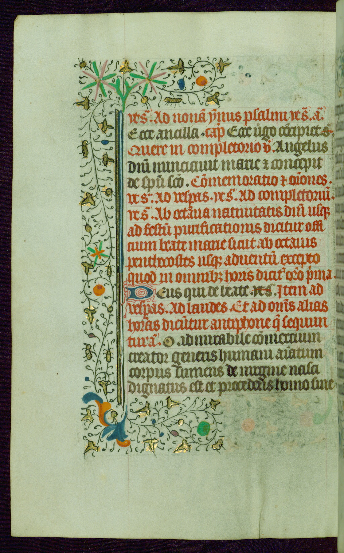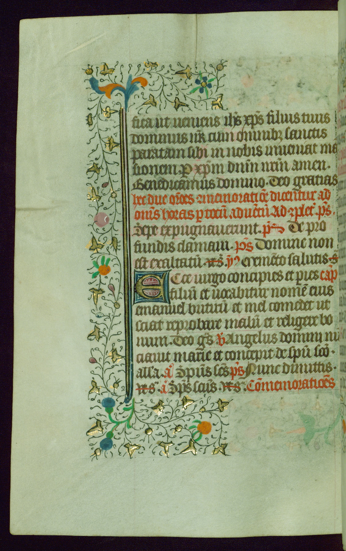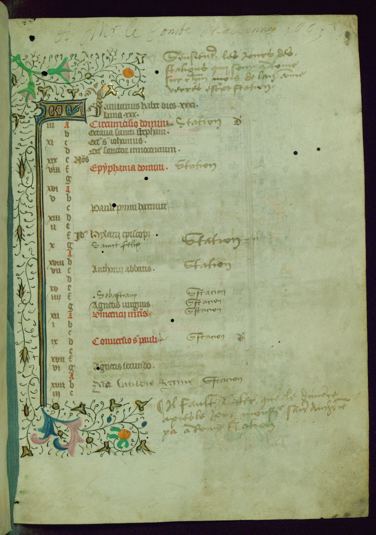 Completed ca. 1440-50 and illuminated in the style of the Masters of the Gold Scrolls, this Book of Hours preserves much information about its provenance. The first owner was possibly Barbe de Feuru, whose signature is found on the front pastedown. The book contains the ex libris of Jean of Ricaumez and his wife, Catherine of Barbenchon; their French inscription on the back pastedown promises good wine to the finder of the book if lost. The book was inherited by their son, Christophe of Ricaumez, who likely added several texts illustrated by an Rouennais artist, ca. 1500. Record of the ownership is not evinced in the book again until 1669 when the ex libris of the Count of Hallennes (Allennes family of Tournai?) was added. Alexandre-Constantin-Joseph of Nassau's (1738-1814) armorial shield appears twice, engraved (front pastedown) and painted (front flyleaf i, v).