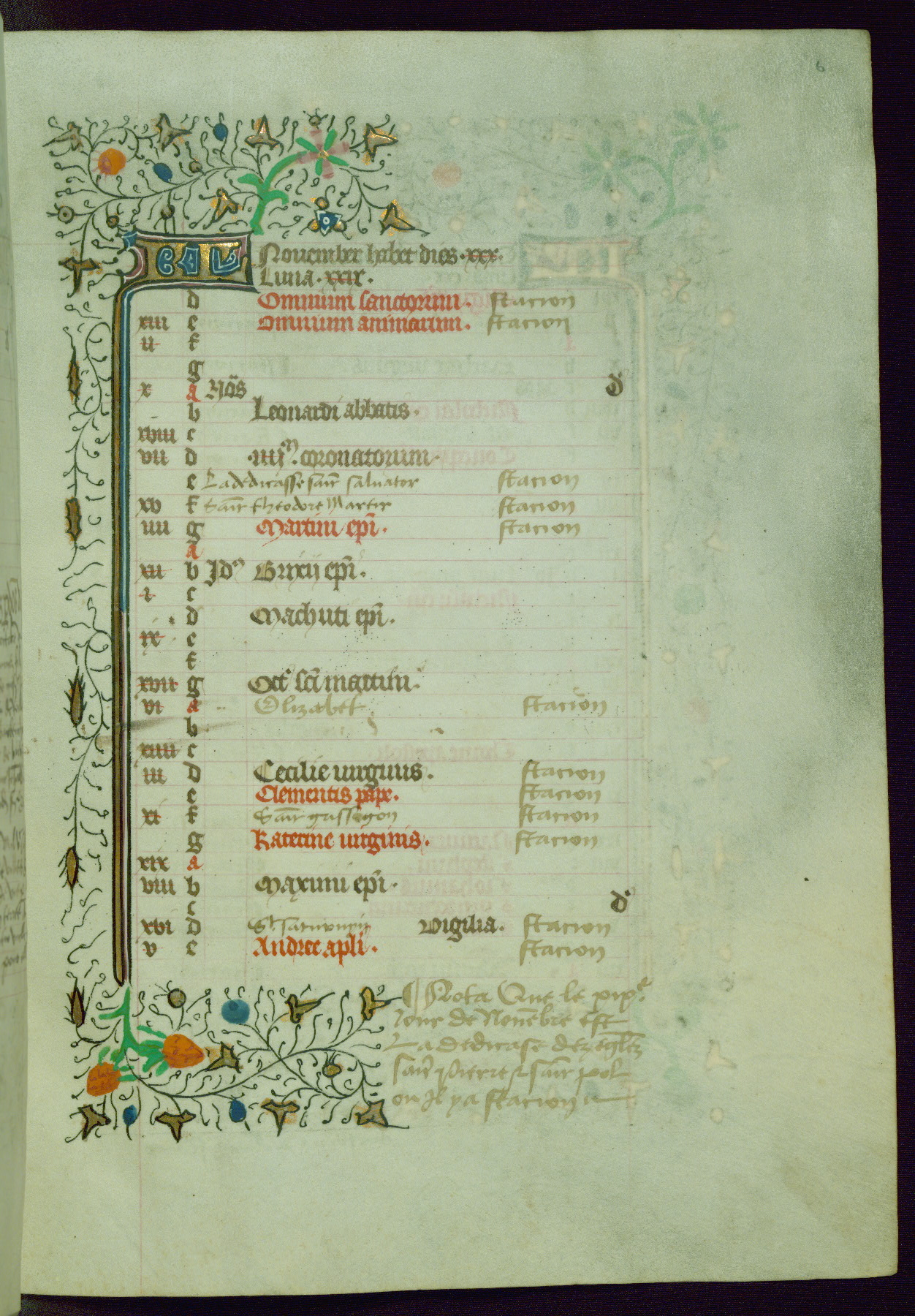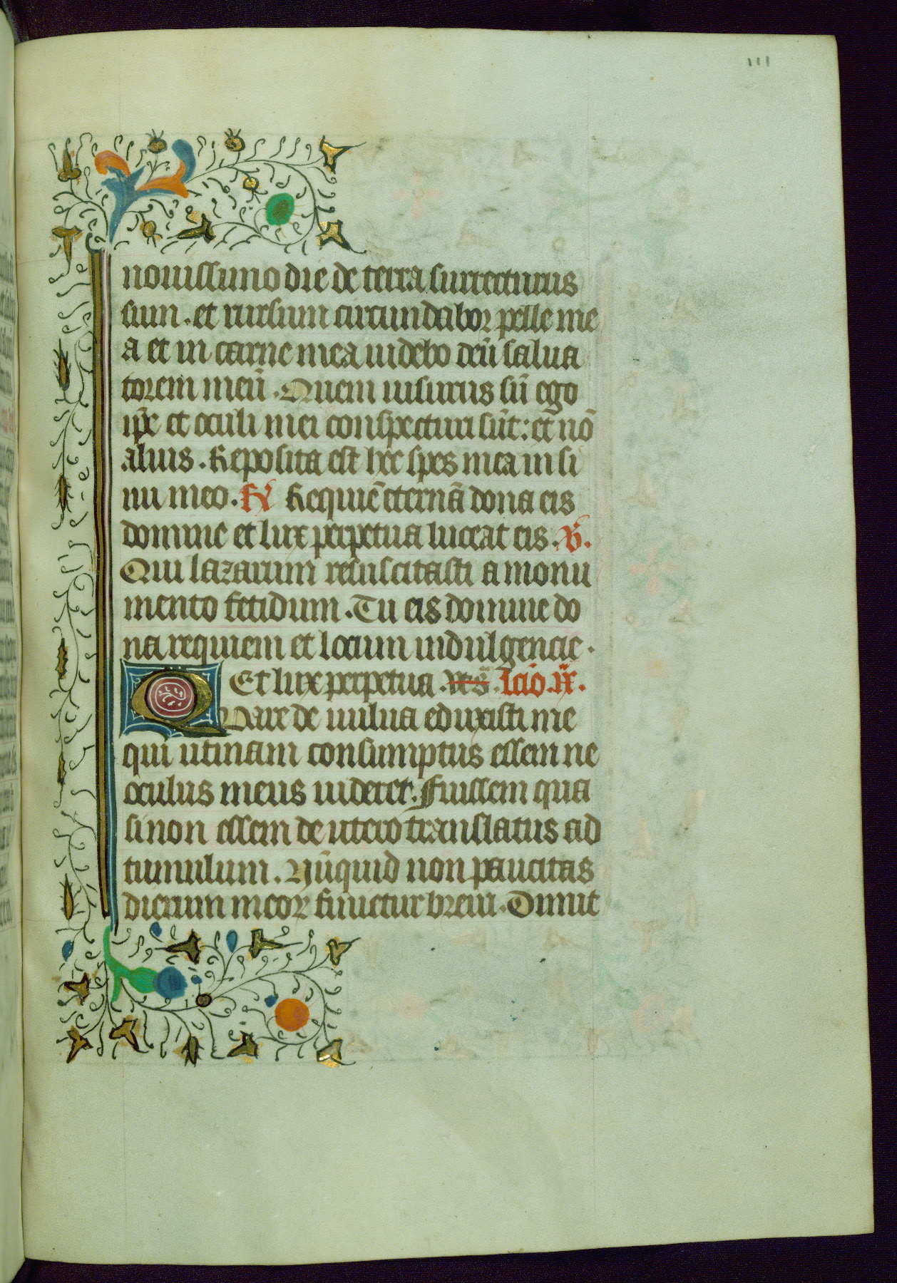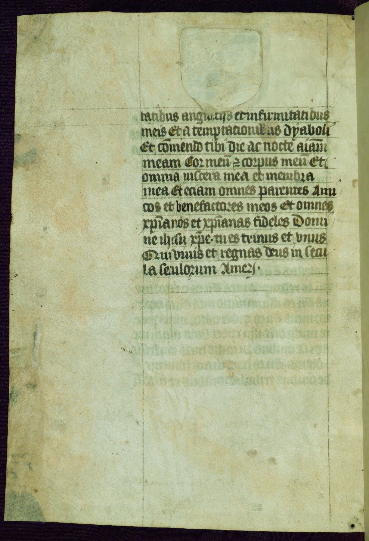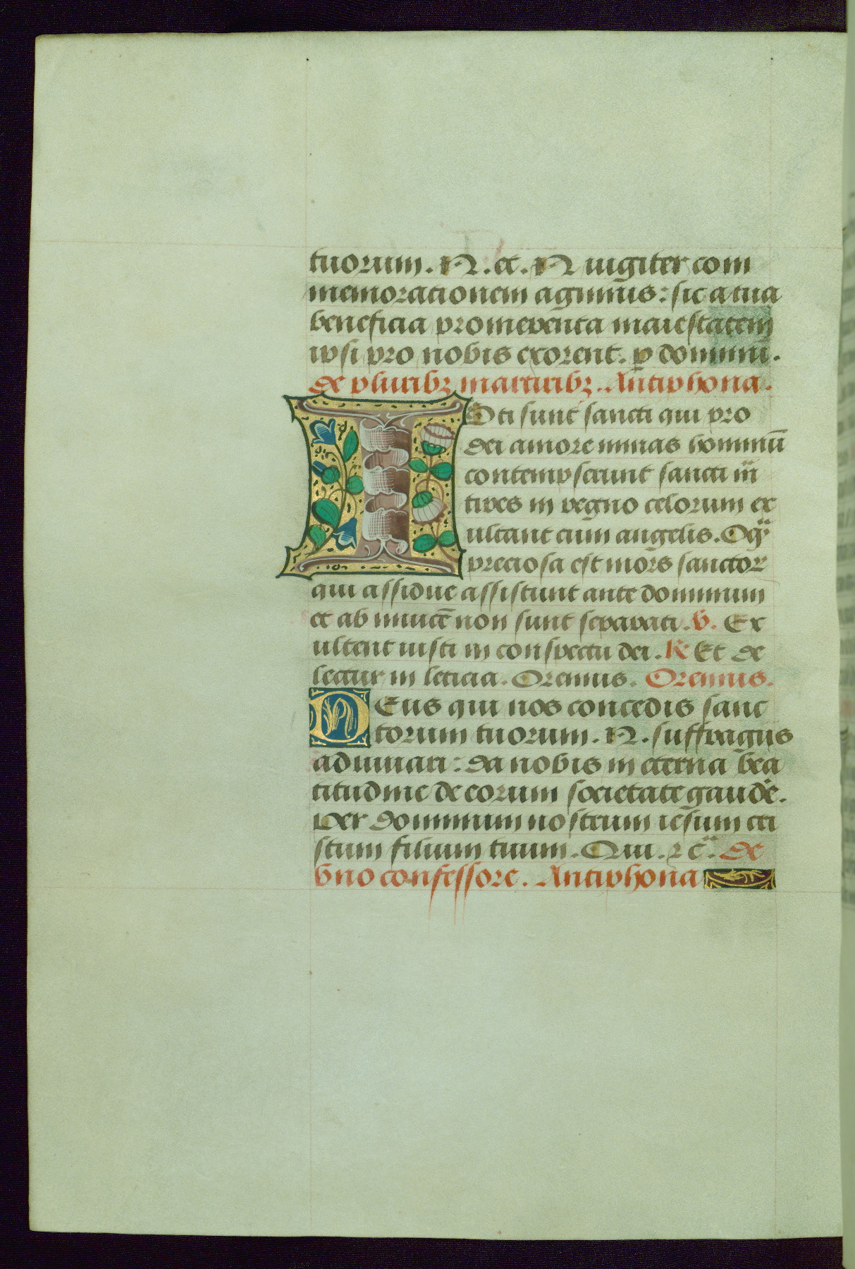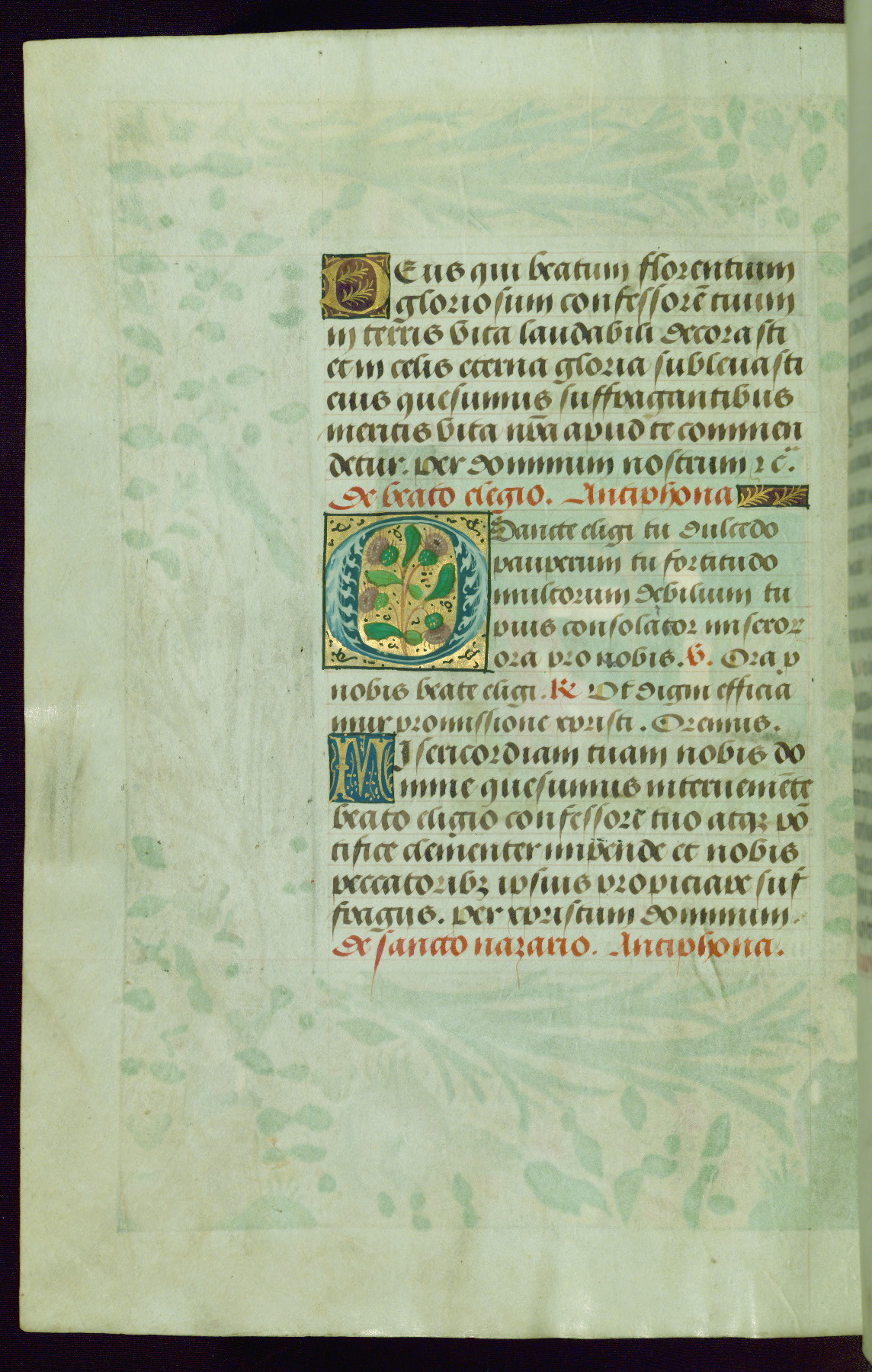 Completed ca. 1440-50 and illuminated in the style of the Masters of the Gold Scrolls, this Book of Hours preserves much information about its provenance. The first owner was possibly Barbe de Feuru, whose signature is found on the front pastedown. The book contains the ex libris of Jean of Ricaumez and his wife, Catherine of Barbenchon; their French inscription on the back pastedown promises good wine to the finder of the book if lost. The book was inherited by their son, Christophe of Ricaumez, who likely added several texts illustrated by an Rouennais artist, ca. 1500. Record of the ownership is not evinced in the book again until 1669 when the ex libris of the Count of Hallennes (Allennes family of Tournai?) was added. Alexandre-Constantin-Joseph of Nassau's (1738-1814) armorial shield appears twice, engraved (front pastedown) and painted (front flyleaf i, v).