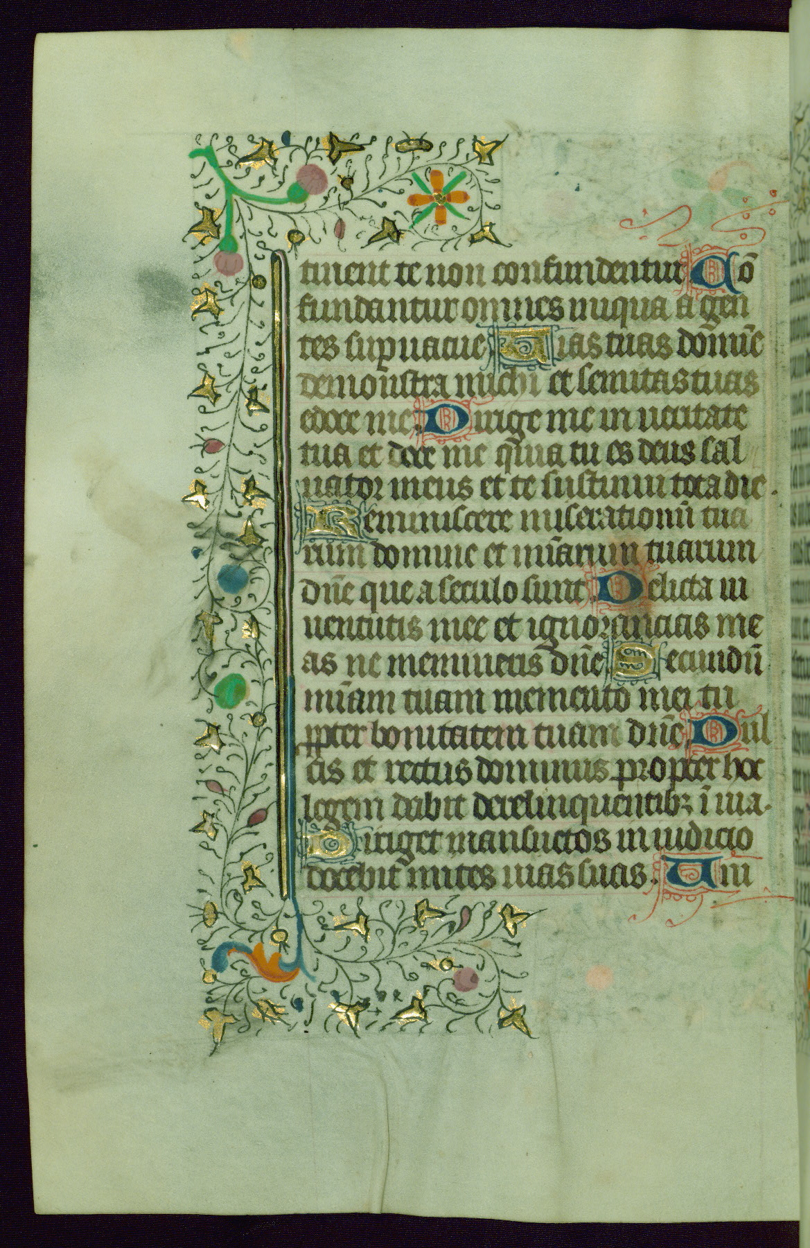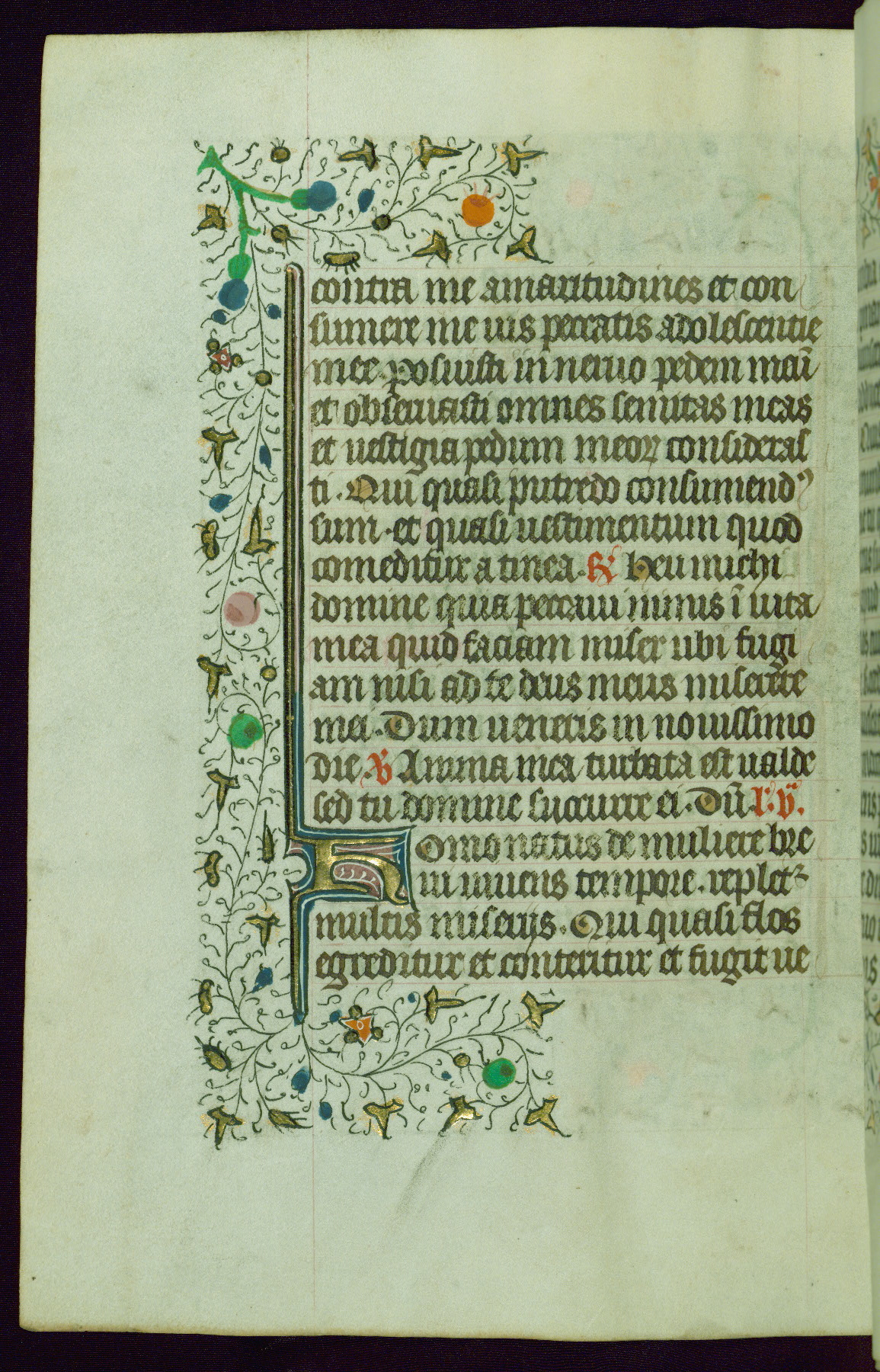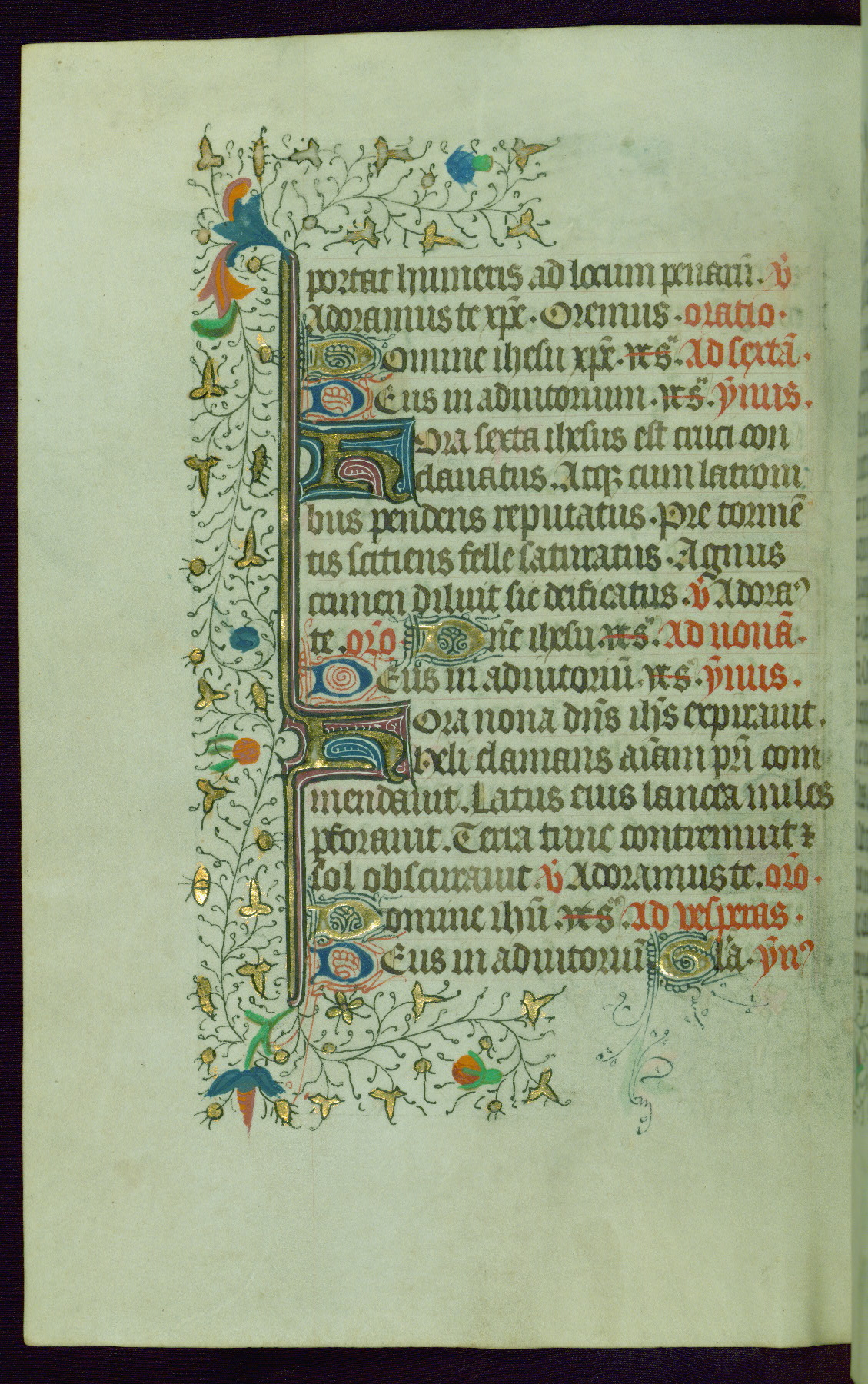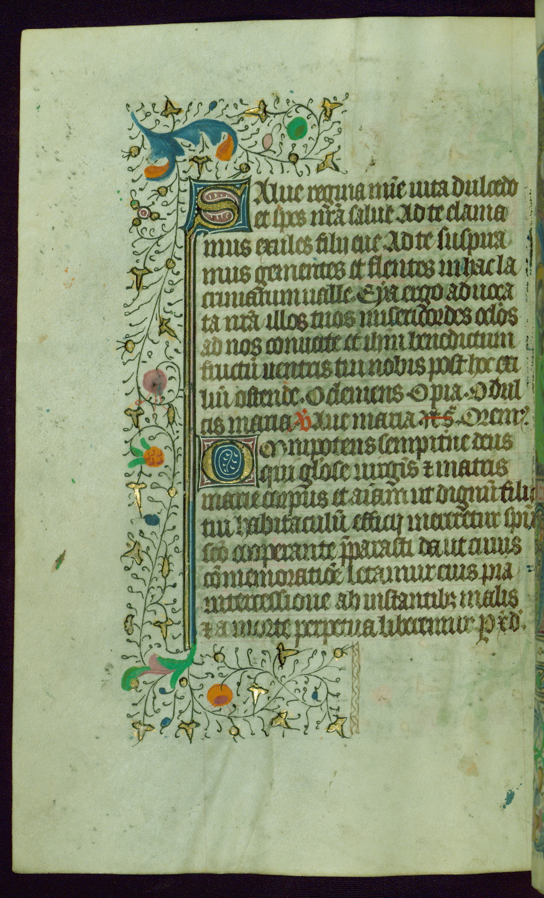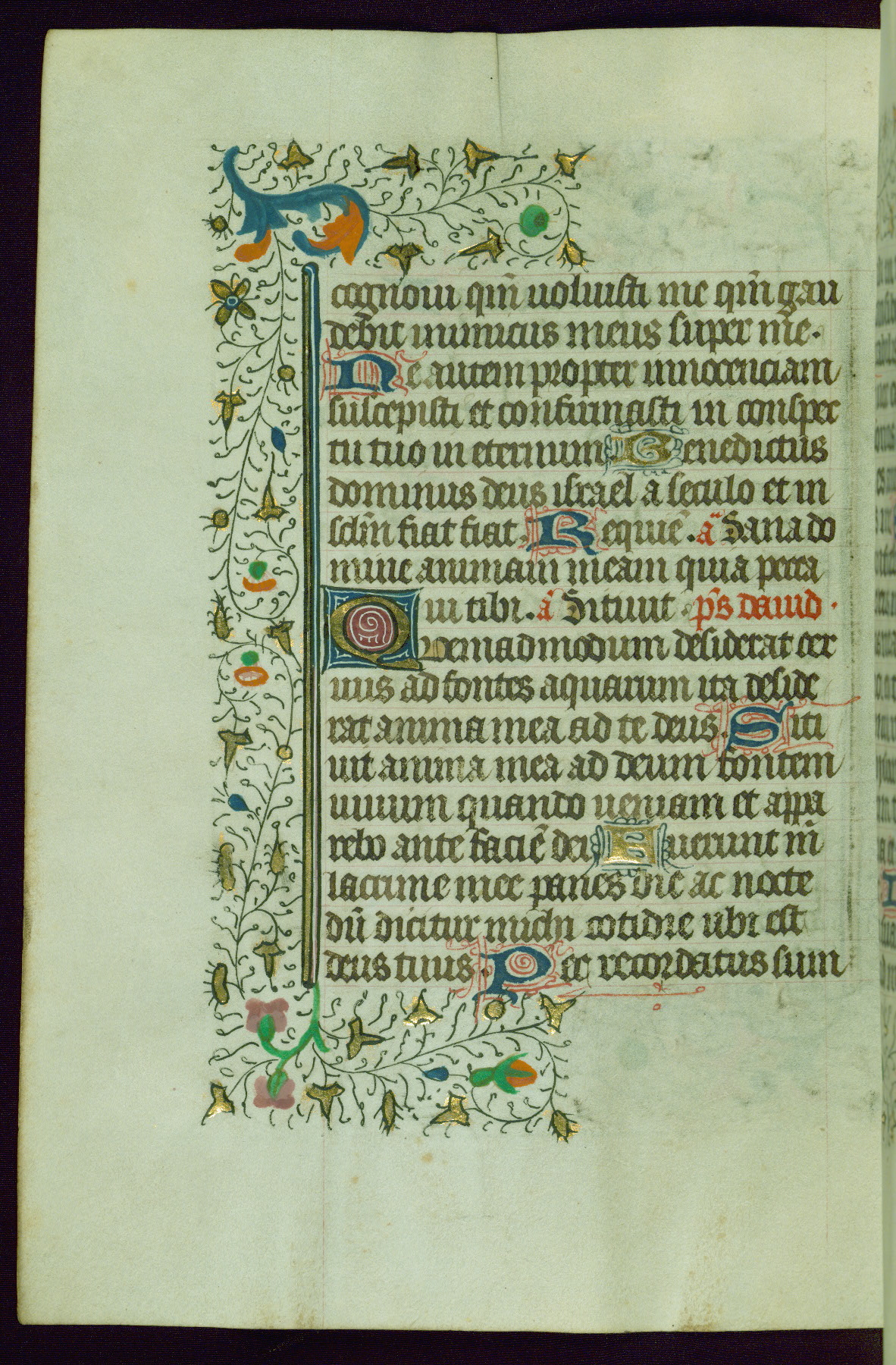 Completed ca. 1440-50 and illuminated in the style of the Masters of the Gold Scrolls, this Book of Hours preserves much information about its provenance. The first owner was possibly Barbe de Feuru, whose signature is found on the front pastedown. The book contains the ex libris of Jean of Ricaumez and his wife, Catherine of Barbenchon; their French inscription on the back pastedown promises good wine to the finder of the book if lost. The book was inherited by their son, Christophe of Ricaumez, who likely added several texts illustrated by an Rouennais artist, ca. 1500. Record of the ownership is not evinced in the book again until 1669 when the ex libris of the Count of Hallennes (Allennes family of Tournai?) was added. Alexandre-Constantin-Joseph of Nassau's (1738-1814) armorial shield appears twice, engraved (front pastedown) and painted (front flyleaf i, v).