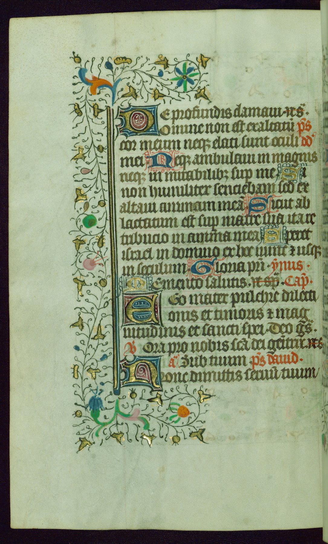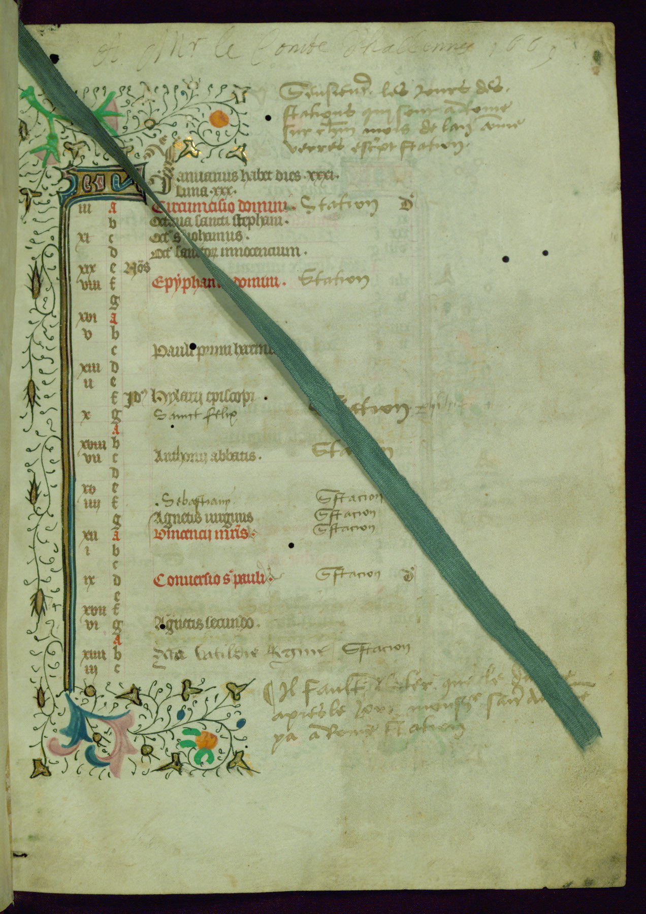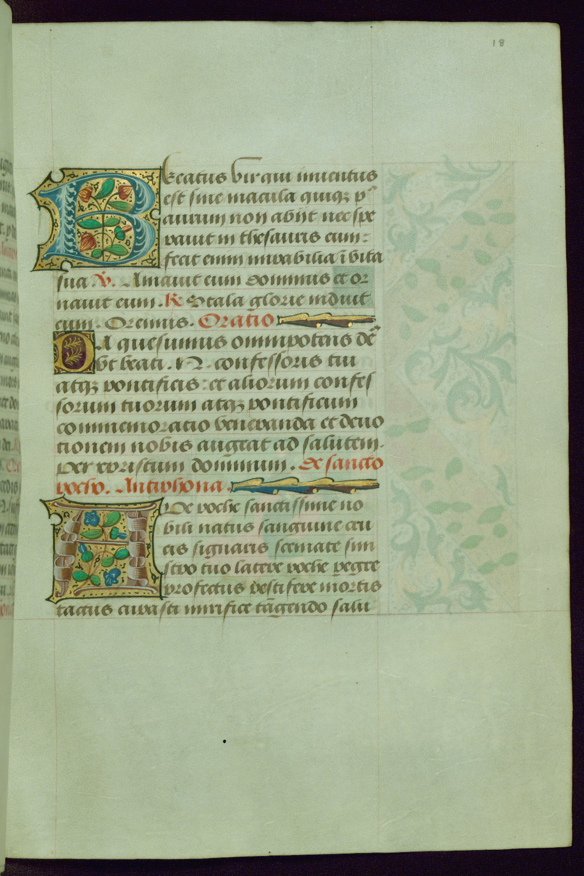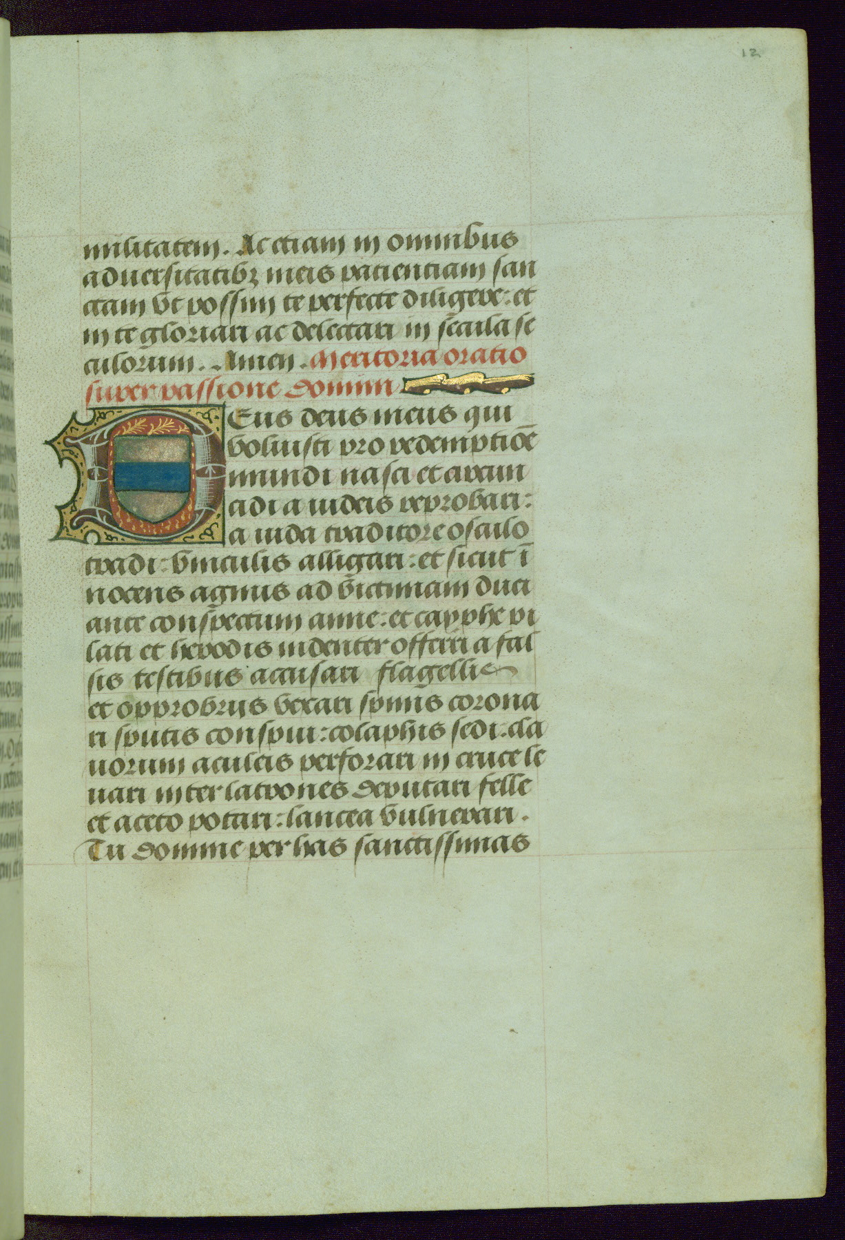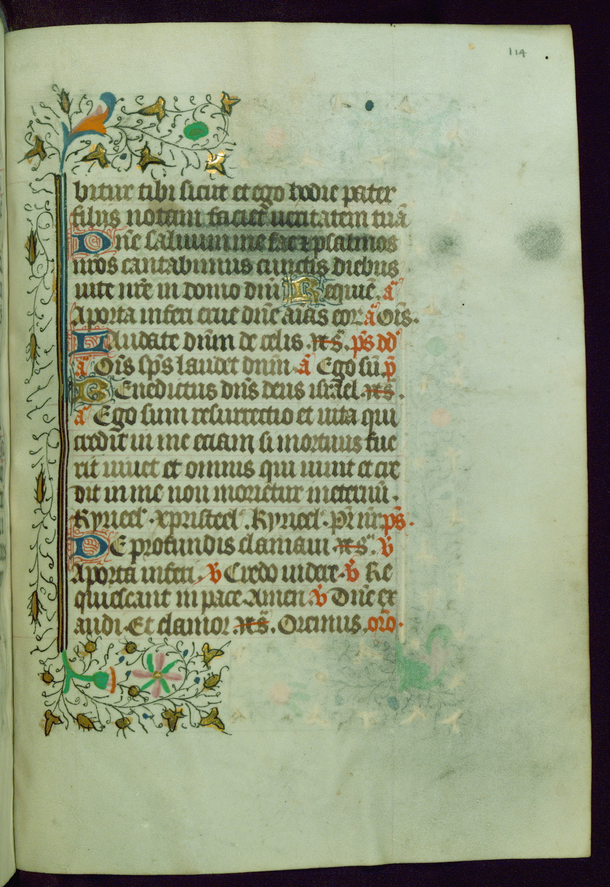 Completed ca. 1440-50 and illuminated in the style of the Masters of the Gold Scrolls, this Book of Hours preserves much information about its provenance. The first owner was possibly Barbe de Feuru, whose signature is found on the front pastedown. The book contains the ex libris of Jean of Ricaumez and his wife, Catherine of Barbenchon; their French inscription on the back pastedown promises good wine to the finder of the book if lost. The book was inherited by their son, Christophe of Ricaumez, who likely added several texts illustrated by an Rouennais artist, ca. 1500. Record of the ownership is not evinced in the book again until 1669 when the ex libris of the Count of Hallennes (Allennes family of Tournai?) was added. Alexandre-Constantin-Joseph of Nassau's (1738-1814) armorial shield appears twice, engraved (front pastedown) and painted (front flyleaf i, v).