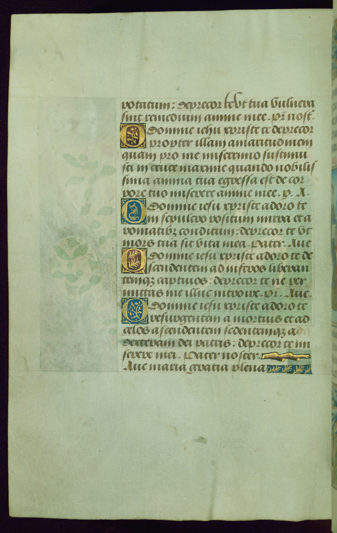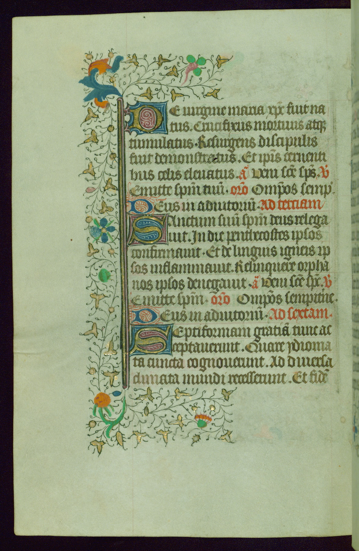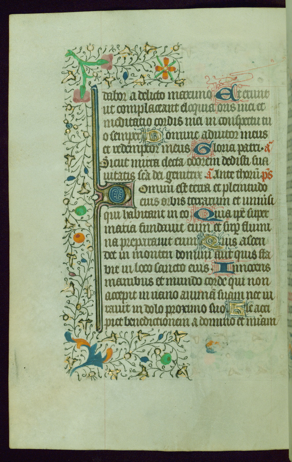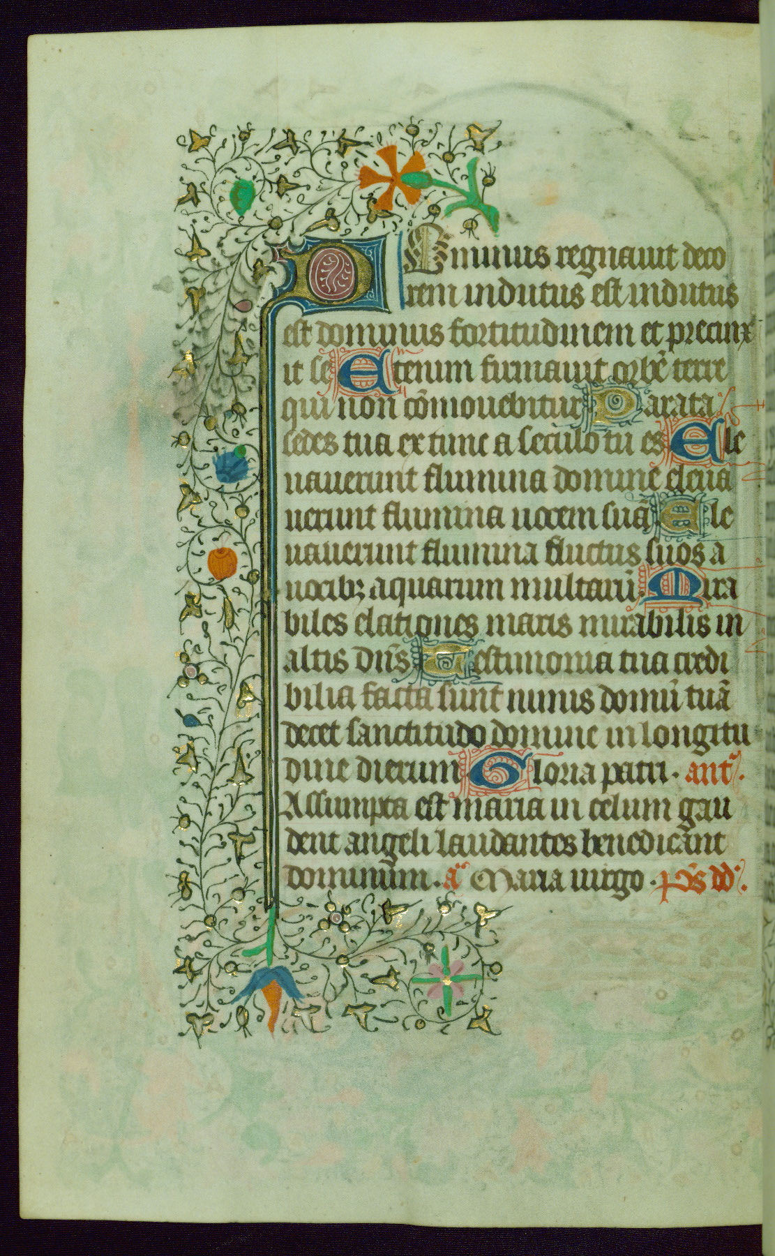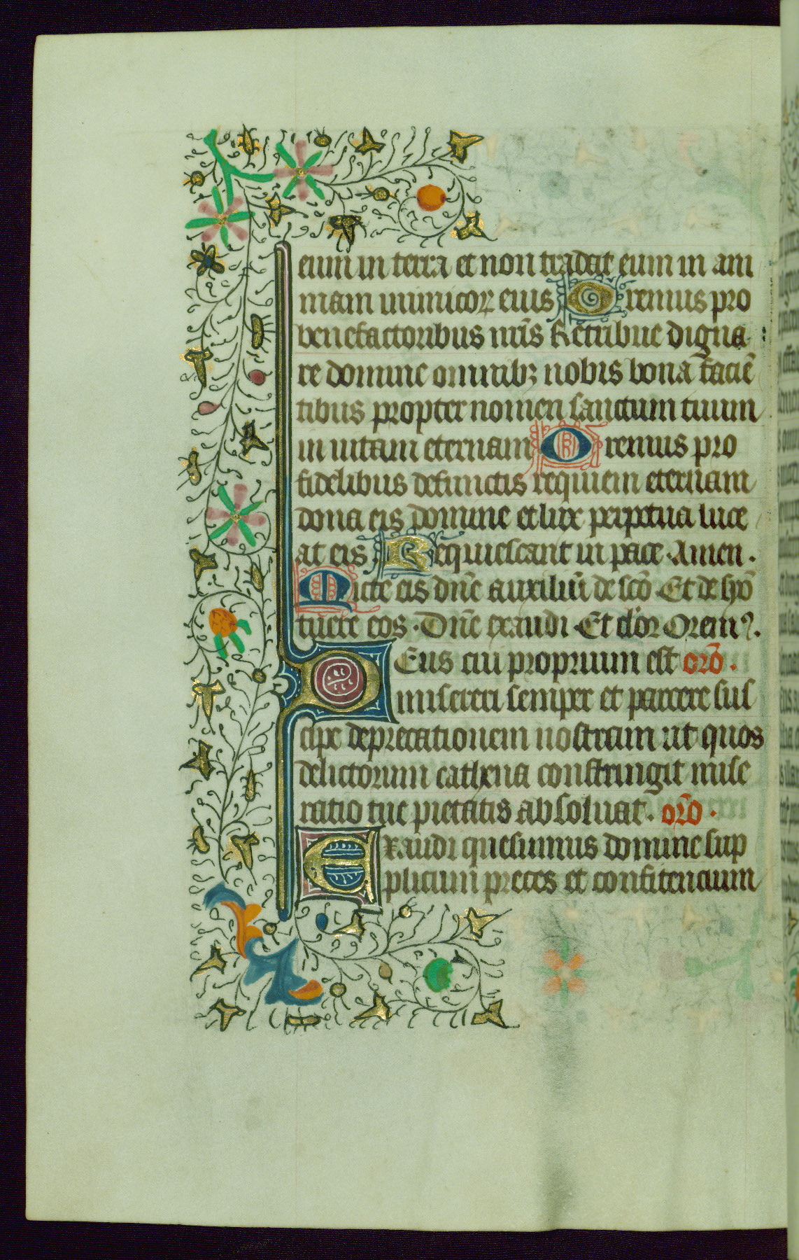Completed ca. 1440-50 and illuminated in the style of the Masters of the Gold Scrolls, this Book of Hours preserves much information about its provenance. The first owner was possibly Barbe de Feuru, whose signature is found on the front pastedown. The book contains the ex libris of Jean of Ricaumez and his wife, Catherine of Barbenchon; their French inscription on the back pastedown promises good wine to the finder of the book if lost. The book was inherited by their son, Christophe of Ricaumez, who likely added several texts illustrated by an Rouennais artist, ca. 1500. Record of the ownership is not evinced in the book again until 1669 when the ex libris of the Count of Hallennes (Allennes family of Tournai?) was added. Alexandre-Constantin-Joseph of Nassau's (1738-1814) armorial shield appears twice, engraved (front pastedown) and painted (front flyleaf i, v).