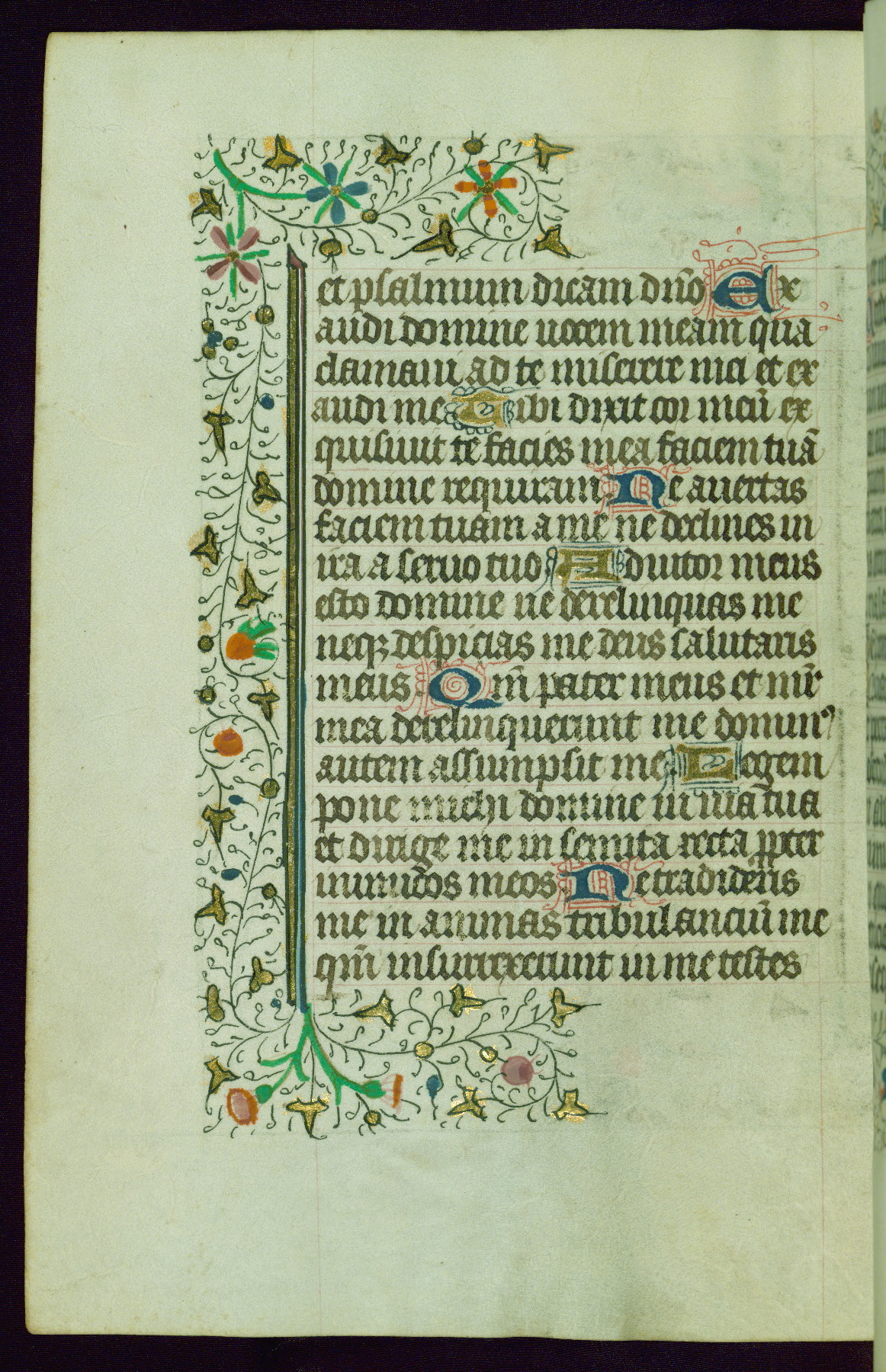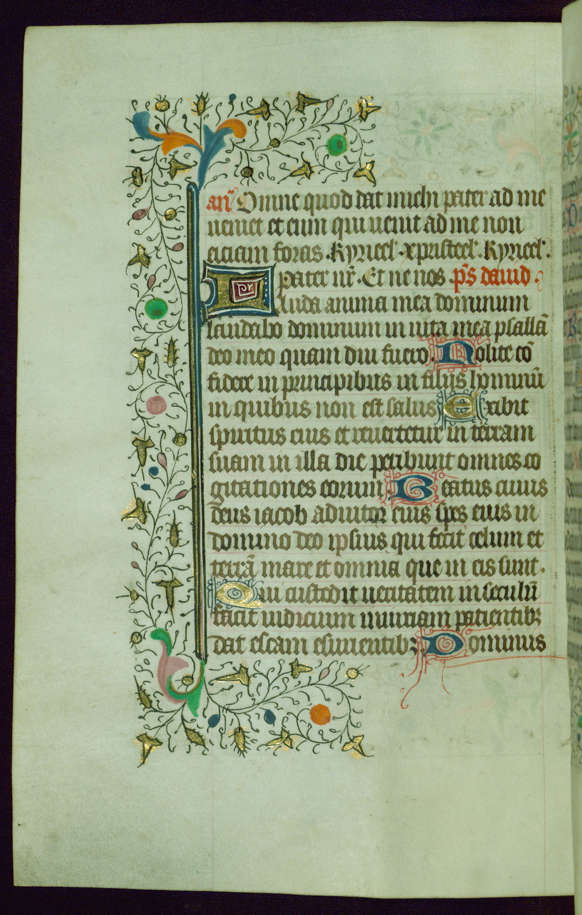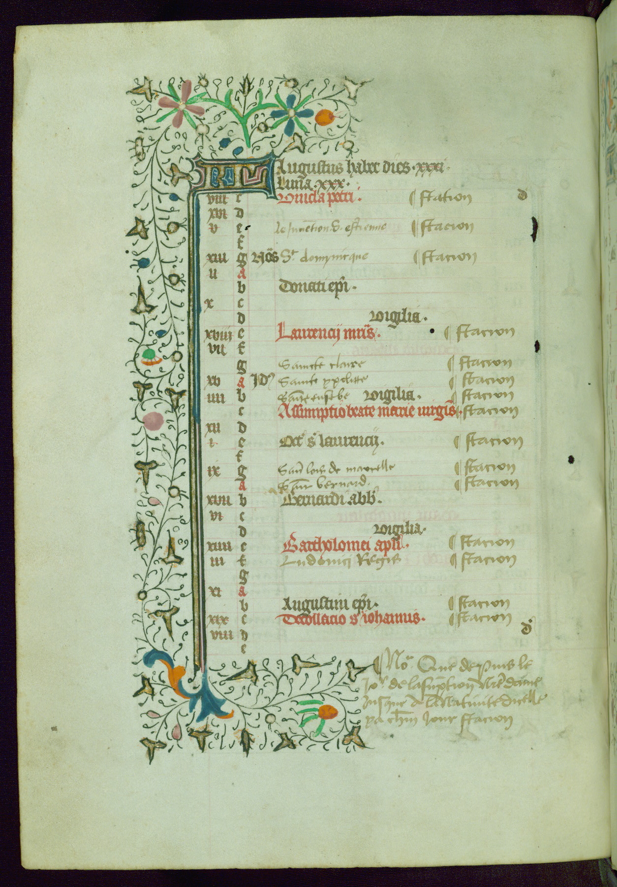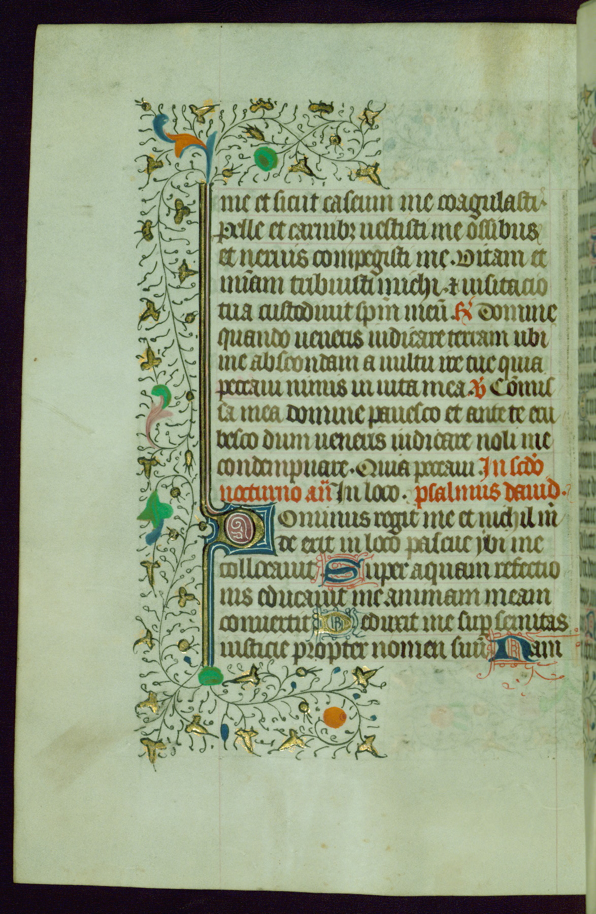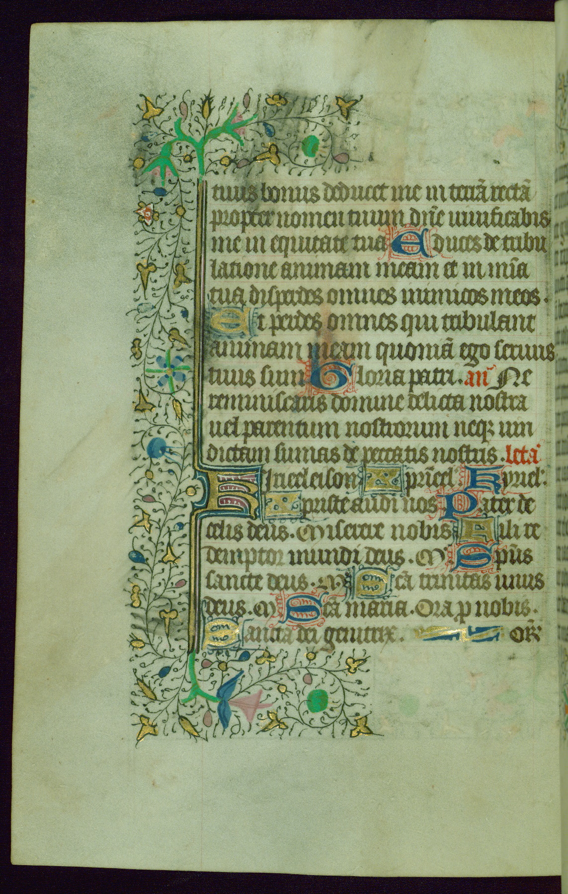 Completed ca. 1440-50 and illuminated in the style of the Masters of the Gold Scrolls, this Book of Hours preserves much information about its provenance. The first owner was possibly Barbe de Feuru, whose signature is found on the front pastedown. The book contains the ex libris of Jean of Ricaumez and his wife, Catherine of Barbenchon; their French inscription on the back pastedown promises good wine to the finder of the book if lost. The book was inherited by their son, Christophe of Ricaumez, who likely added several texts illustrated by an Rouennais artist, ca. 1500. Record of the ownership is not evinced in the book again until 1669 when the ex libris of the Count of Hallennes (Allennes family of Tournai?) was added. Alexandre-Constantin-Joseph of Nassau's (1738-1814) armorial shield appears twice, engraved (front pastedown) and painted (front flyleaf i, v).