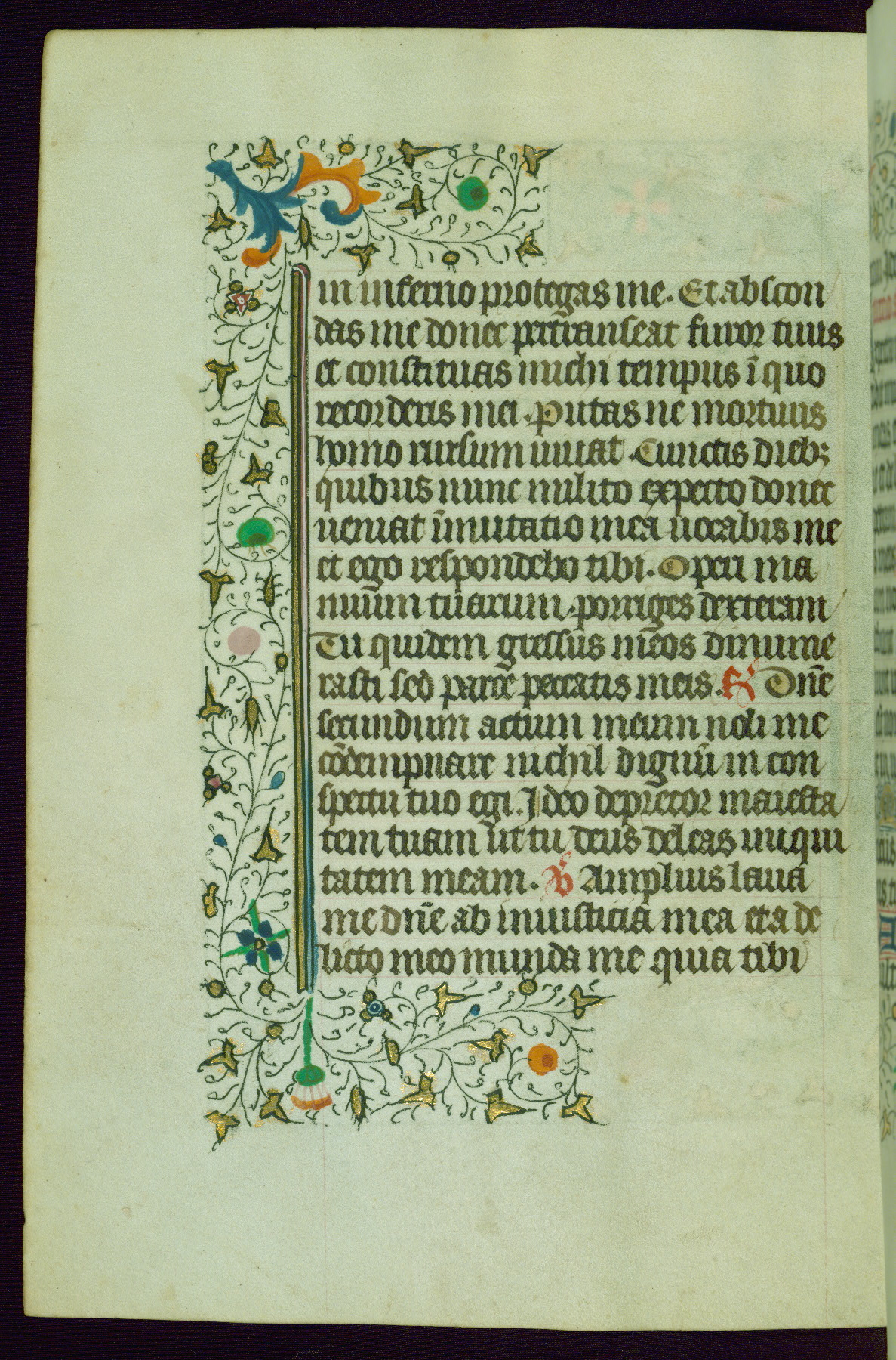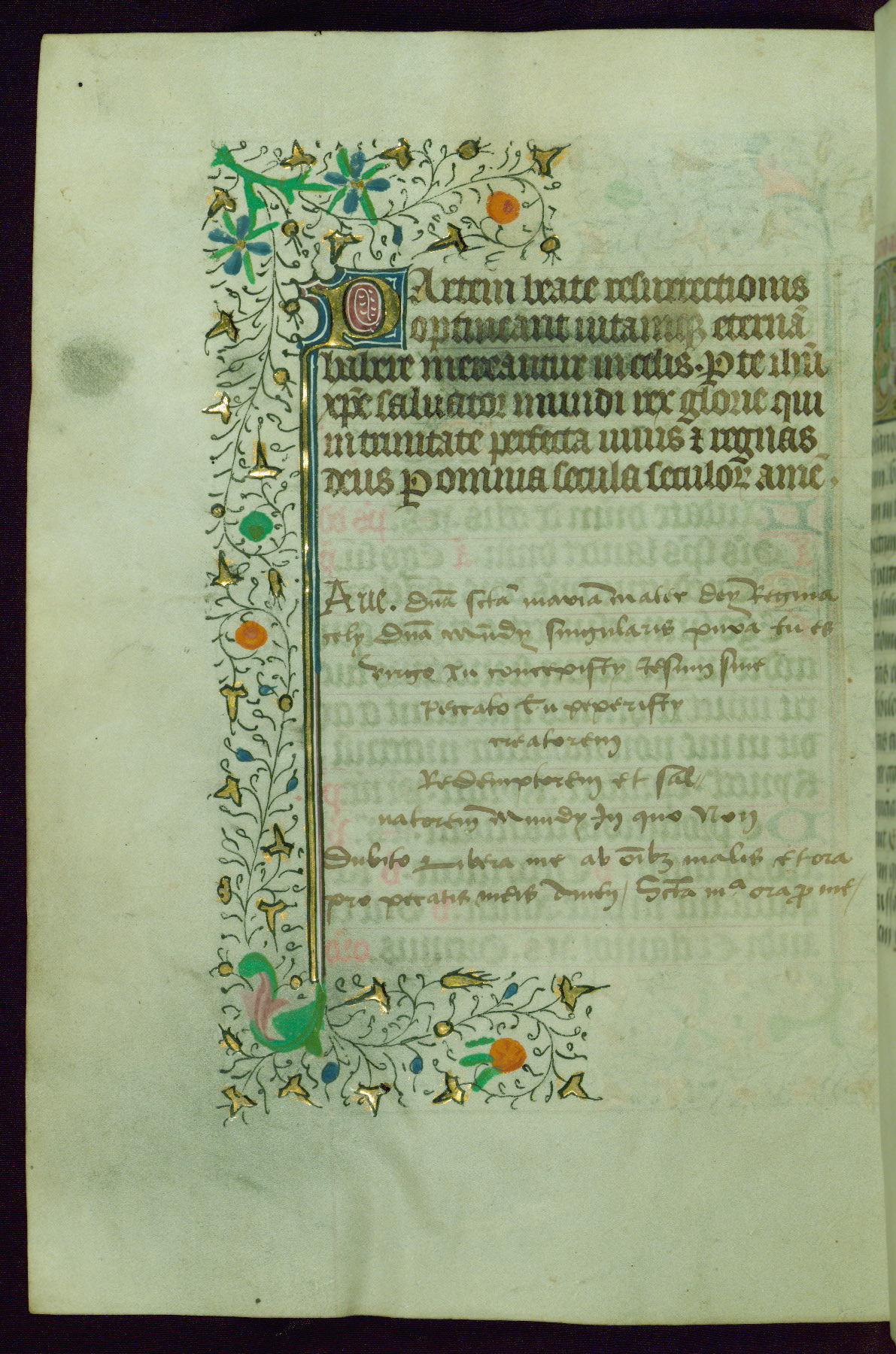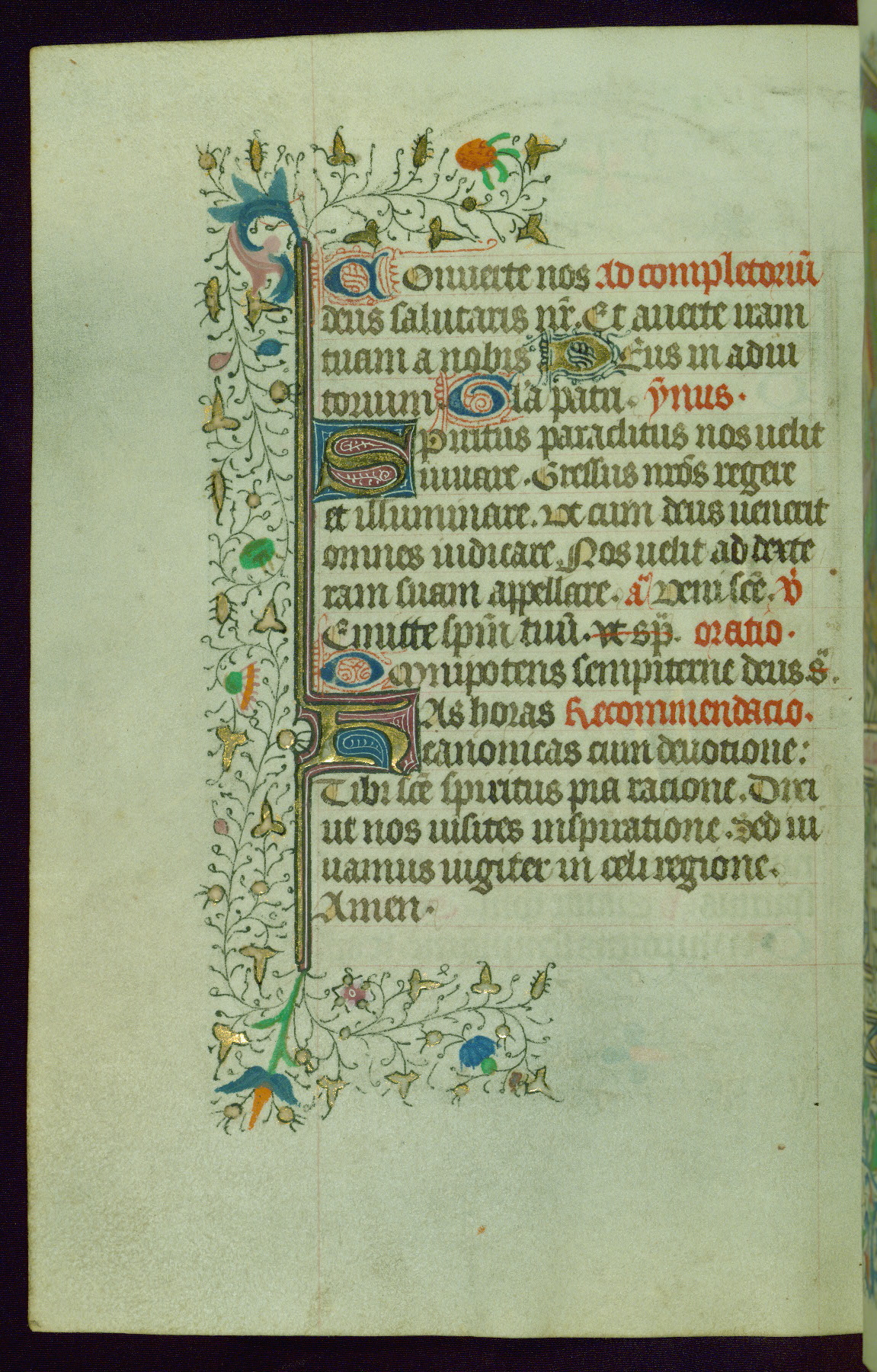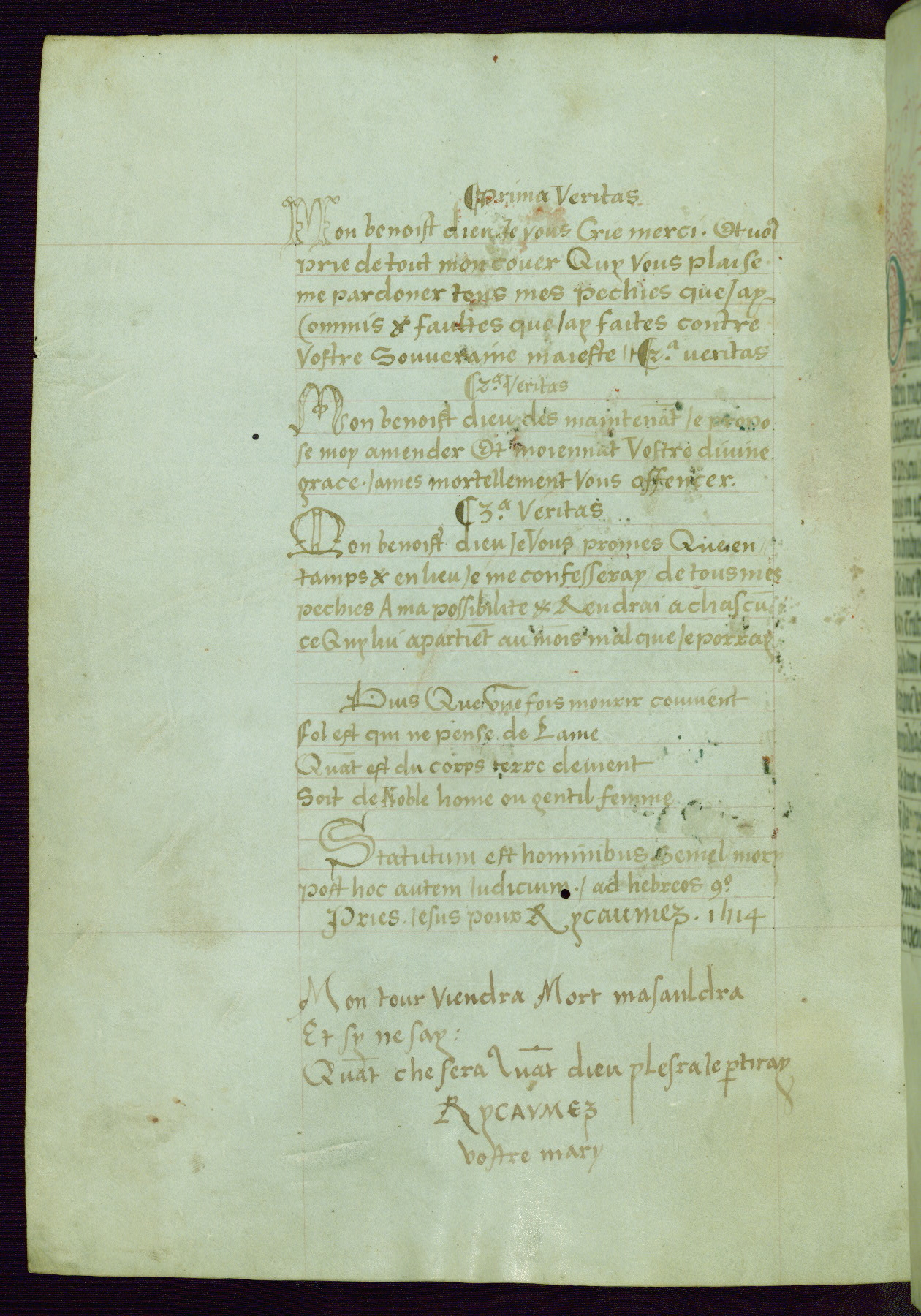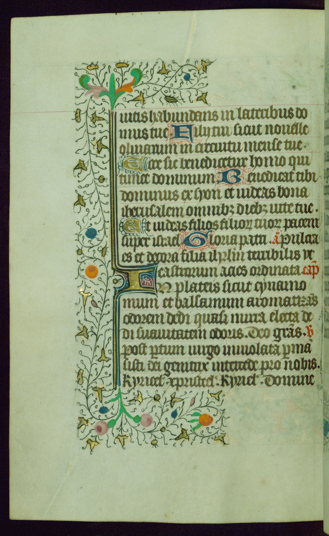 Completed ca. 1440-50 and illuminated in the style of the Masters of the Gold Scrolls, this Book of Hours preserves much information about its provenance. The first owner was possibly Barbe de Feuru, whose signature is found on the front pastedown. The book contains the ex libris of Jean of Ricaumez and his wife, Catherine of Barbenchon; their French inscription on the back pastedown promises good wine to the finder of the book if lost. The book was inherited by their son, Christophe of Ricaumez, who likely added several texts illustrated by an Rouennais artist, ca. 1500. Record of the ownership is not evinced in the book again until 1669 when the ex libris of the Count of Hallennes (Allennes family of Tournai?) was added. Alexandre-Constantin-Joseph of Nassau's (1738-1814) armorial shield appears twice, engraved (front pastedown) and painted (front flyleaf i, v).