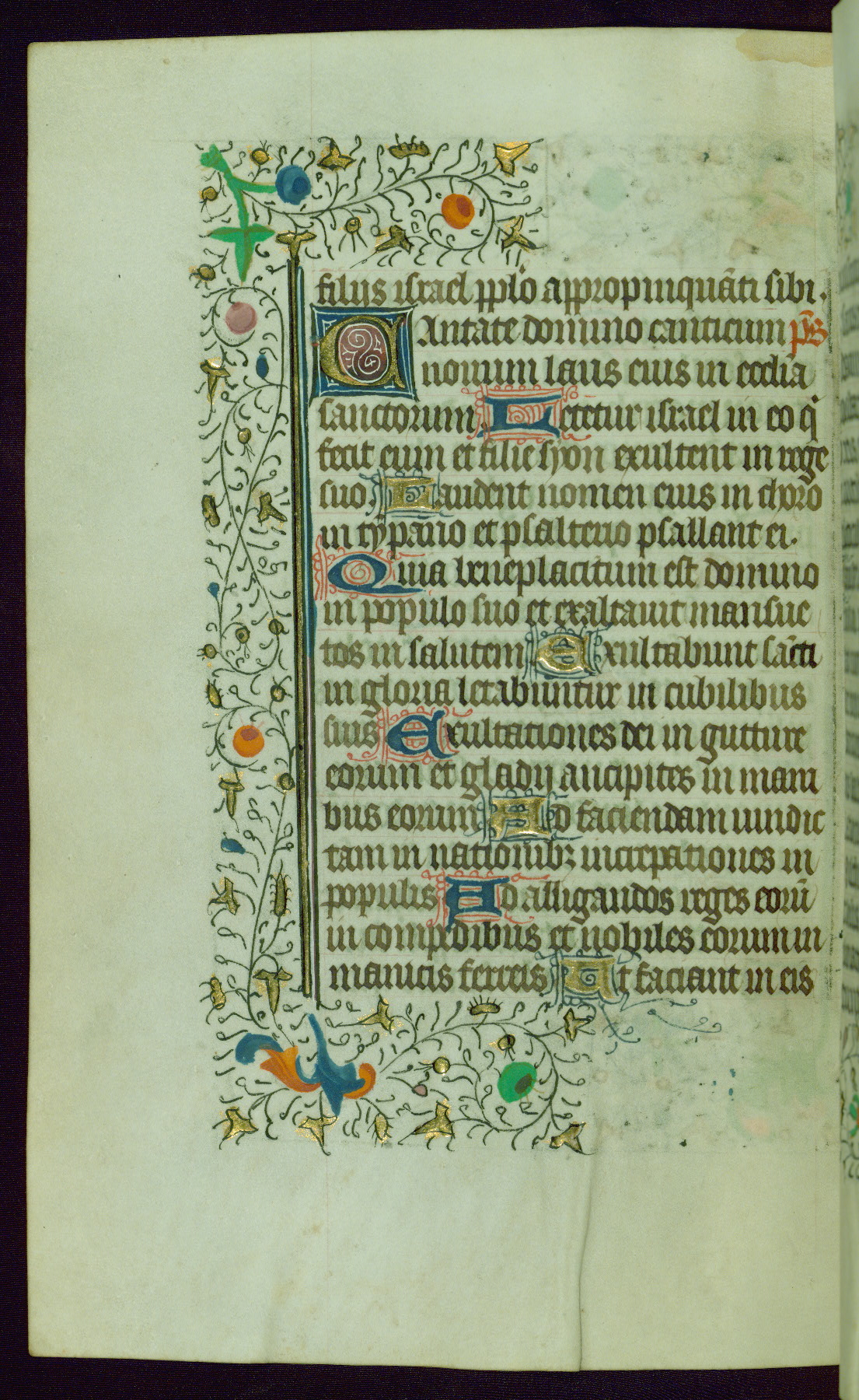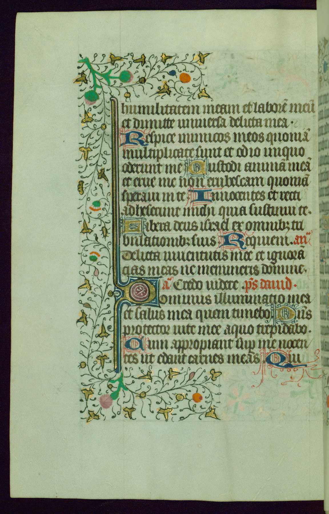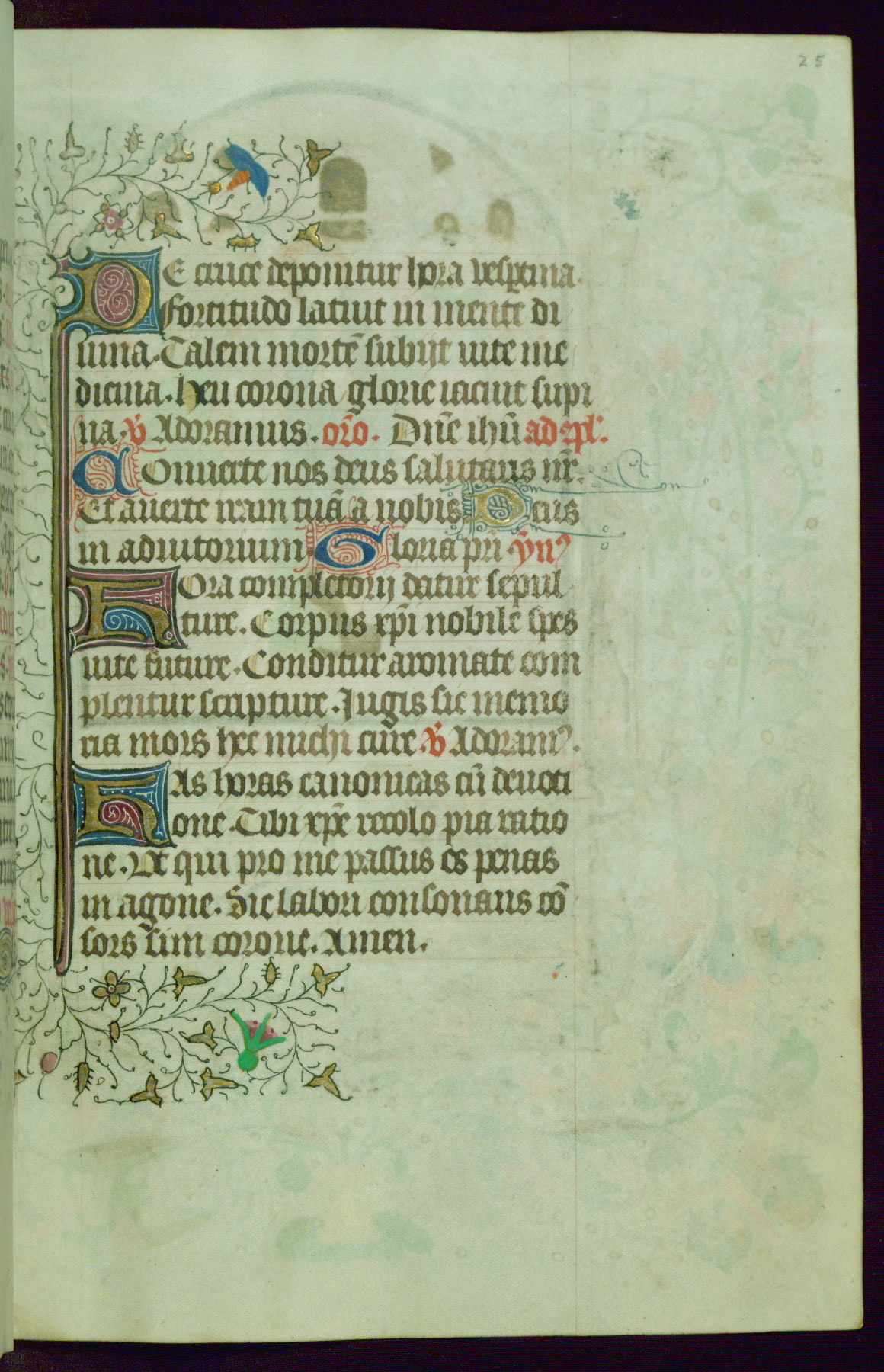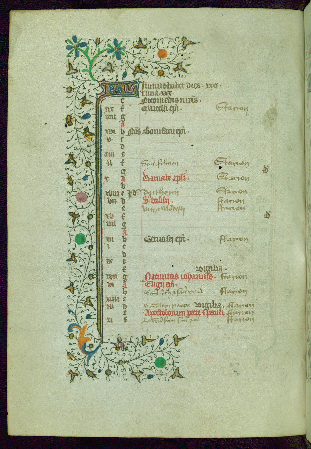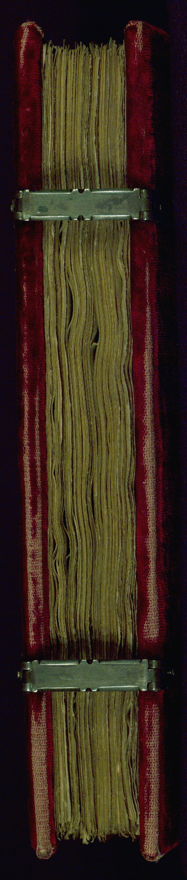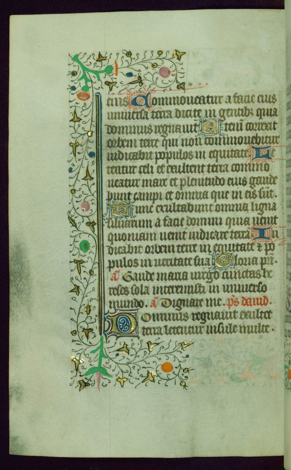 Completed ca. 1440-50 and illuminated in the style of the Masters of the Gold Scrolls, this Book of Hours preserves much information about its provenance. The first owner was possibly Barbe de Feuru, whose signature is found on the front pastedown. The book contains the ex libris of Jean of Ricaumez and his wife, Catherine of Barbenchon; their French inscription on the back pastedown promises good wine to the finder of the book if lost. The book was inherited by their son, Christophe of Ricaumez, who likely added several texts illustrated by an Rouennais artist, ca. 1500. Record of the ownership is not evinced in the book again until 1669 when the ex libris of the Count of Hallennes (Allennes family of Tournai?) was added. Alexandre-Constantin-Joseph of Nassau's (1738-1814) armorial shield appears twice, engraved (front pastedown) and painted (front flyleaf i, v).