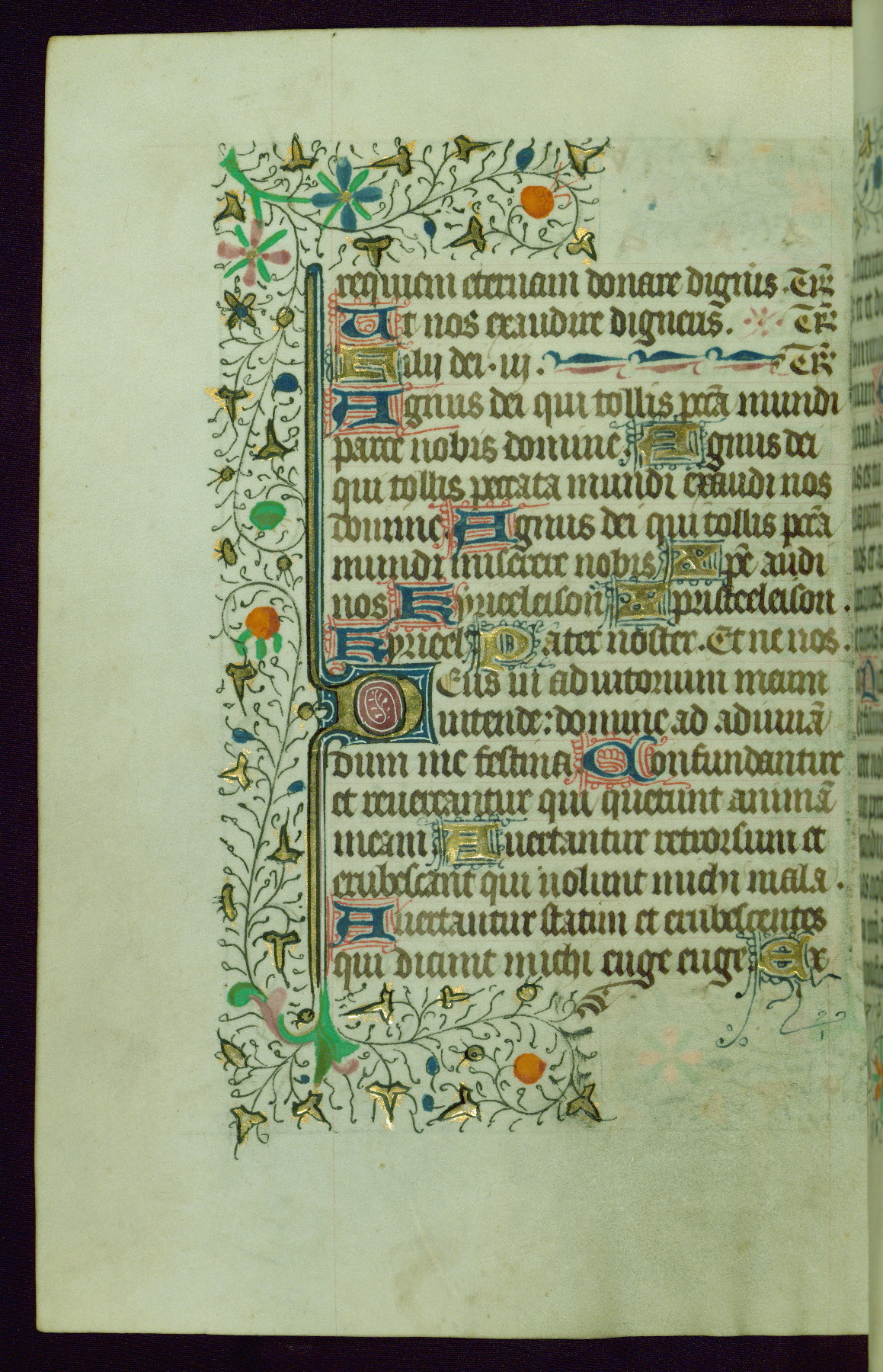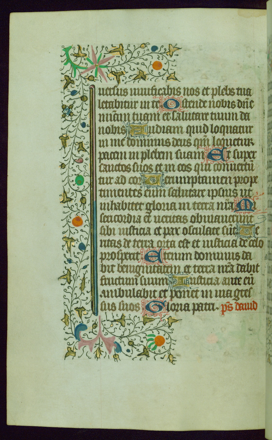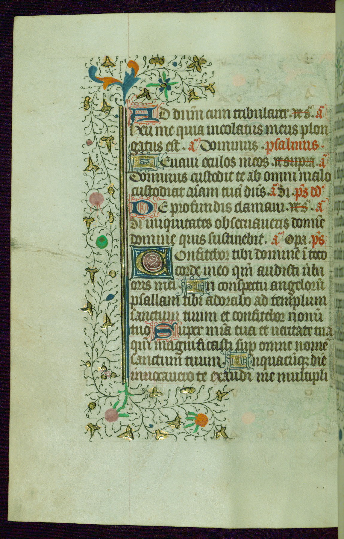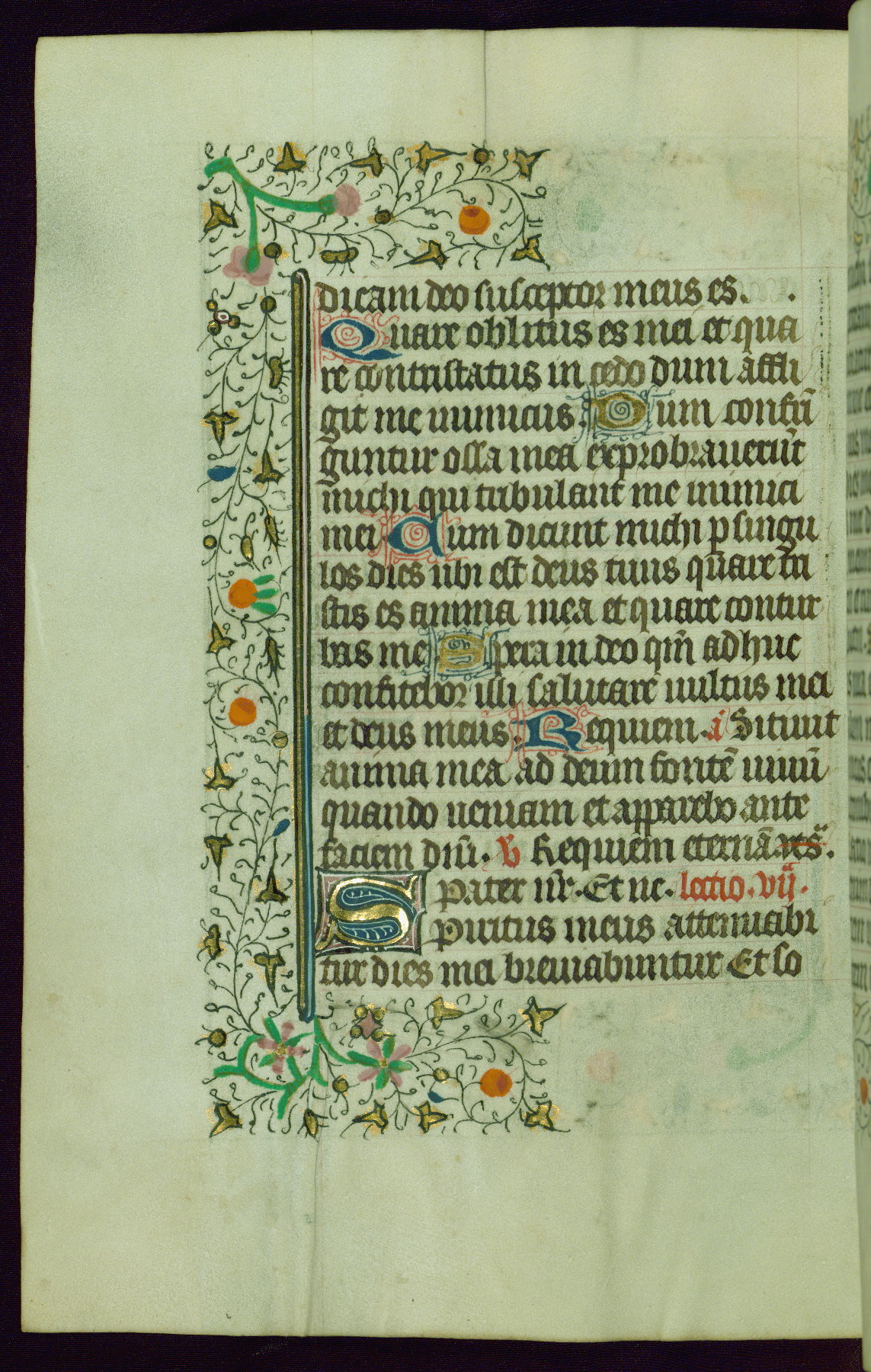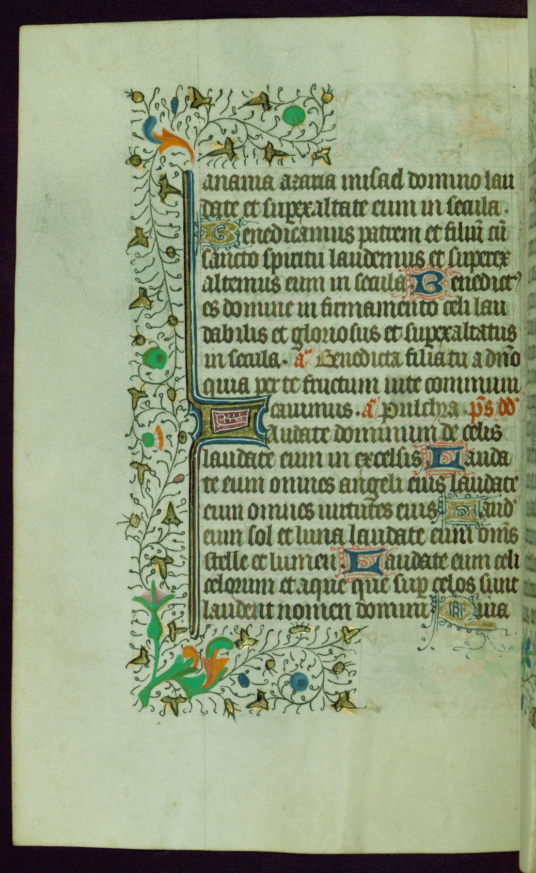 Completed ca. 1440-50 and illuminated in the style of the Masters of the Gold Scrolls, this Book of Hours preserves much information about its provenance. The first owner was possibly Barbe de Feuru, whose signature is found on the front pastedown. The book contains the ex libris of Jean of Ricaumez and his wife, Catherine of Barbenchon; their French inscription on the back pastedown promises good wine to the finder of the book if lost. The book was inherited by their son, Christophe of Ricaumez, who likely added several texts illustrated by an Rouennais artist, ca. 1500. Record of the ownership is not evinced in the book again until 1669 when the ex libris of the Count of Hallennes (Allennes family of Tournai?) was added. Alexandre-Constantin-Joseph of Nassau's (1738-1814) armorial shield appears twice, engraved (front pastedown) and painted (front flyleaf i, v).