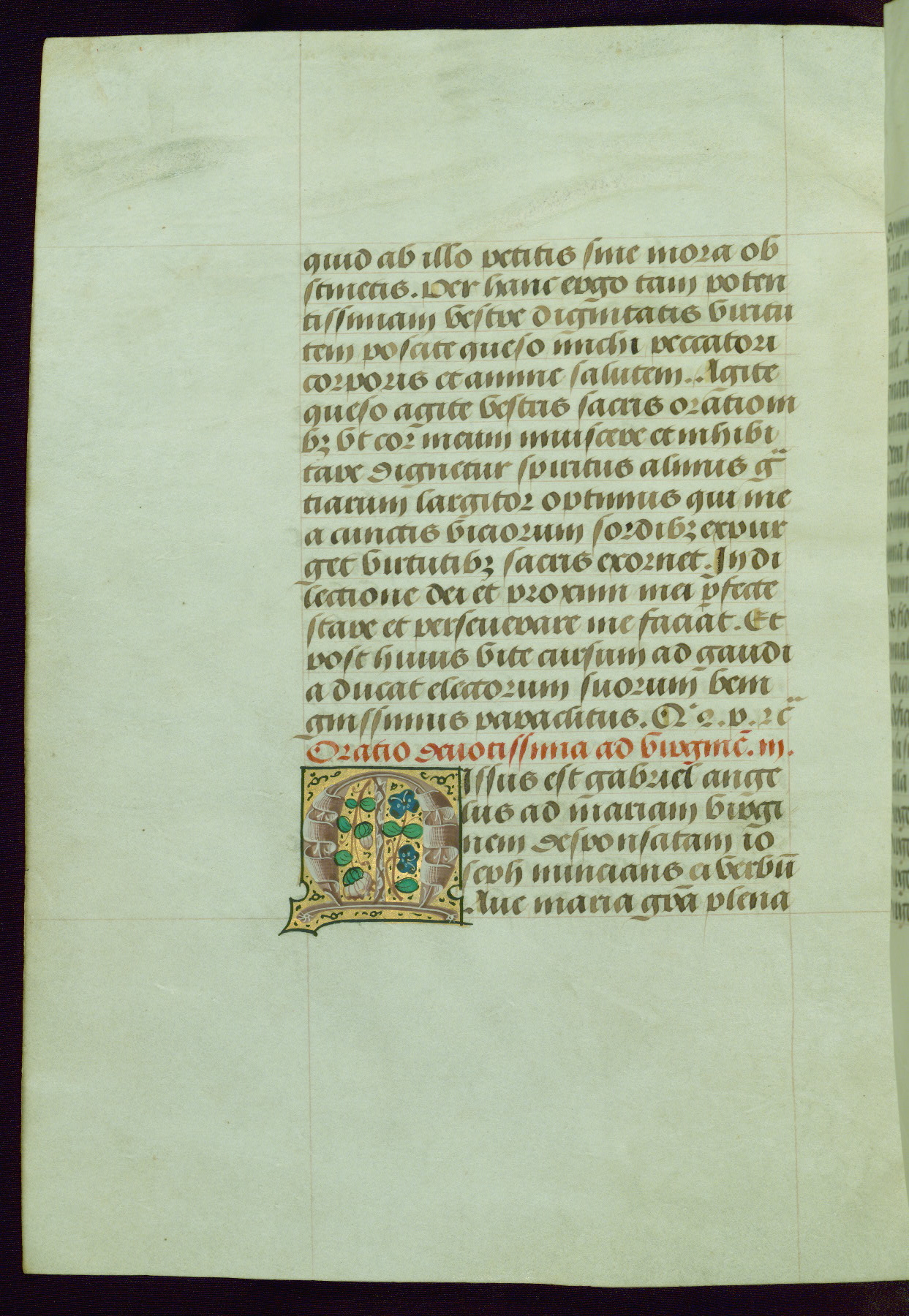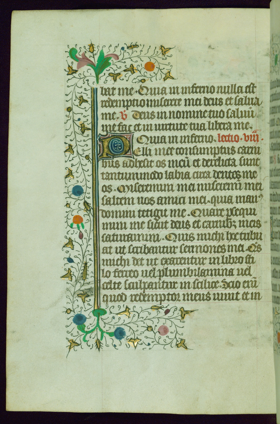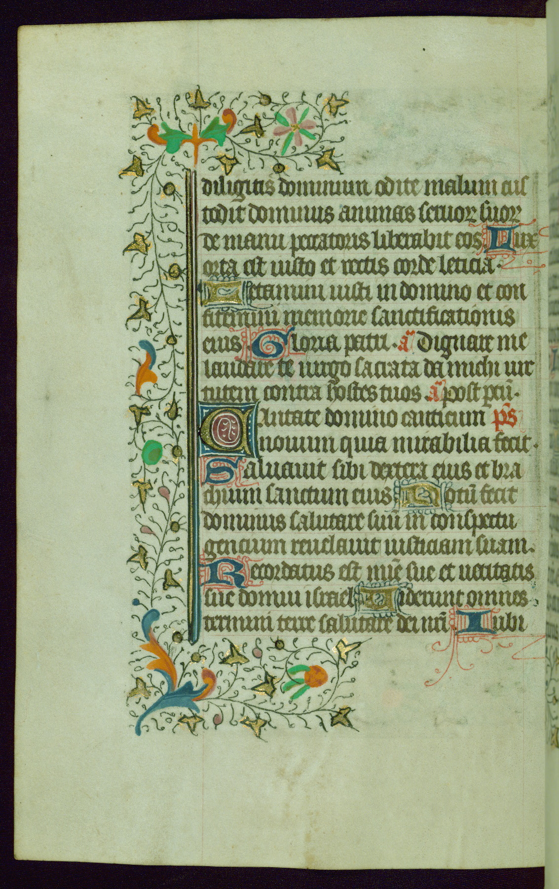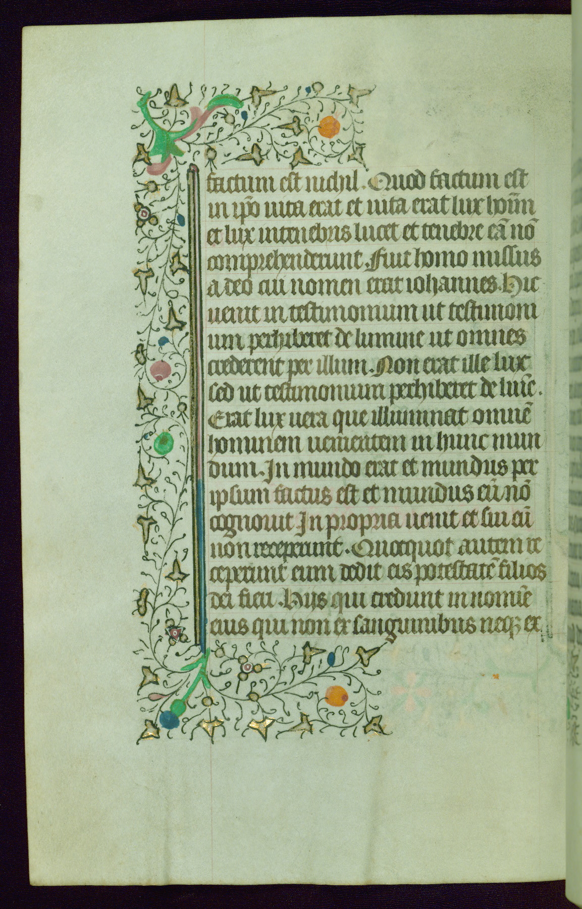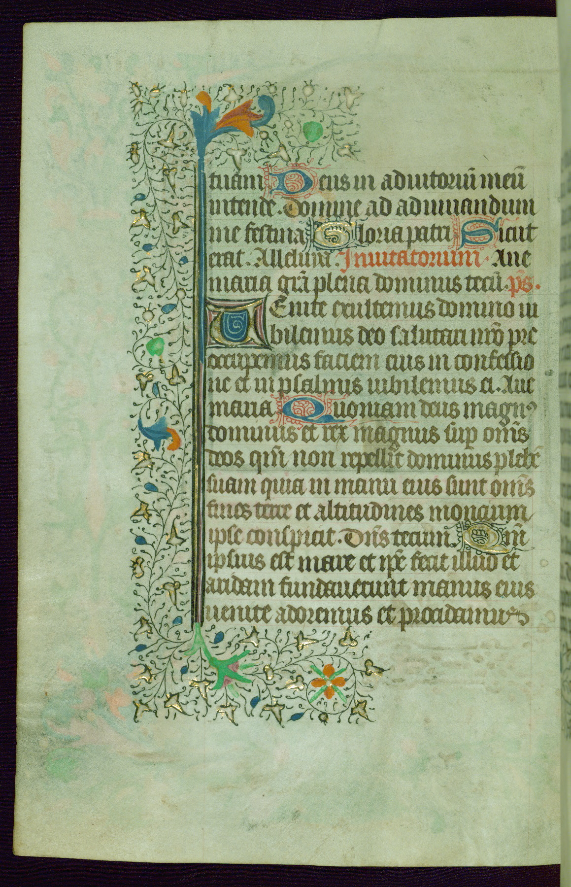 Completed ca. 1440-50 and illuminated in the style of the Masters of the Gold Scrolls, this Book of Hours preserves much information about its provenance. The first owner was possibly Barbe de Feuru, whose signature is found on the front pastedown. The book contains the ex libris of Jean of Ricaumez and his wife, Catherine of Barbenchon; their French inscription on the back pastedown promises good wine to the finder of the book if lost. The book was inherited by their son, Christophe of Ricaumez, who likely added several texts illustrated by an Rouennais artist, ca. 1500. Record of the ownership is not evinced in the book again until 1669 when the ex libris of the Count of Hallennes (Allennes family of Tournai?) was added. Alexandre-Constantin-Joseph of Nassau's (1738-1814) armorial shield appears twice, engraved (front pastedown) and painted (front flyleaf i, v).