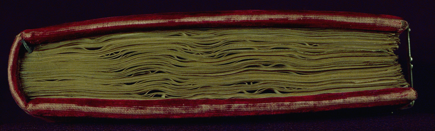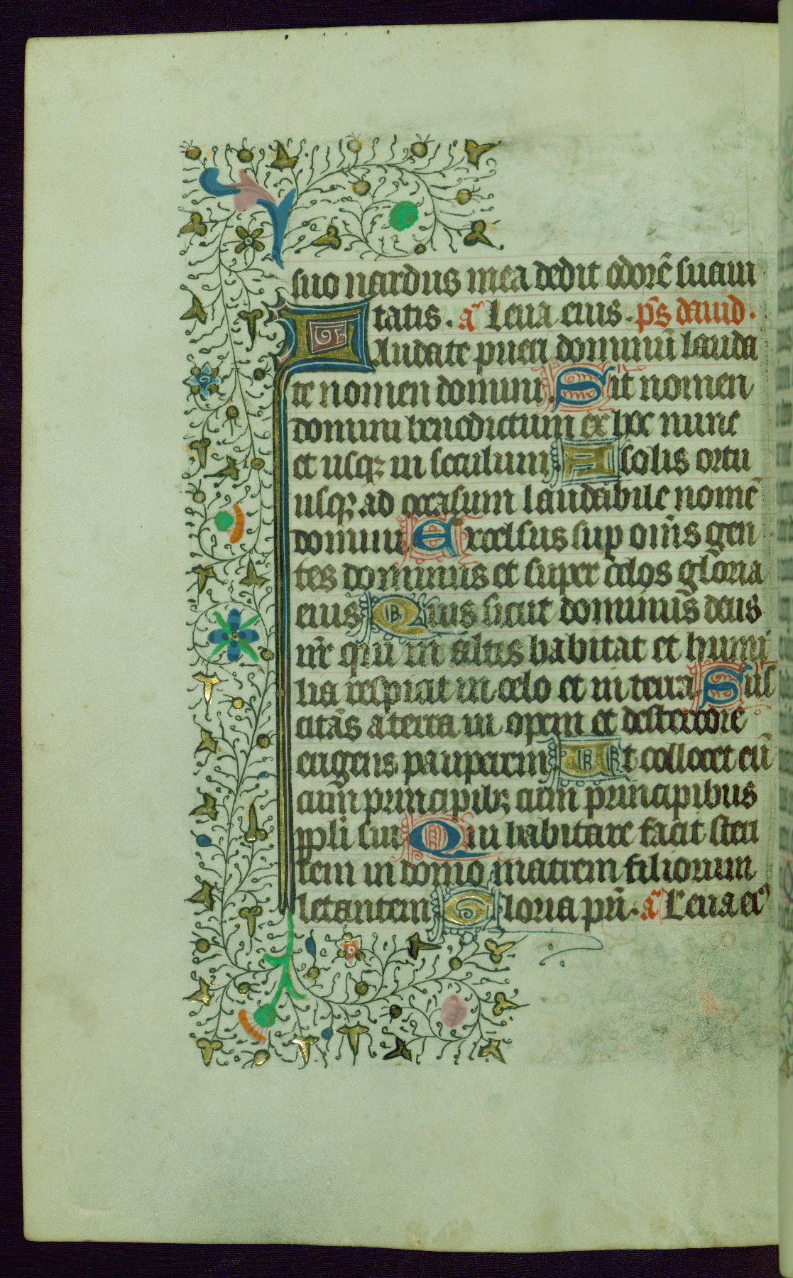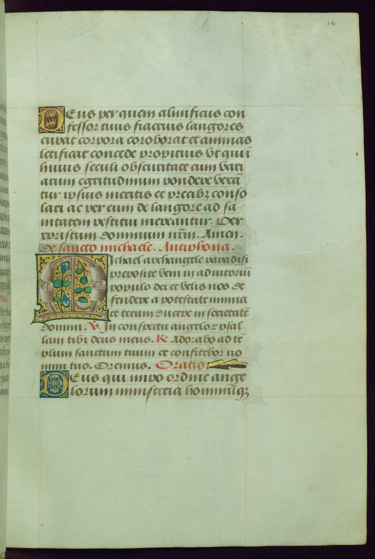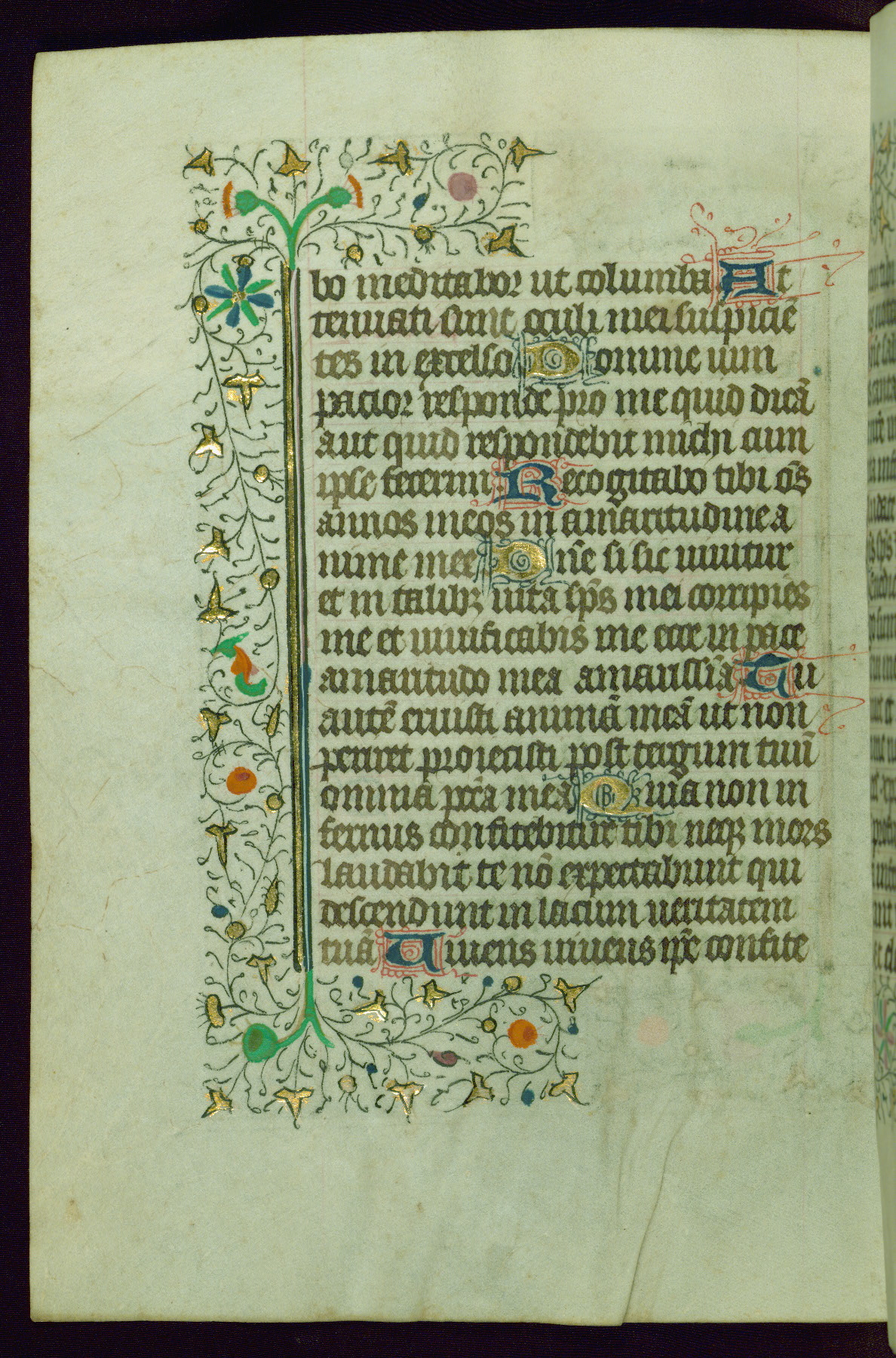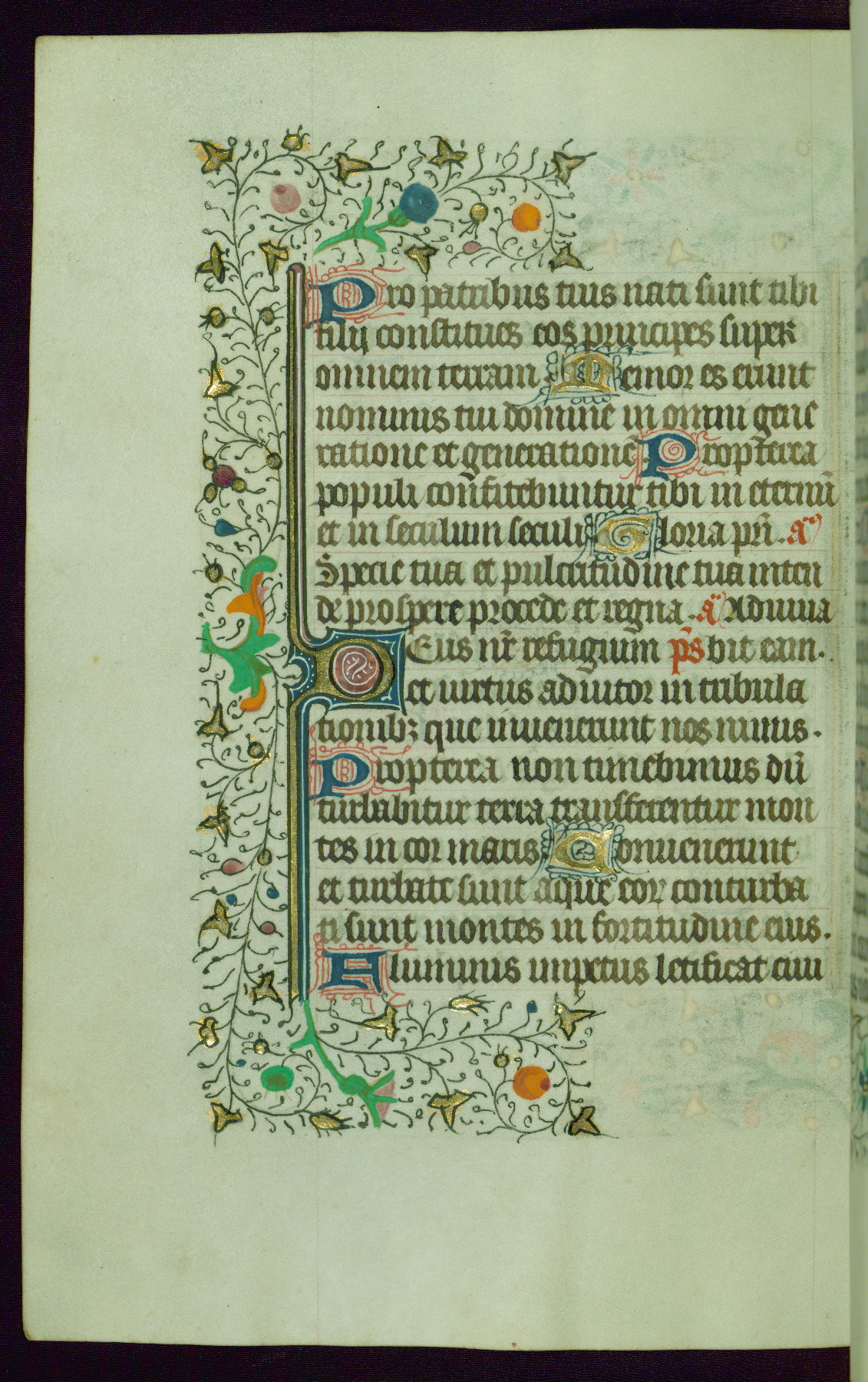 Completed ca. 1440-50 and illuminated in the style of the Masters of the Gold Scrolls, this Book of Hours preserves much information about its provenance. The first owner was possibly Barbe de Feuru, whose signature is found on the front pastedown. The book contains the ex libris of Jean of Ricaumez and his wife, Catherine of Barbenchon; their French inscription on the back pastedown promises good wine to the finder of the book if lost. The book was inherited by their son, Christophe of Ricaumez, who likely added several texts illustrated by an Rouennais artist, ca. 1500. Record of the ownership is not evinced in the book again until 1669 when the ex libris of the Count of Hallennes (Allennes family of Tournai?) was added. Alexandre-Constantin-Joseph of Nassau's (1738-1814) armorial shield appears twice, engraved (front pastedown) and painted (front flyleaf i, v).
