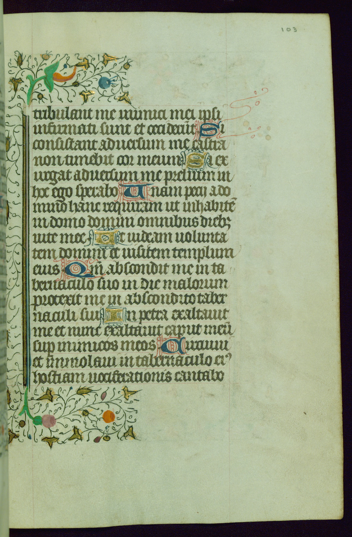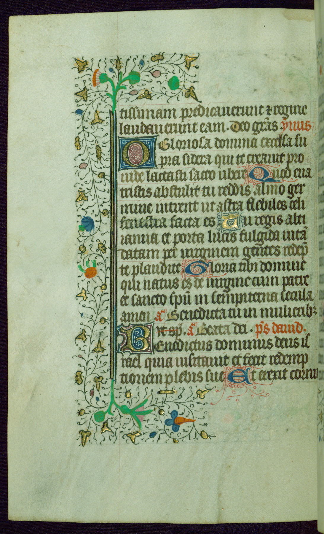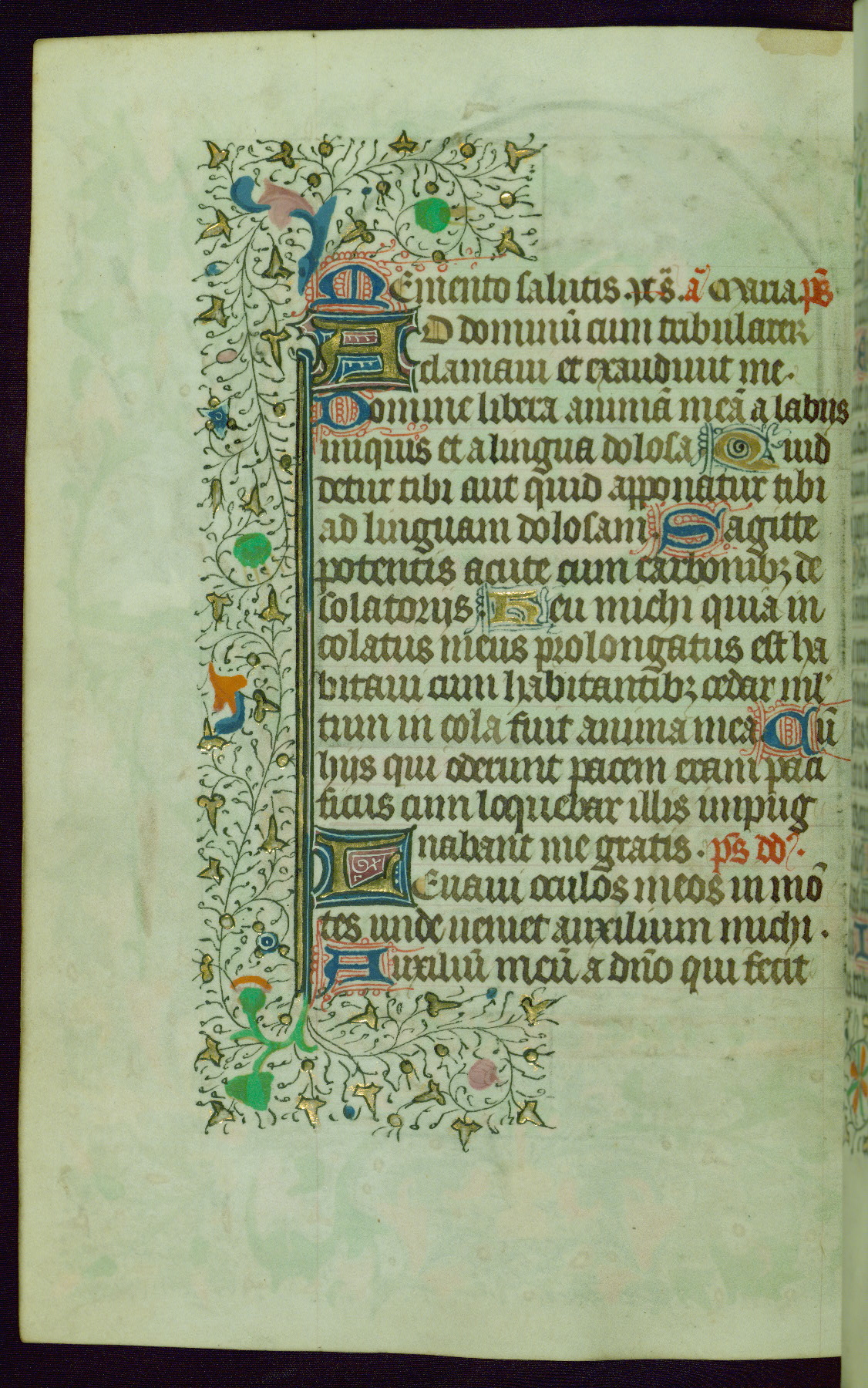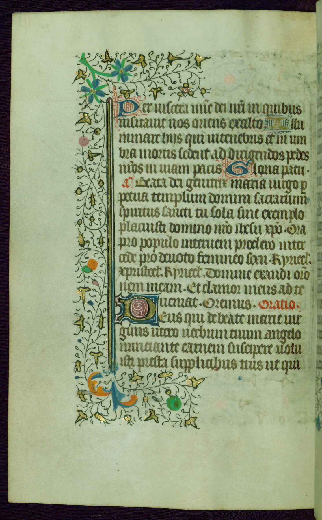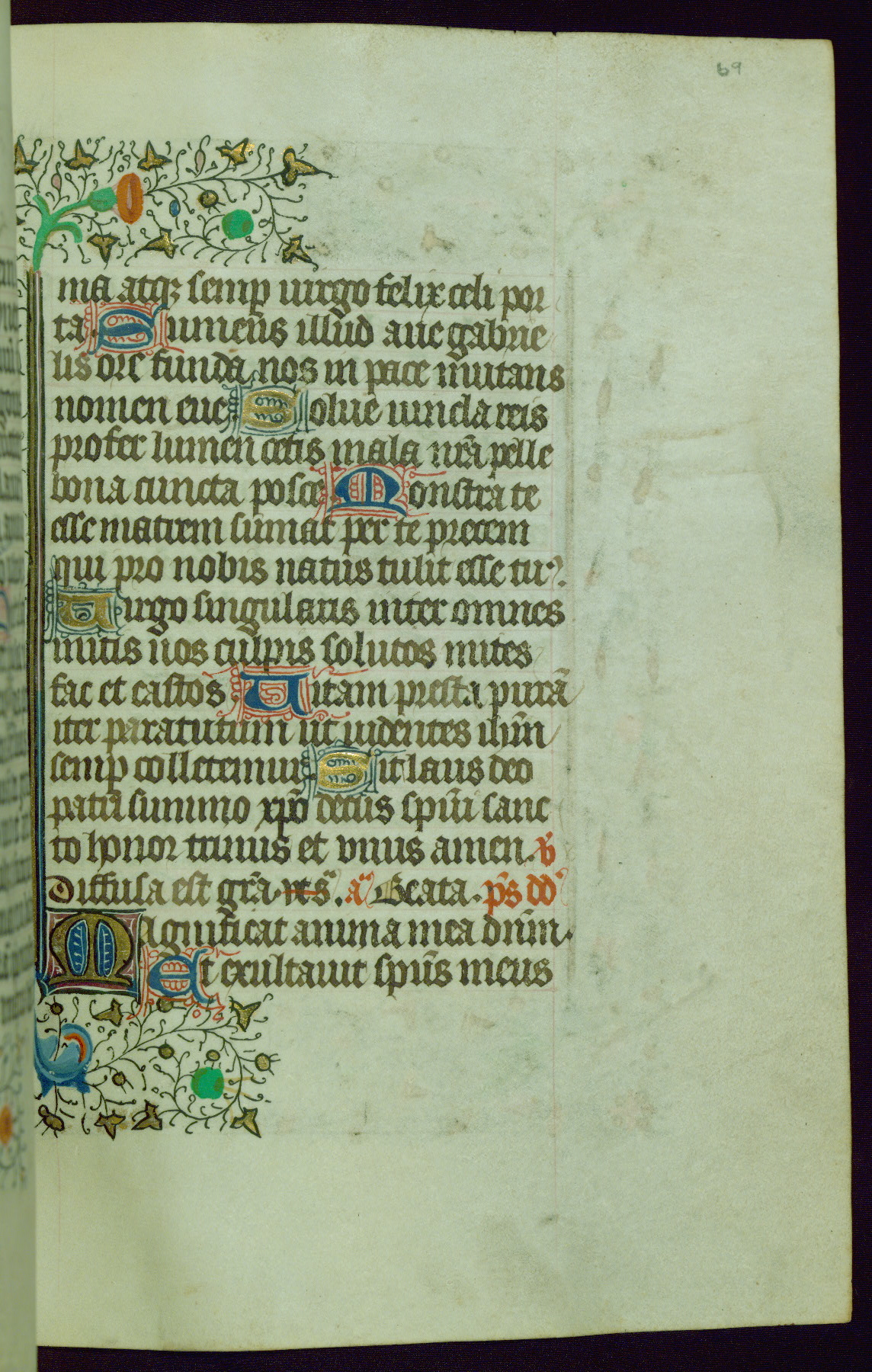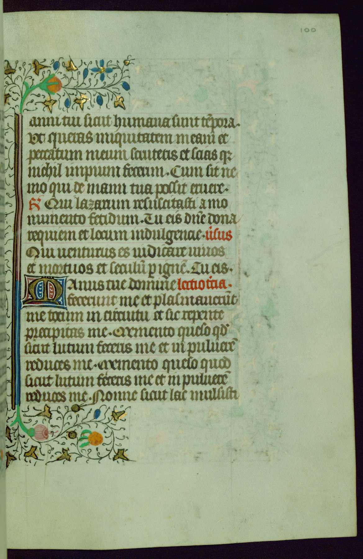 Completed ca. 1440-50 and illuminated in the style of the Masters of the Gold Scrolls, this Book of Hours preserves much information about its provenance. The first owner was possibly Barbe de Feuru, whose signature is found on the front pastedown. The book contains the ex libris of Jean of Ricaumez and his wife, Catherine of Barbenchon; their French inscription on the back pastedown promises good wine to the finder of the book if lost. The book was inherited by their son, Christophe of Ricaumez, who likely added several texts illustrated by an Rouennais artist, ca. 1500. Record of the ownership is not evinced in the book again until 1669 when the ex libris of the Count of Hallennes (Allennes family of Tournai?) was added. Alexandre-Constantin-Joseph of Nassau's (1738-1814) armorial shield appears twice, engraved (front pastedown) and painted (front flyleaf i, v).