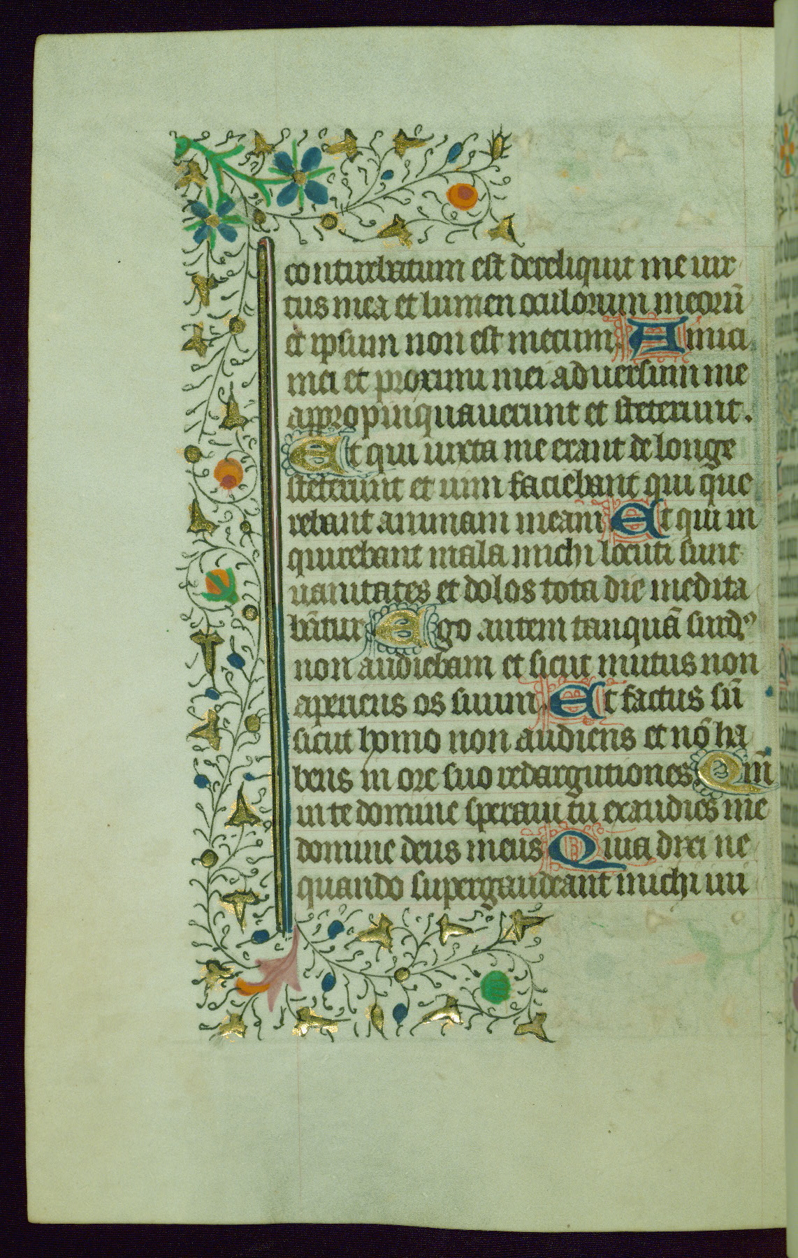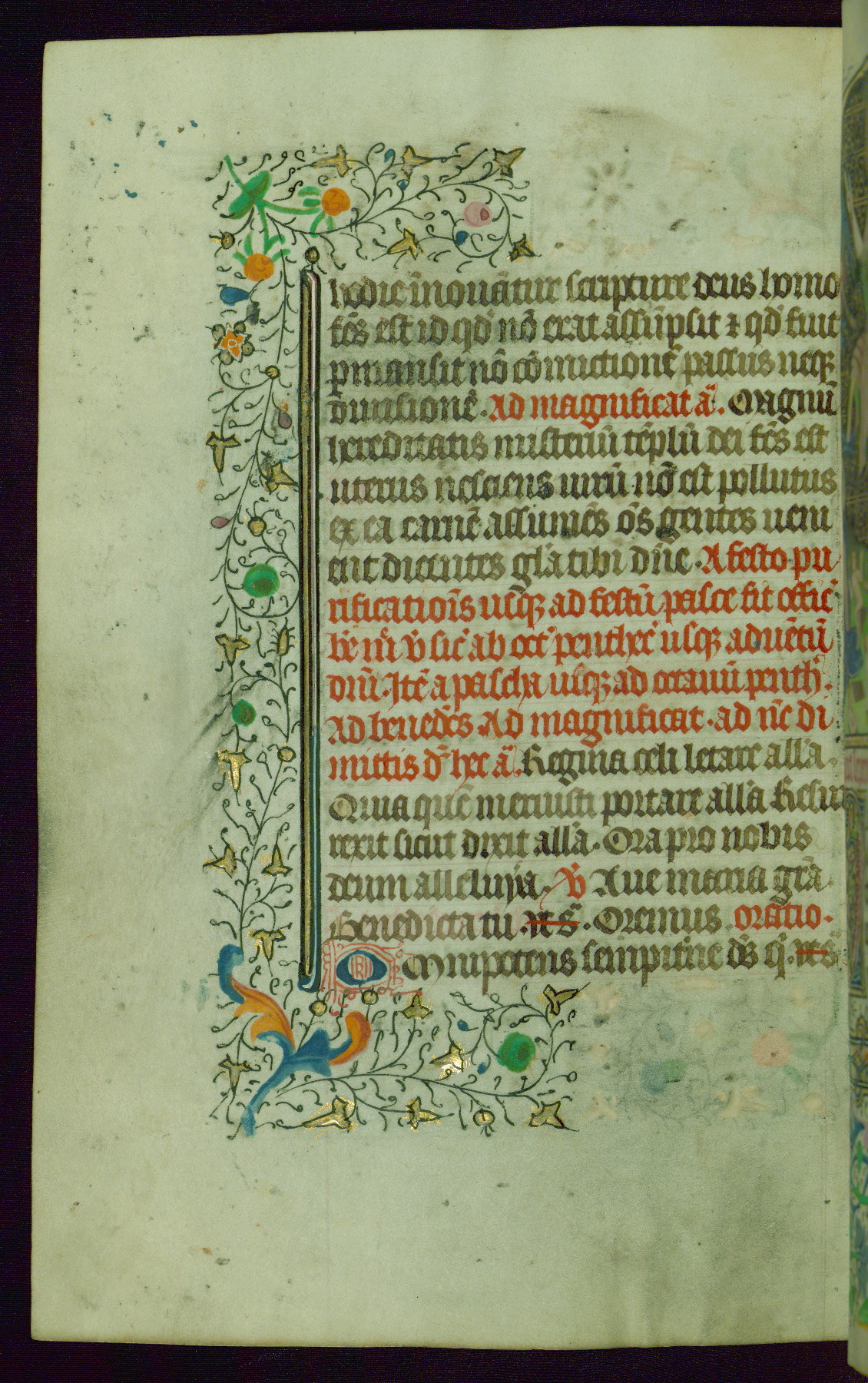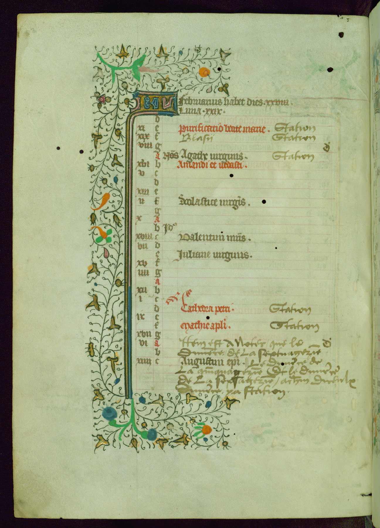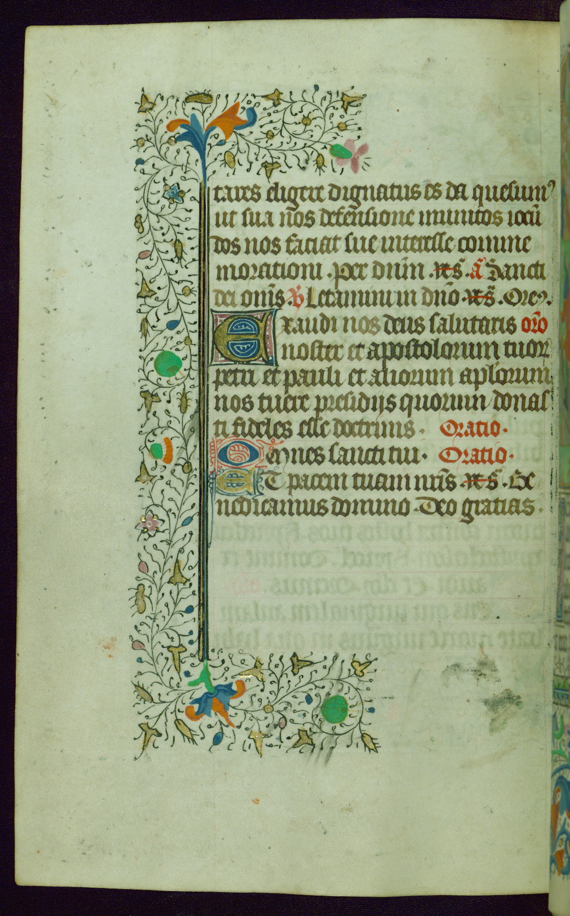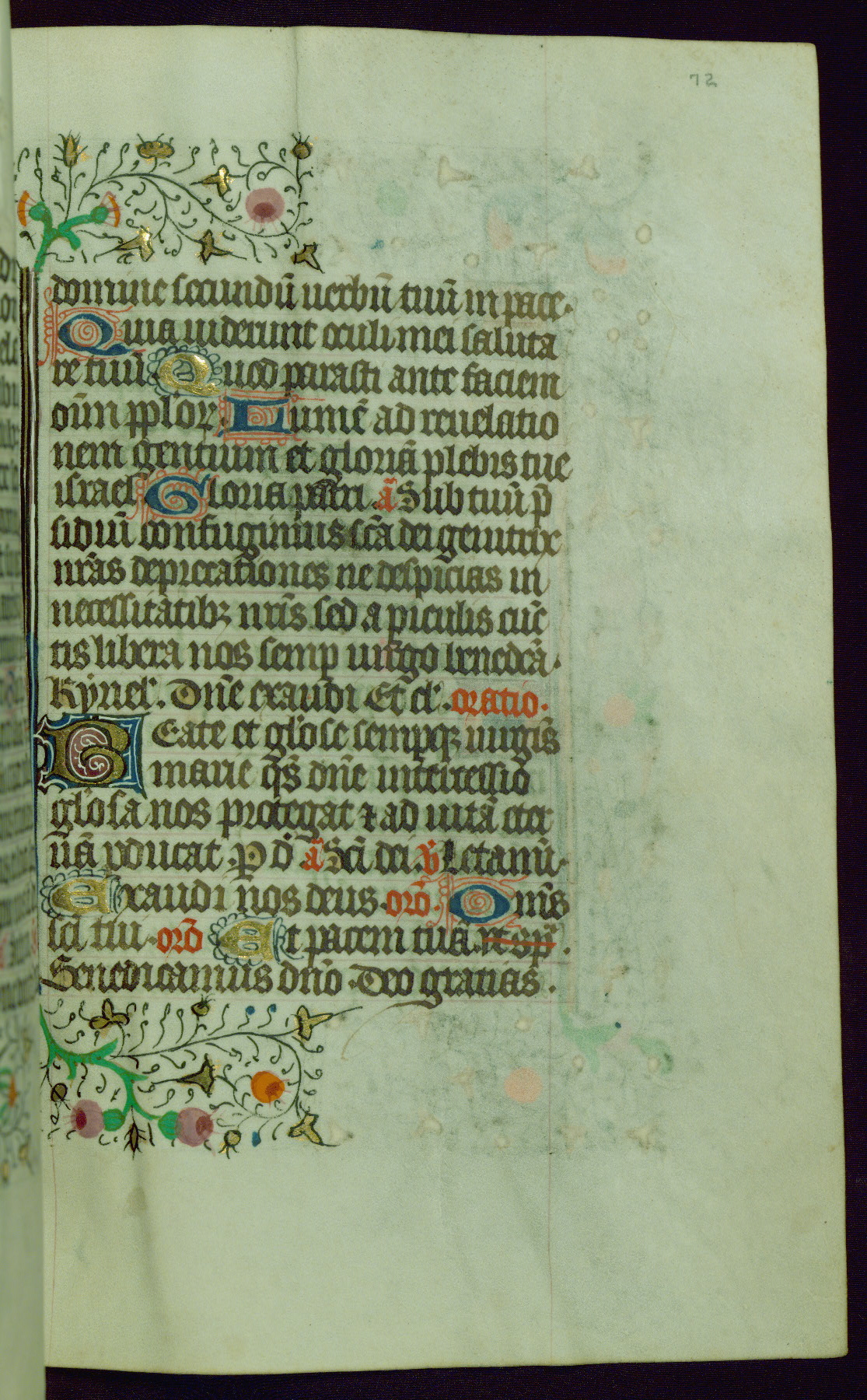 Completed ca. 1440-50 and illuminated in the style of the Masters of the Gold Scrolls, this Book of Hours preserves much information about its provenance. The first owner was possibly Barbe de Feuru, whose signature is found on the front pastedown. The book contains the ex libris of Jean of Ricaumez and his wife, Catherine of Barbenchon; their French inscription on the back pastedown promises good wine to the finder of the book if lost. The book was inherited by their son, Christophe of Ricaumez, who likely added several texts illustrated by an Rouennais artist, ca. 1500. Record of the ownership is not evinced in the book again until 1669 when the ex libris of the Count of Hallennes (Allennes family of Tournai?) was added. Alexandre-Constantin-Joseph of Nassau's (1738-1814) armorial shield appears twice, engraved (front pastedown) and painted (front flyleaf i, v).