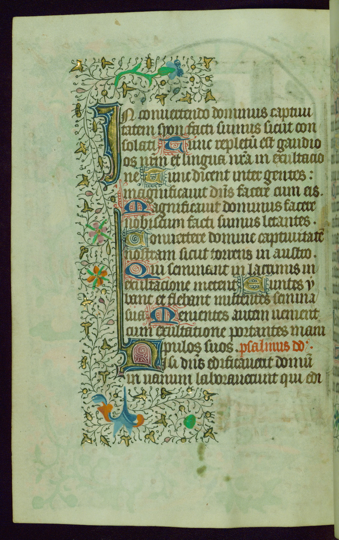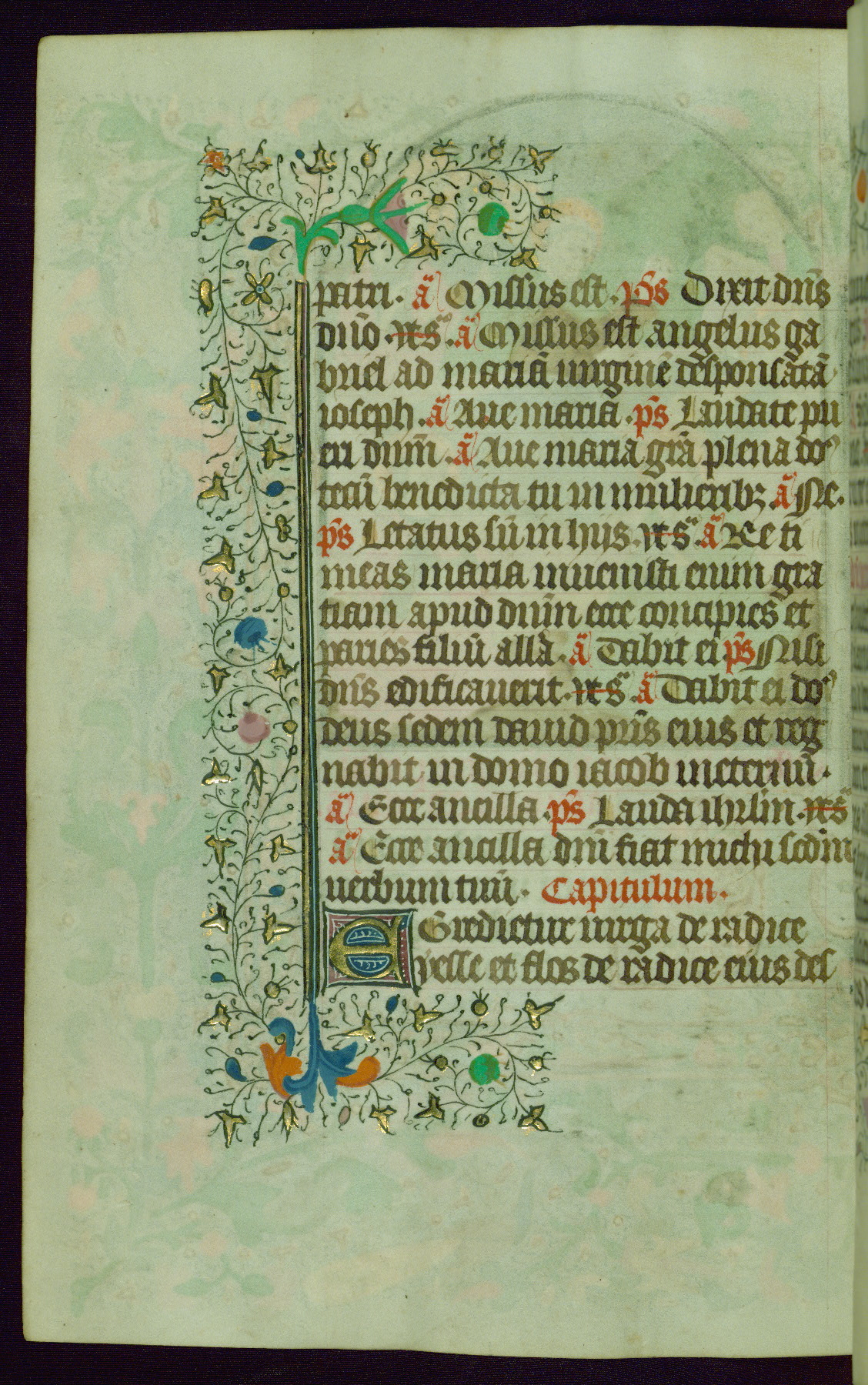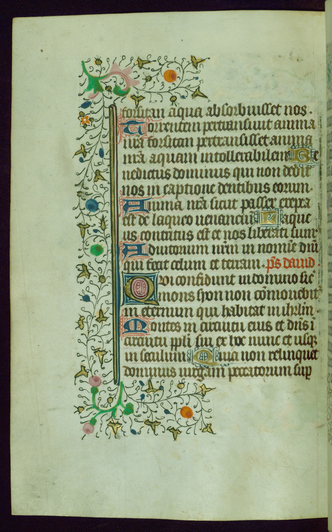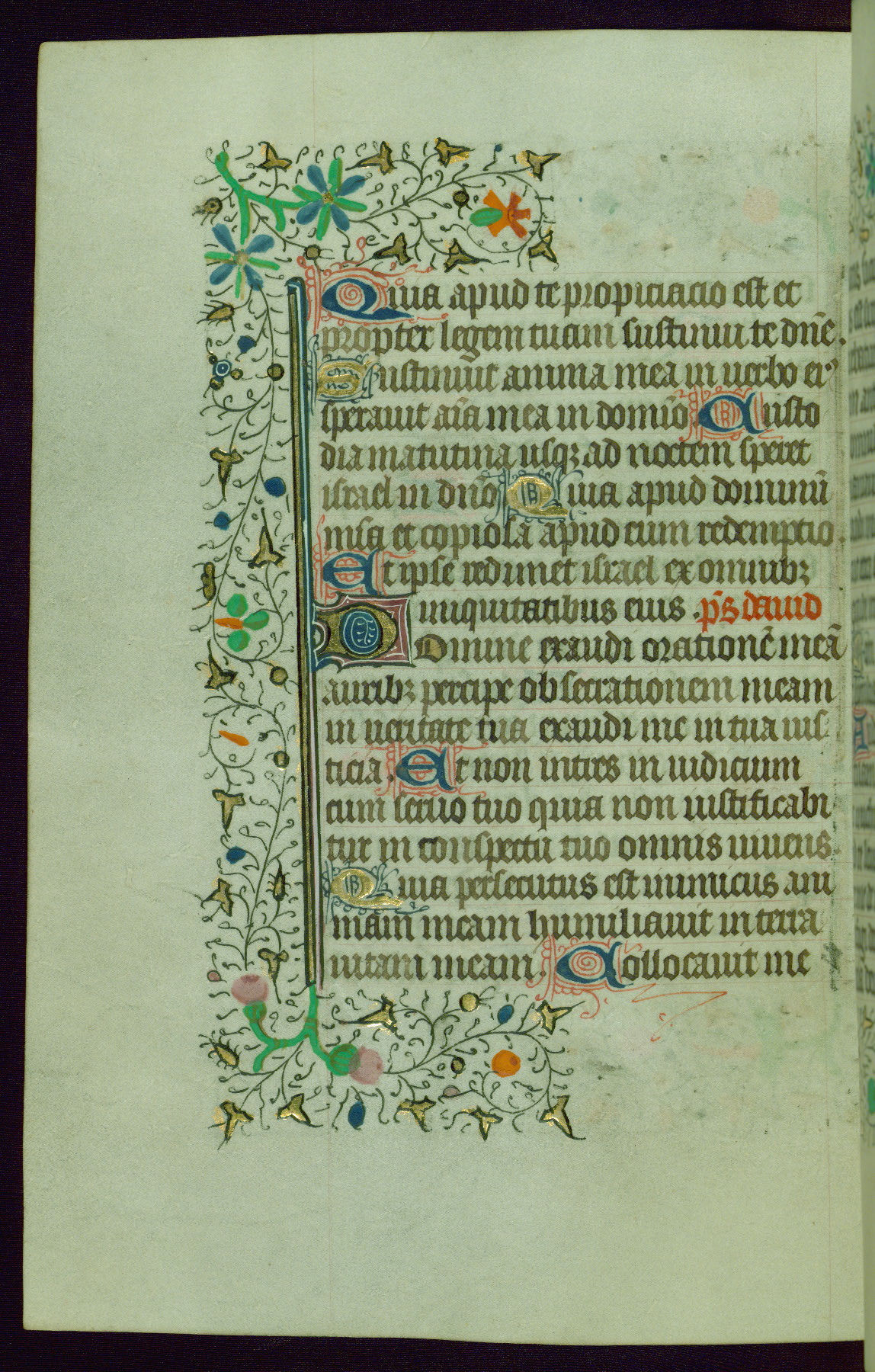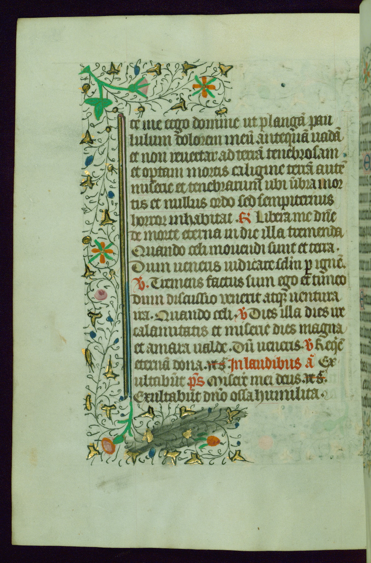 Completed ca. 1440-50 and illuminated in the style of the Masters of the Gold Scrolls, this Book of Hours preserves much information about its provenance. The first owner was possibly Barbe de Feuru, whose signature is found on the front pastedown. The book contains the ex libris of Jean of Ricaumez and his wife, Catherine of Barbenchon; their French inscription on the back pastedown promises good wine to the finder of the book if lost. The book was inherited by their son, Christophe of Ricaumez, who likely added several texts illustrated by an Rouennais artist, ca. 1500. Record of the ownership is not evinced in the book again until 1669 when the ex libris of the Count of Hallennes (Allennes family of Tournai?) was added. Alexandre-Constantin-Joseph of Nassau's (1738-1814) armorial shield appears twice, engraved (front pastedown) and painted (front flyleaf i, v).