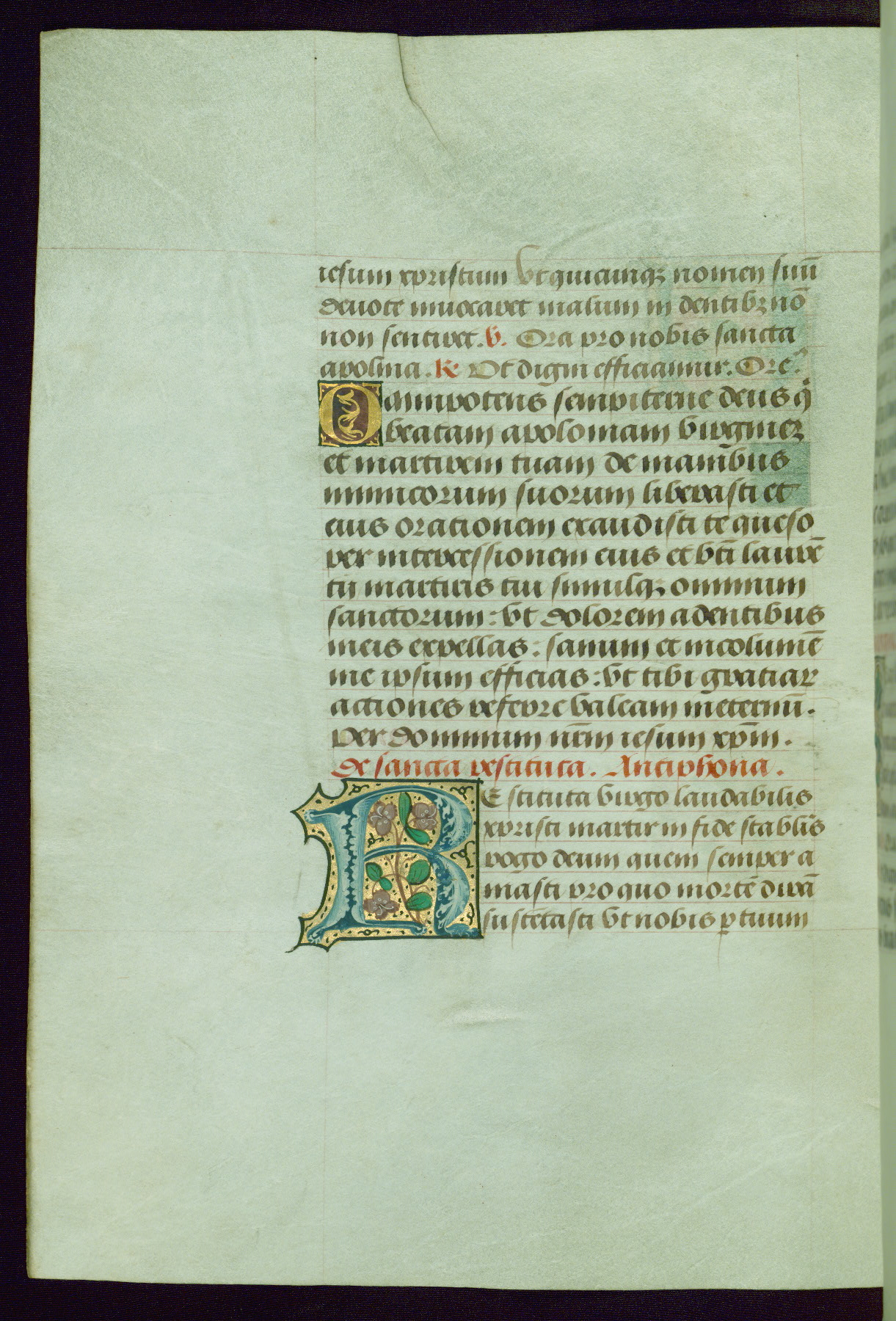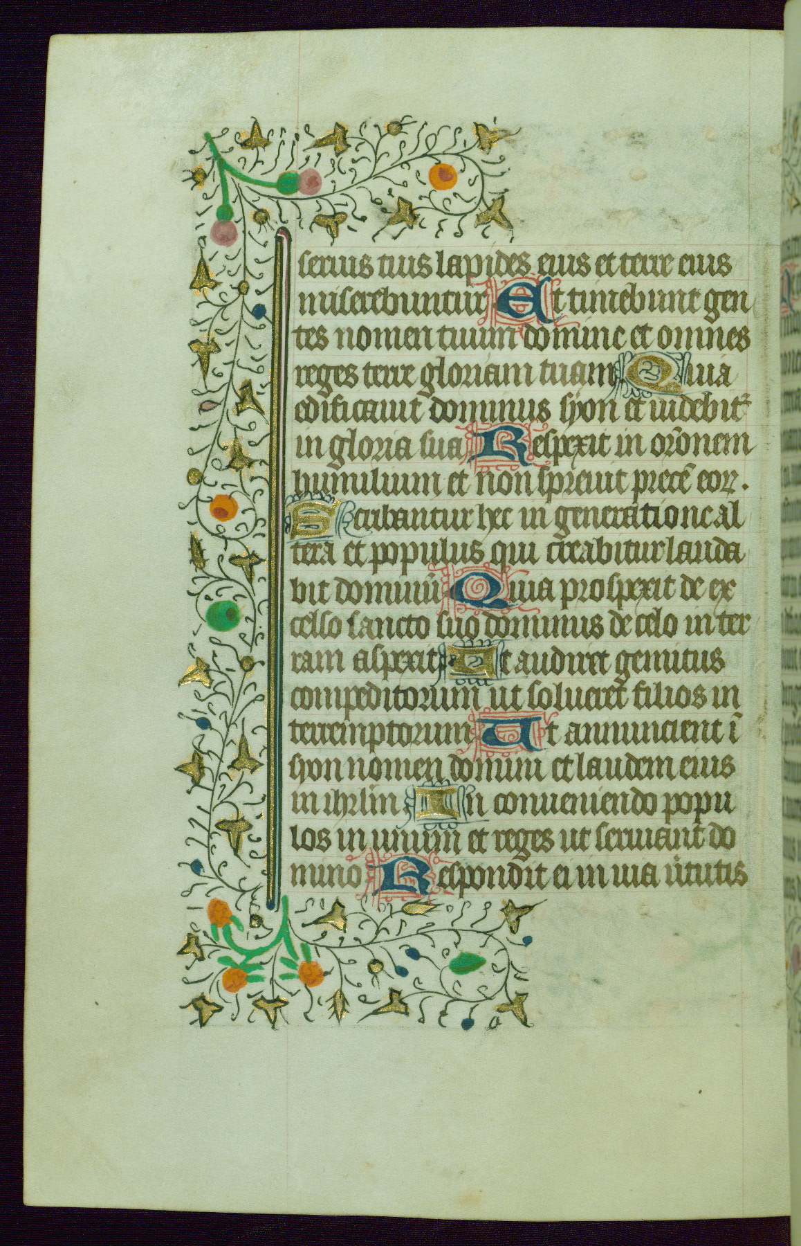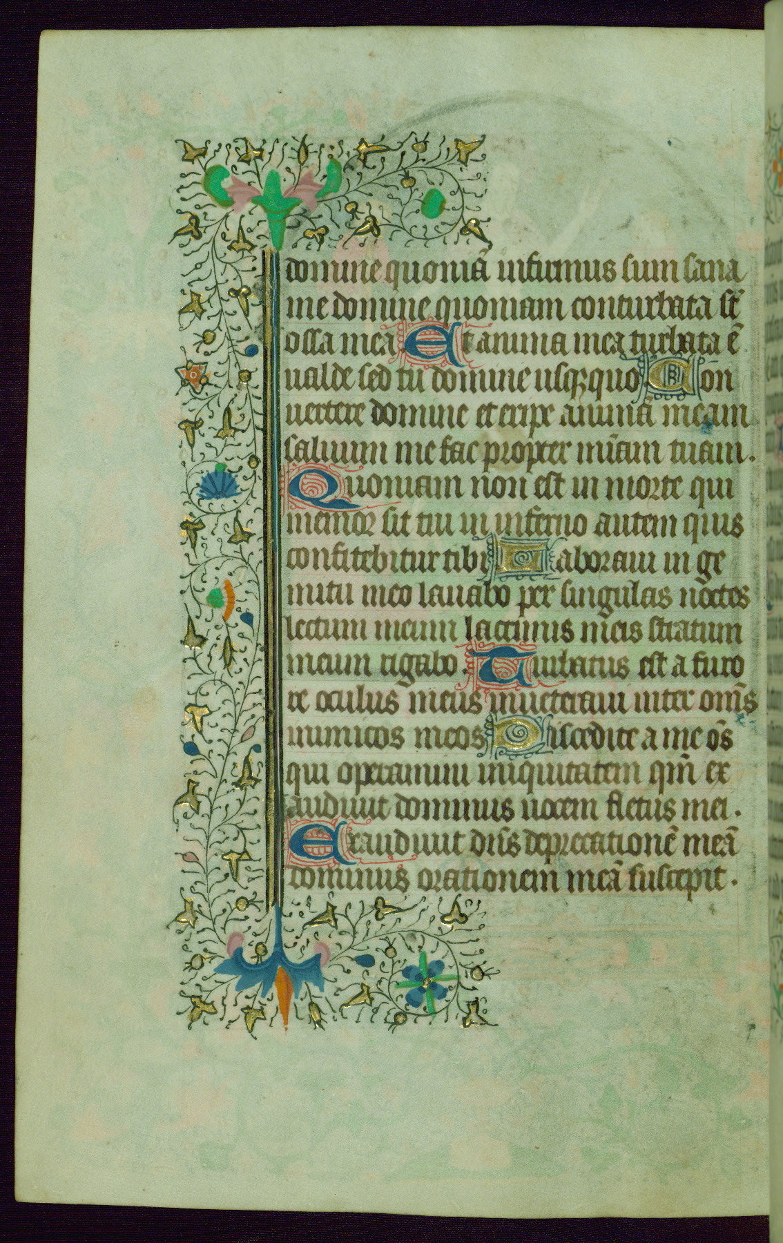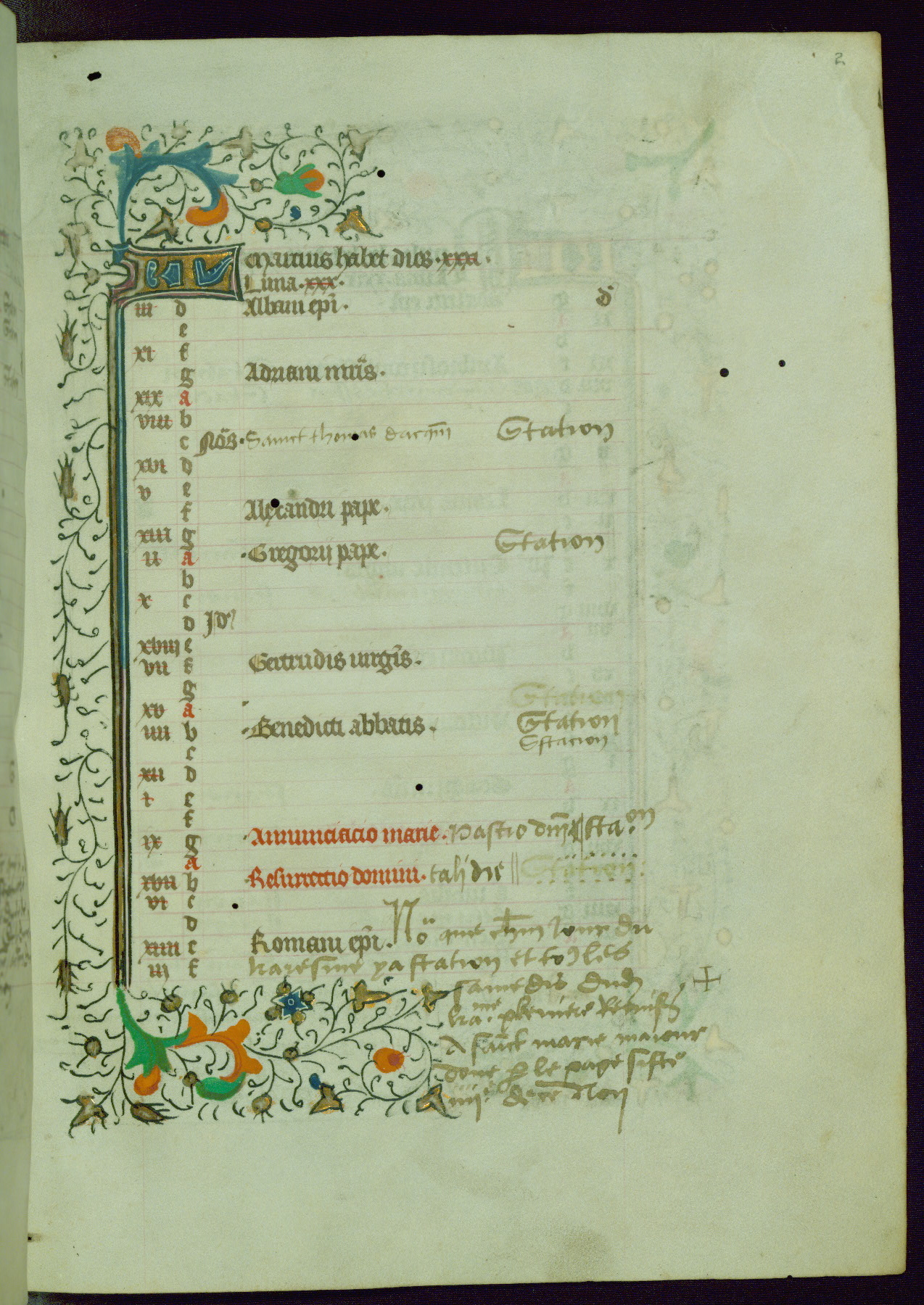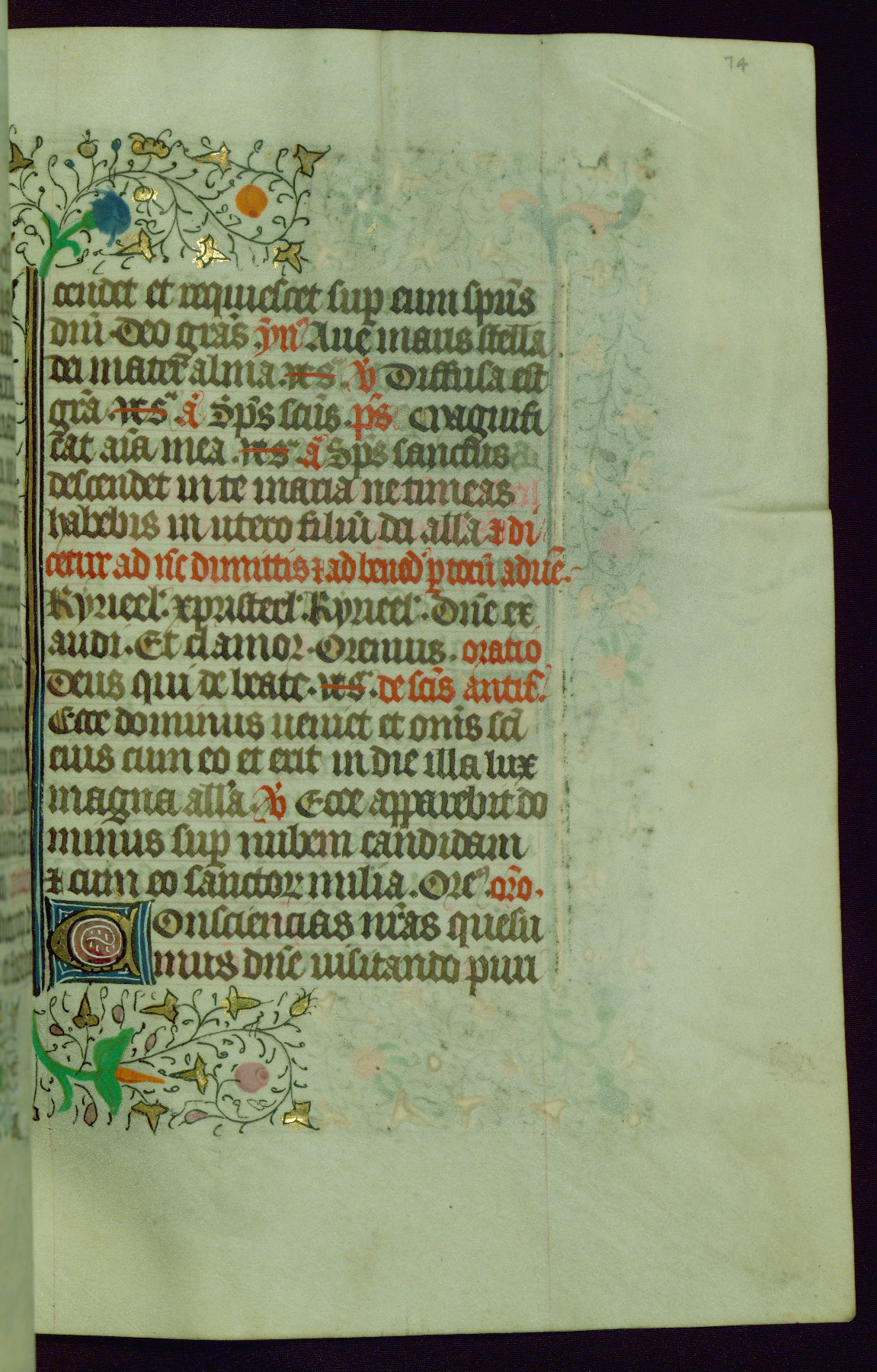 Completed ca. 1440-50 and illuminated in the style of the Masters of the Gold Scrolls, this Book of Hours preserves much information about its provenance. The first owner was possibly Barbe de Feuru, whose signature is found on the front pastedown. The book contains the ex libris of Jean of Ricaumez and his wife, Catherine of Barbenchon; their French inscription on the back pastedown promises good wine to the finder of the book if lost. The book was inherited by their son, Christophe of Ricaumez, who likely added several texts illustrated by an Rouennais artist, ca. 1500. Record of the ownership is not evinced in the book again until 1669 when the ex libris of the Count of Hallennes (Allennes family of Tournai?) was added. Alexandre-Constantin-Joseph of Nassau's (1738-1814) armorial shield appears twice, engraved (front pastedown) and painted (front flyleaf i, v).
