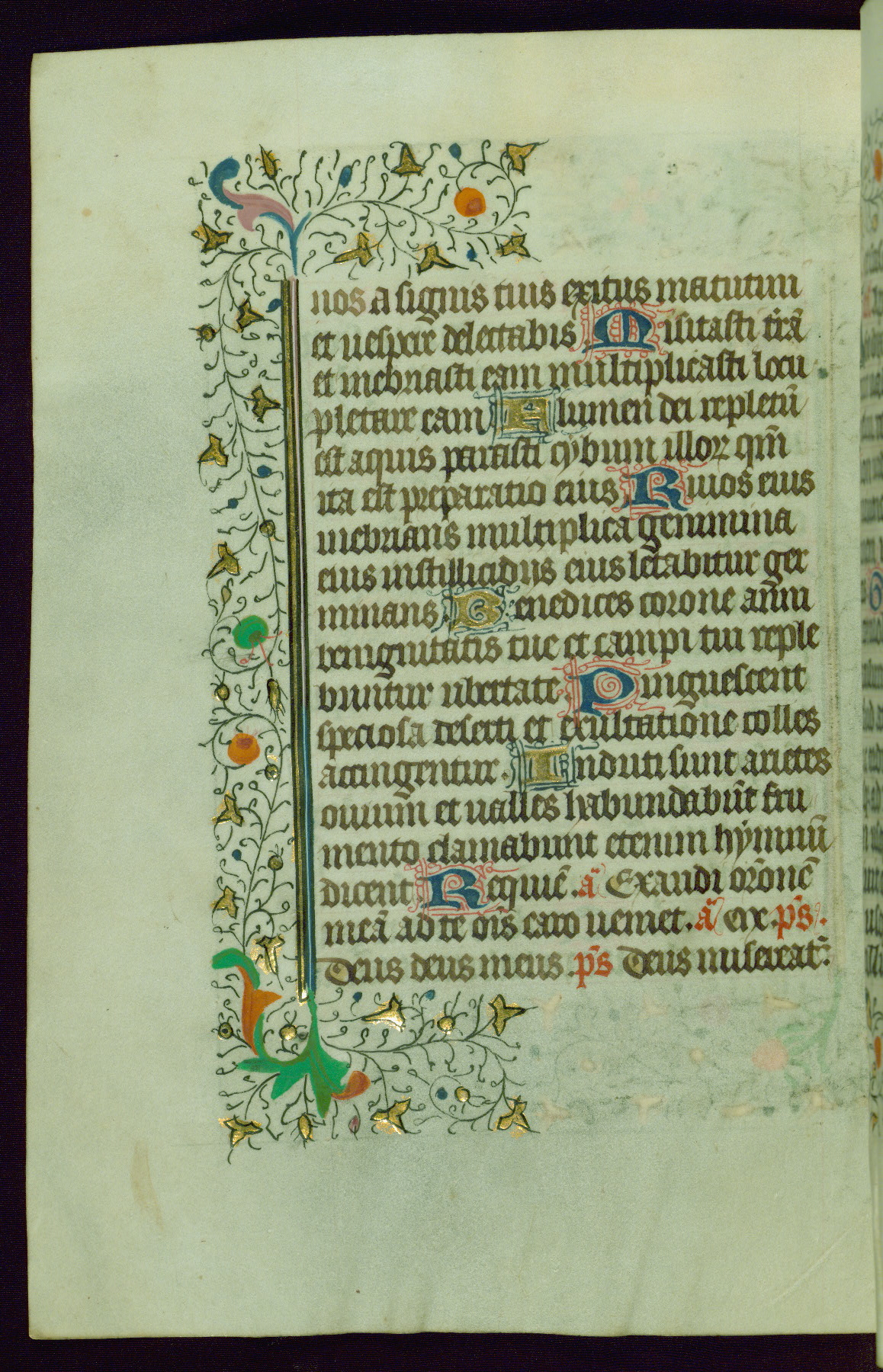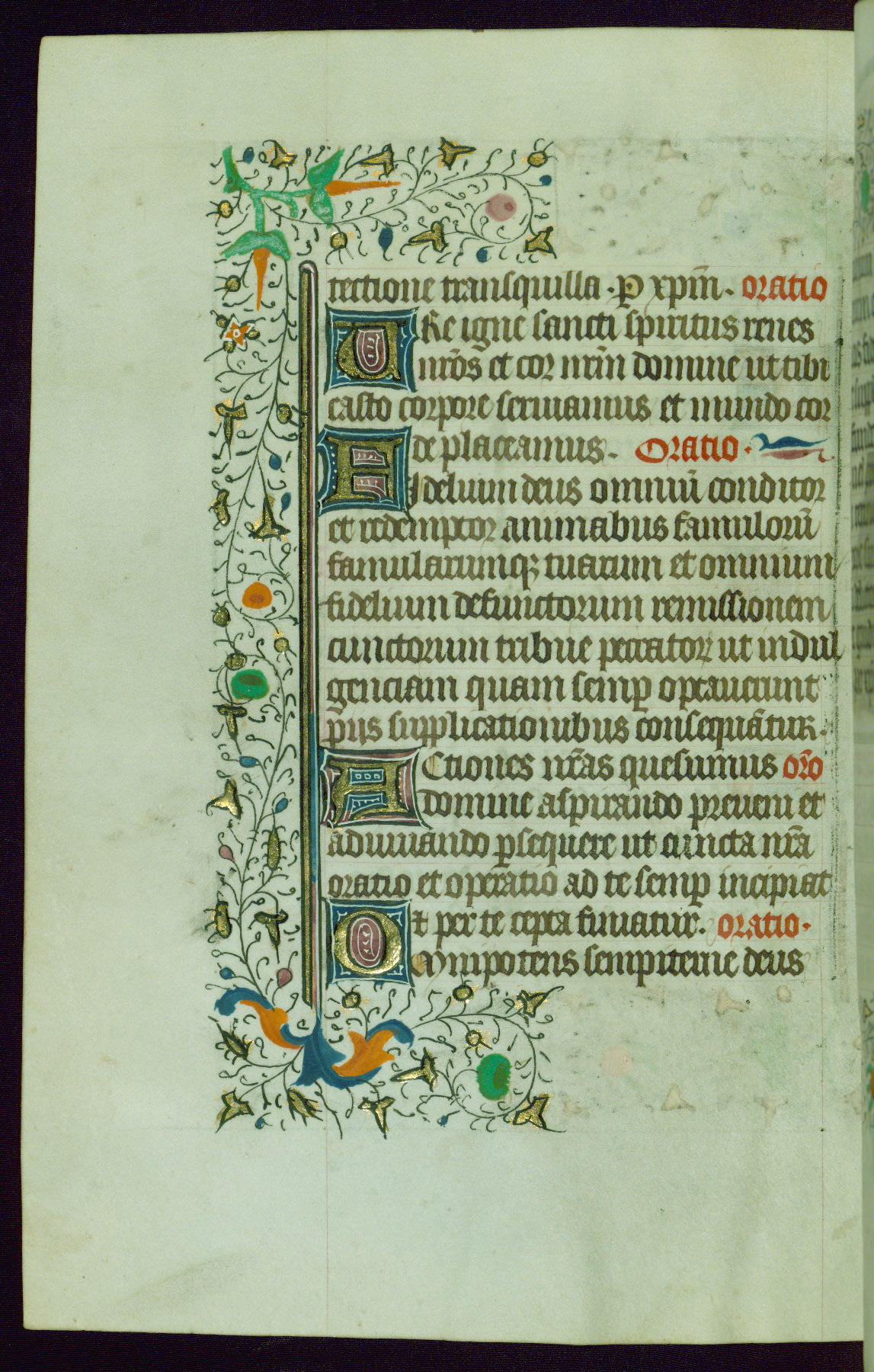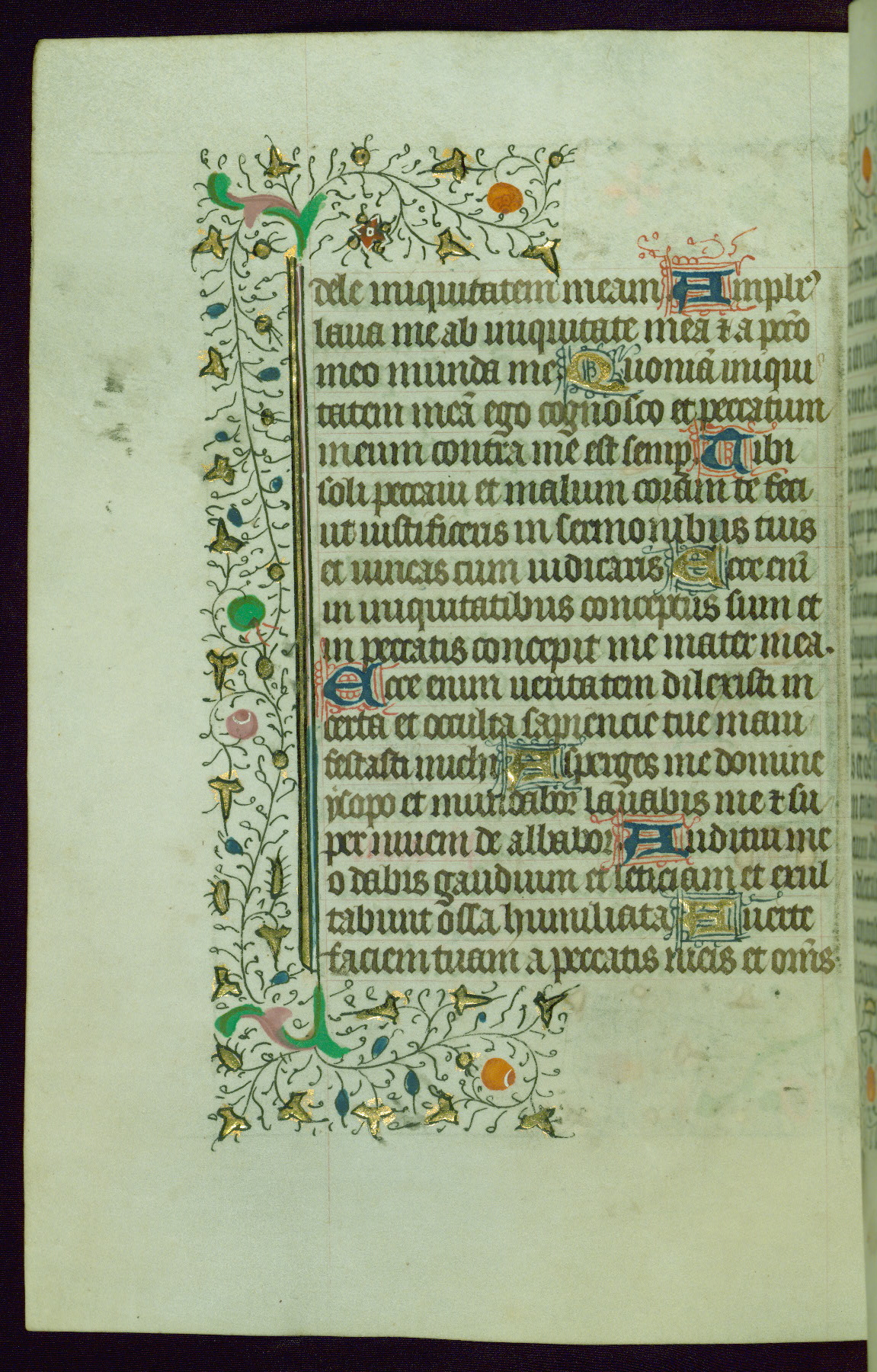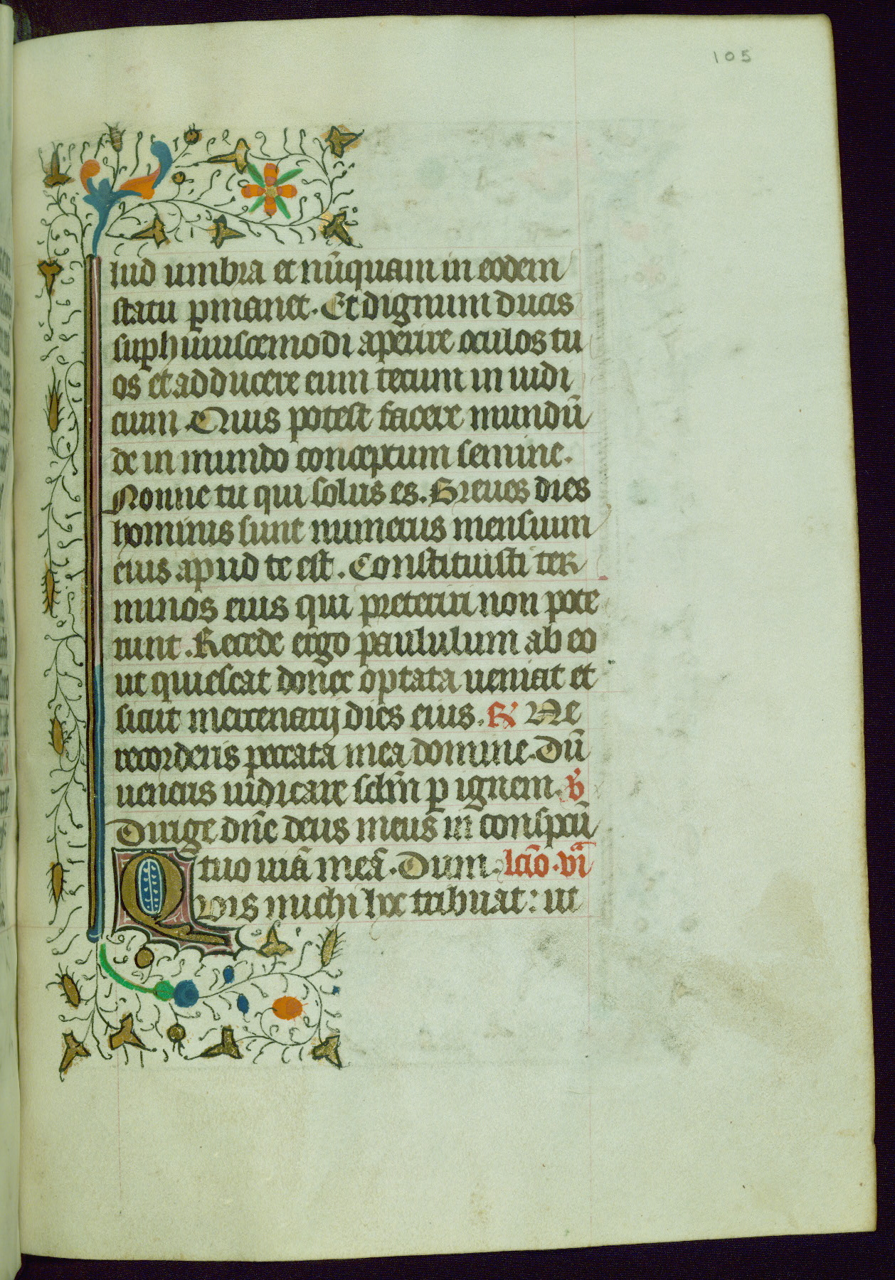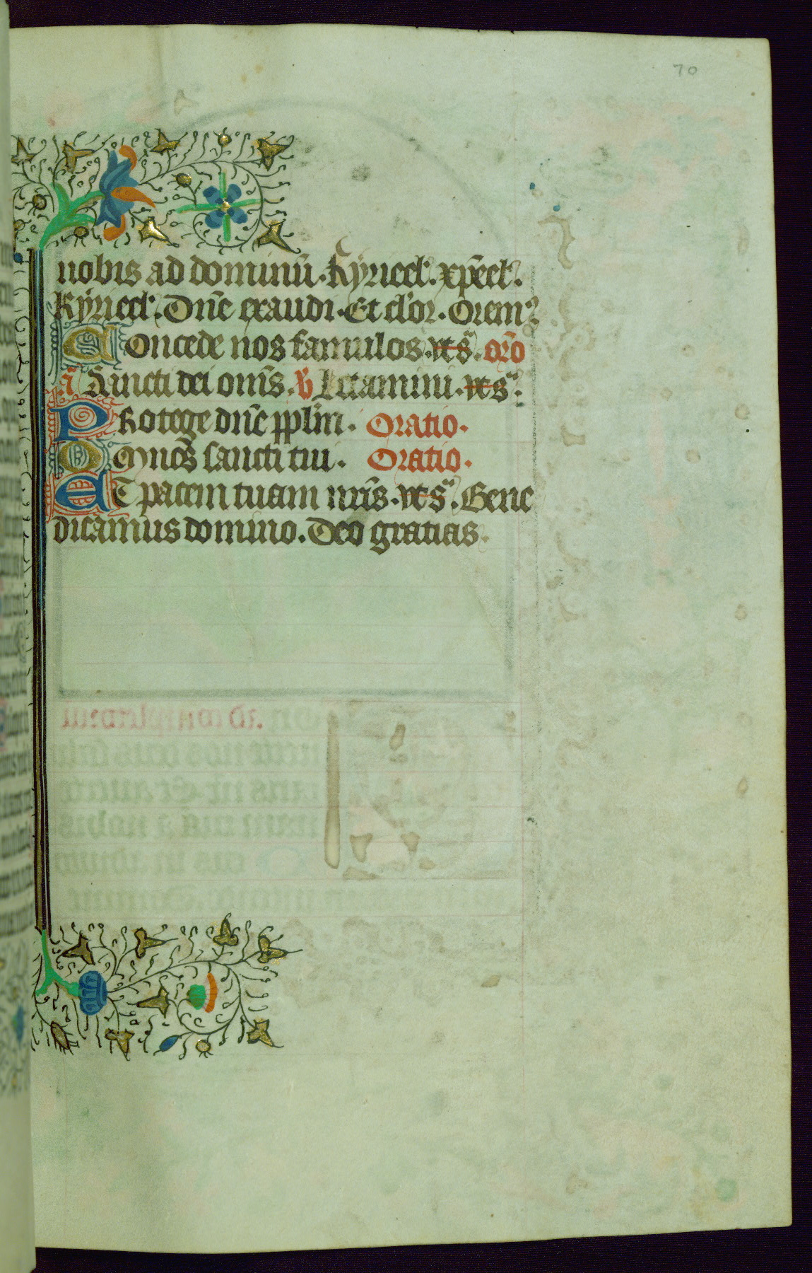 Completed ca. 1440-50 and illuminated in the style of the Masters of the Gold Scrolls, this Book of Hours preserves much information about its provenance. The first owner was possibly Barbe de Feuru, whose signature is found on the front pastedown. The book contains the ex libris of Jean of Ricaumez and his wife, Catherine of Barbenchon; their French inscription on the back pastedown promises good wine to the finder of the book if lost. The book was inherited by their son, Christophe of Ricaumez, who likely added several texts illustrated by an Rouennais artist, ca. 1500. Record of the ownership is not evinced in the book again until 1669 when the ex libris of the Count of Hallennes (Allennes family of Tournai?) was added. Alexandre-Constantin-Joseph of Nassau's (1738-1814) armorial shield appears twice, engraved (front pastedown) and painted (front flyleaf i, v).