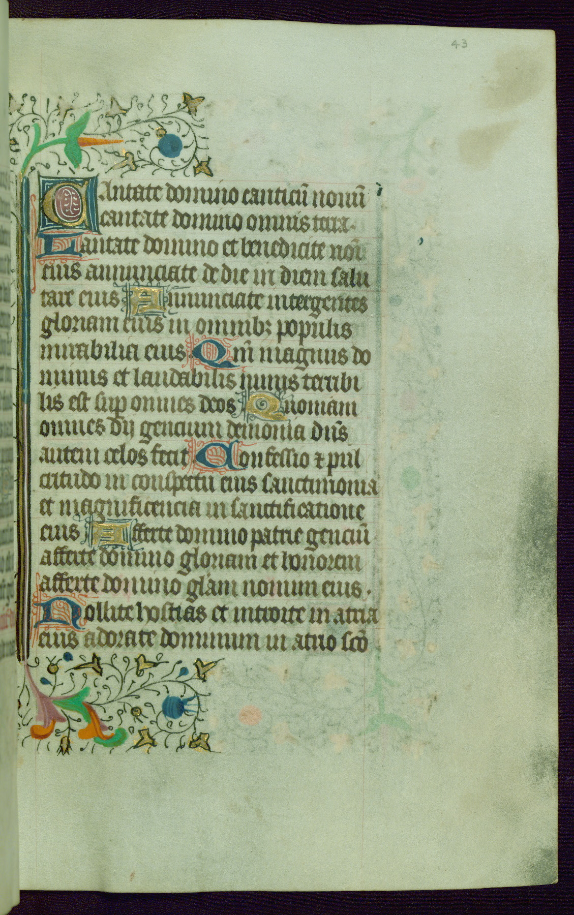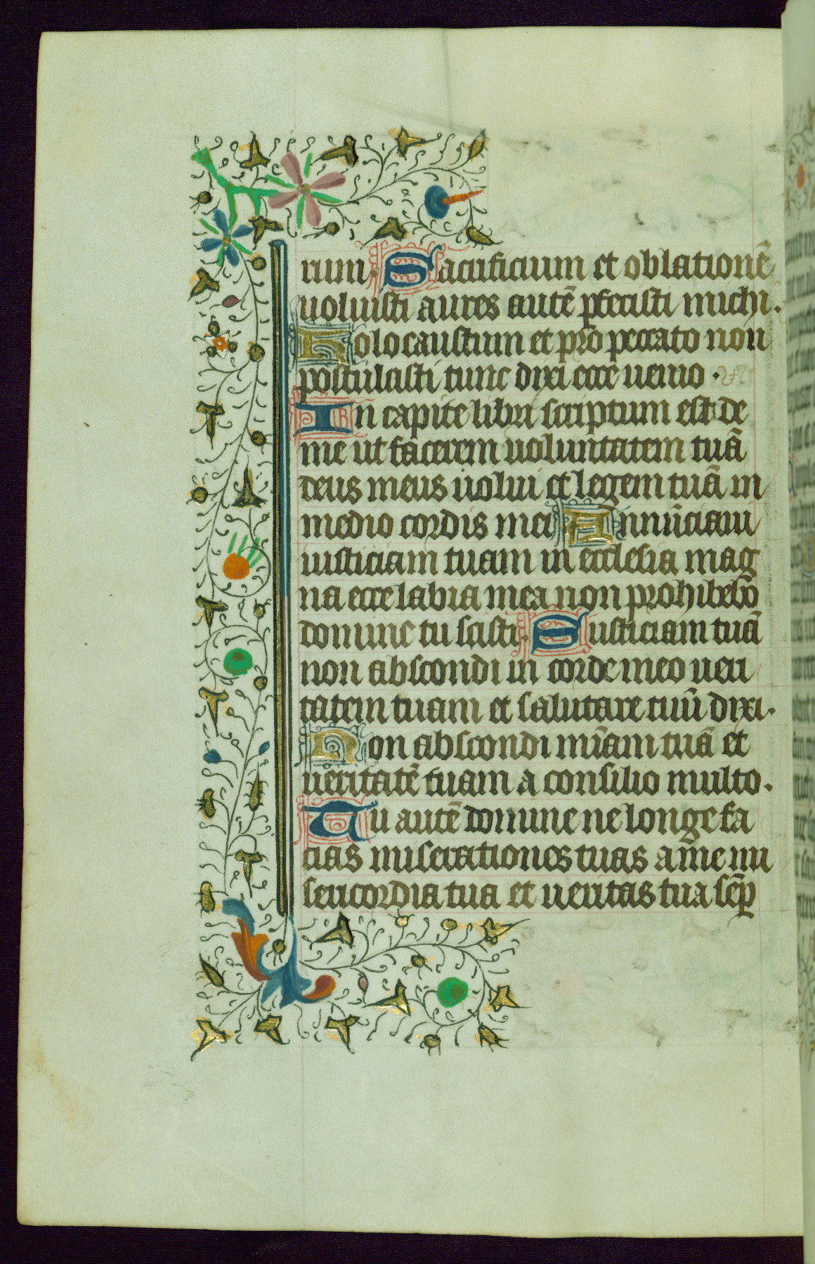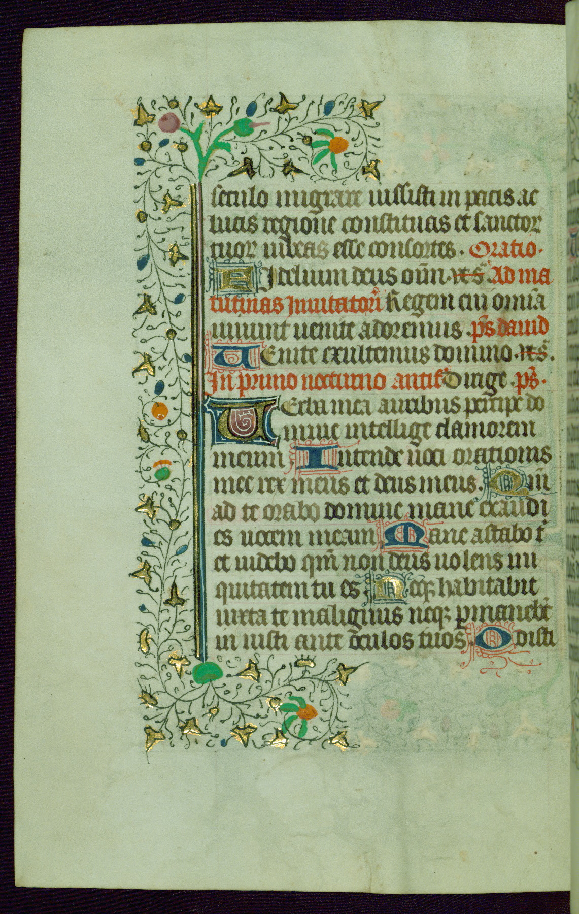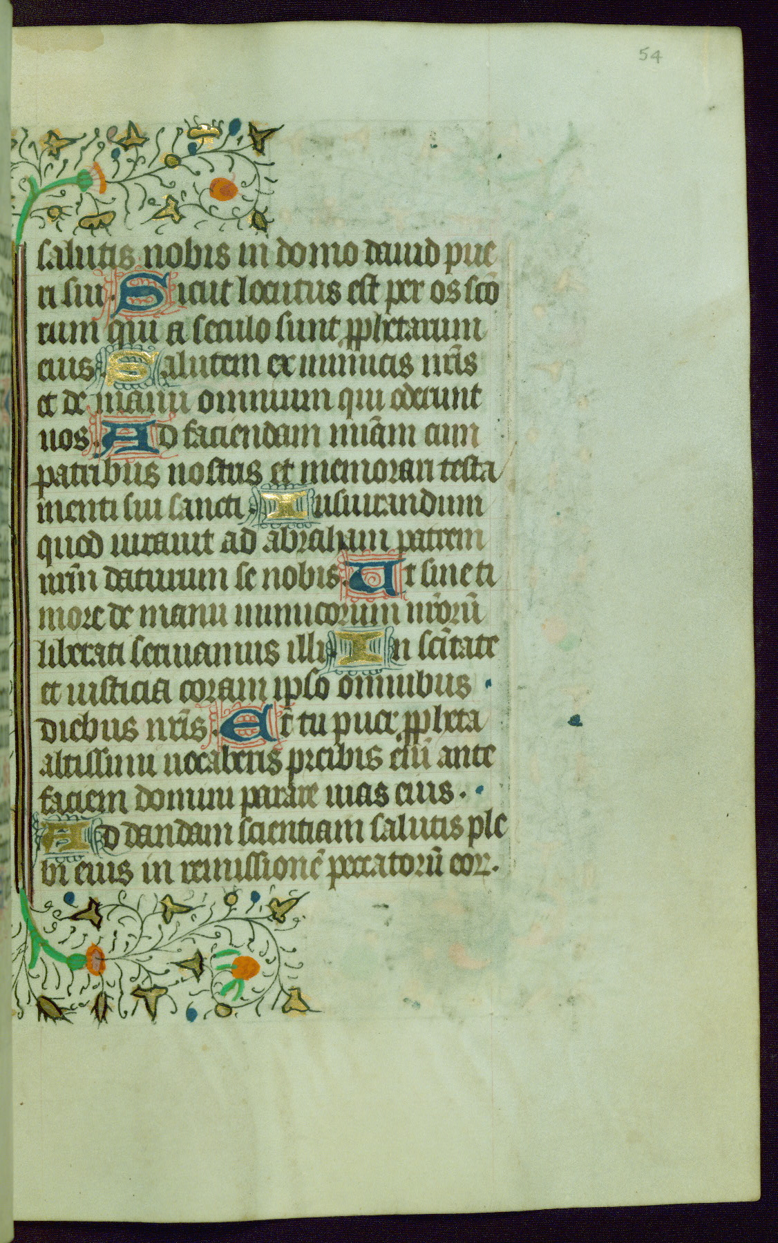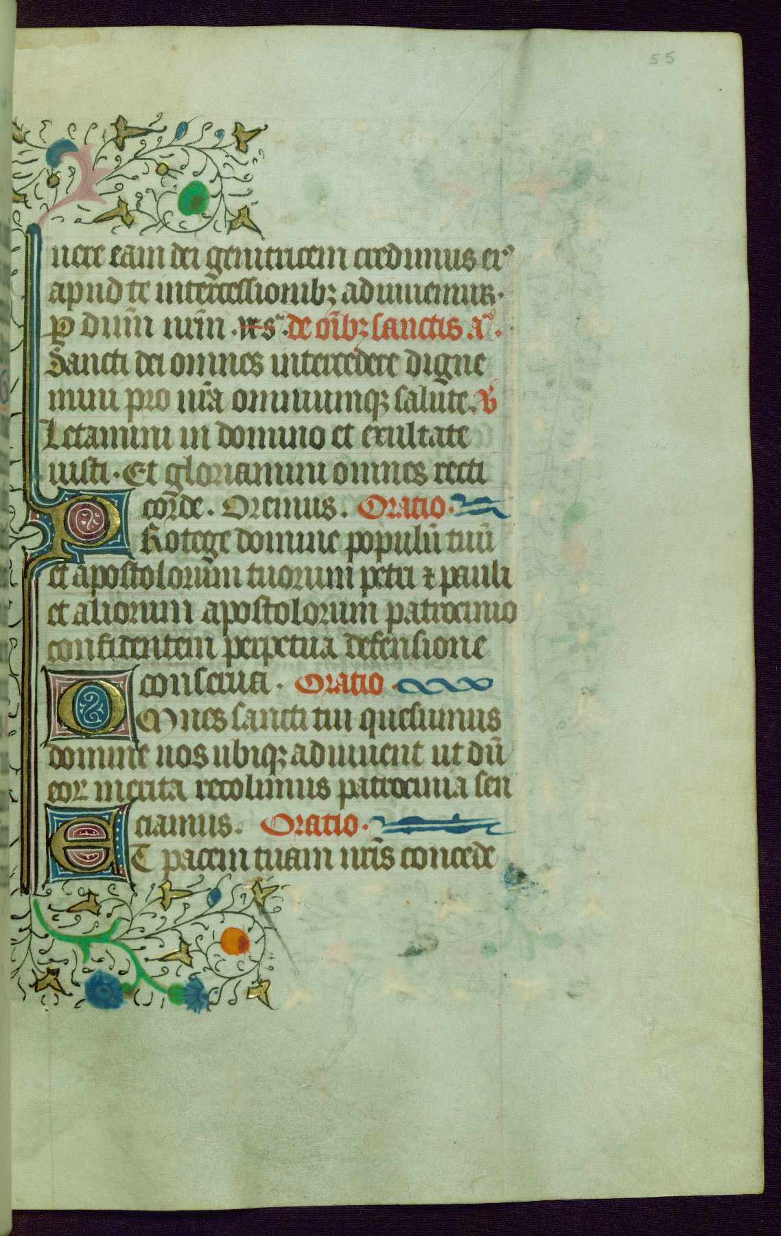 Completed ca. 1440-50 and illuminated in the style of the Masters of the Gold Scrolls, this Book of Hours preserves much information about its provenance. The first owner was possibly Barbe de Feuru, whose signature is found on the front pastedown. The book contains the ex libris of Jean of Ricaumez and his wife, Catherine of Barbenchon; their French inscription on the back pastedown promises good wine to the finder of the book if lost. The book was inherited by their son, Christophe of Ricaumez, who likely added several texts illustrated by an Rouennais artist, ca. 1500. Record of the ownership is not evinced in the book again until 1669 when the ex libris of the Count of Hallennes (Allennes family of Tournai?) was added. Alexandre-Constantin-Joseph of Nassau's (1738-1814) armorial shield appears twice, engraved (front pastedown) and painted (front flyleaf i, v).
